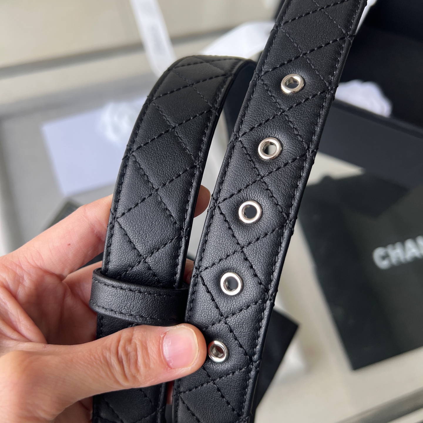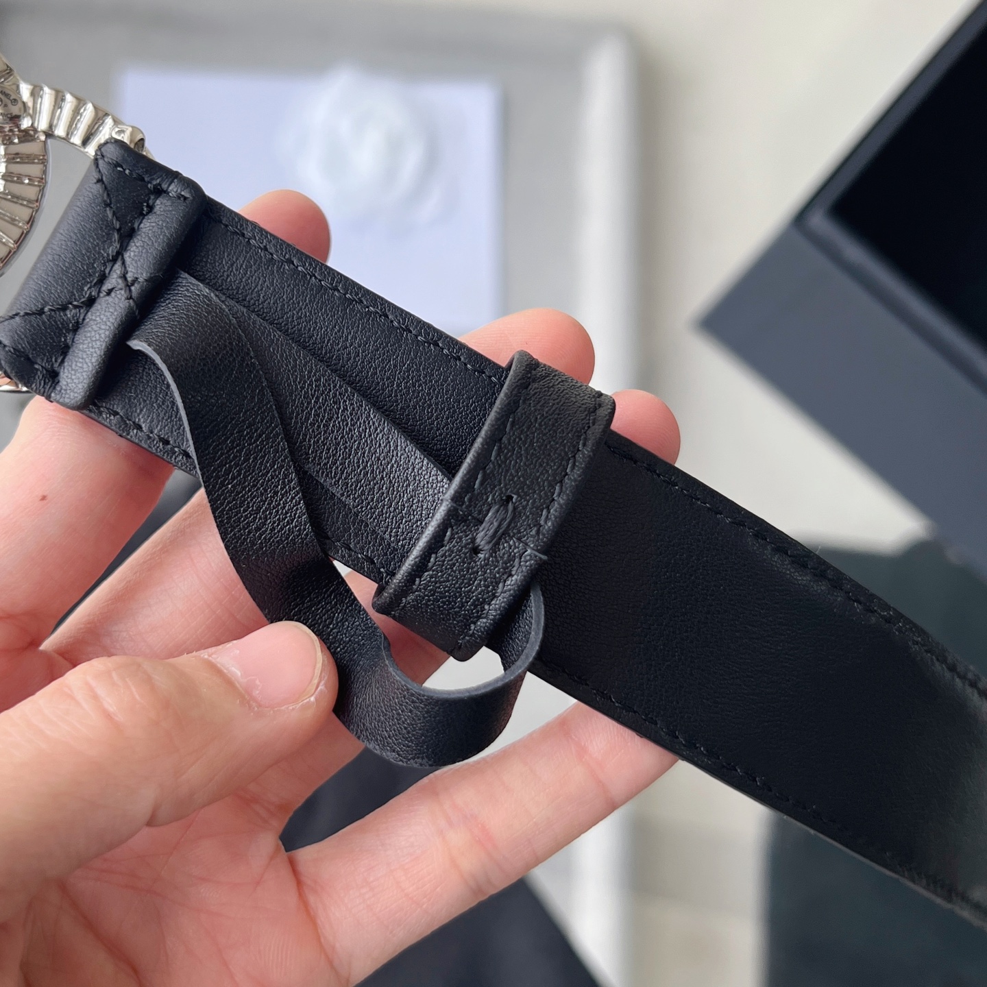 这款皮带是AAAAA 1:1 质量 (非常棒). 使用了和原版一模一样的材料. 商标部分也保持了和香奈儿/Chanel一样. 图片拍摄是实物皮带拍摄, 您所收到的实物保证和我们图片一模一样.