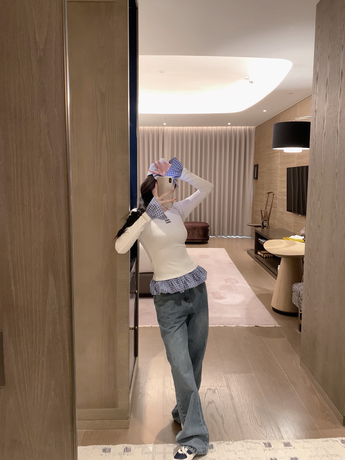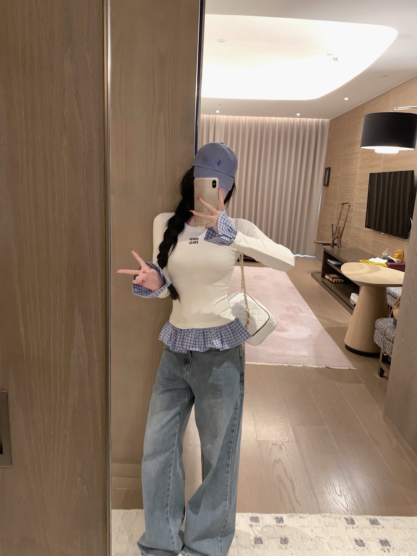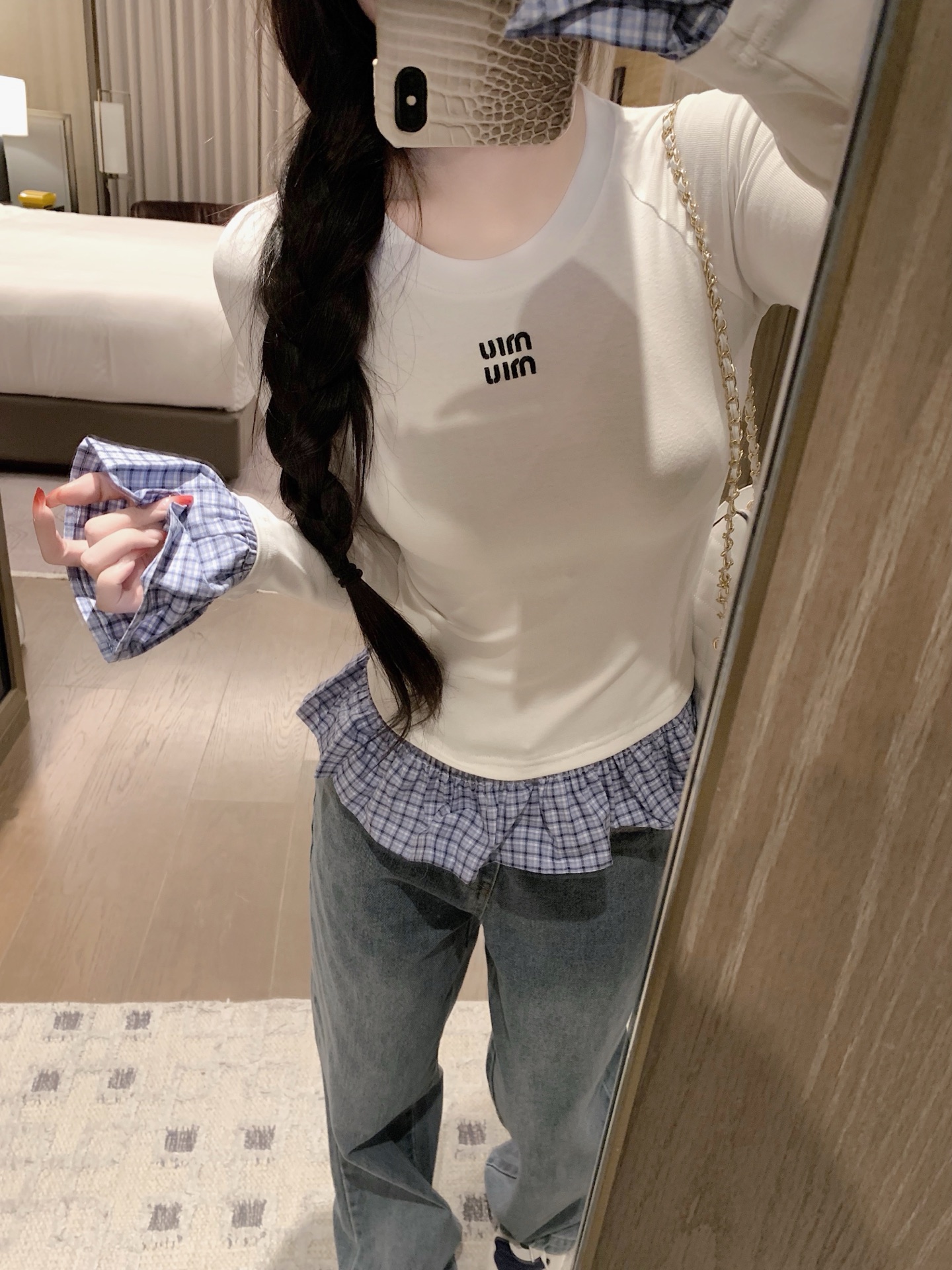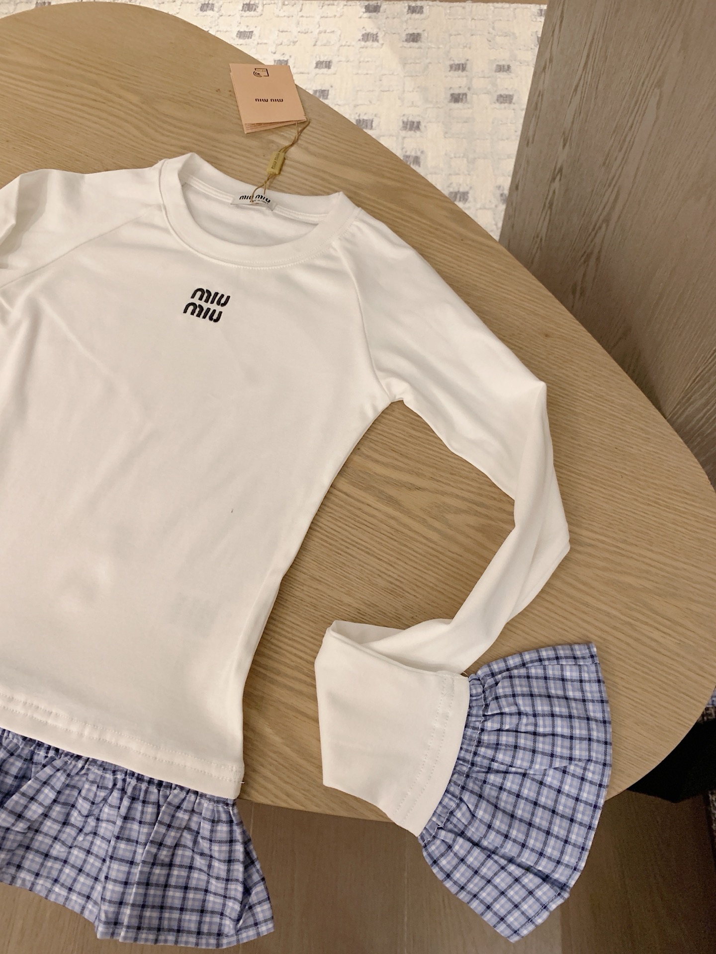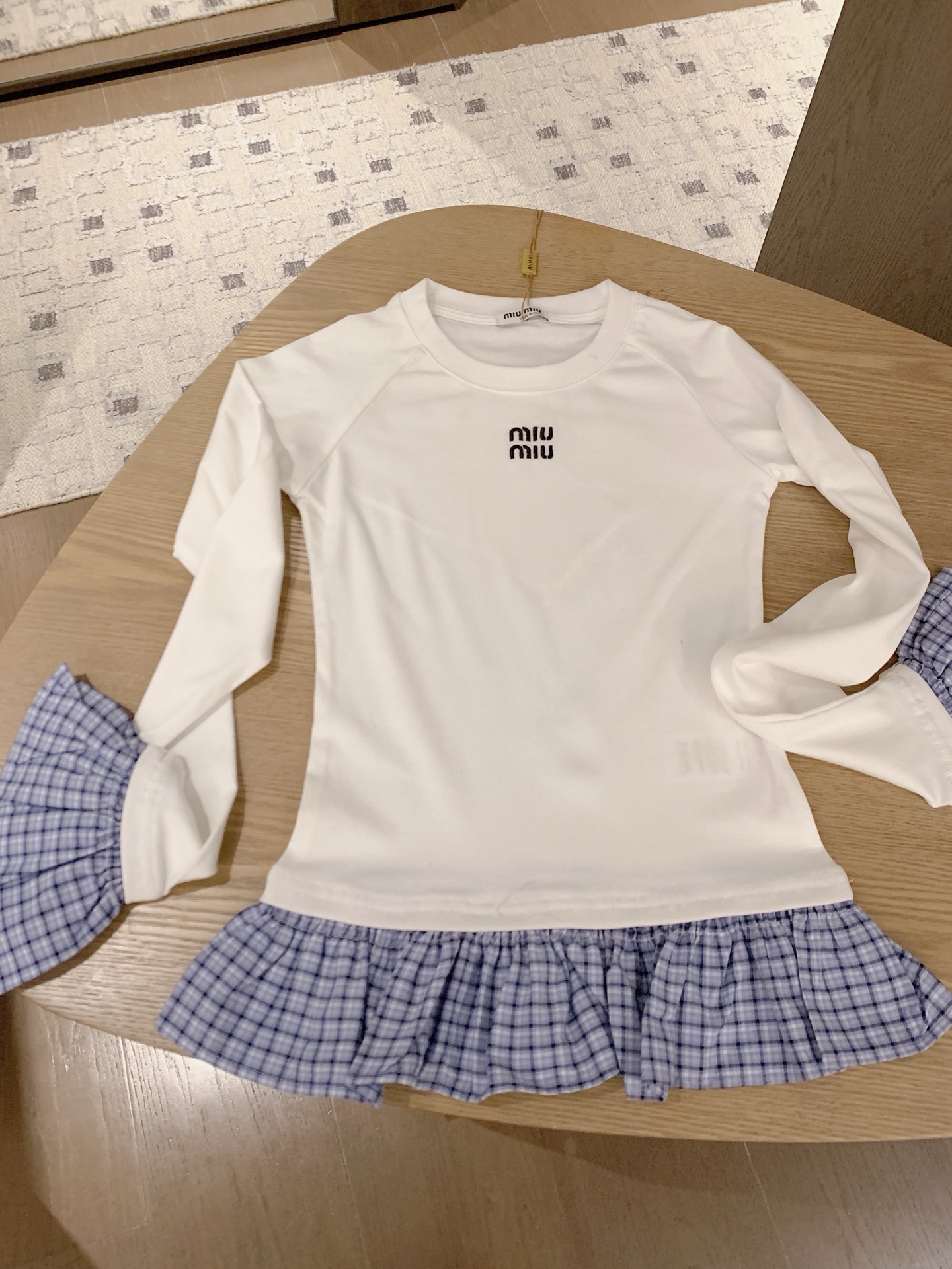 这款衣服是AAAAA 1:1 质量 (非常棒). 使用了和原版一模一样的材料. 商标部分也保持了和缪缪/Miu Miu一样. 图片拍摄是实物衣服拍摄, 您所收到的实物保证和我们图片一模一样.