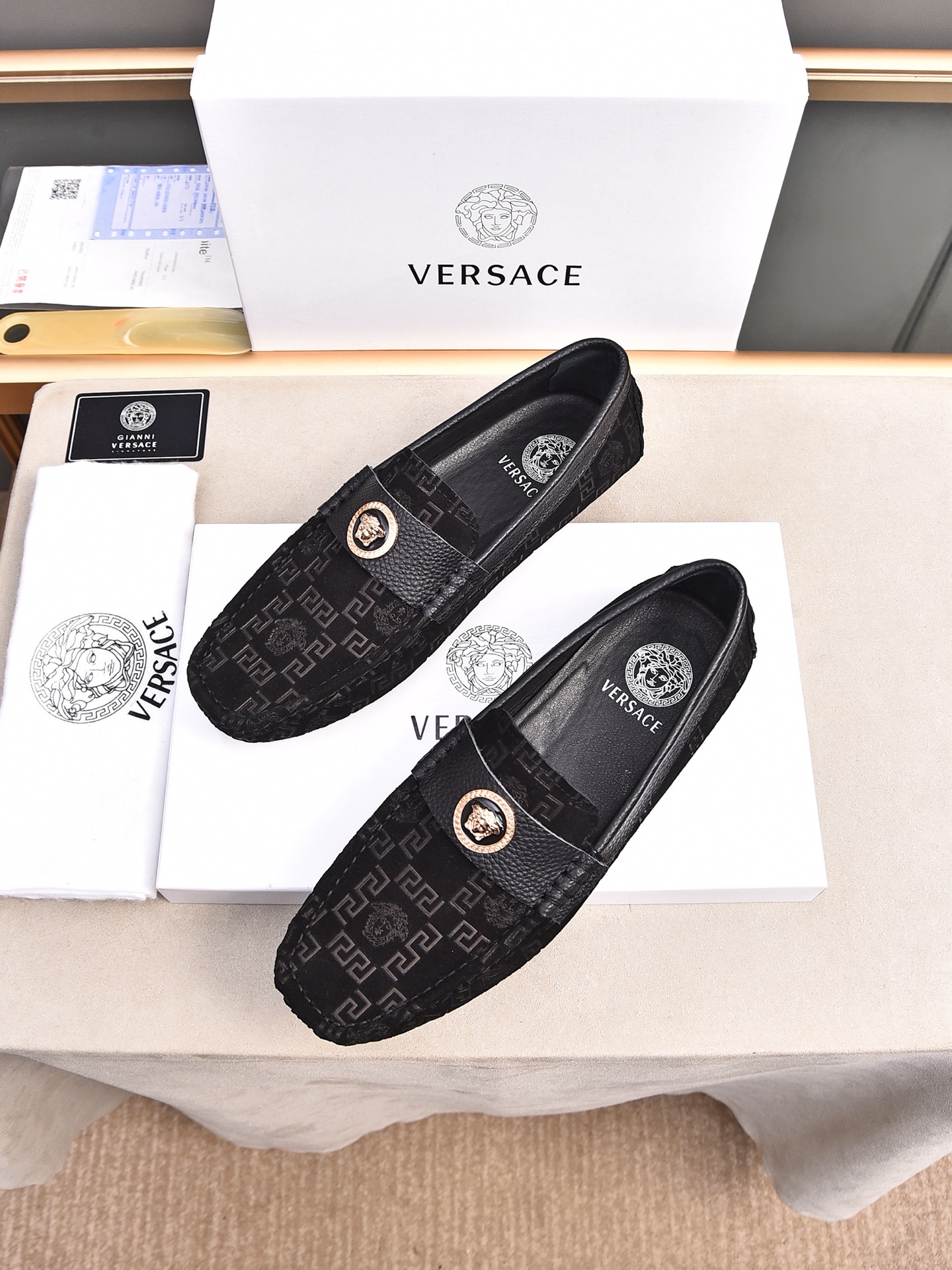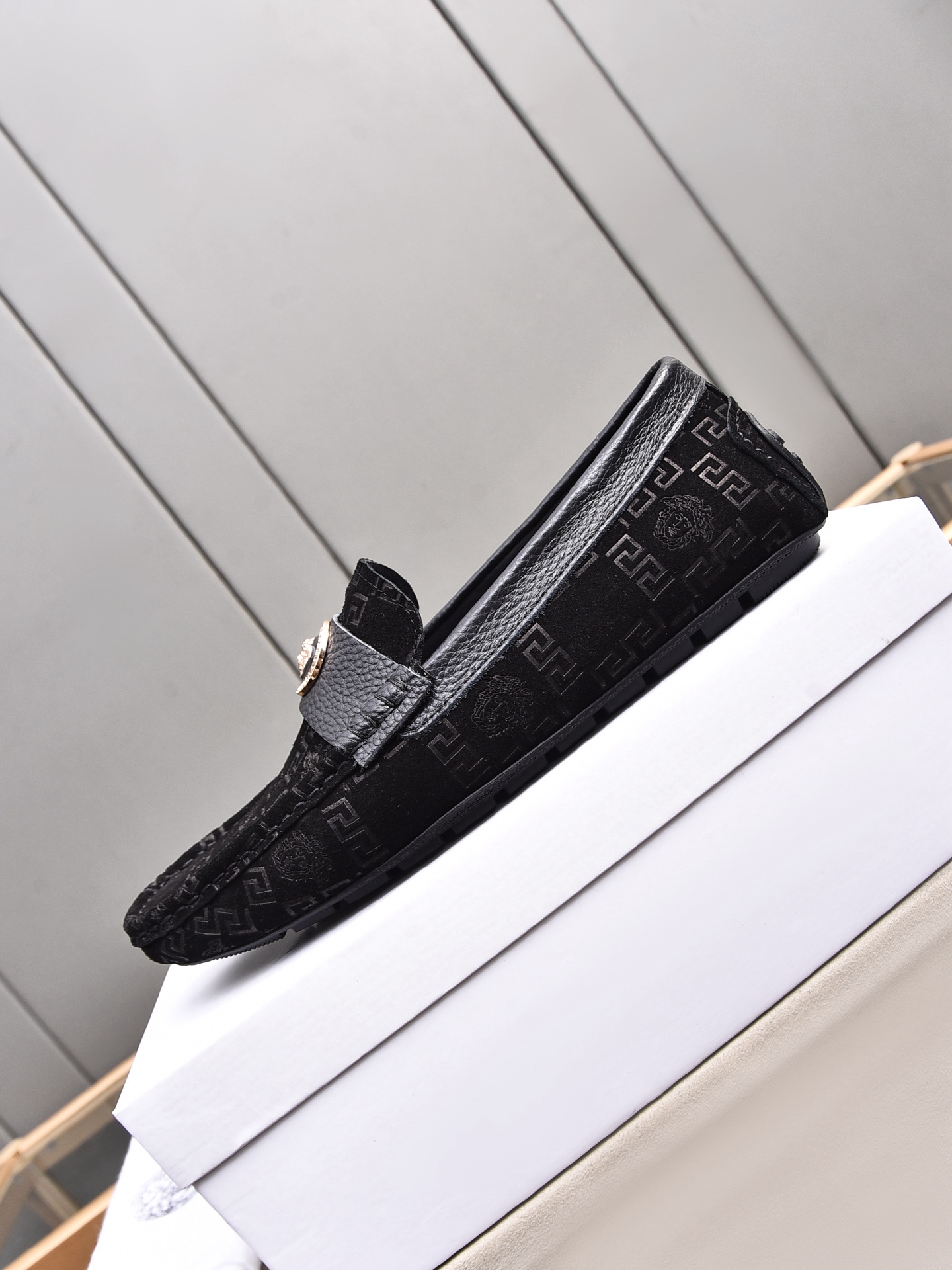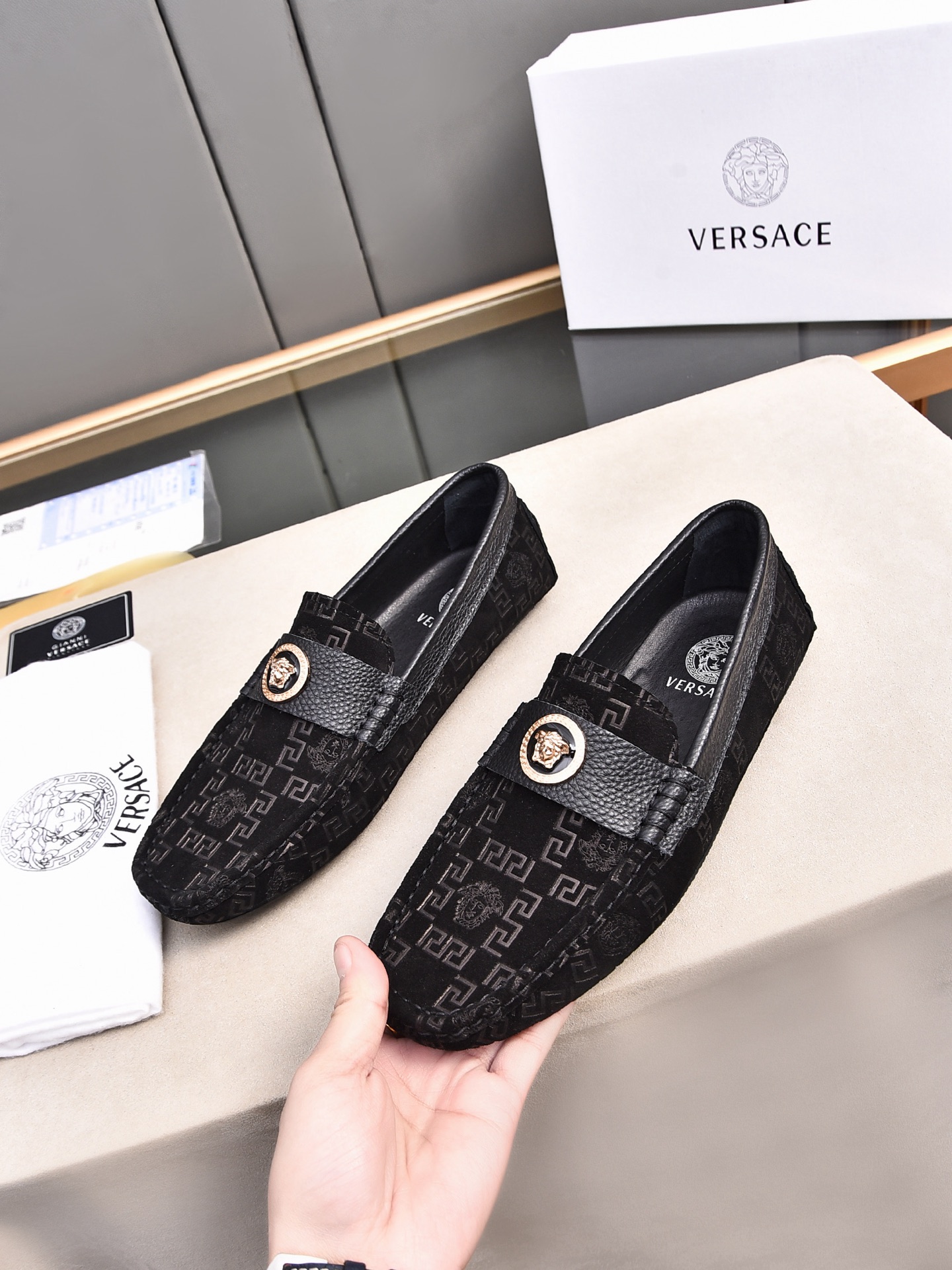 这款鞋子是AAAAA 1:1 质量 (非常棒). 使用了和原版一模一样的材料. 商标部分也保持了和范思哲/Versace一样. 图片拍摄是实物鞋子拍摄, 您所收到的实物保证和我们图片一模一样.