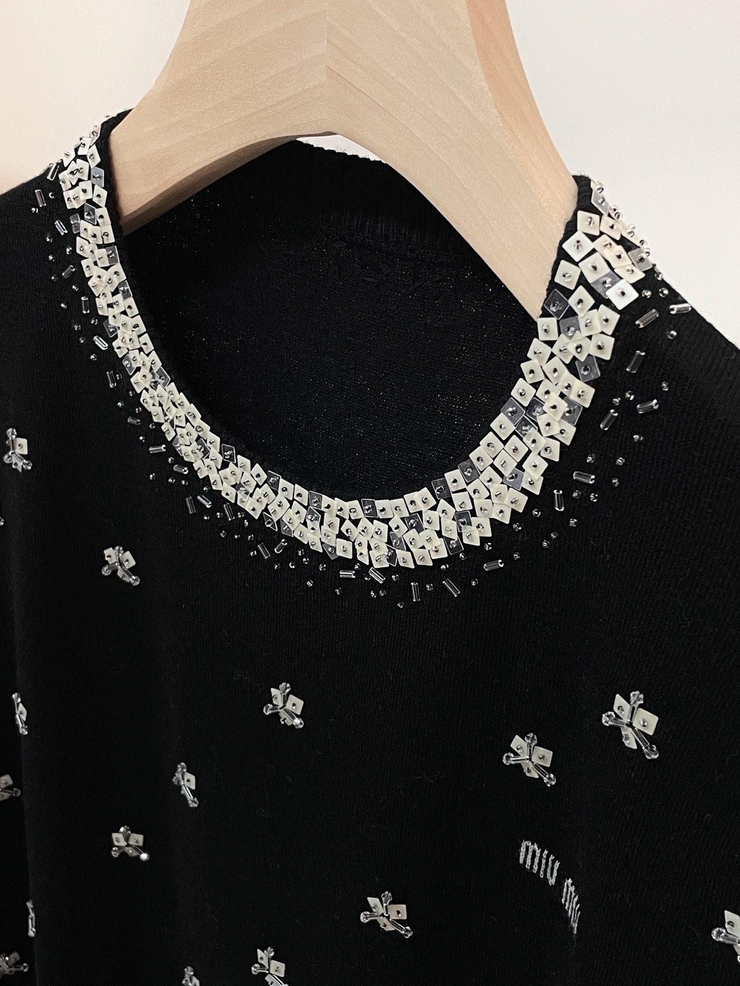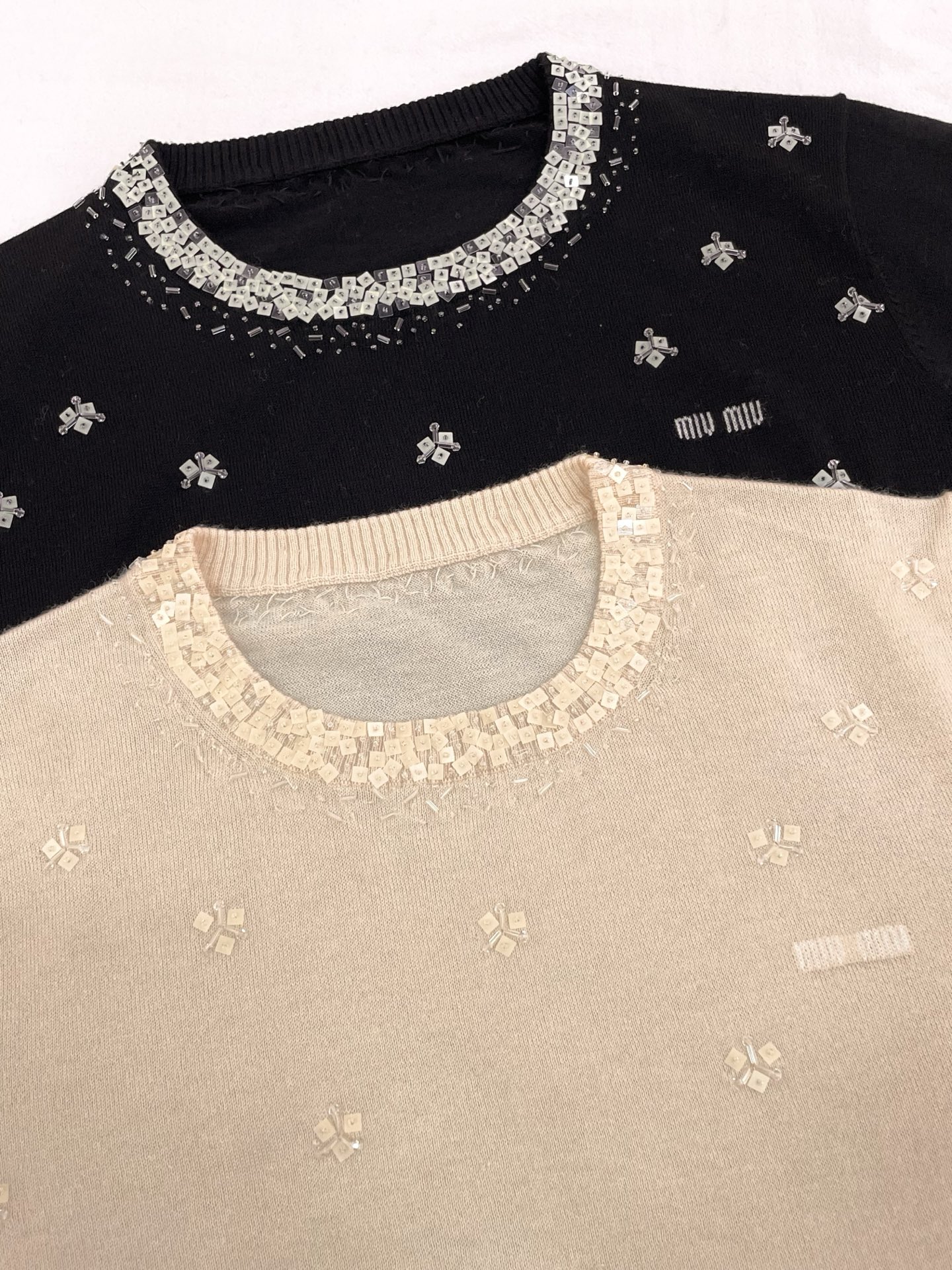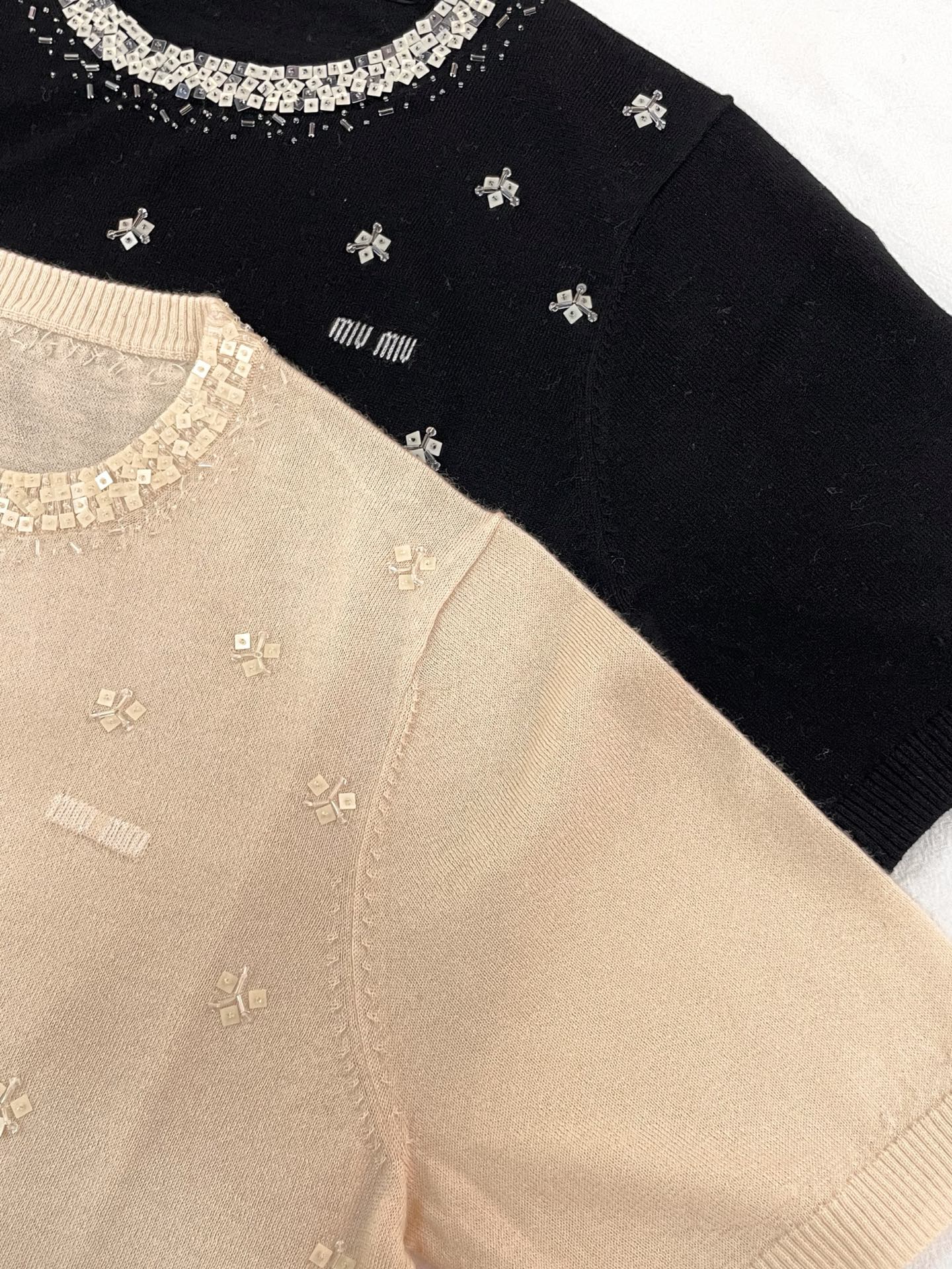 这款衣服是AAAAA 1:1 质量 (非常棒). 使用了和原版一模一样的材料. 商标部分也保持了和缪缪/Miu Miu一样. 图片拍摄是实物衣服拍摄, 您所收到的实物保证和我们图片一模一样.