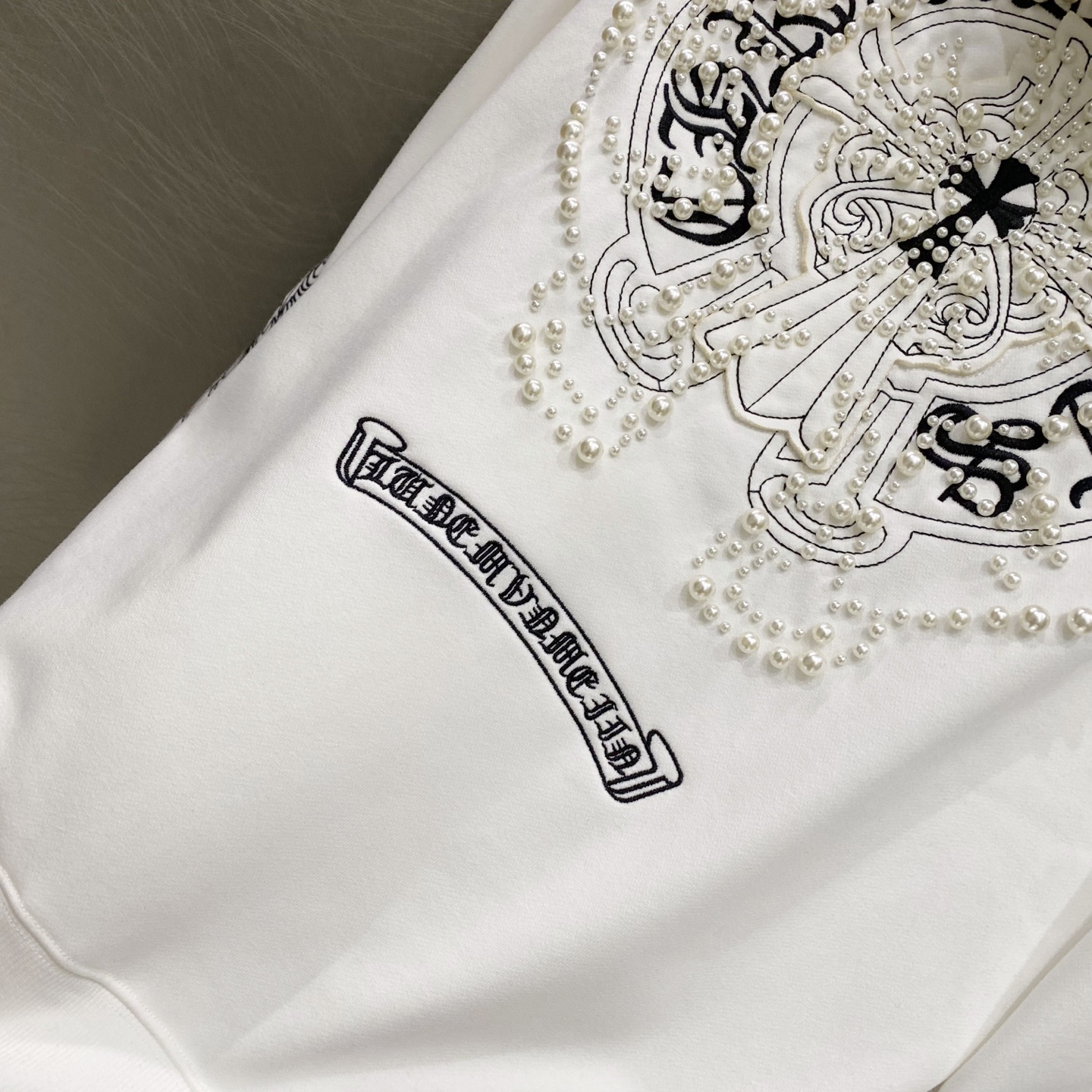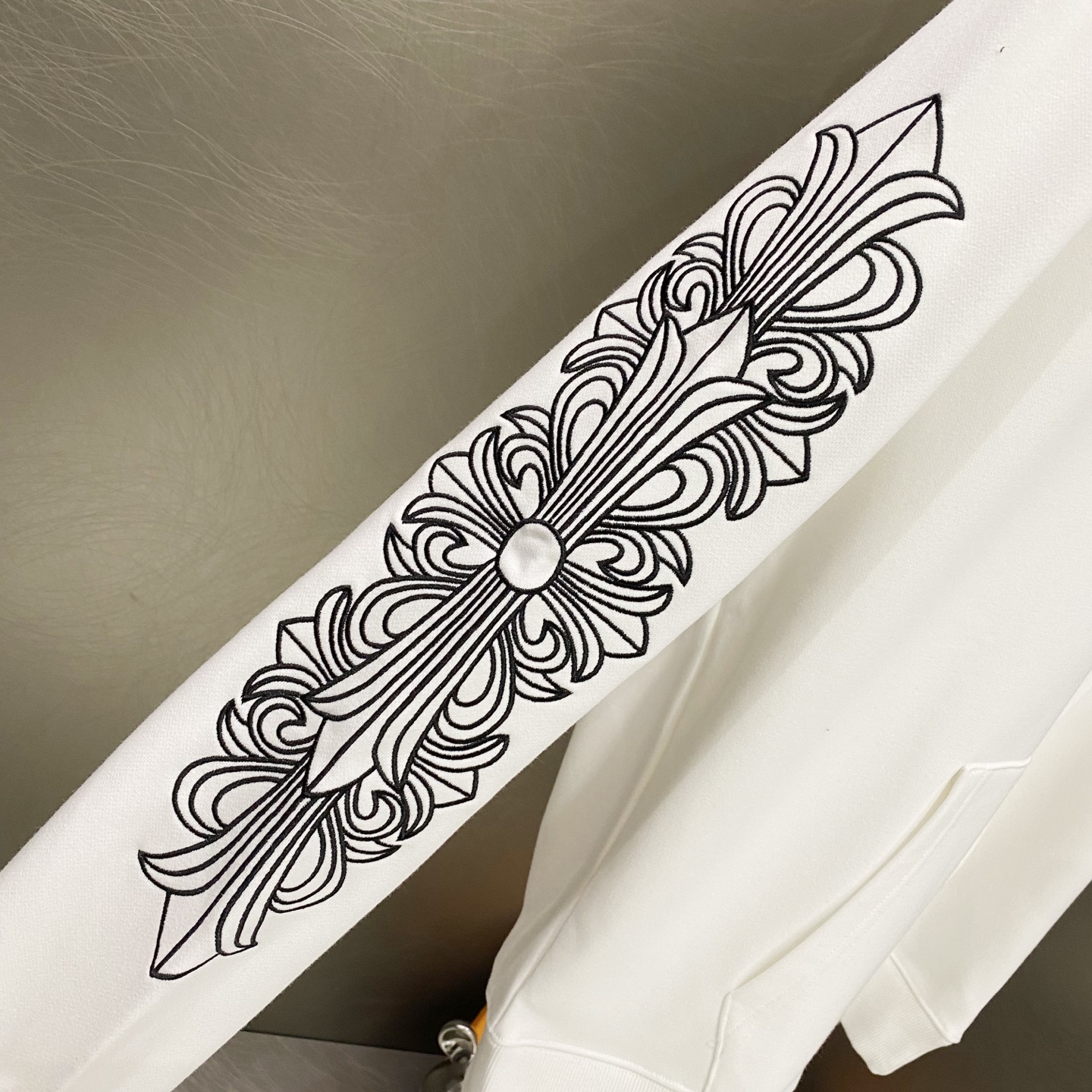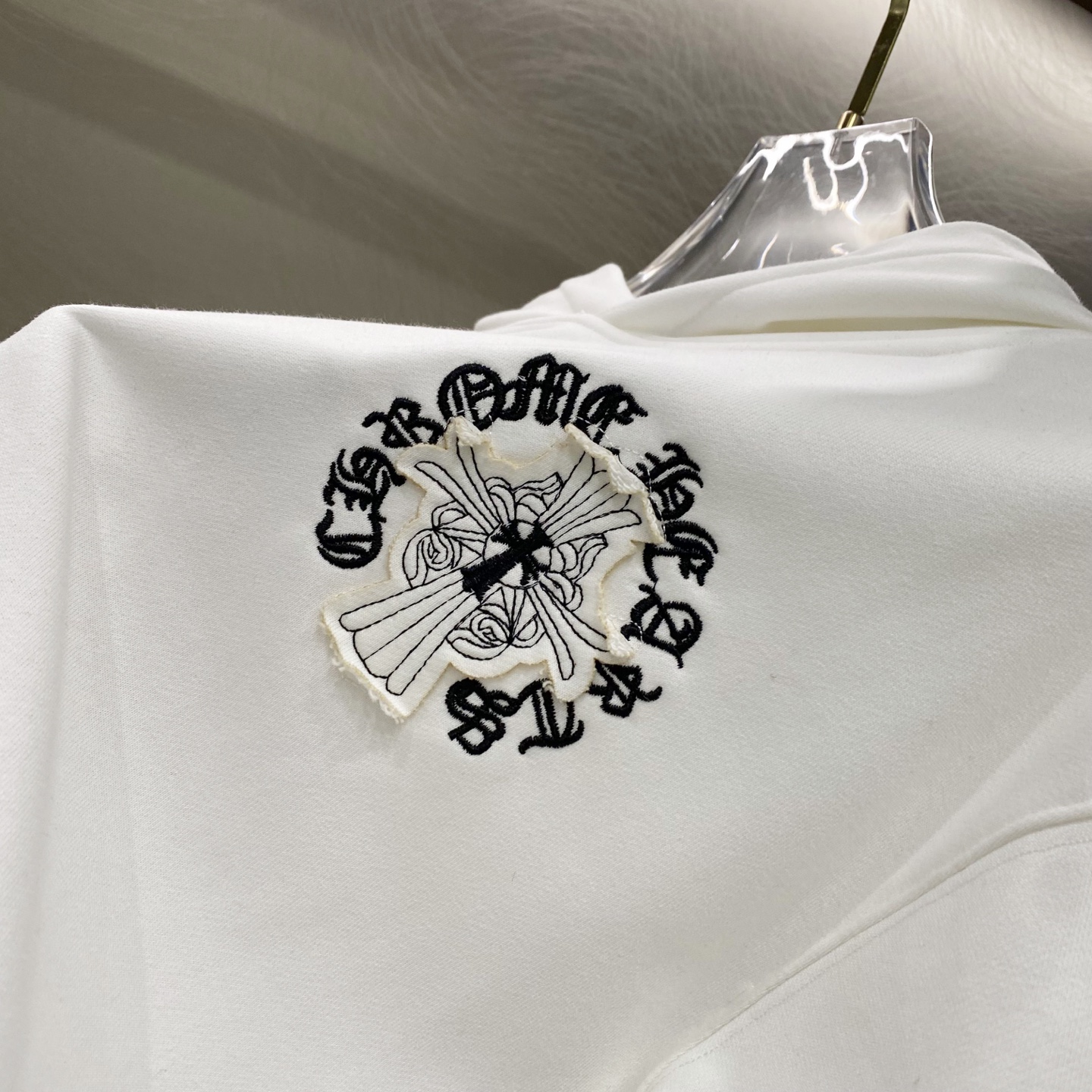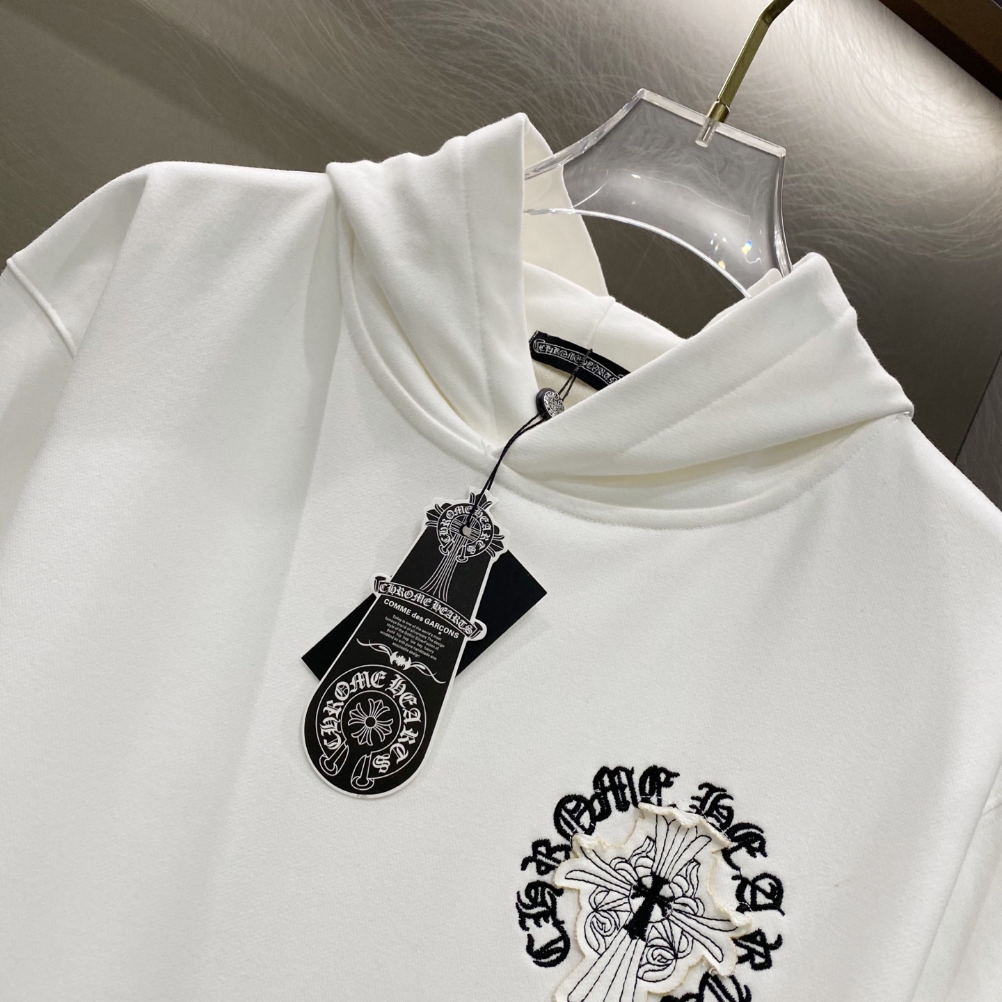 这款衣服是AAAAA 1:1 质量 (非常棒). 使用了和原版一模一样的材料. 商标部分也保持了和克罗心/Chrome Hearts一样. 图片拍摄是实物衣服拍摄, 您所收到的实物保证和我们图片一模一样.