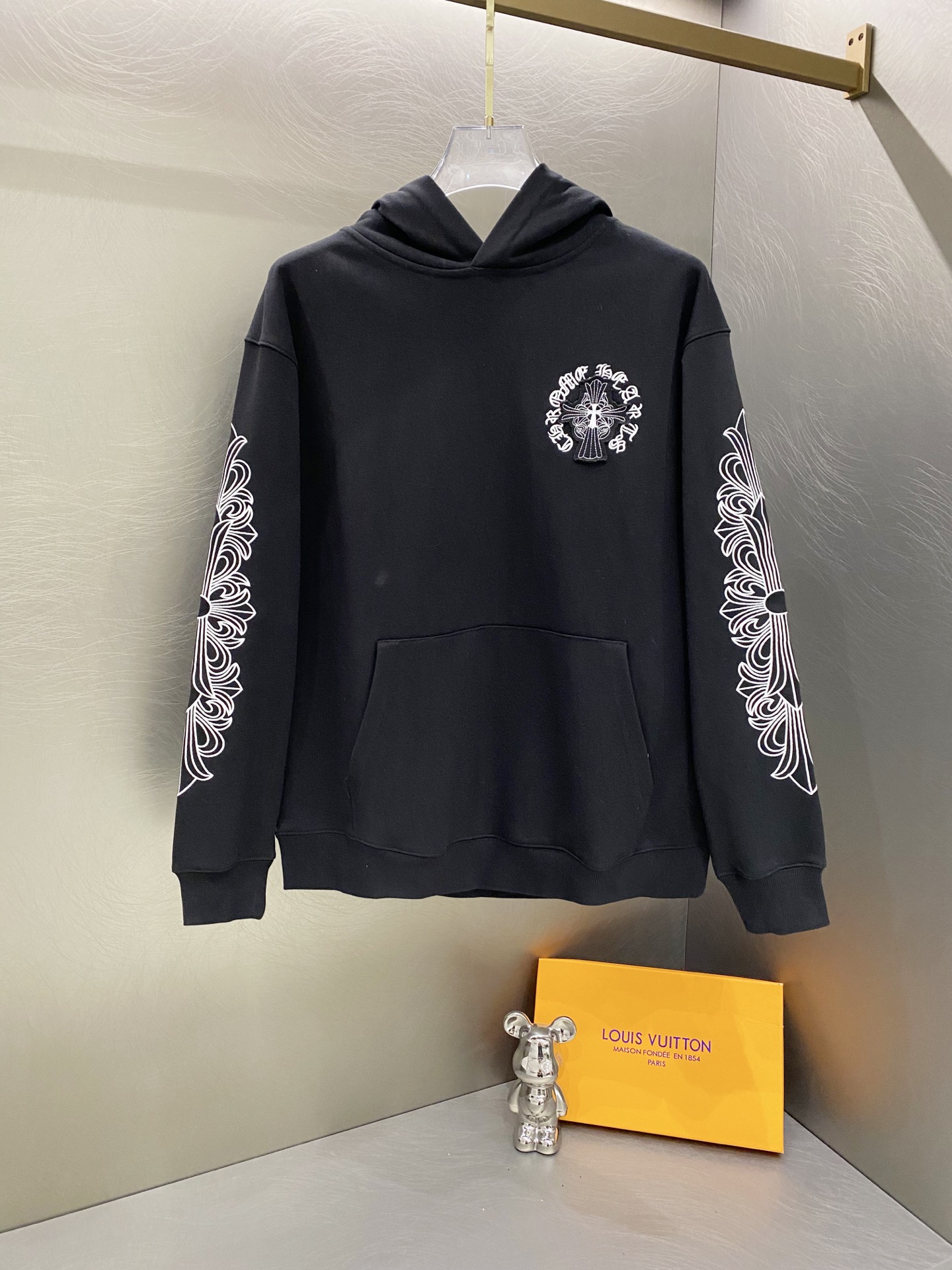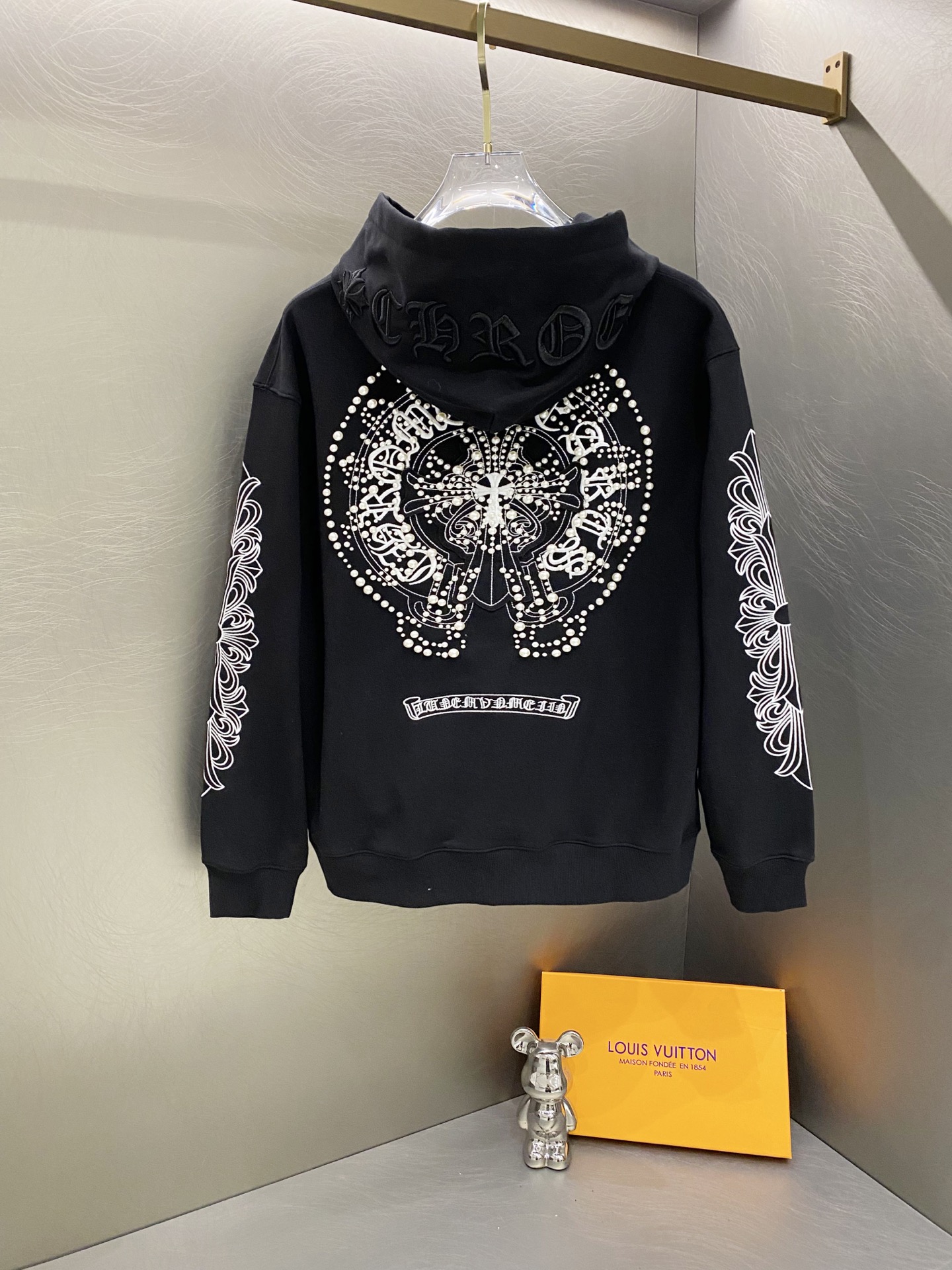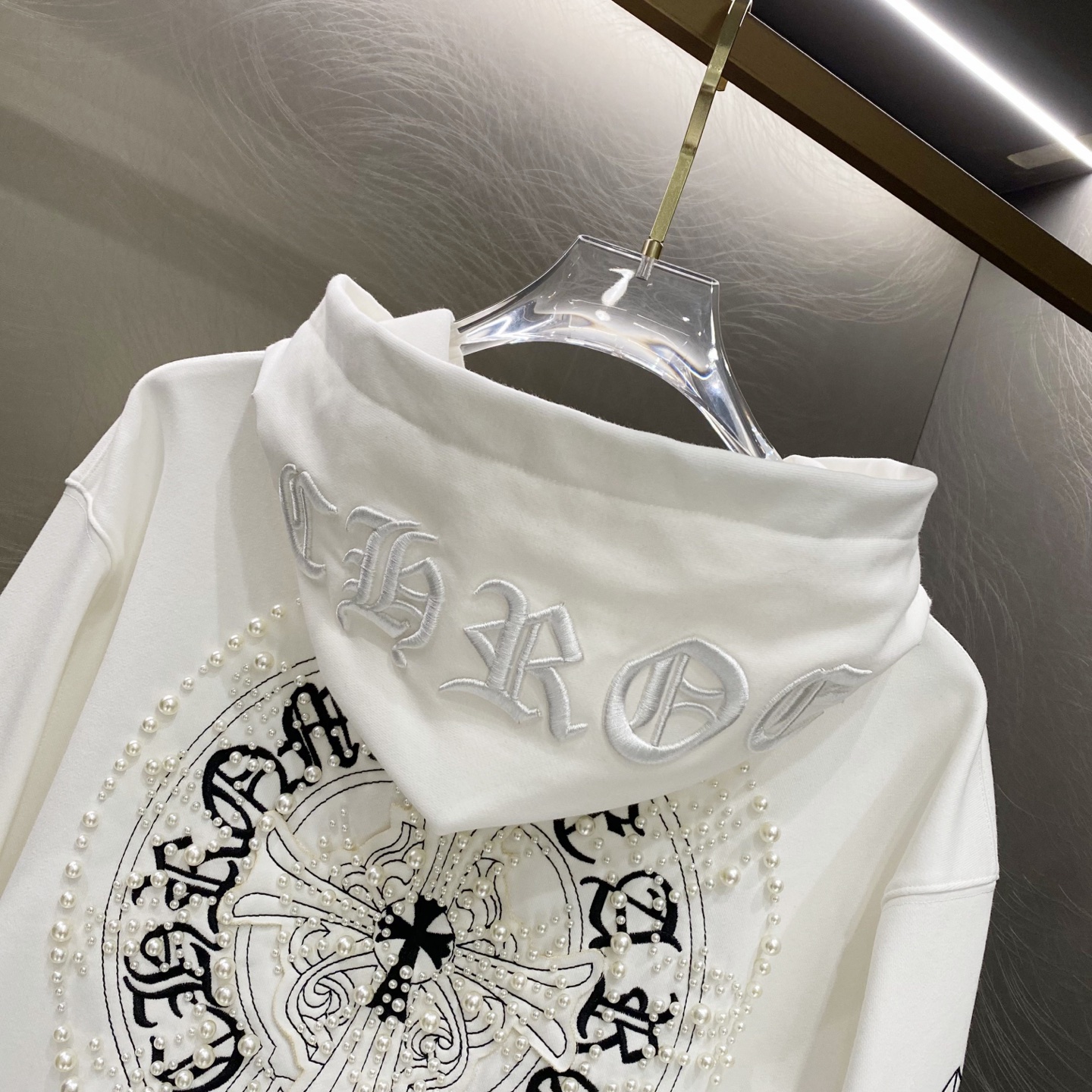 这款衣服是AAAAA 1:1 质量 (非常棒). 使用了和原版一模一样的材料. 商标部分也保持了和克罗心/Chrome Hearts一样. 图片拍摄是实物衣服拍摄, 您所收到的实物保证和我们图片一模一样.