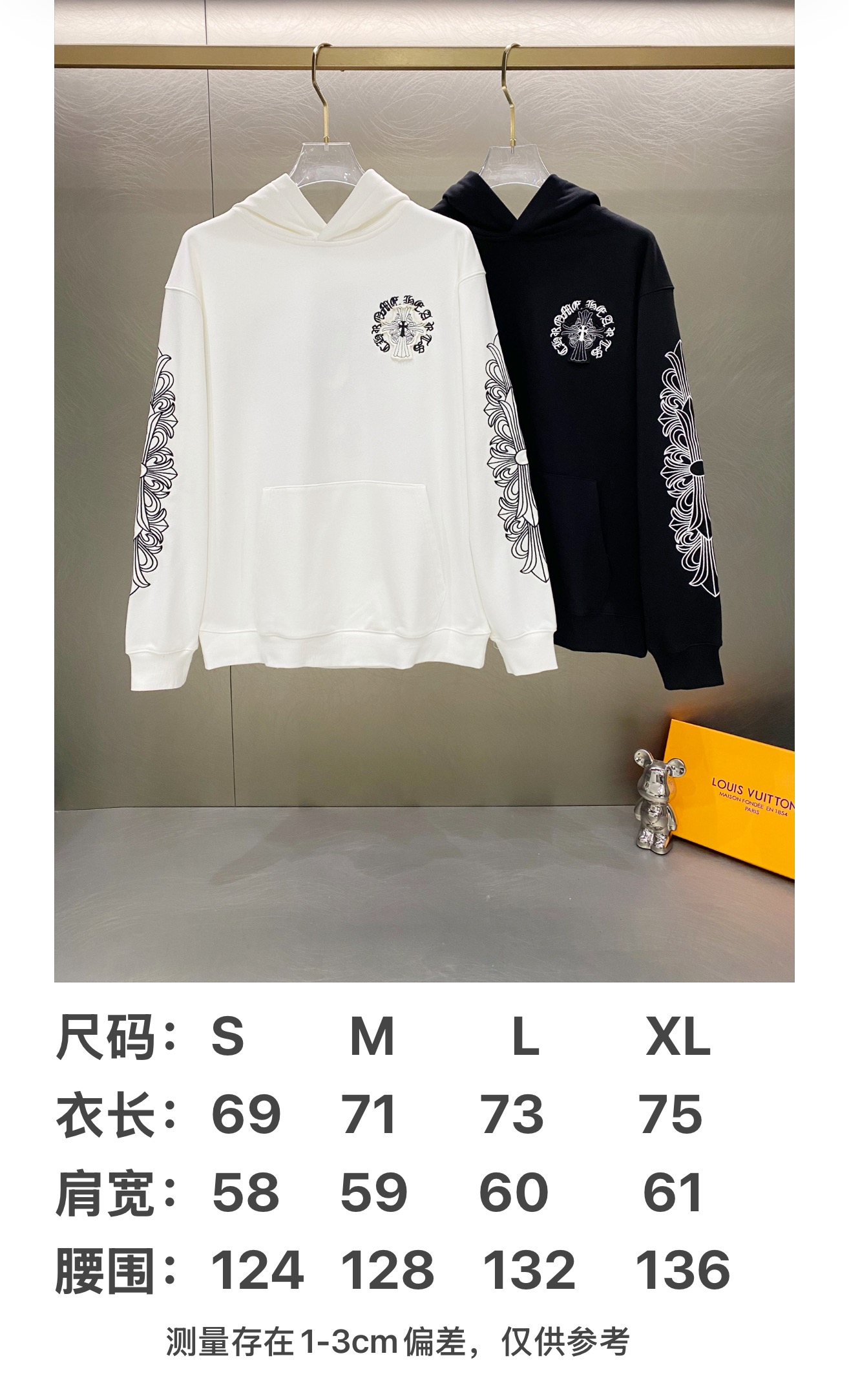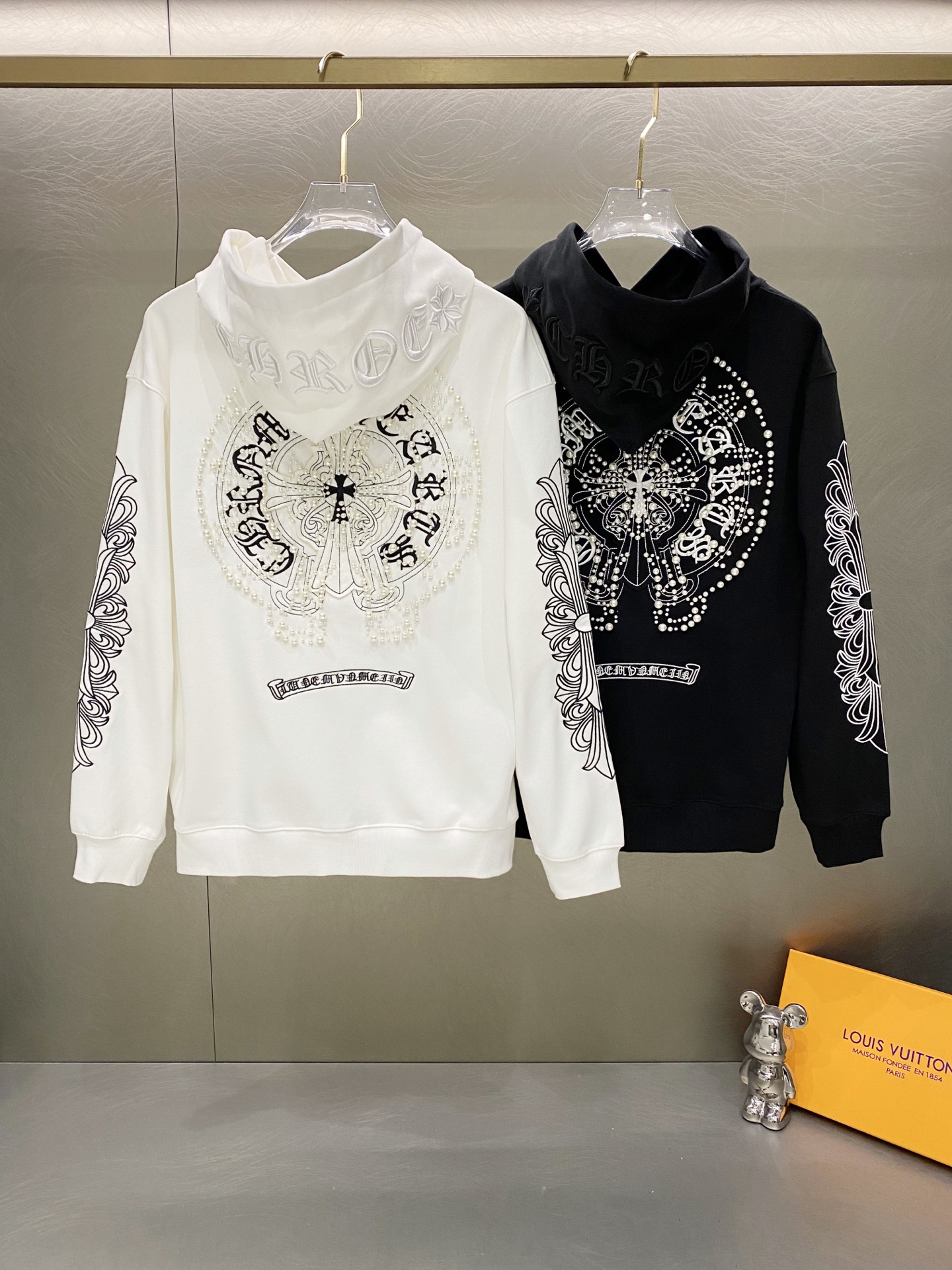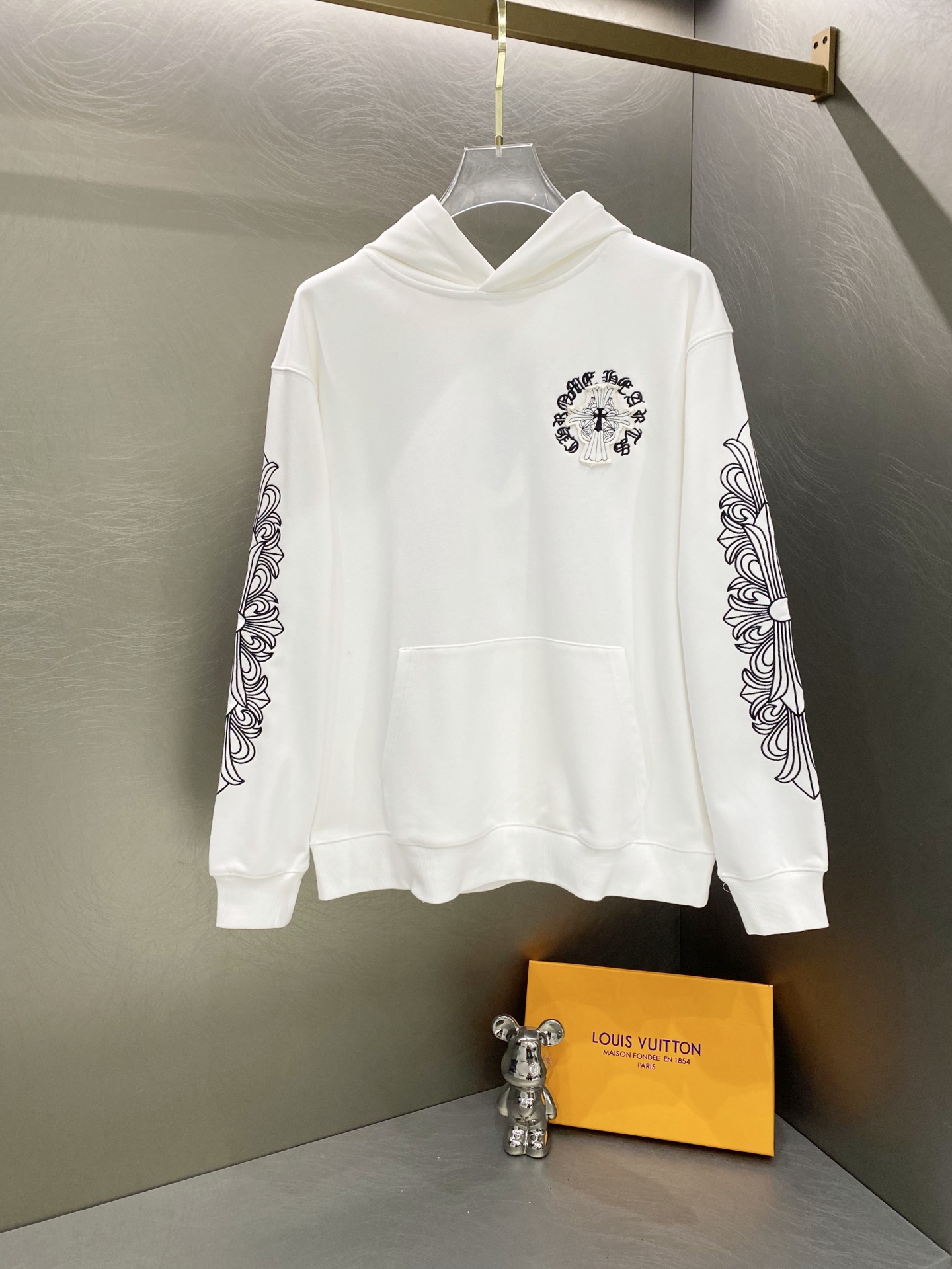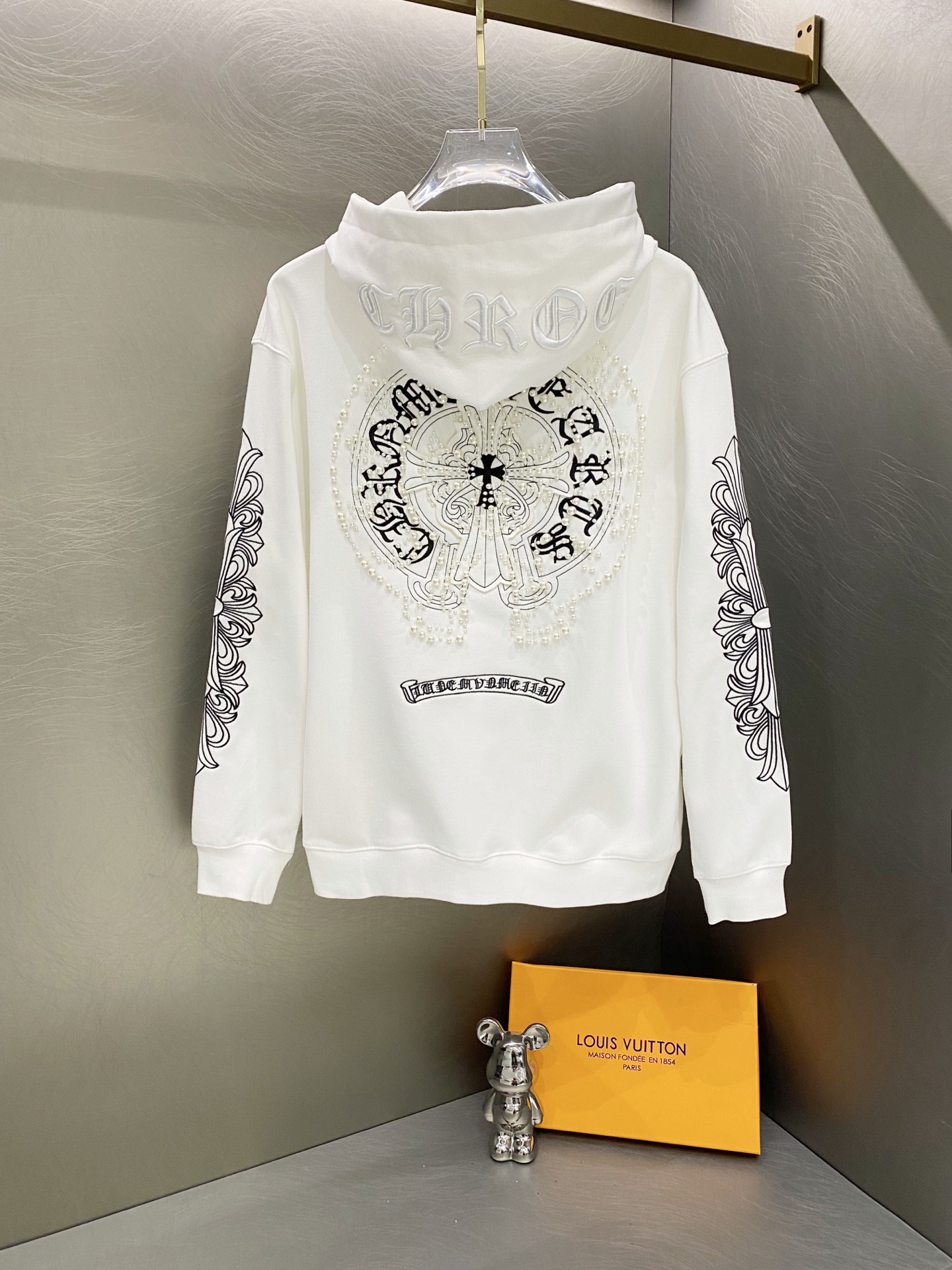 这款衣服是AAAAA 1:1 质量 (非常棒). 使用了和原版一模一样的材料. 商标部分也保持了和克罗心/Chrome Hearts一样. 图片拍摄是实物衣服拍摄, 您所收到的实物保证和我们图片一模一样.