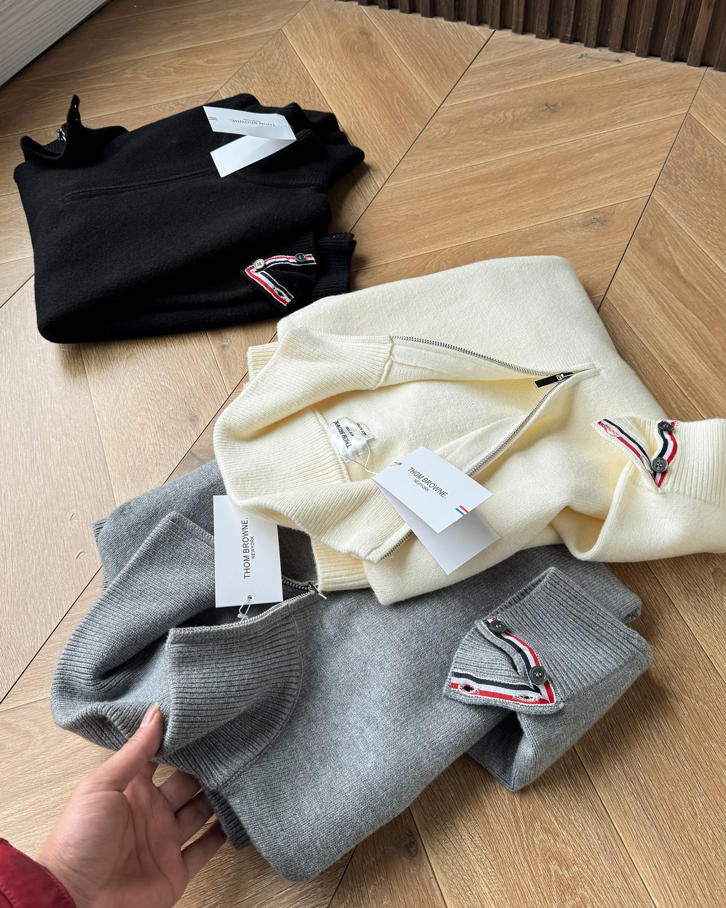 这款衣服是AAAAA 1:1 质量 (非常棒). 使用了和原版一模一样的材料. 商标部分也保持了和汤姆布朗/Thom Browne一样. 图片拍摄是实物衣服拍摄, 您所收到的实物保证和我们图片一模一样.