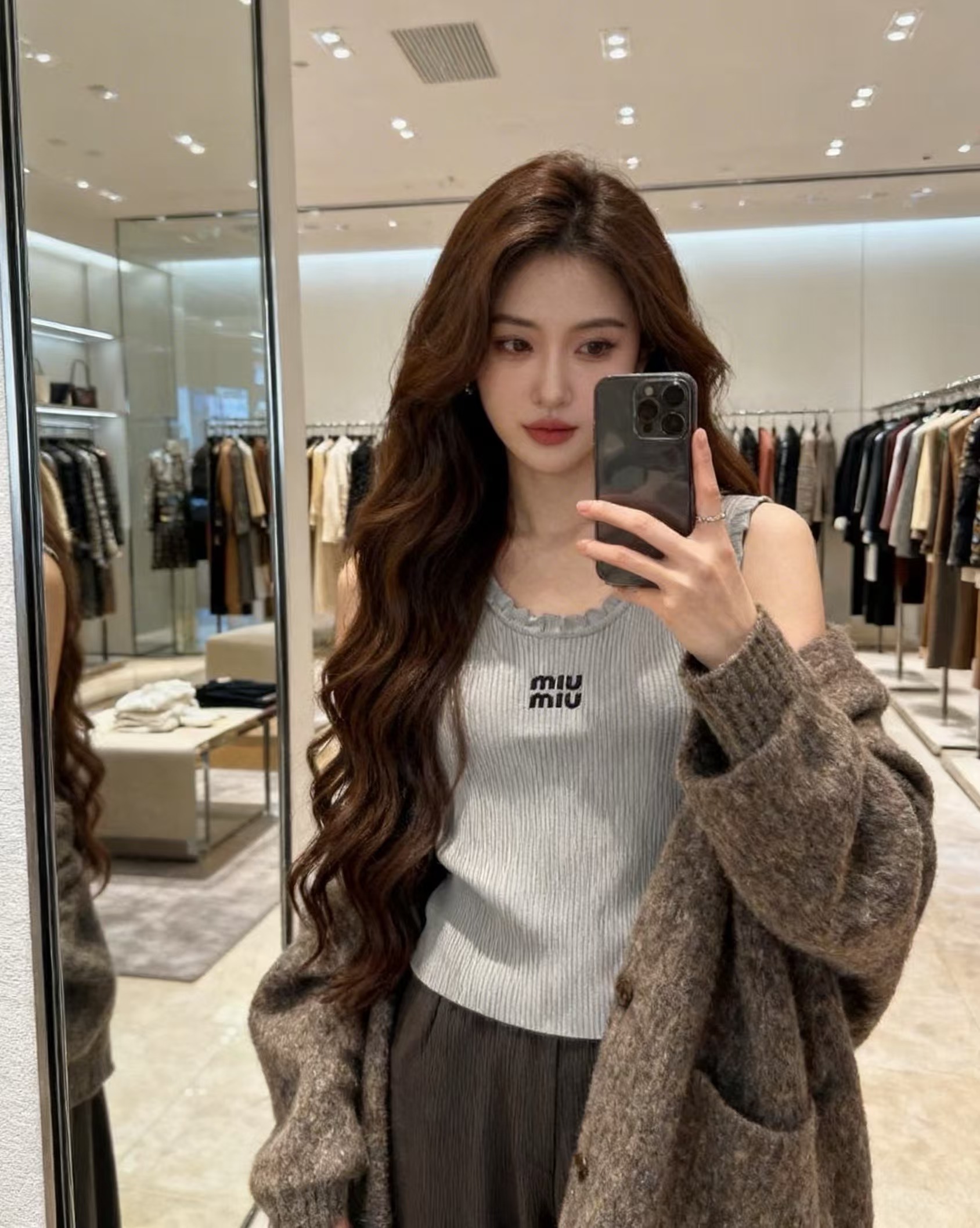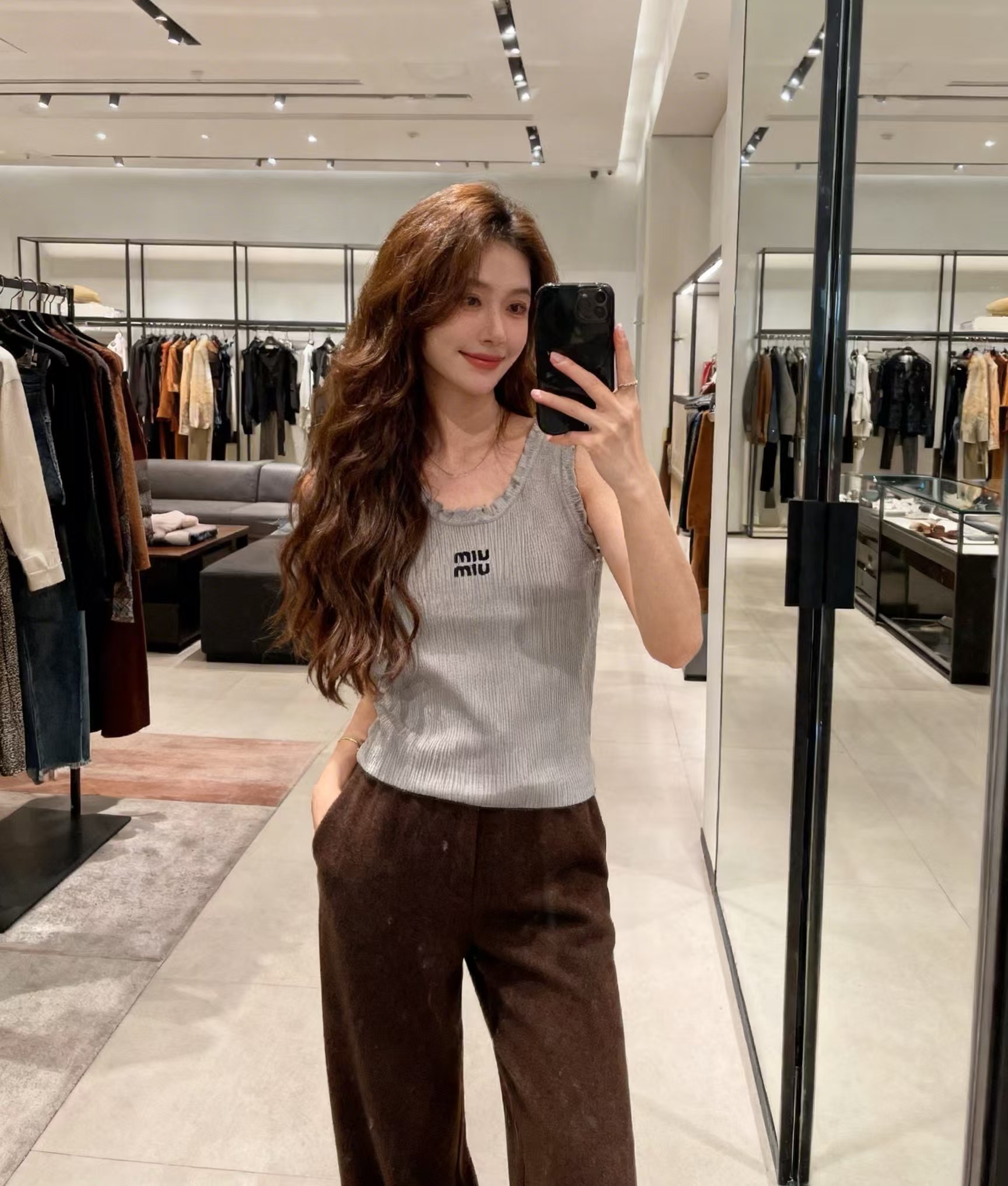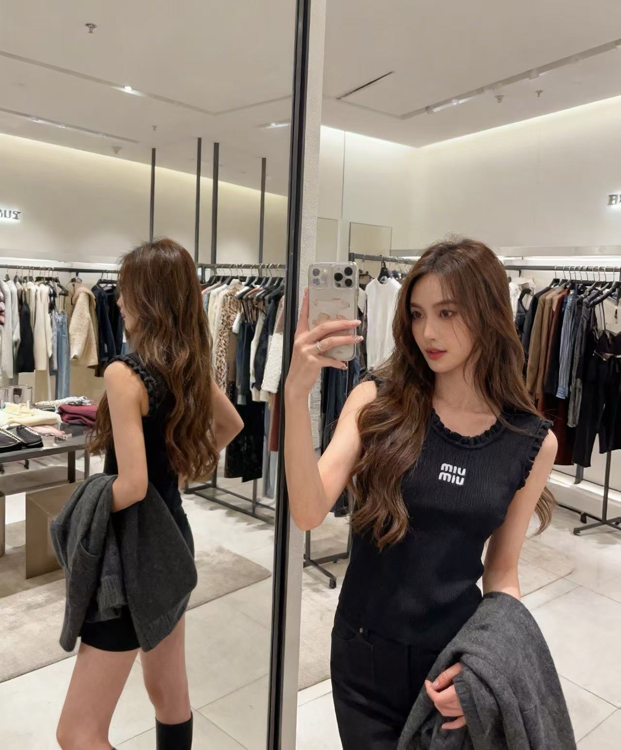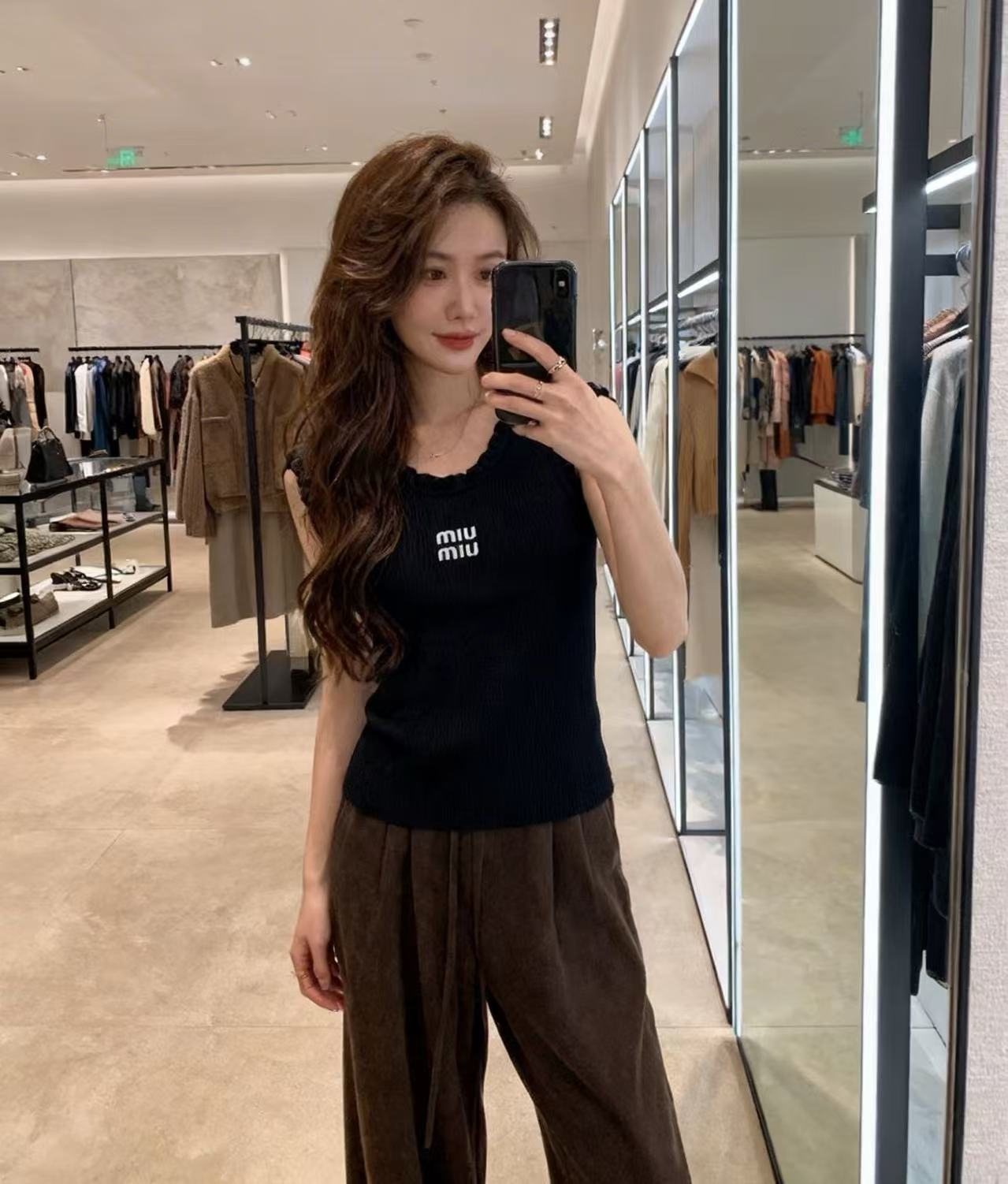 这款衣服是AAAAA 1:1 质量 (非常棒). 使用了和原版一模一样的材料. 商标部分也保持了和缪缪/Miu Miu一样. 图片拍摄是实物衣服拍摄, 您所收到的实物保证和我们图片一模一样.