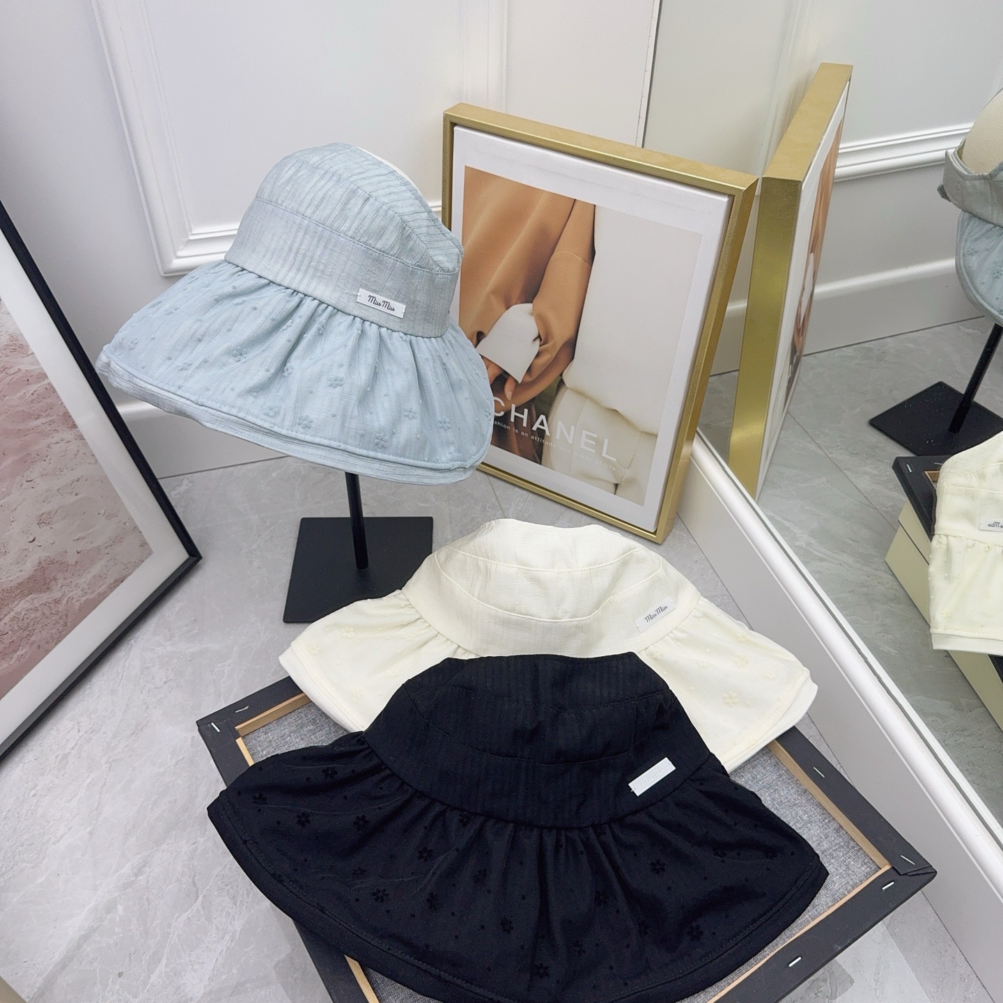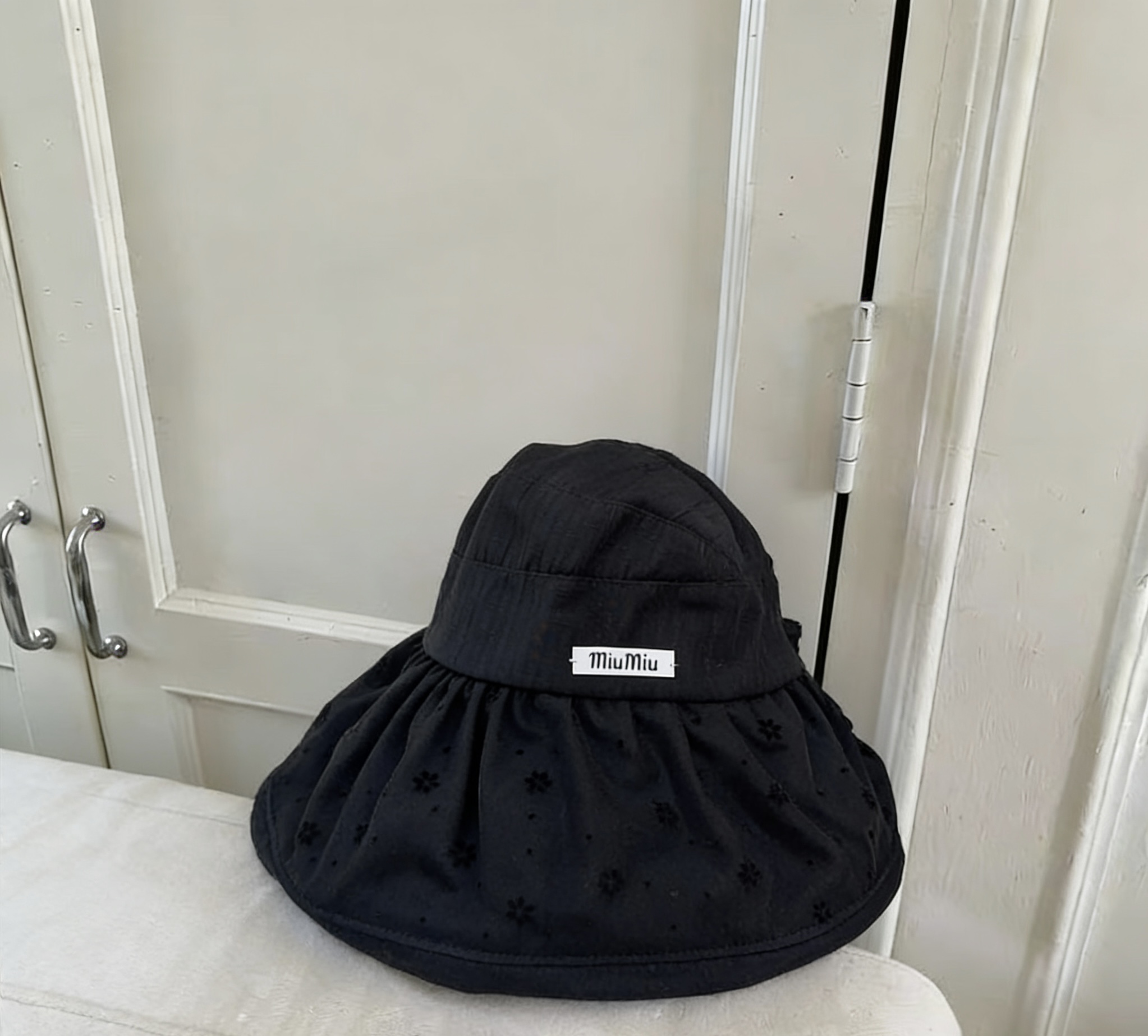 这款帽子是AAAAA 1:1 质量 (非常棒). 使用了和原版一模一样的材料. 商标部分也保持了和缪缪/Miu Miu一样. 图片拍摄是实物帽子拍摄, 您所收到的实物保证和我们图片一模一样.