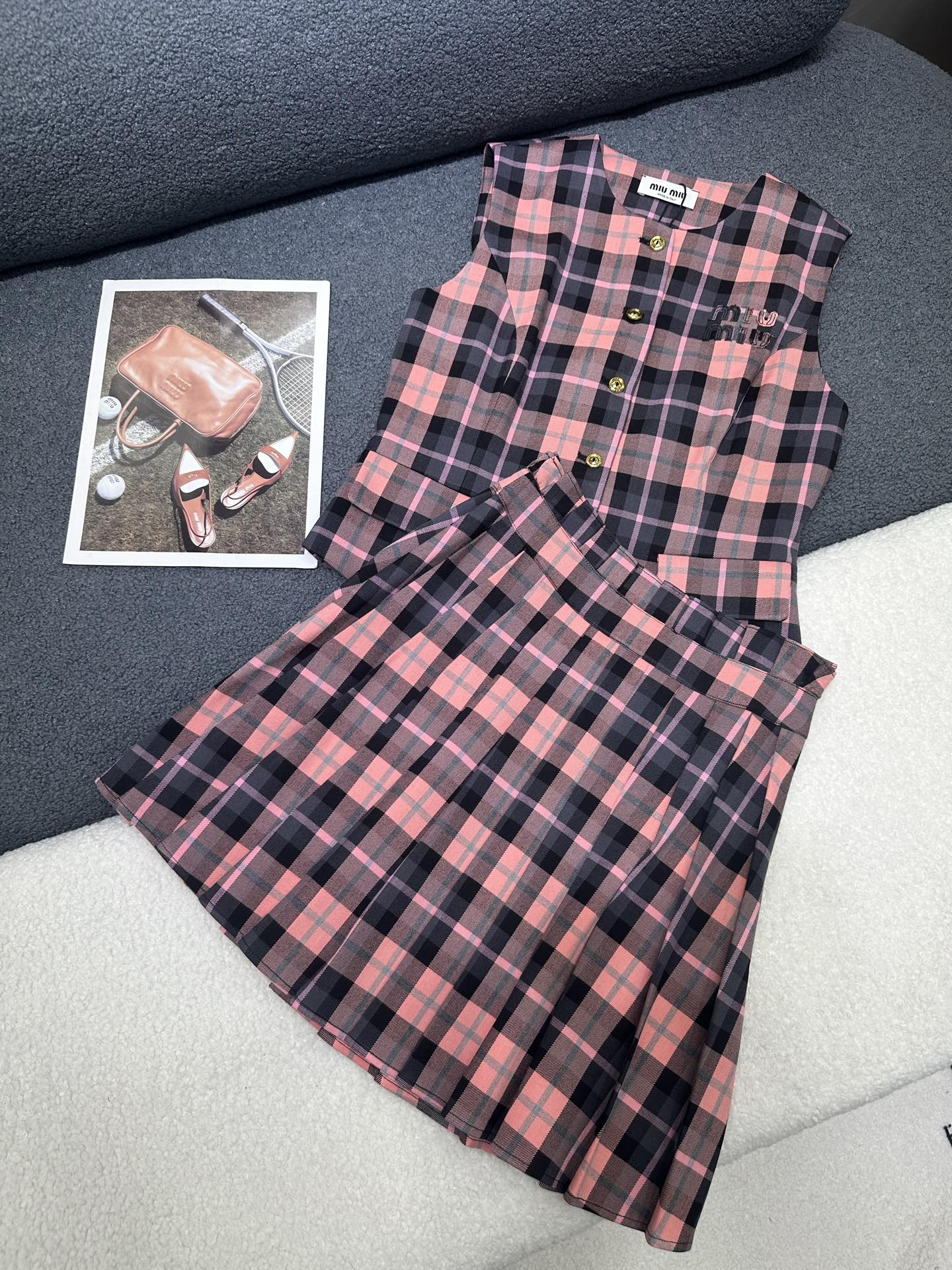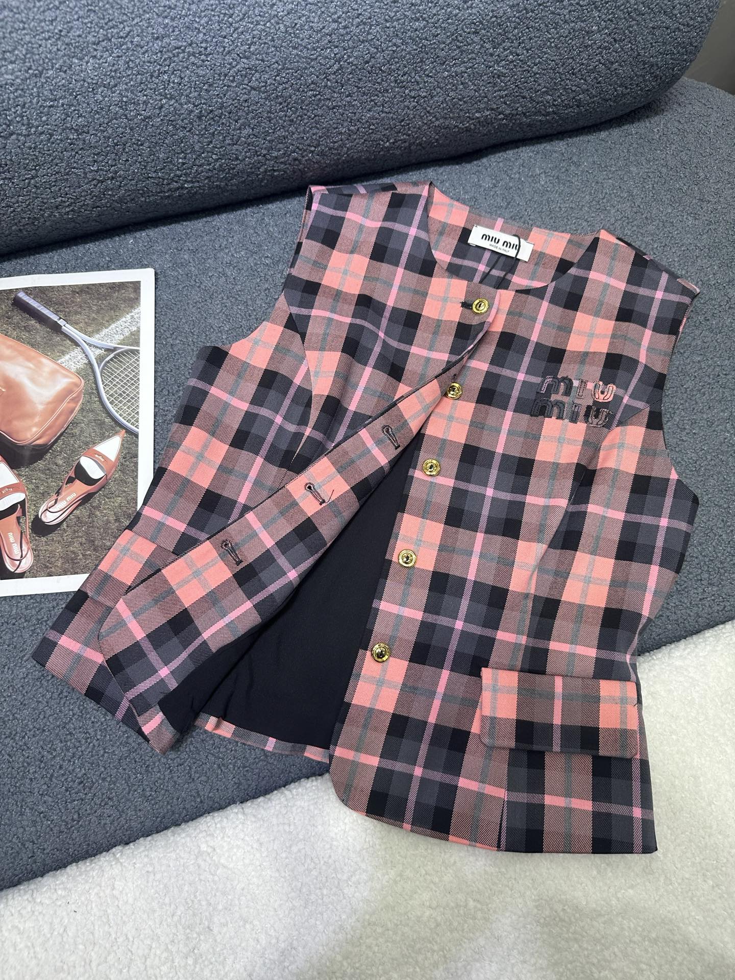 这款衣服是AAAAA 1:1 质量 (非常棒). 使用了和原版一模一样的材料. 商标部分也保持了和缪缪/Miu Miu一样. 图片拍摄是实物衣服拍摄, 您所收到的实物保证和我们图片一模一样.