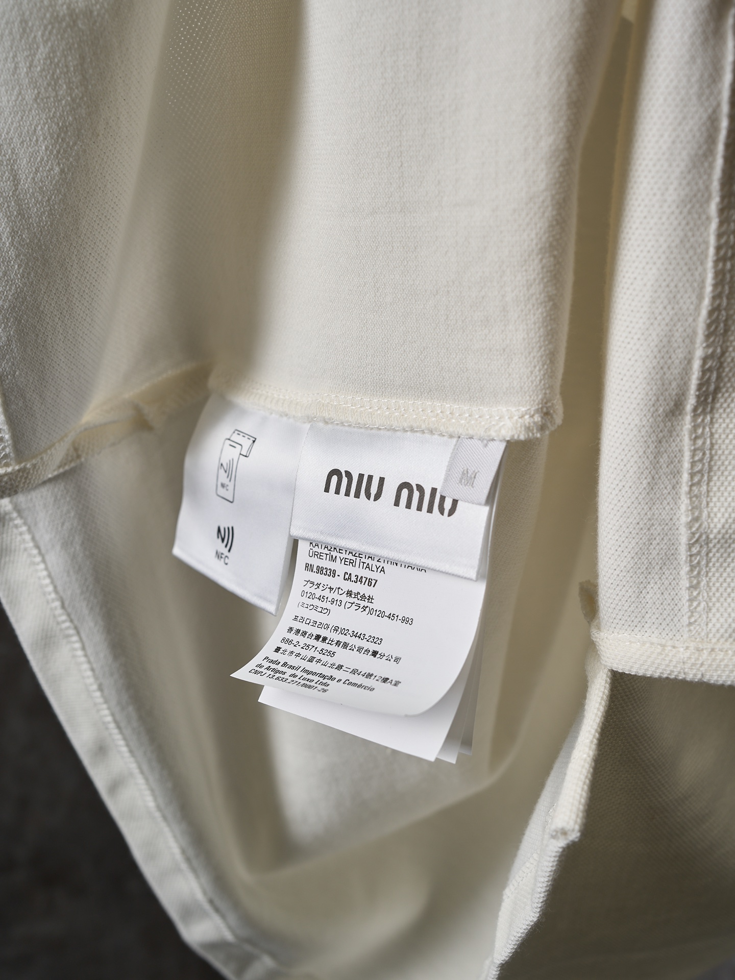 这款衣服是AAAAA 1:1 质量 (非常棒). 使用了和原版一模一样的材料. 商标部分也保持了和缪缪/Miu Miu一样. 图片拍摄是实物衣服拍摄, 您所收到的实物保证和我们图片一模一样.