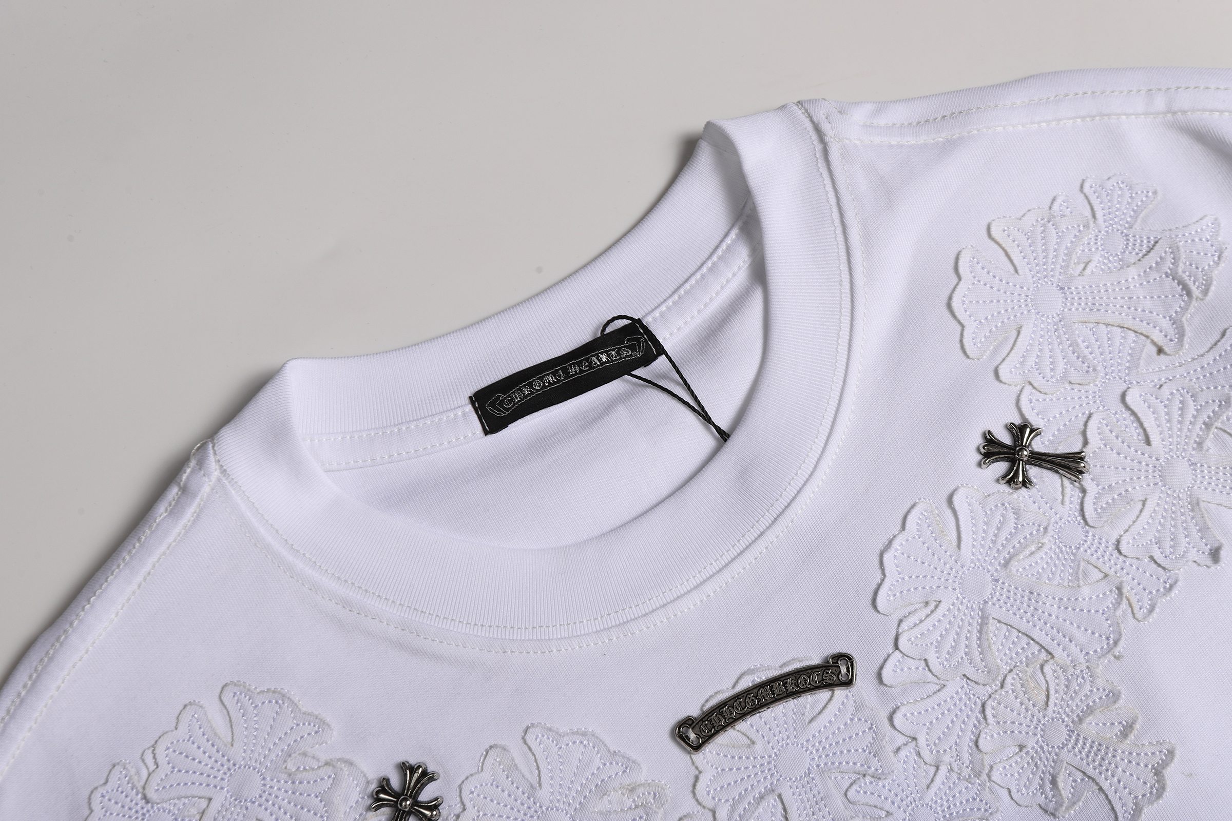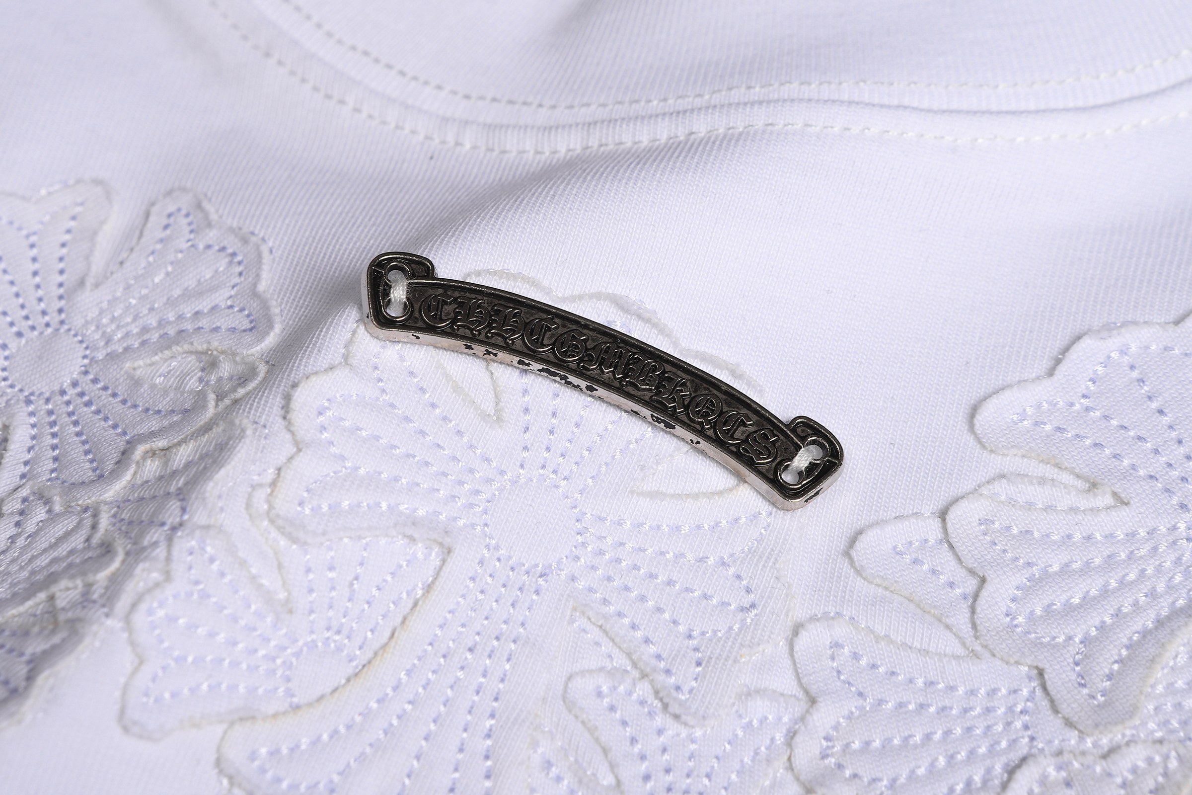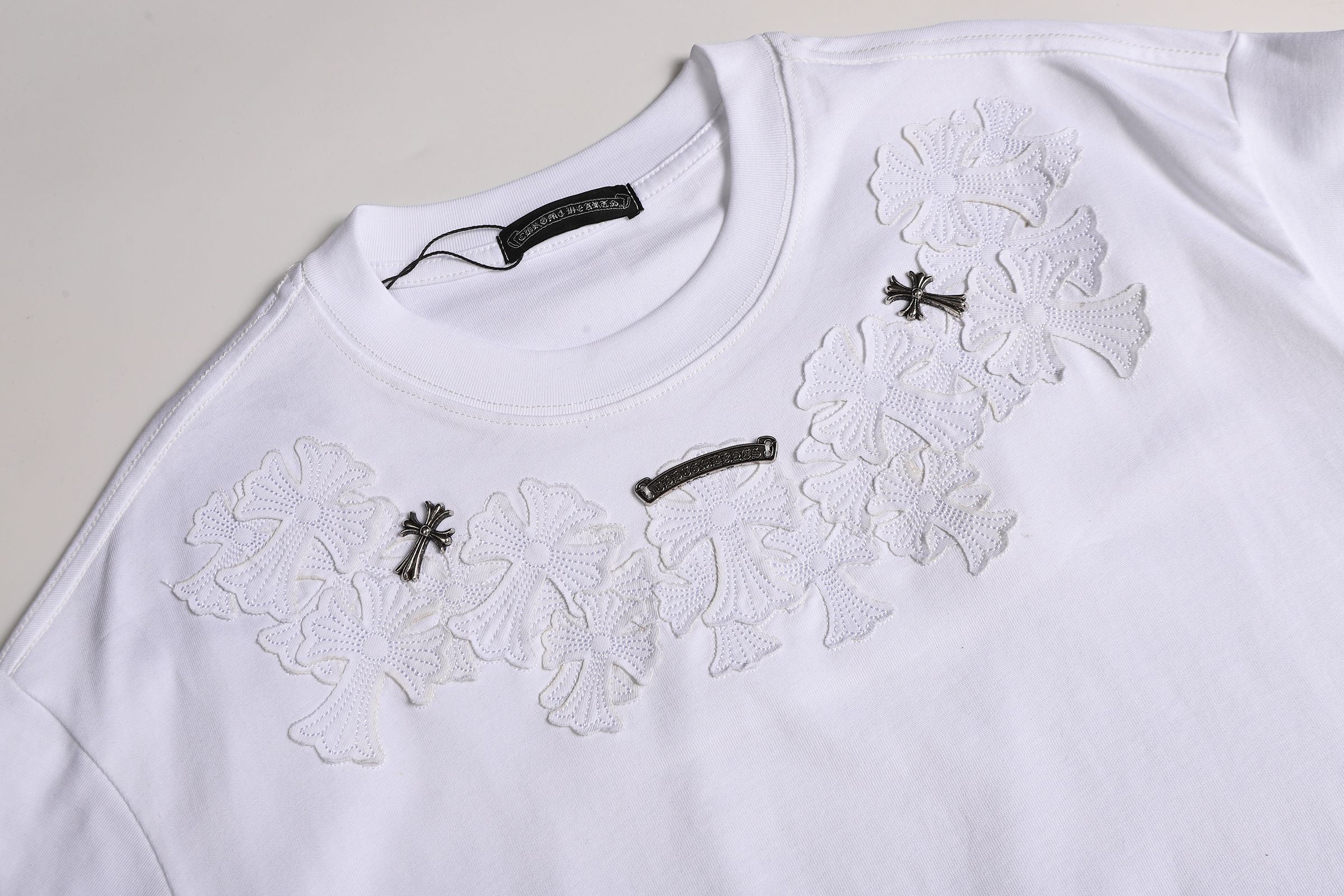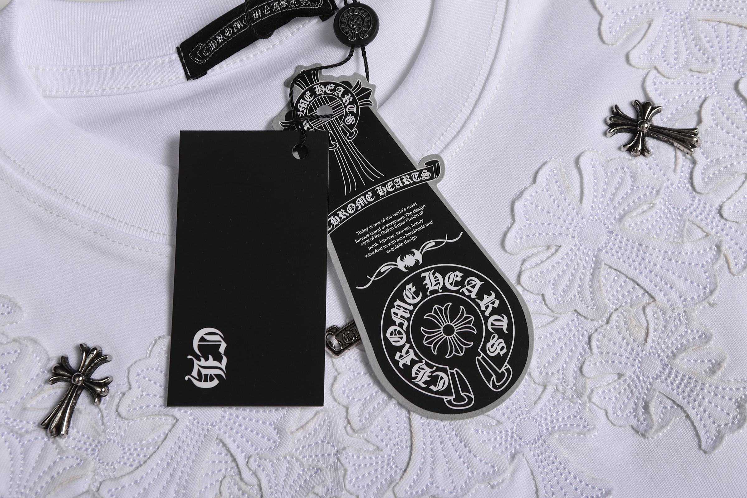 这款衣服是AAAAA 1:1 质量 (非常棒). 使用了和原版一模一样的材料. 商标部分也保持了和克罗心/Chrome Hearts一样. 图片拍摄是实物衣服拍摄, 您所收到的实物保证和我们图片一模一样.