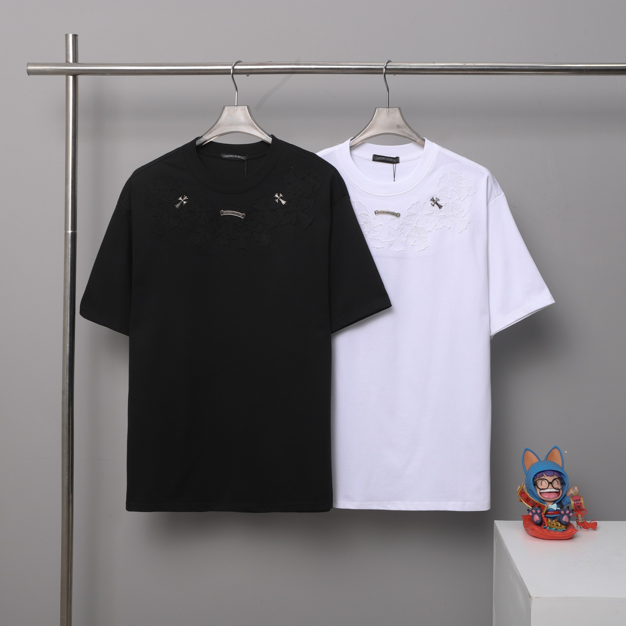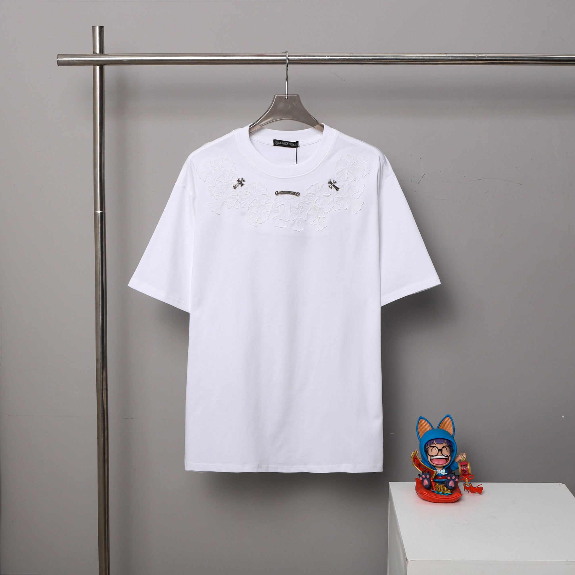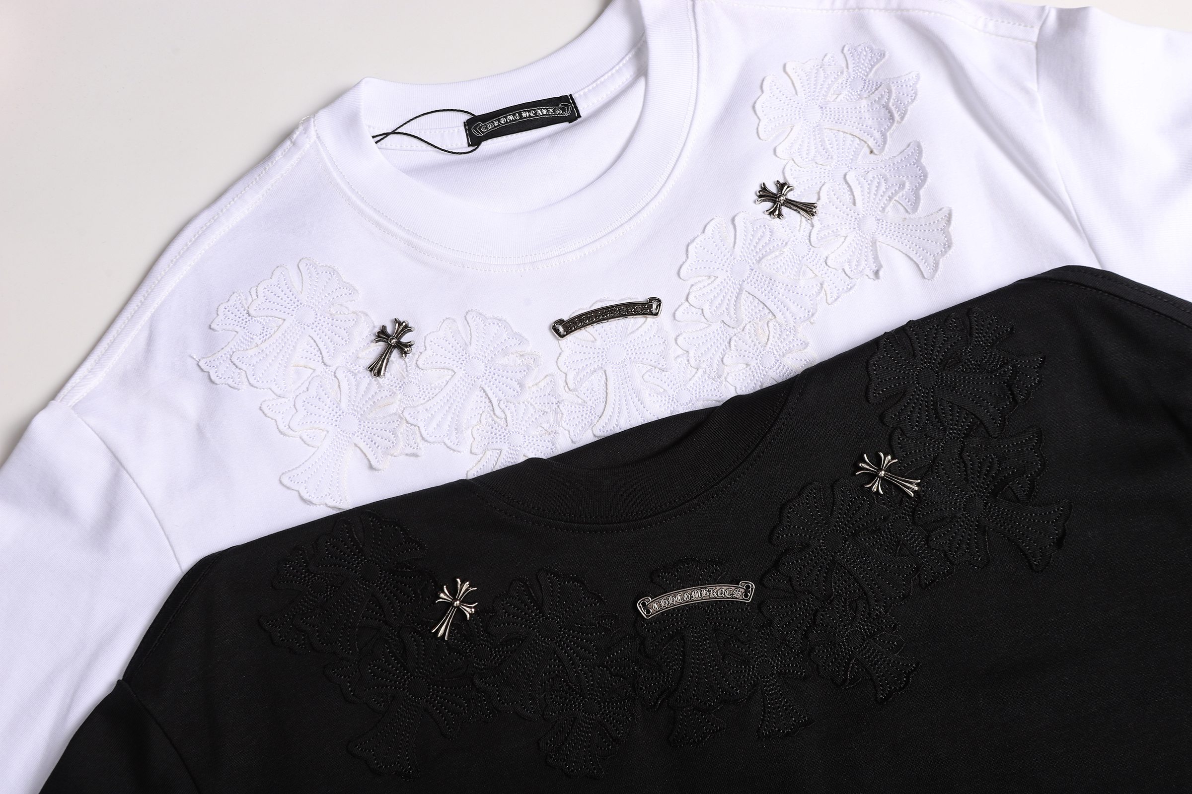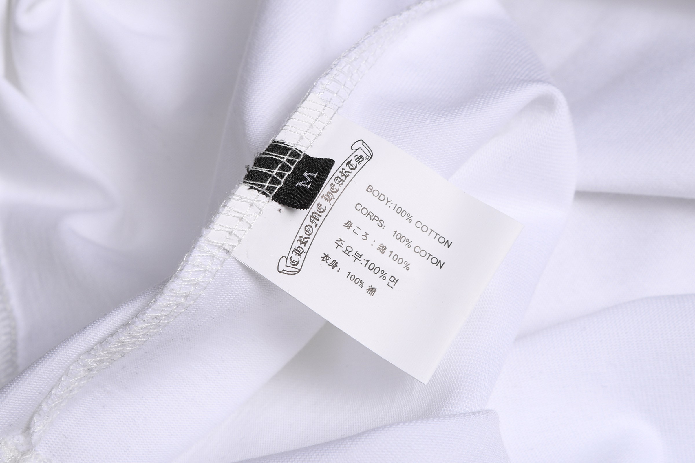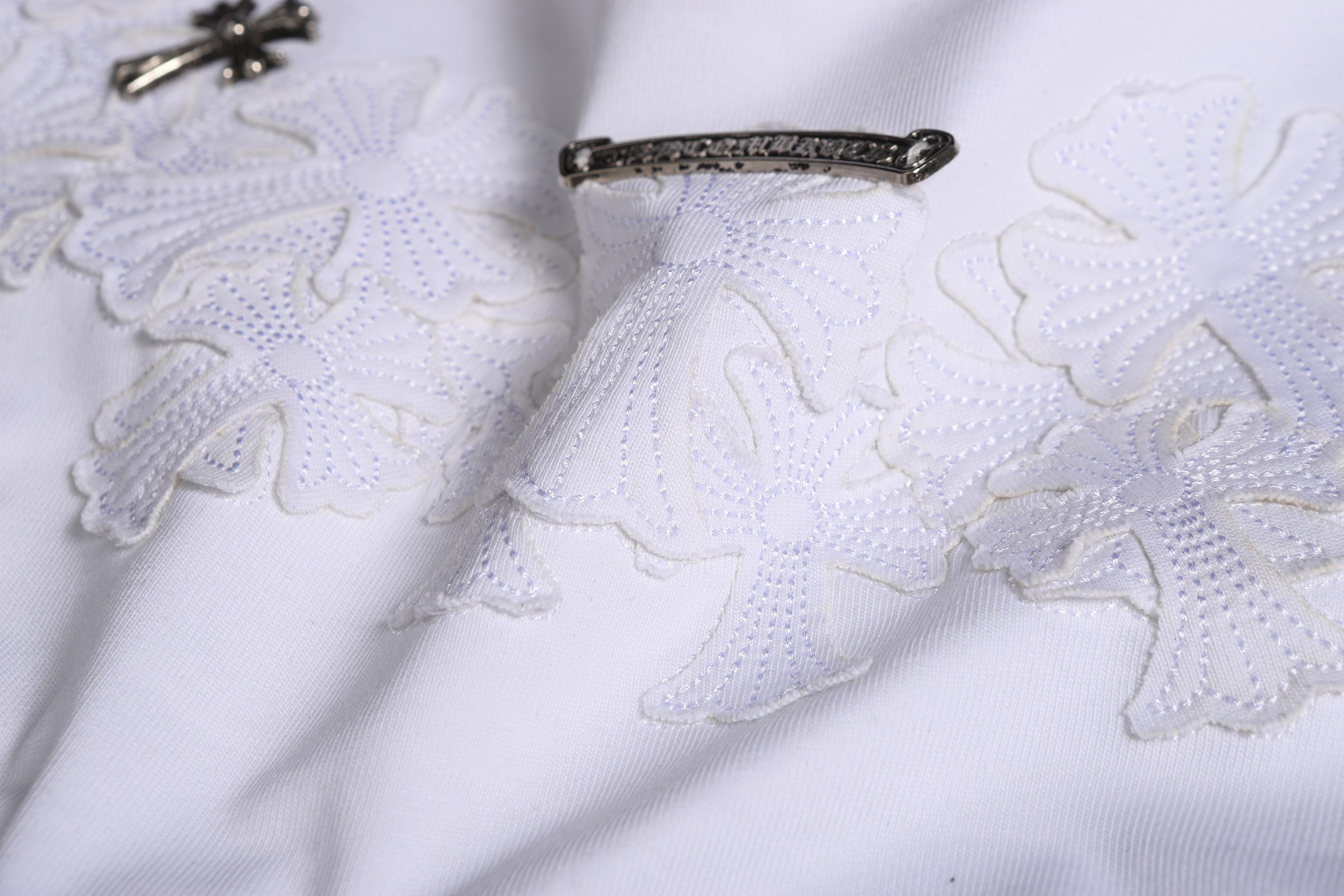 这款衣服是AAAAA 1:1 质量 (非常棒). 使用了和原版一模一样的材料. 商标部分也保持了和克罗心/Chrome Hearts一样. 图片拍摄是实物衣服拍摄, 您所收到的实物保证和我们图片一模一样.
