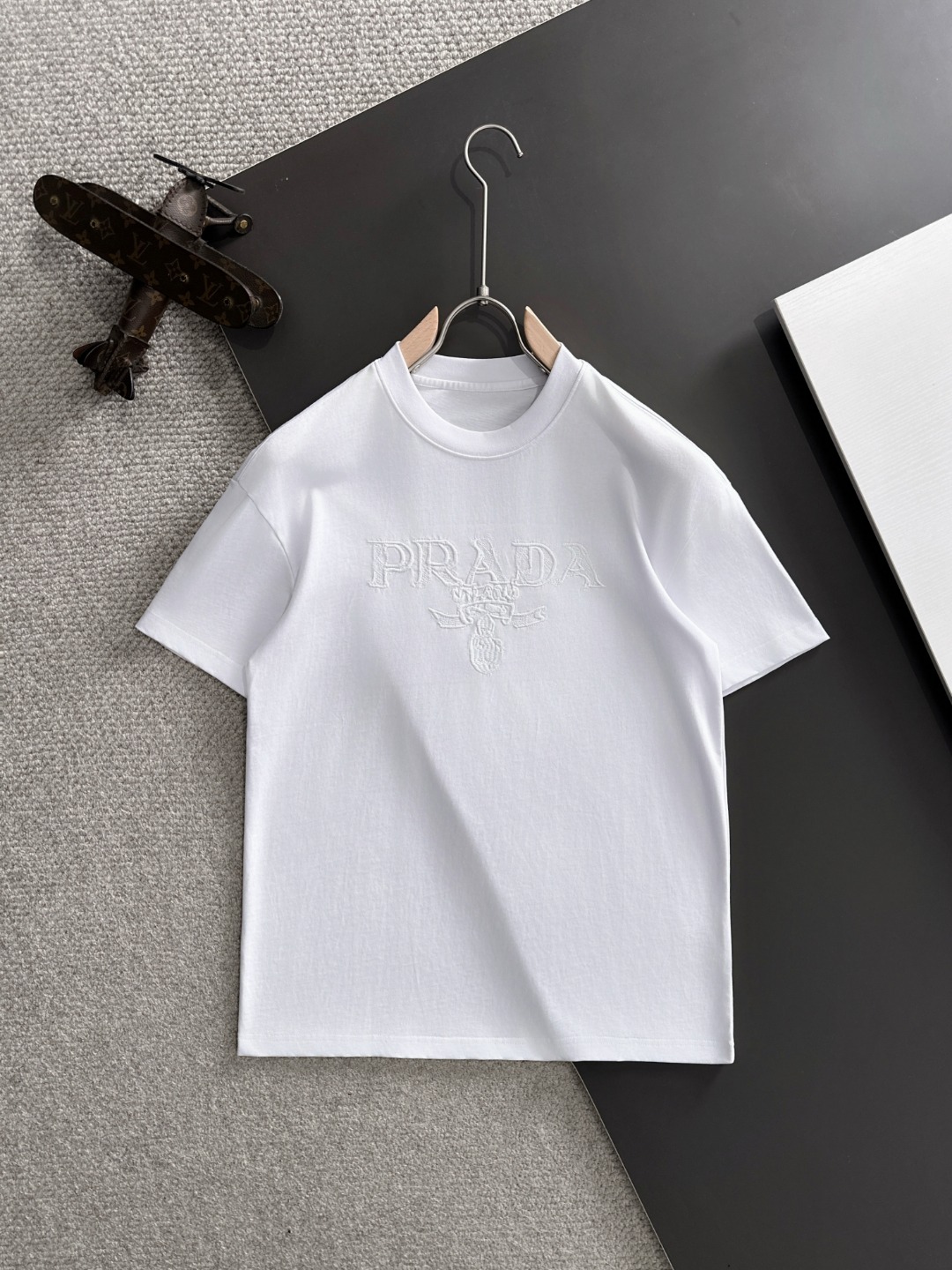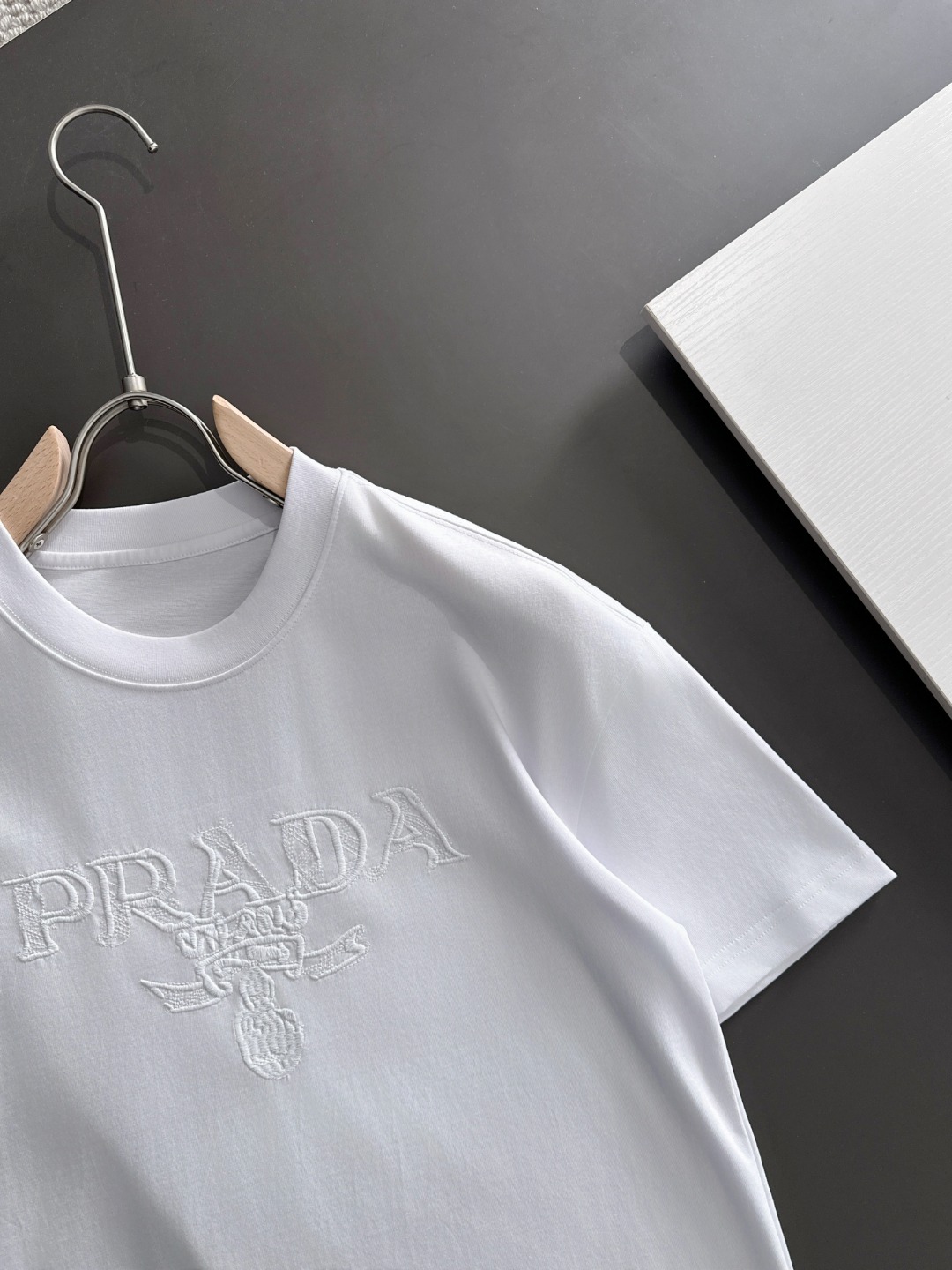 这款衣服是AAAAA 1:1 质量 (非常棒). 使用了和原版一模一样的材料. 商标部分也保持了和普拉达/Prada一样. 图片拍摄是实物衣服拍摄, 您所收到的实物保证和我们图片一模一样.