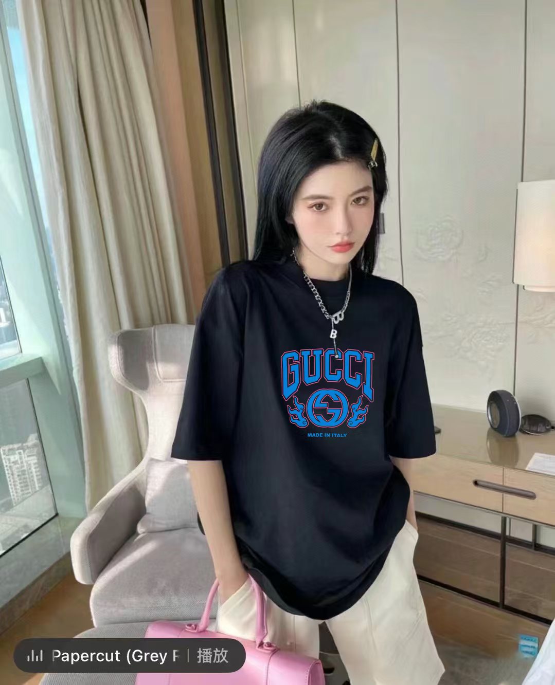 这款衣服是AAAAA 1:1 质量 (非常棒). 使用了和原版一模一样的材料. 商标部分也保持了和古奇/Gucci一样. 图片拍摄是实物衣服拍摄, 您所收到的实物保证和我们图片一模一样.