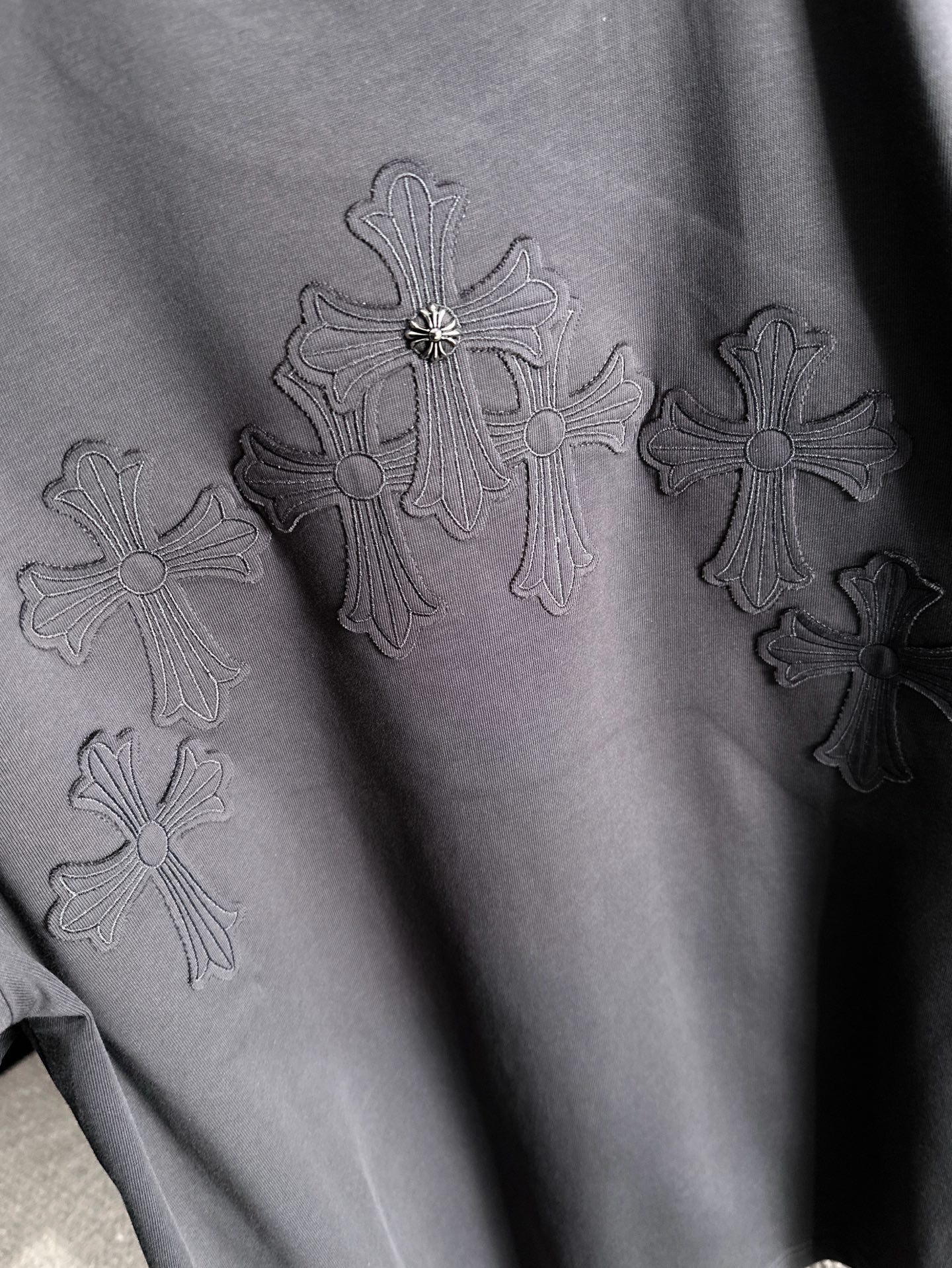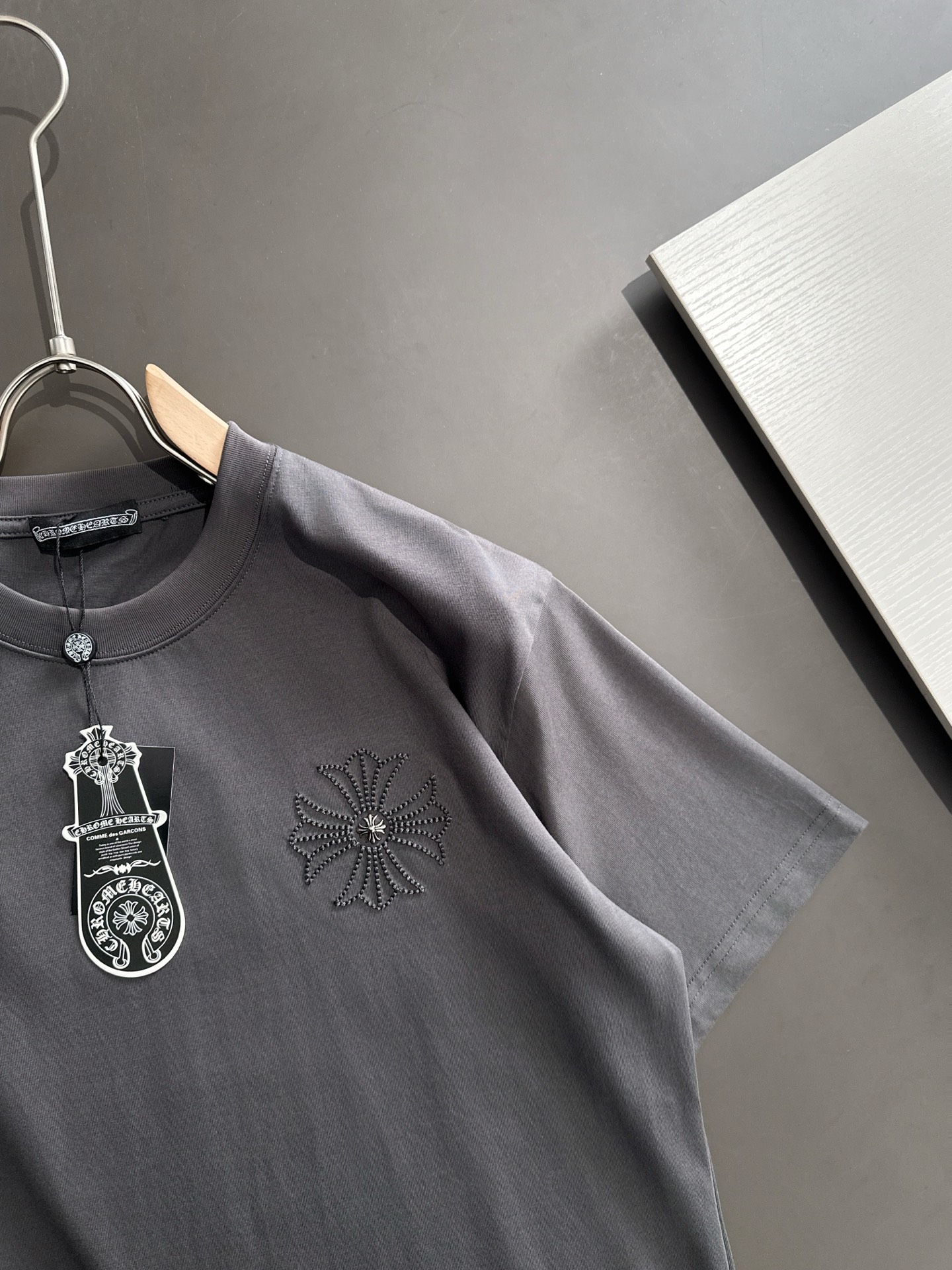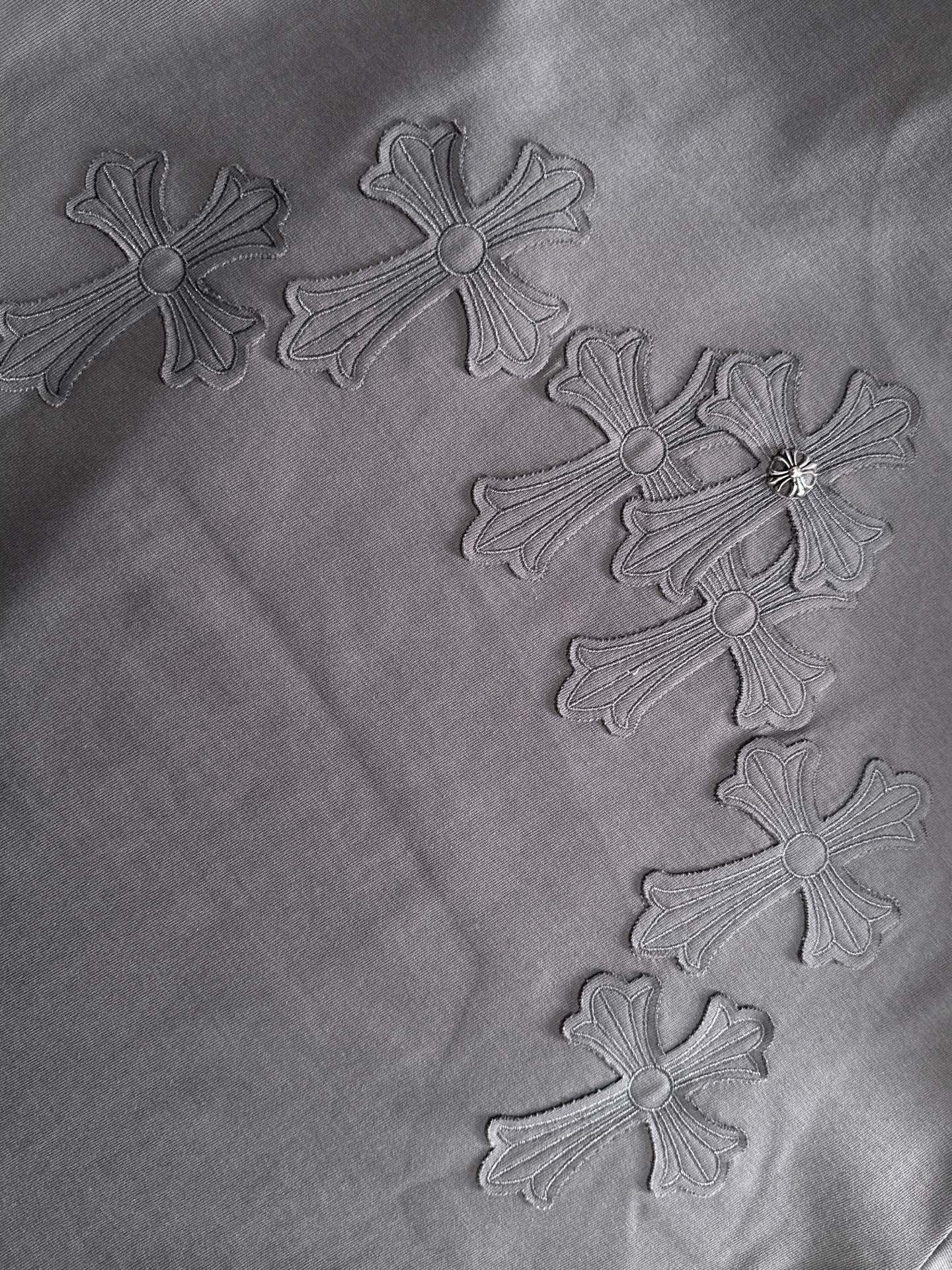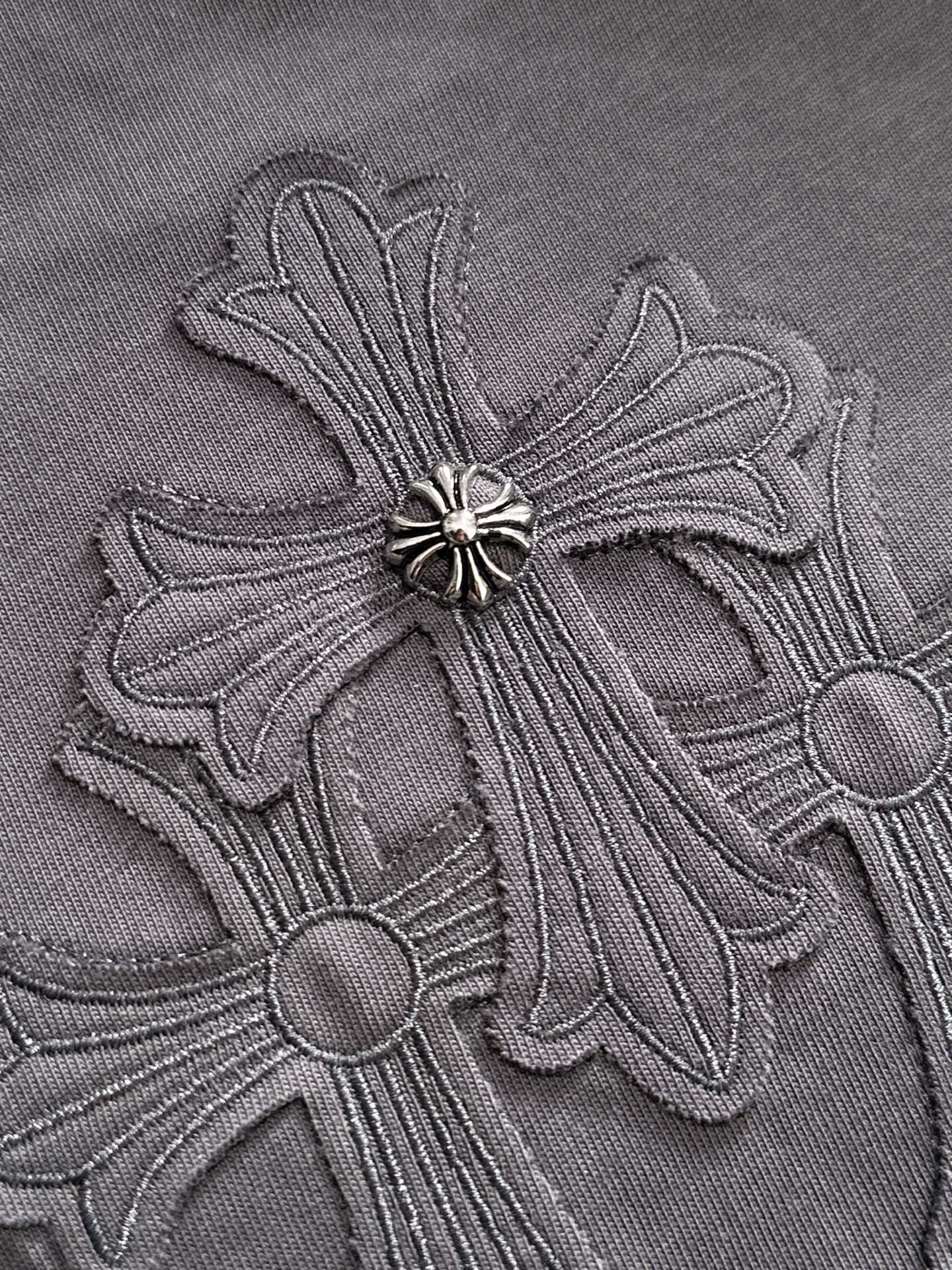 这款衣服是AAAAA 1:1 质量 (非常棒). 使用了和原版一模一样的材料. 商标部分也保持了和克罗心/Chrome Hearts一样. 图片拍摄是实物衣服拍摄, 您所收到的实物保证和我们图片一模一样.