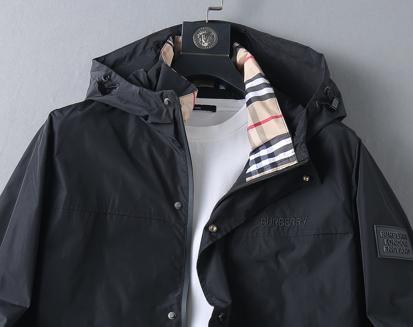 这款衣服是AAAAA 1:1 质量 (非常棒). 使用了和原版一模一样的材料. 商标部分也保持了和巴宝莉/Burberry一样. 图片拍摄是实物衣服拍摄, 您所收到的实物保证和我们图片一模一样.