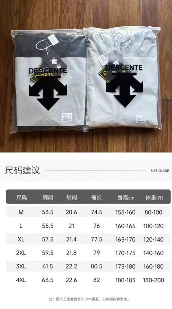 这款衣服是AAAAA 1:1 质量 (非常棒). 使用了和原版一模一样的材料. 商标部分也保持了和Descente一样. 图片拍摄是实物衣服拍摄, 您所收到的实物保证和我们图片一模一样.