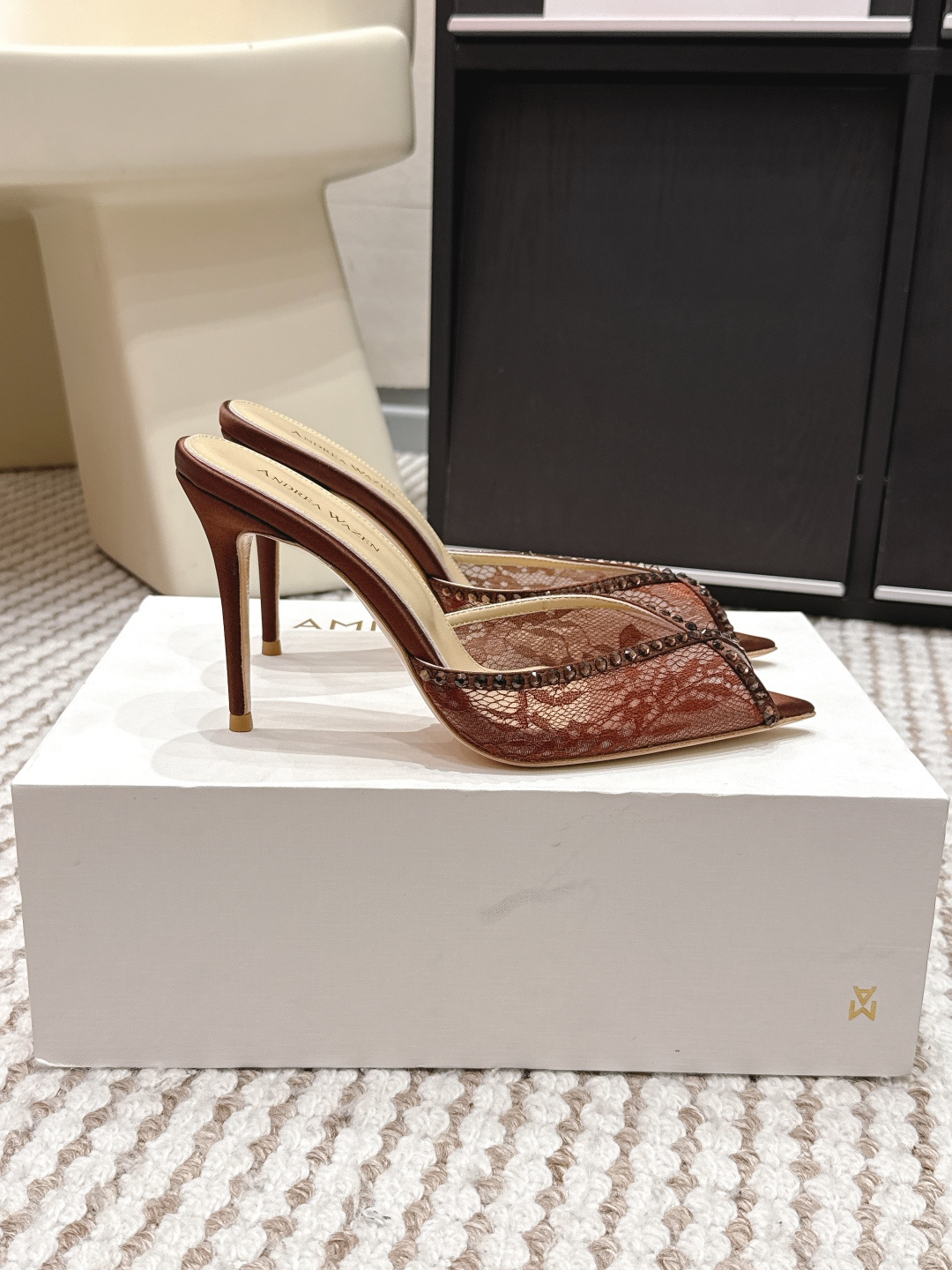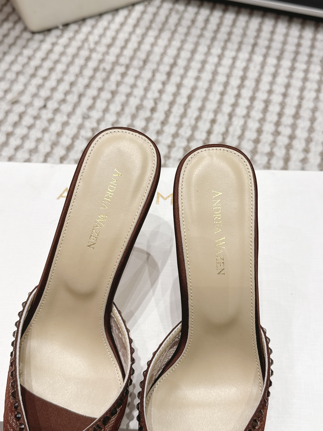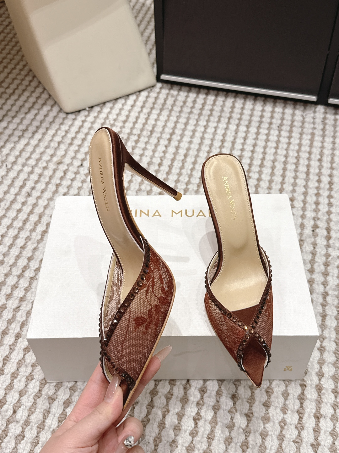 这款鞋子是AAAAA 1:1 质量 (非常棒). 使用了和原版一模一样的材料. 商标部分也保持了和Andrea Wazen一样. 图片拍摄是实物鞋子拍摄, 您所收到的实物保证和我们图片一模一样.