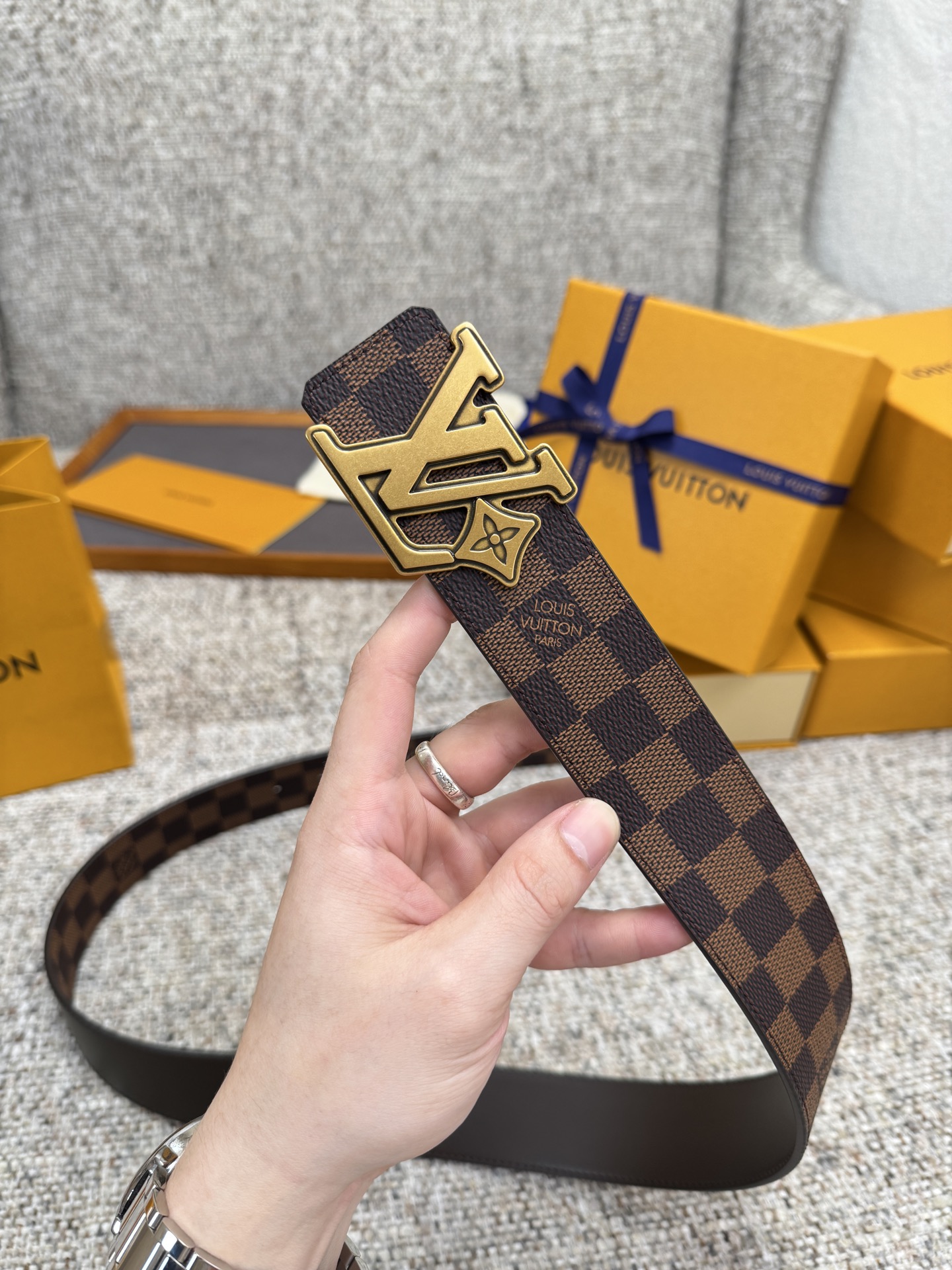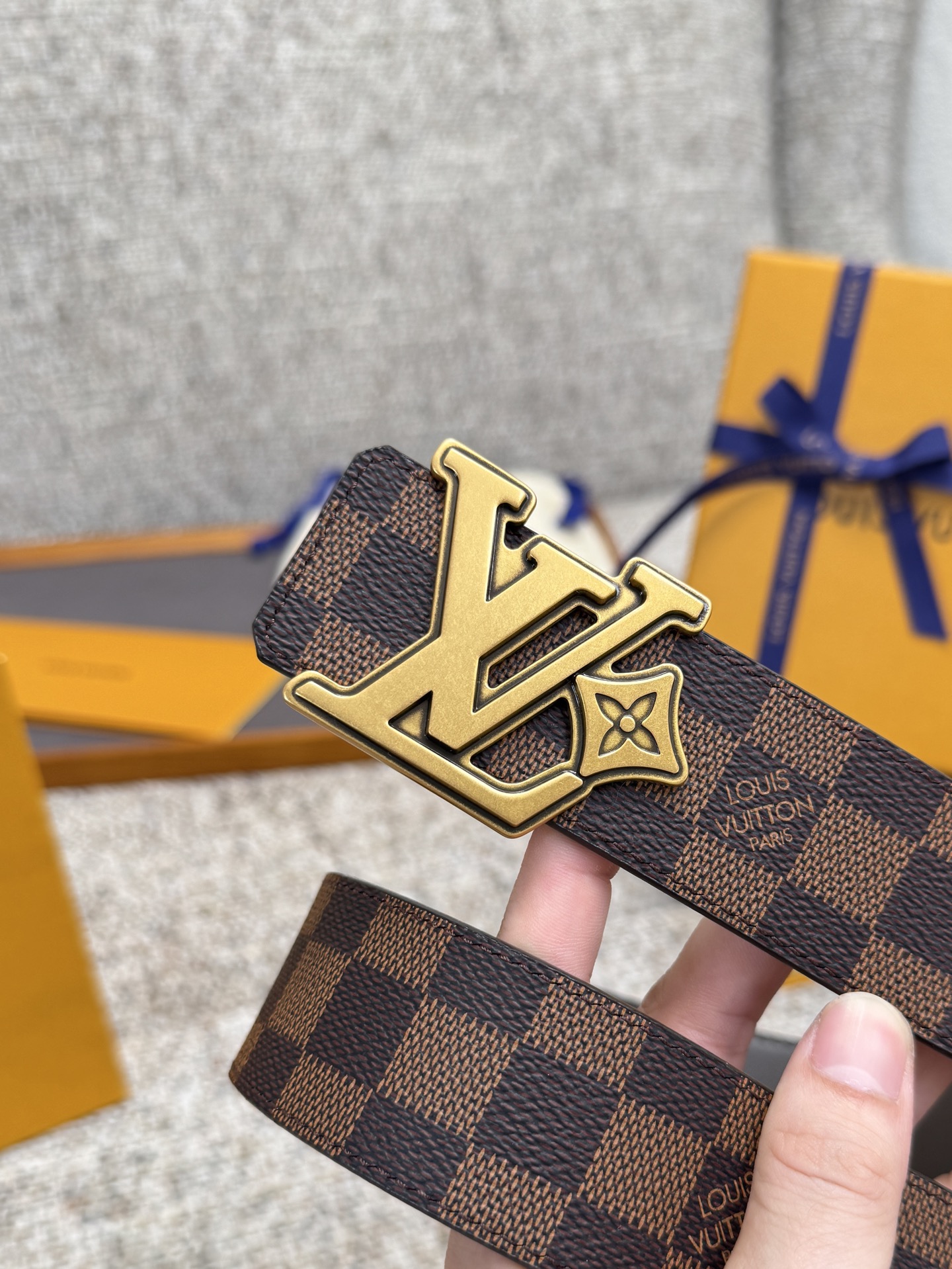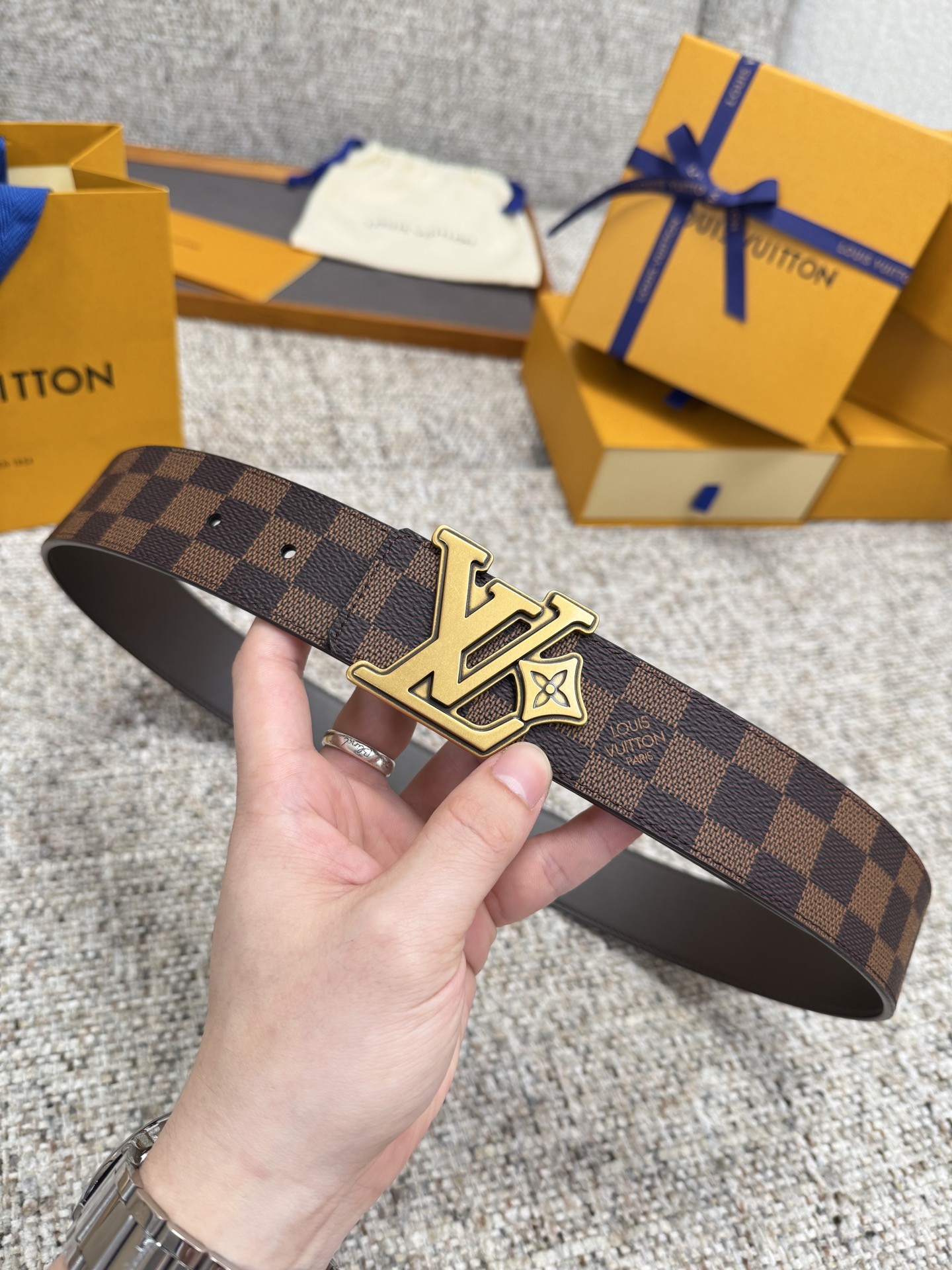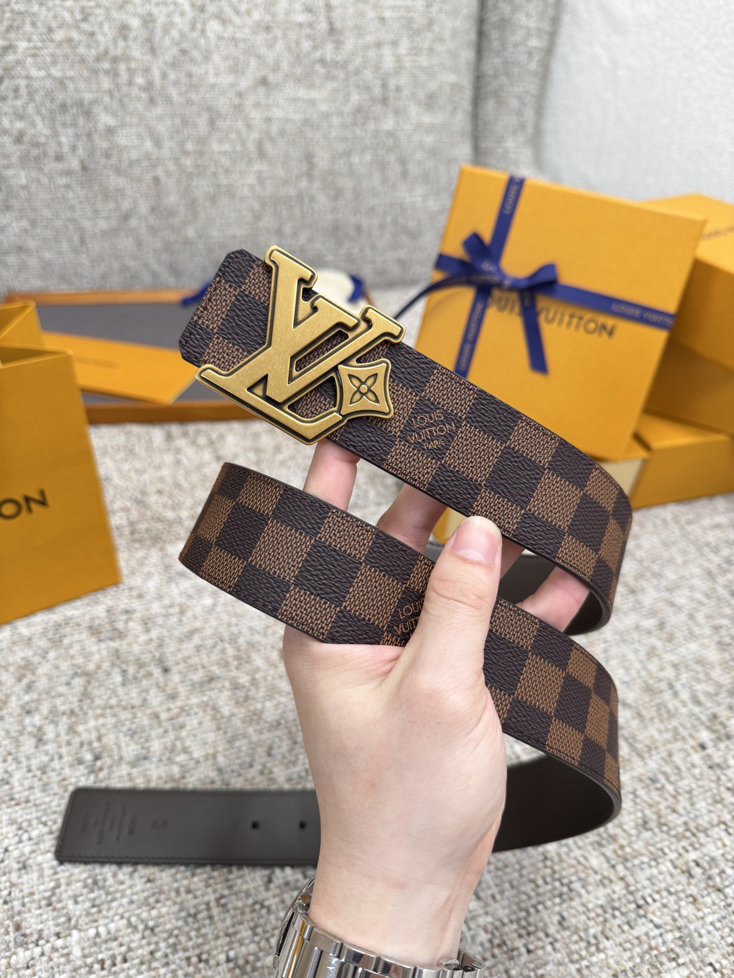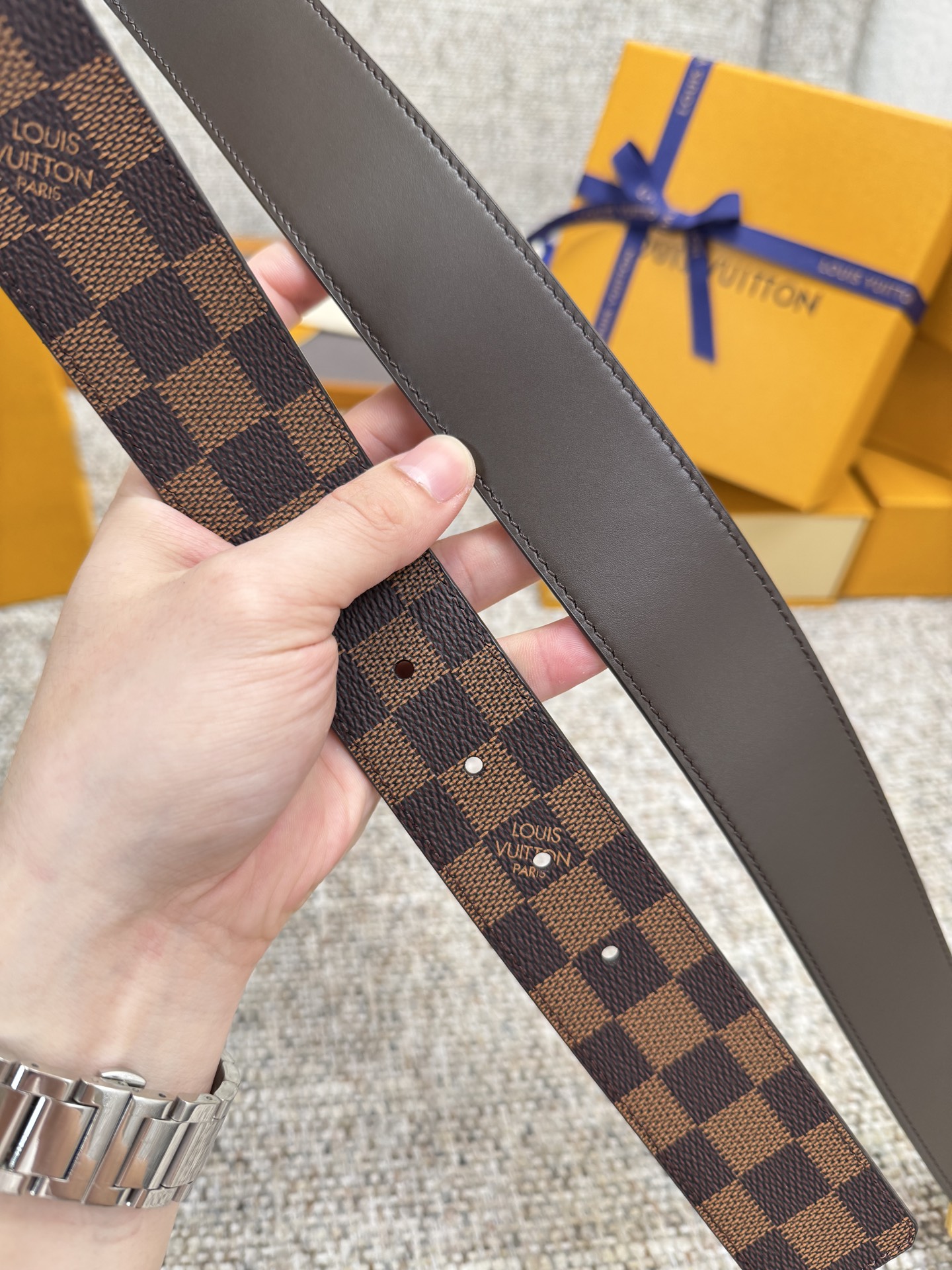 这款皮带是AAAAA 1:1 质量 (非常棒). 使用了和原版一模一样的材料. 商标部分也保持了和路易威登/Louis Vuitton一样. 图片拍摄是实物皮带拍摄, 您所收到的实物保证和我们图片一模一样.
