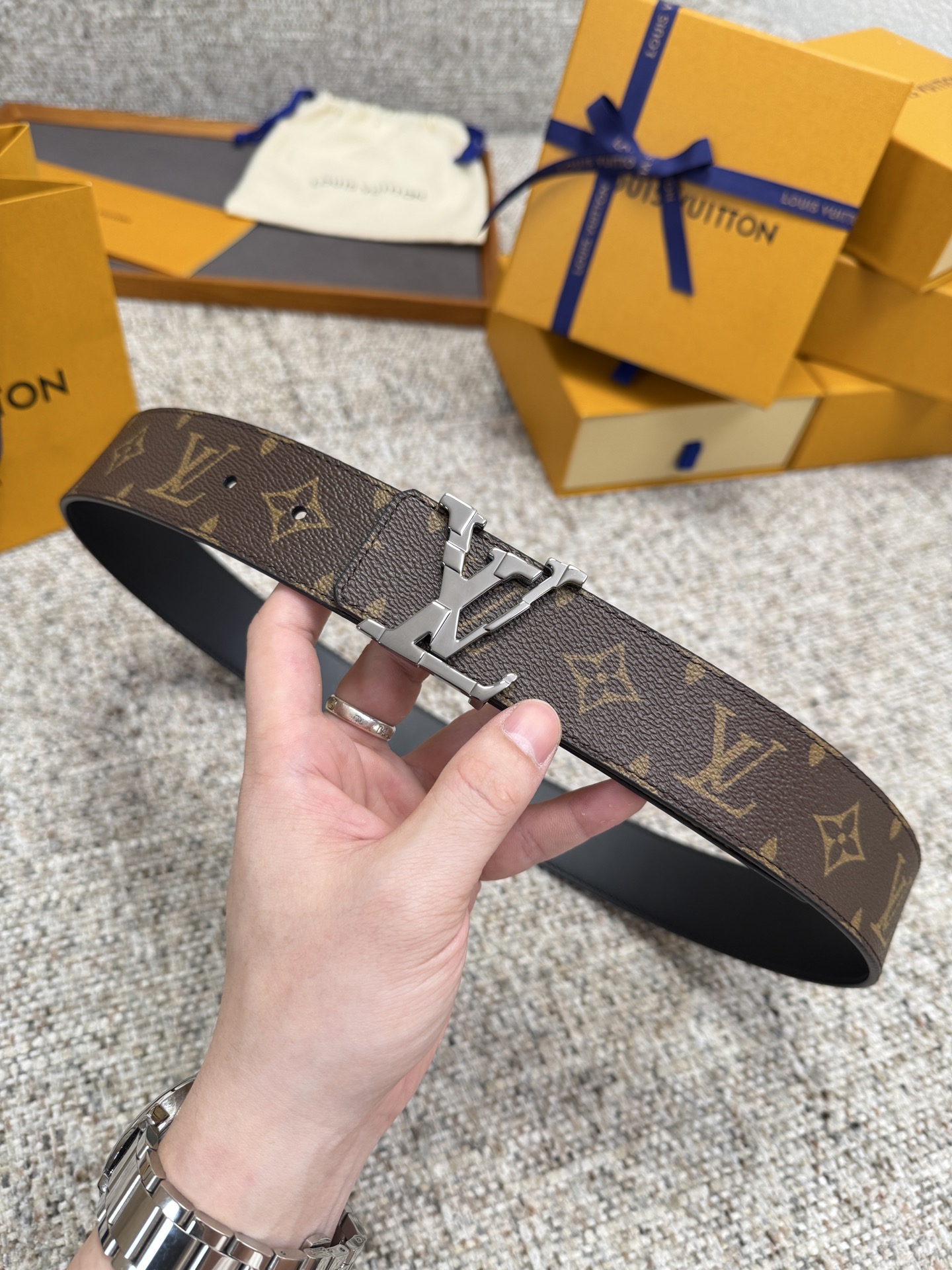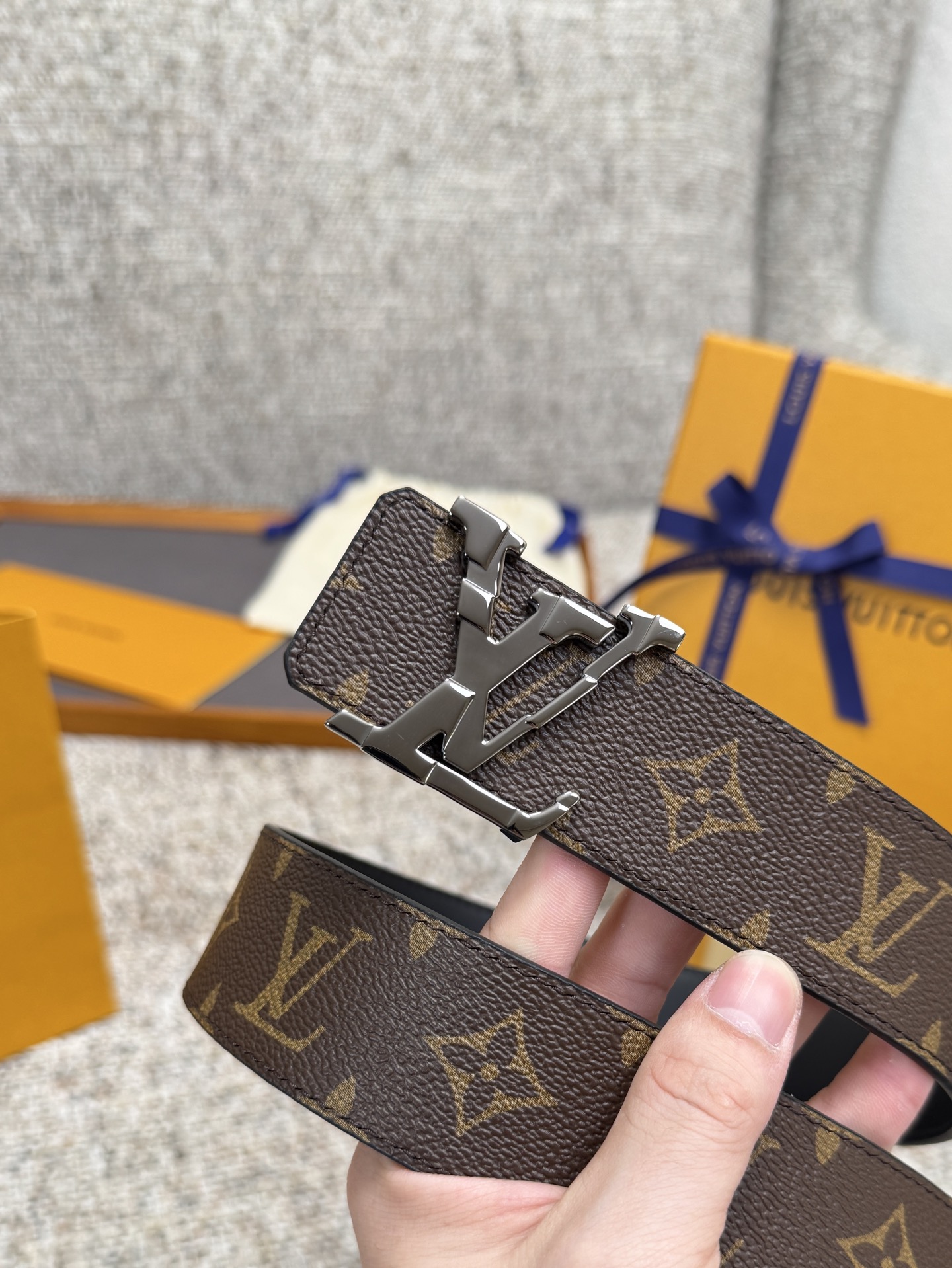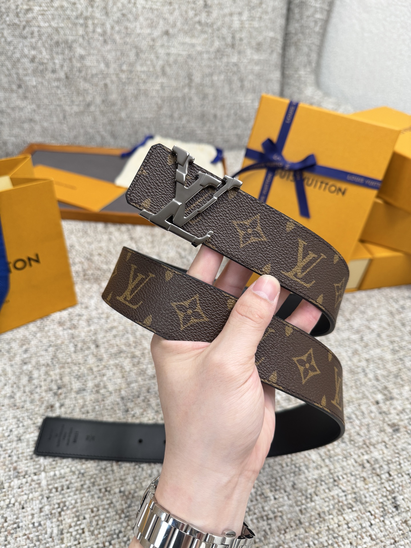 这款皮带是AAAAA 1:1 质量 (非常棒). 使用了和原版一模一样的材料. 商标部分也保持了和路易威登/Louis Vuitton一样. 图片拍摄是实物皮带拍摄, 您所收到的实物保证和我们图片一模一样.