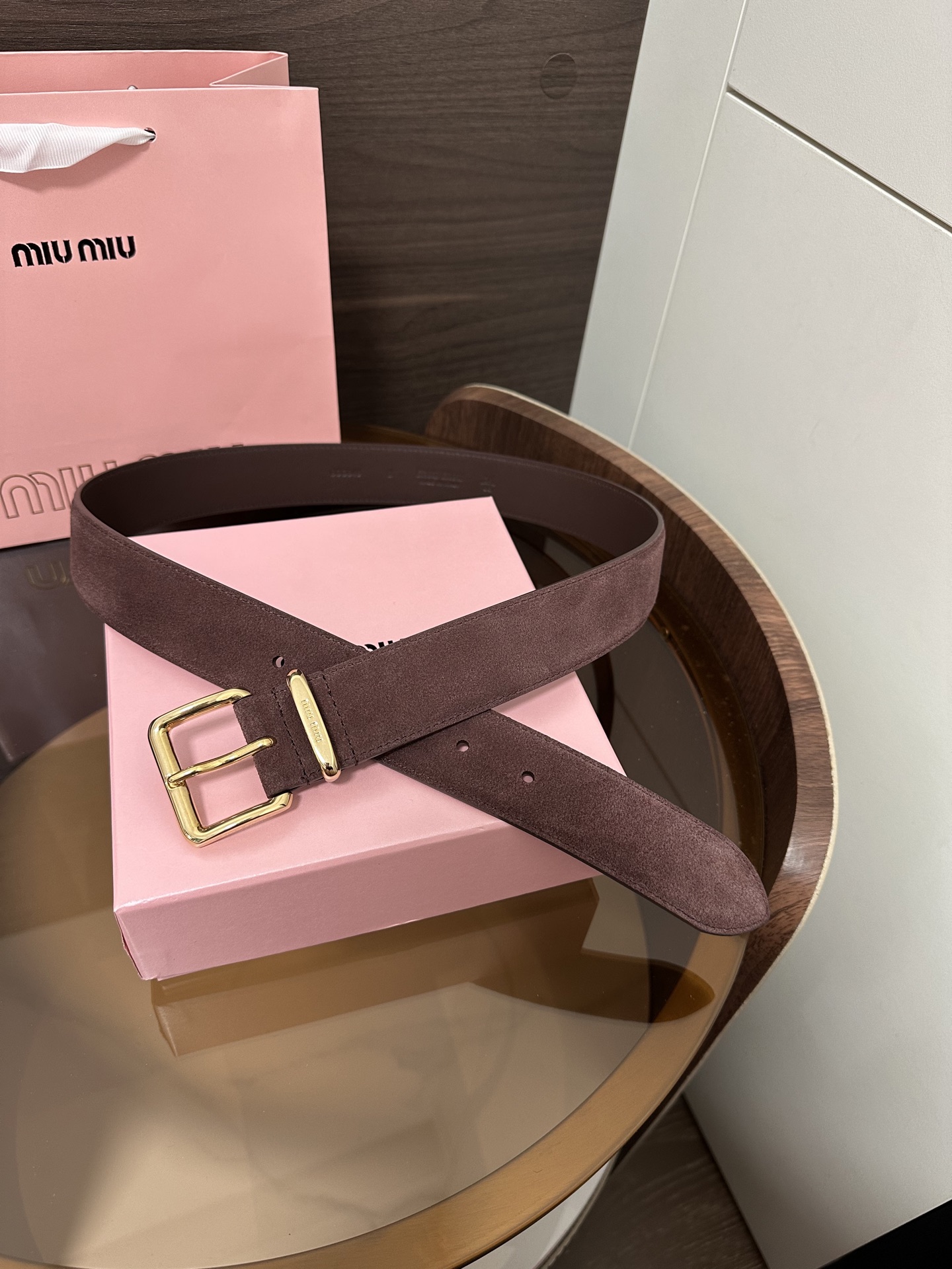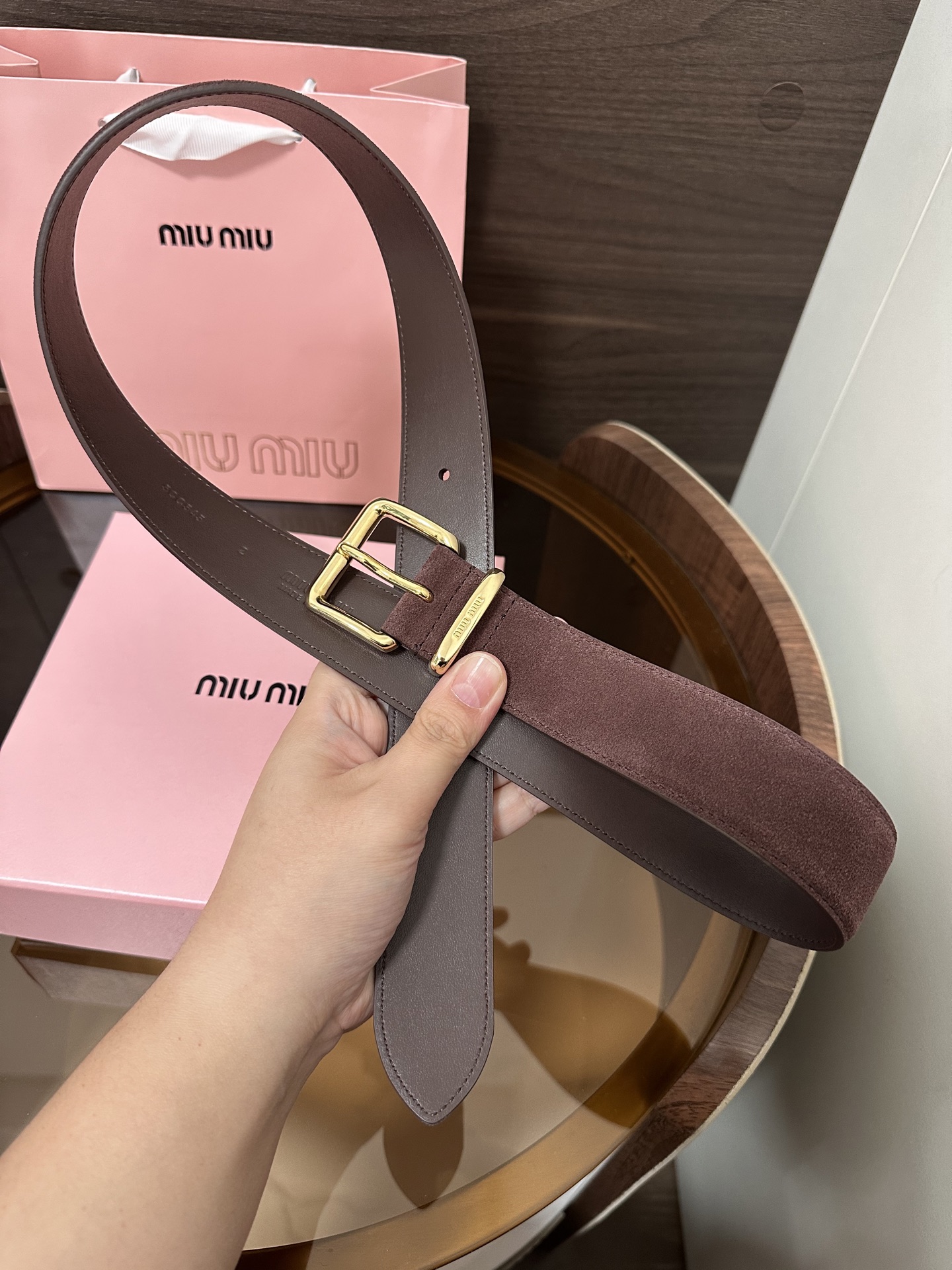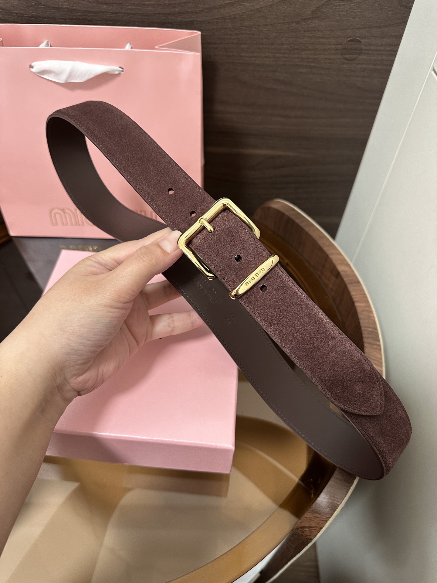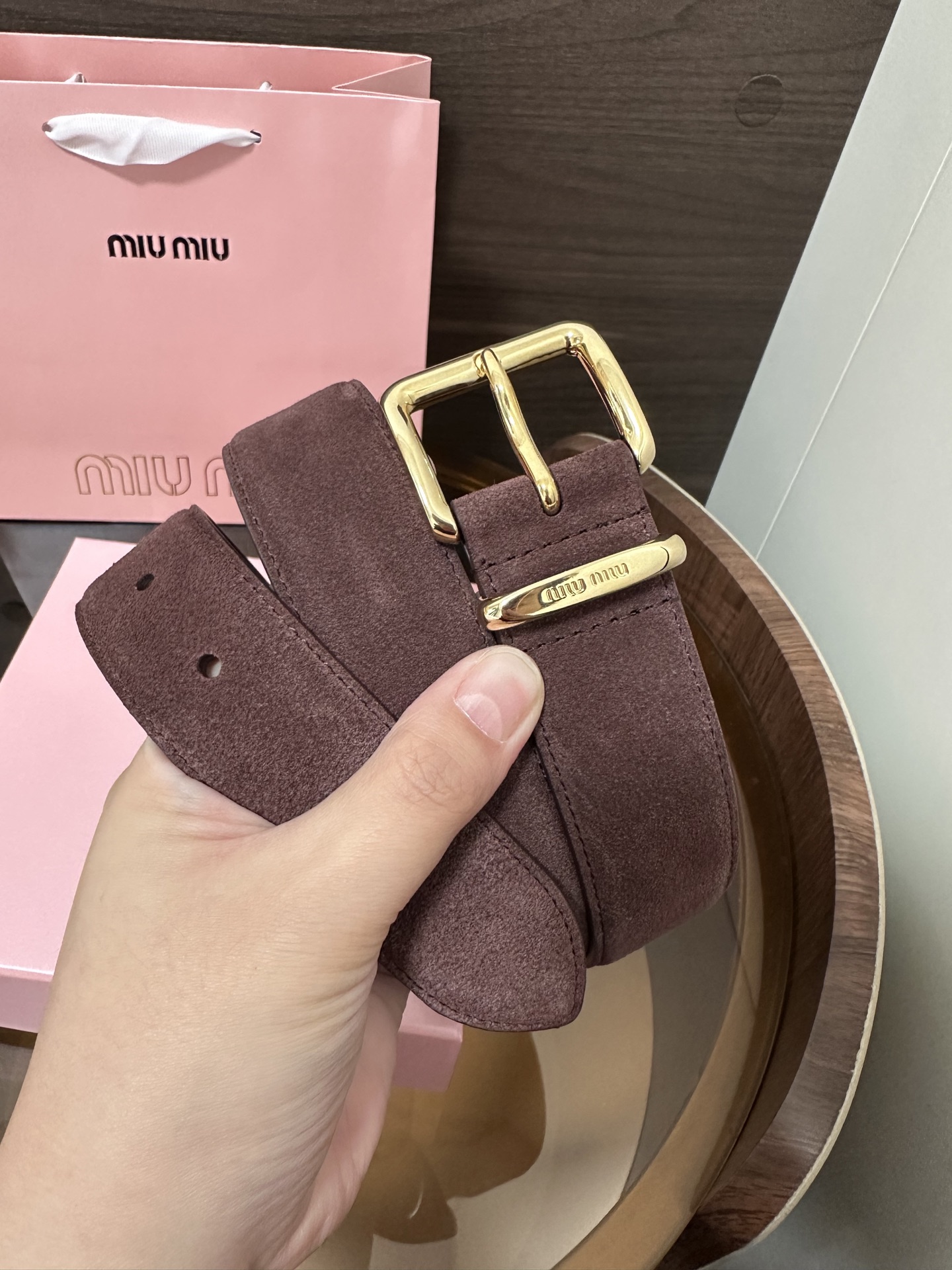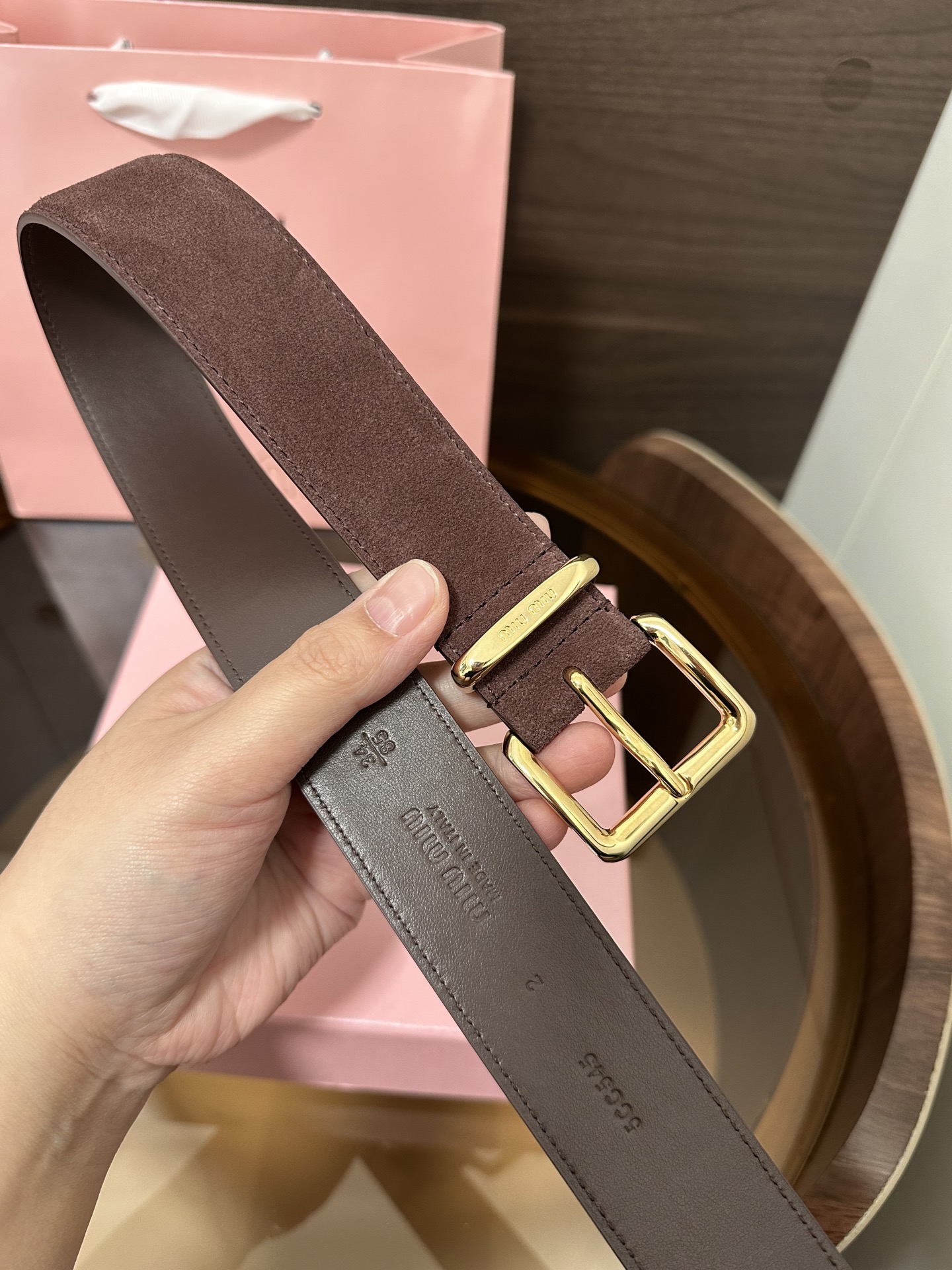 这款皮带是AAAAA 1:1 质量 (非常棒). 使用了和原版一模一样的材料. 商标部分也保持了和缪缪/Miu Miu一样. 图片拍摄是实物皮带拍摄, 您所收到的实物保证和我们图片一模一样.