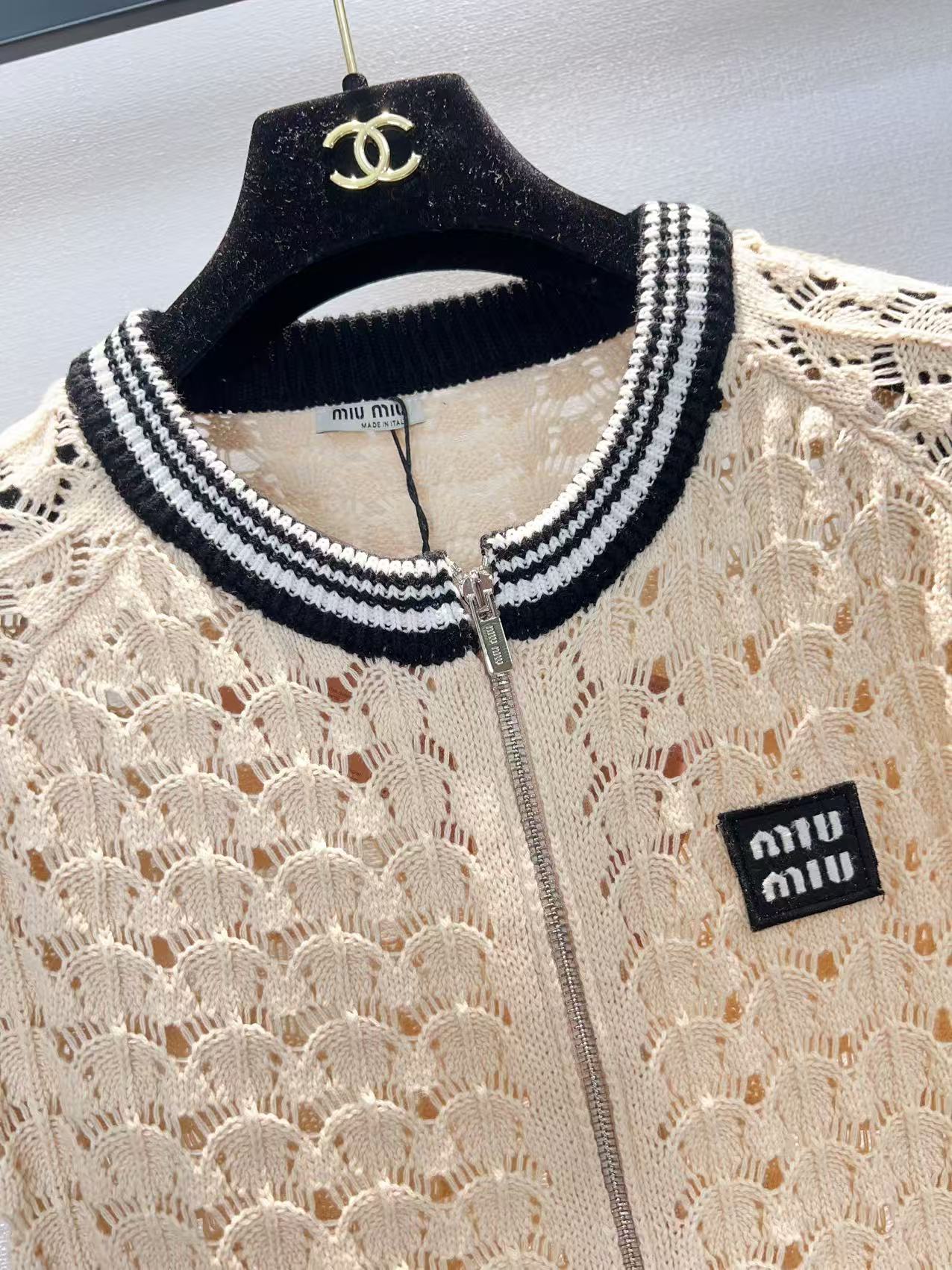 这款衣服是AAAAA 1:1 质量 (非常棒). 使用了和原版一模一样的材料. 商标部分也保持了和缪缪/Miu Miu一样. 图片拍摄是实物衣服拍摄, 您所收到的实物保证和我们图片一模一样.