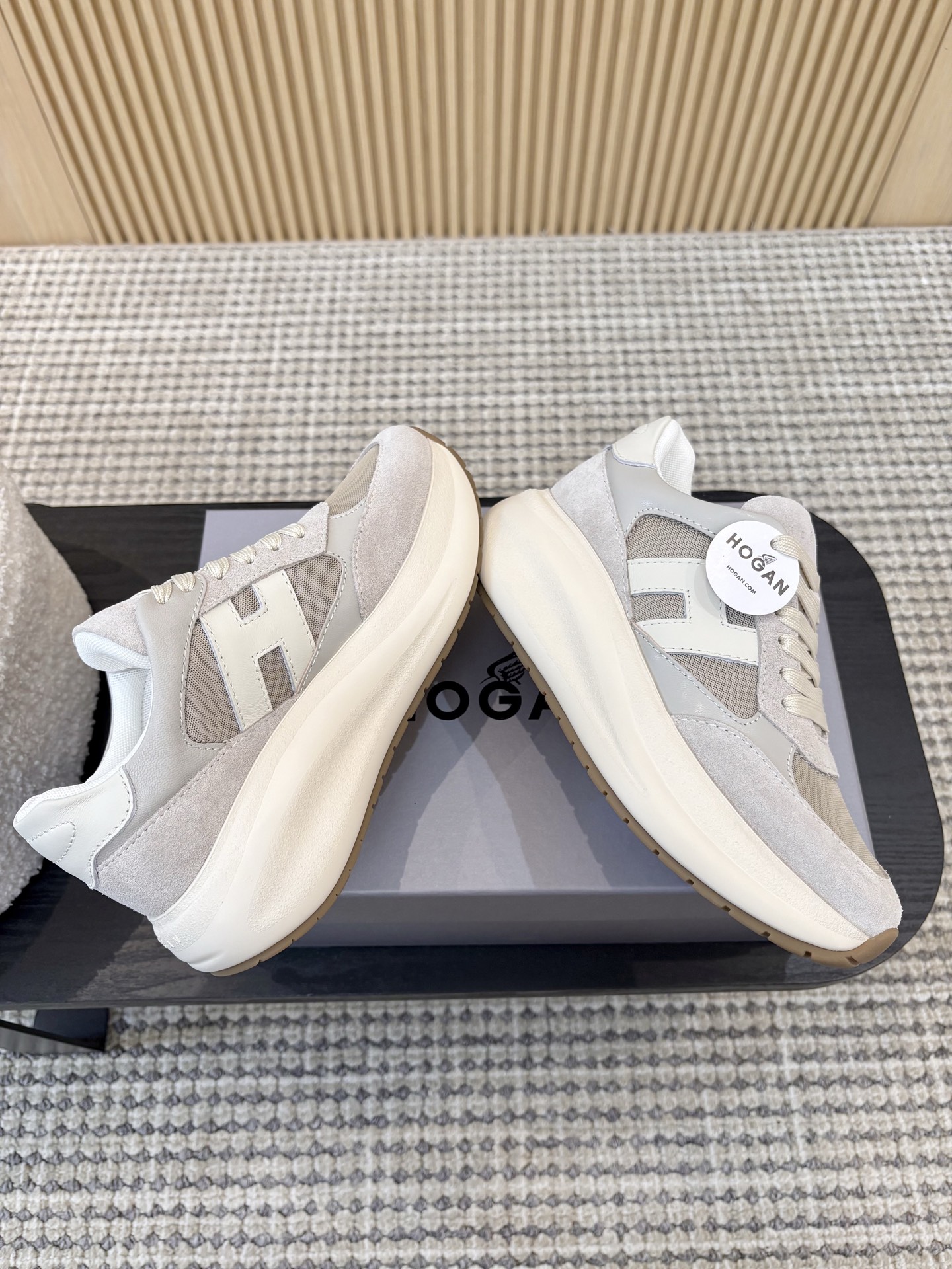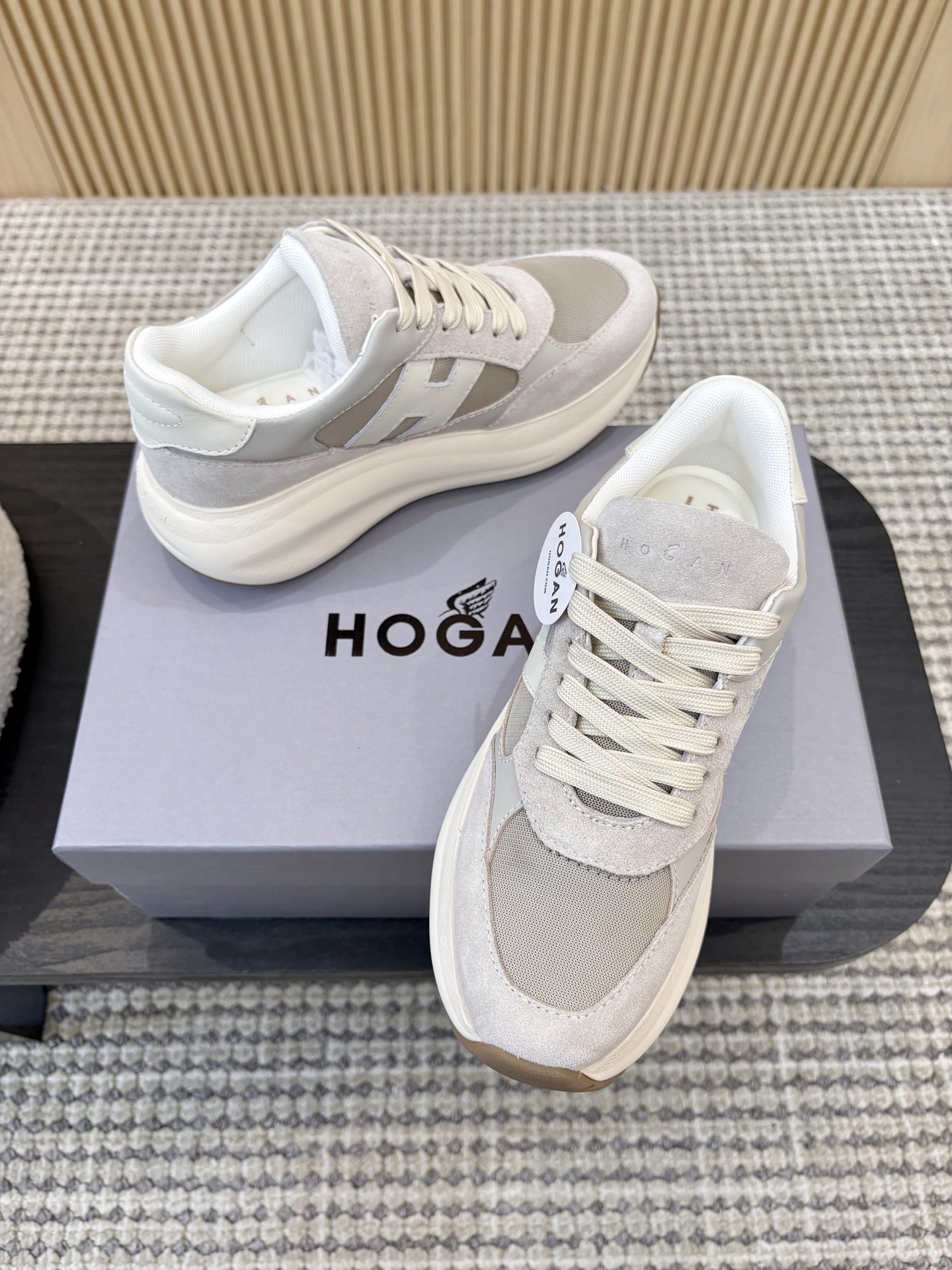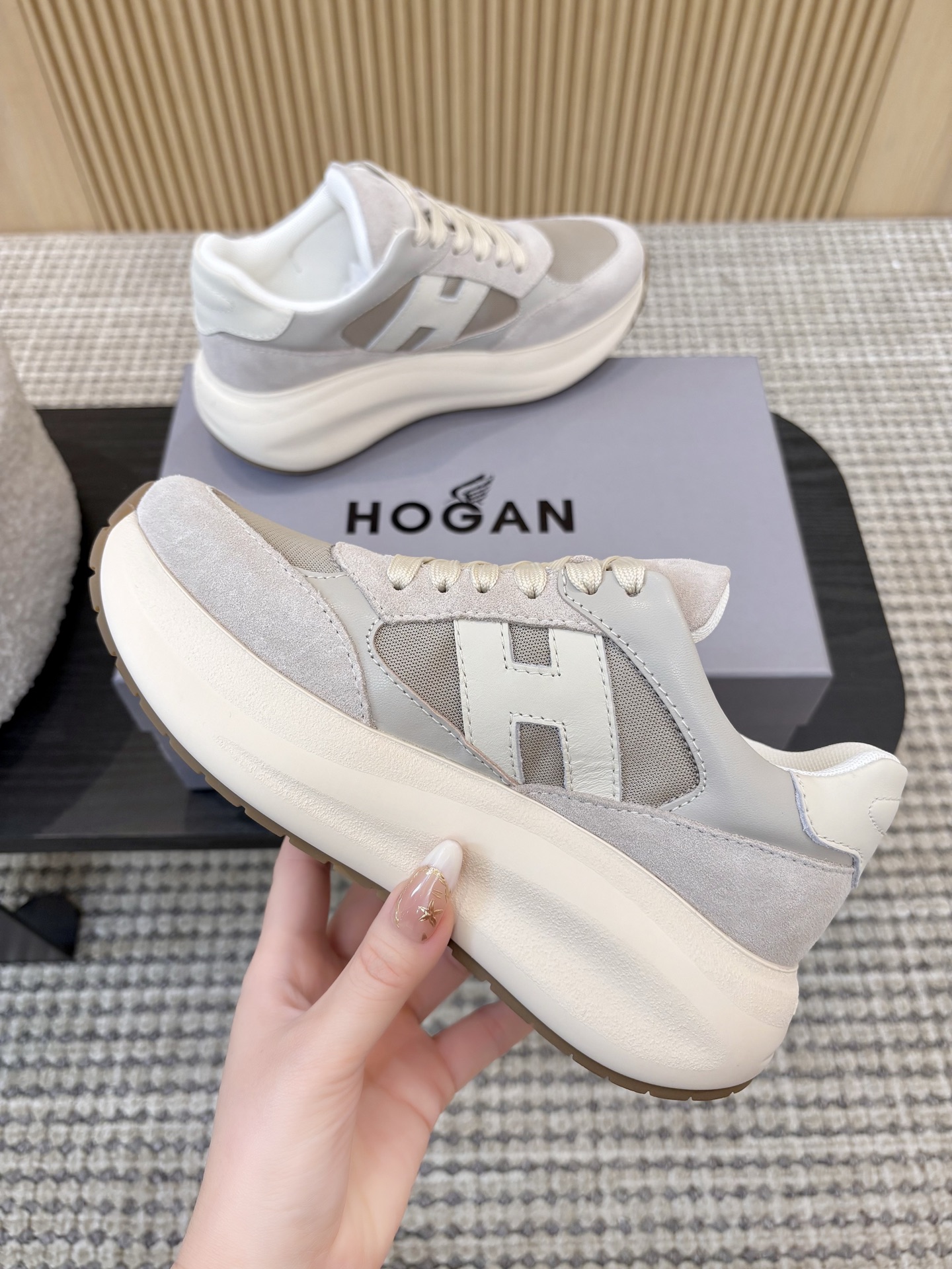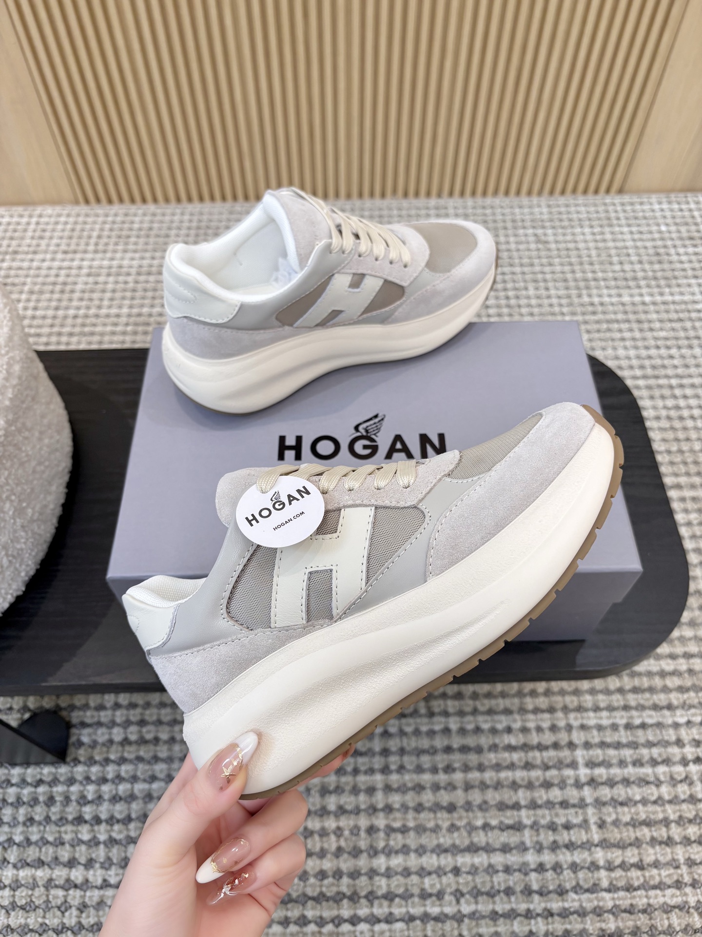 这款鞋子是AAAAA 1:1 质量 (非常棒). 使用了和原版一模一样的材料. 商标部分也保持了和Hogan一样. 图片拍摄是实物鞋子拍摄, 您所收到的实物保证和我们图片一模一样.