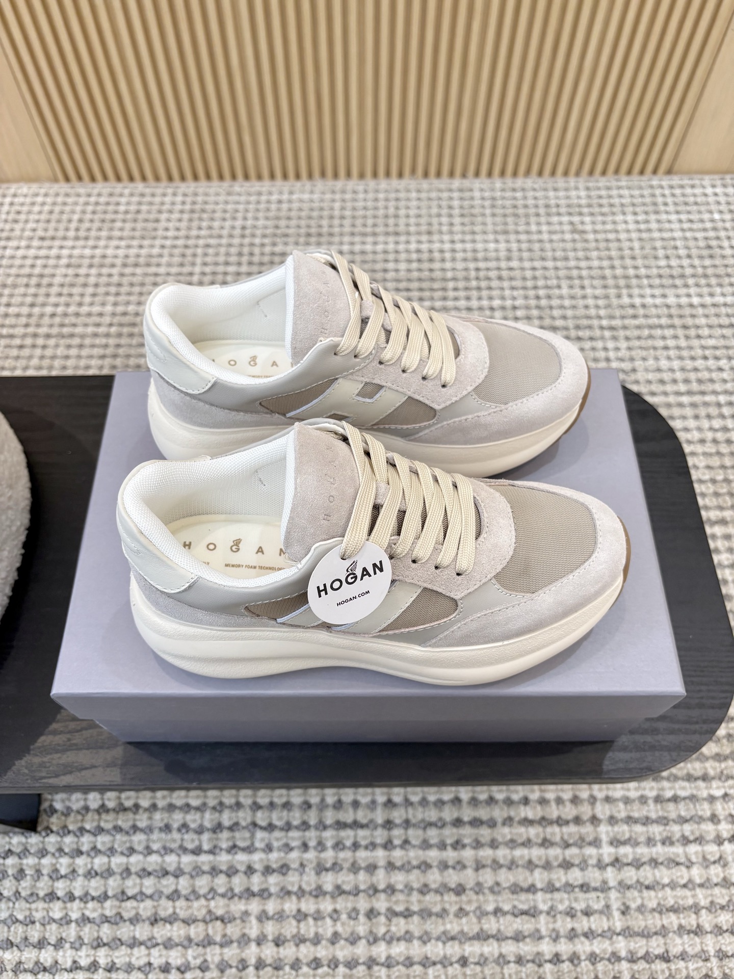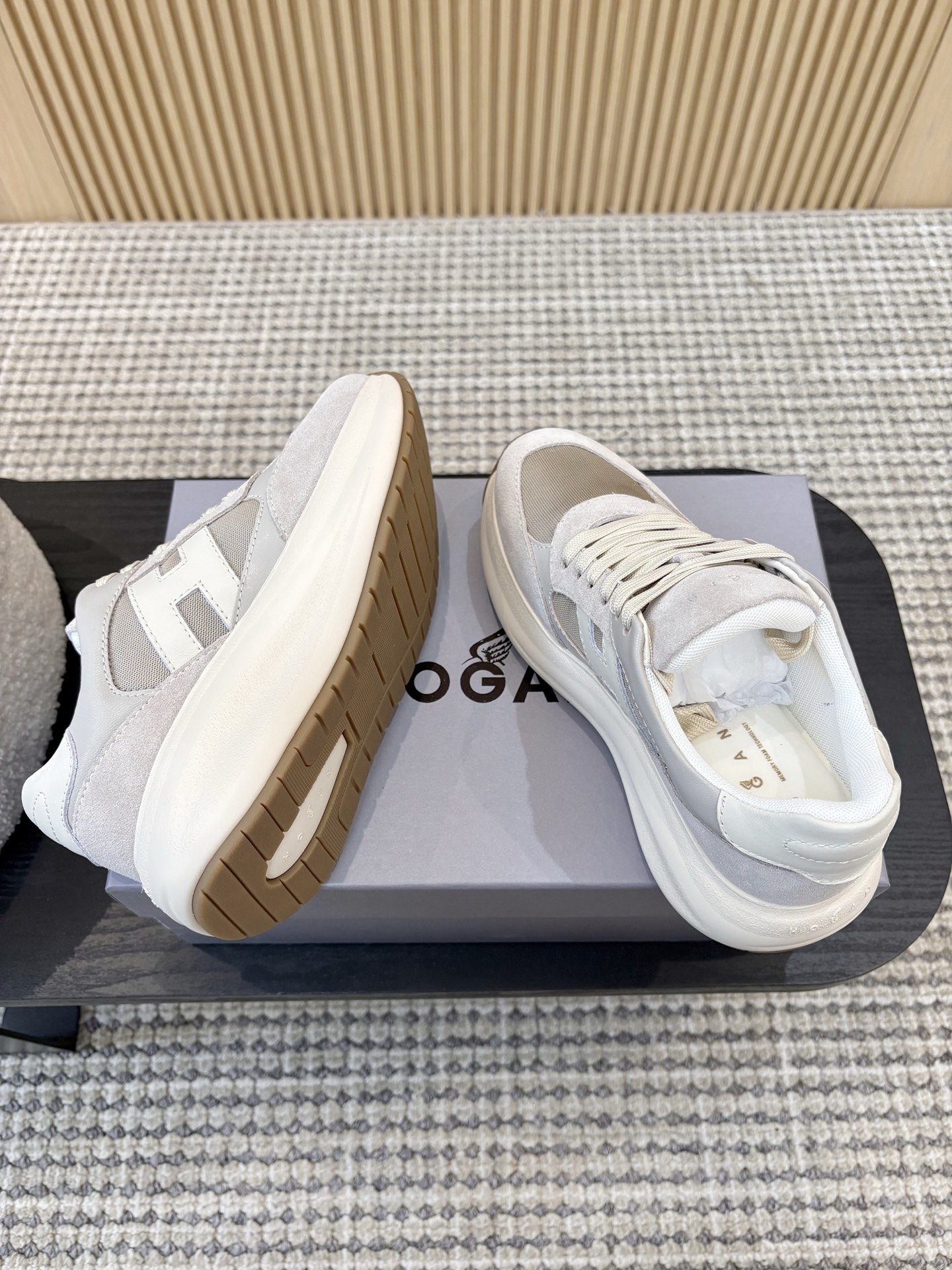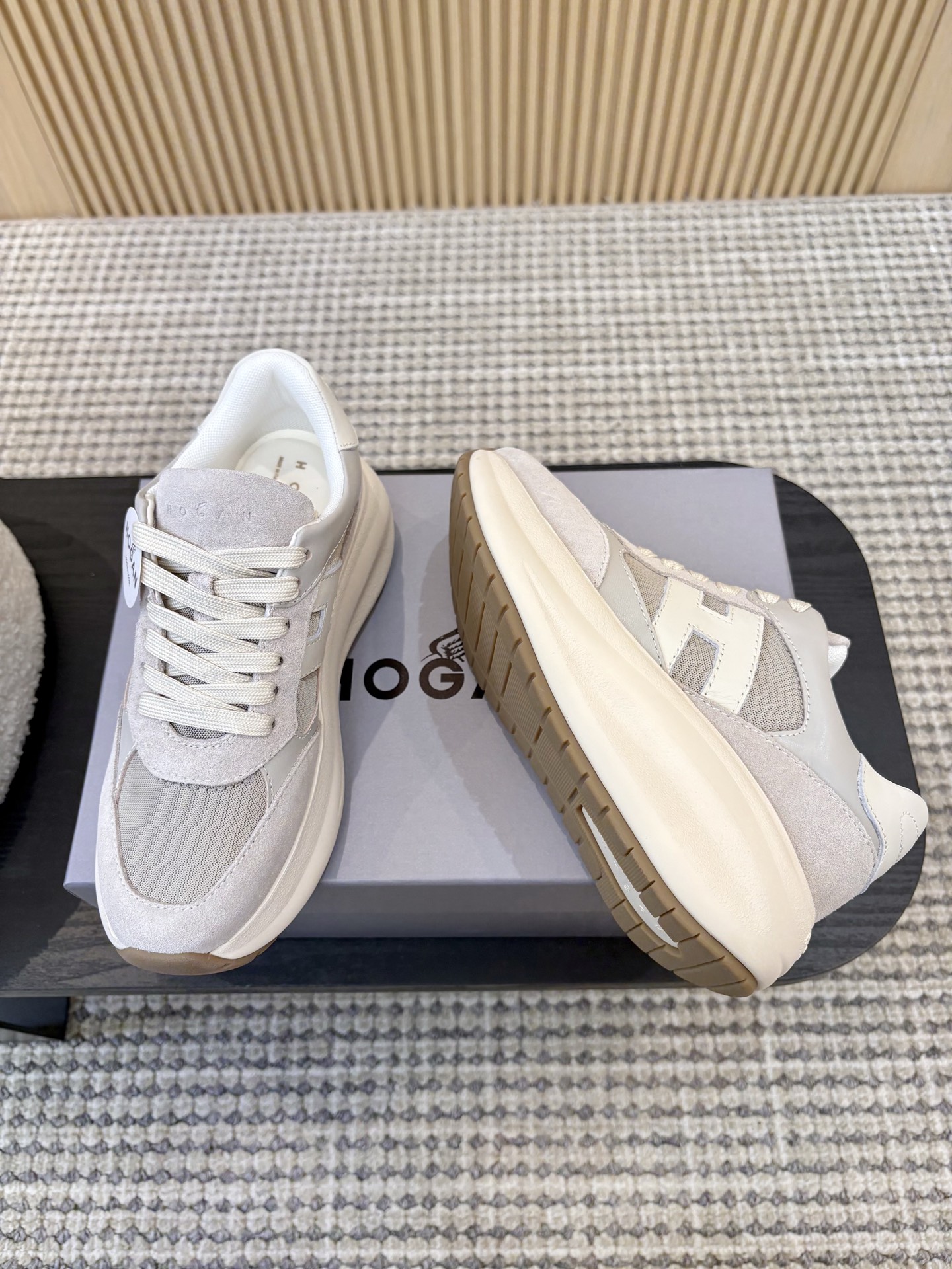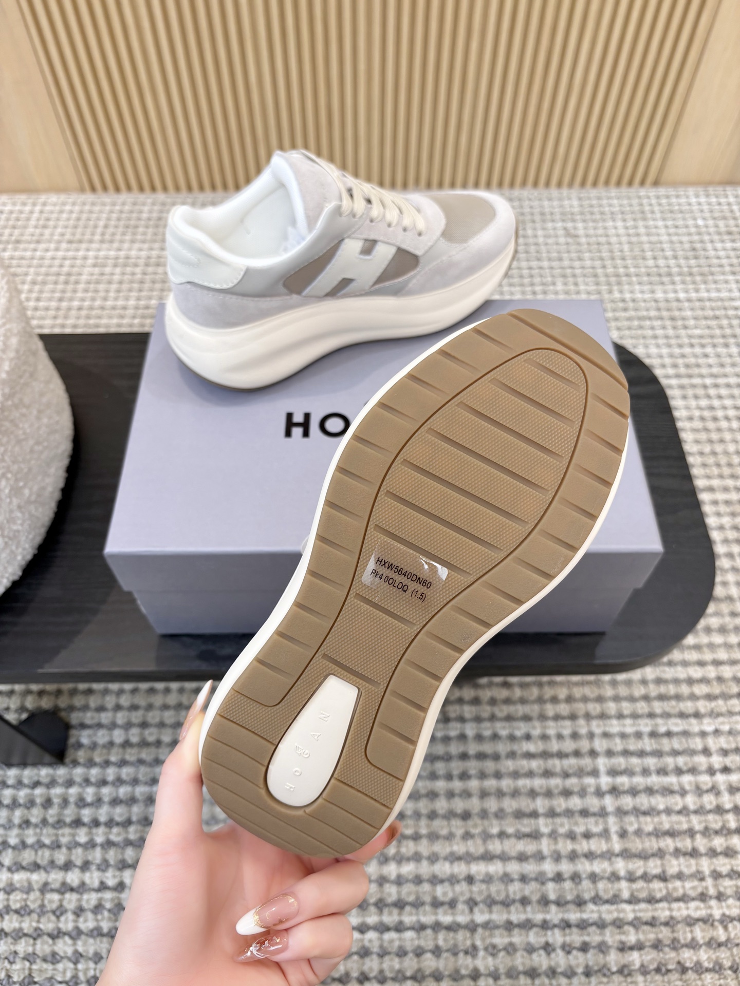 这款鞋子是AAAAA 1:1 质量 (非常棒). 使用了和原版一模一样的材料. 商标部分也保持了和Hogan一样. 图片拍摄是实物鞋子拍摄, 您所收到的实物保证和我们图片一模一样.