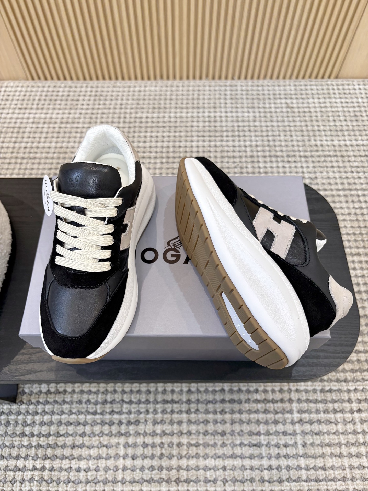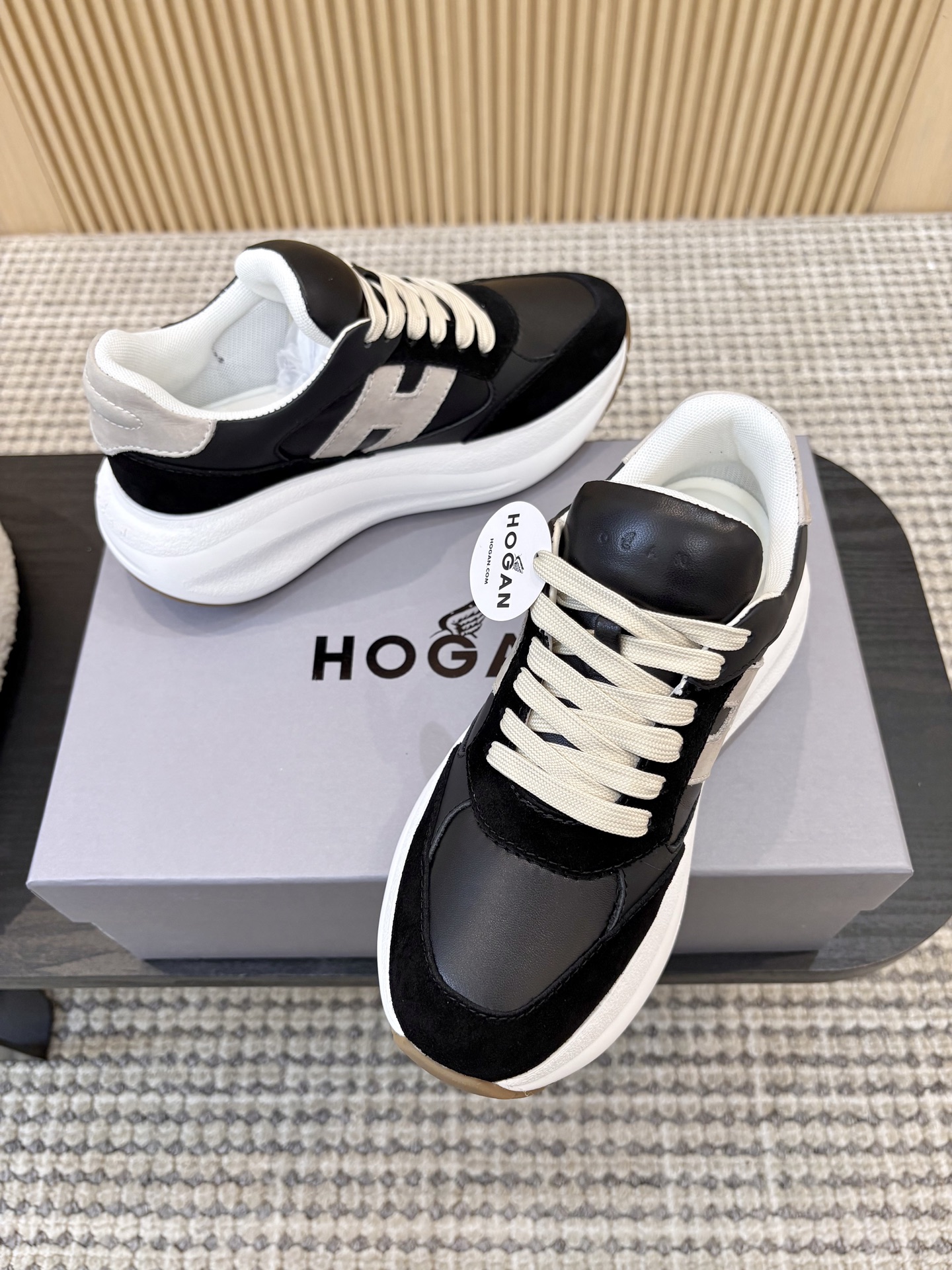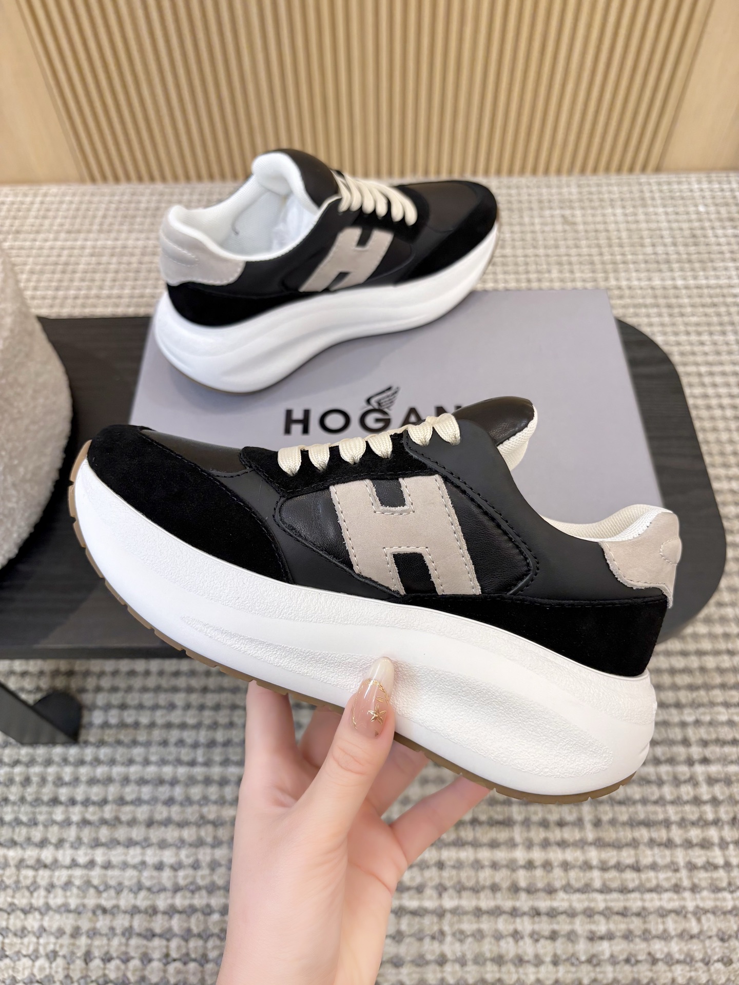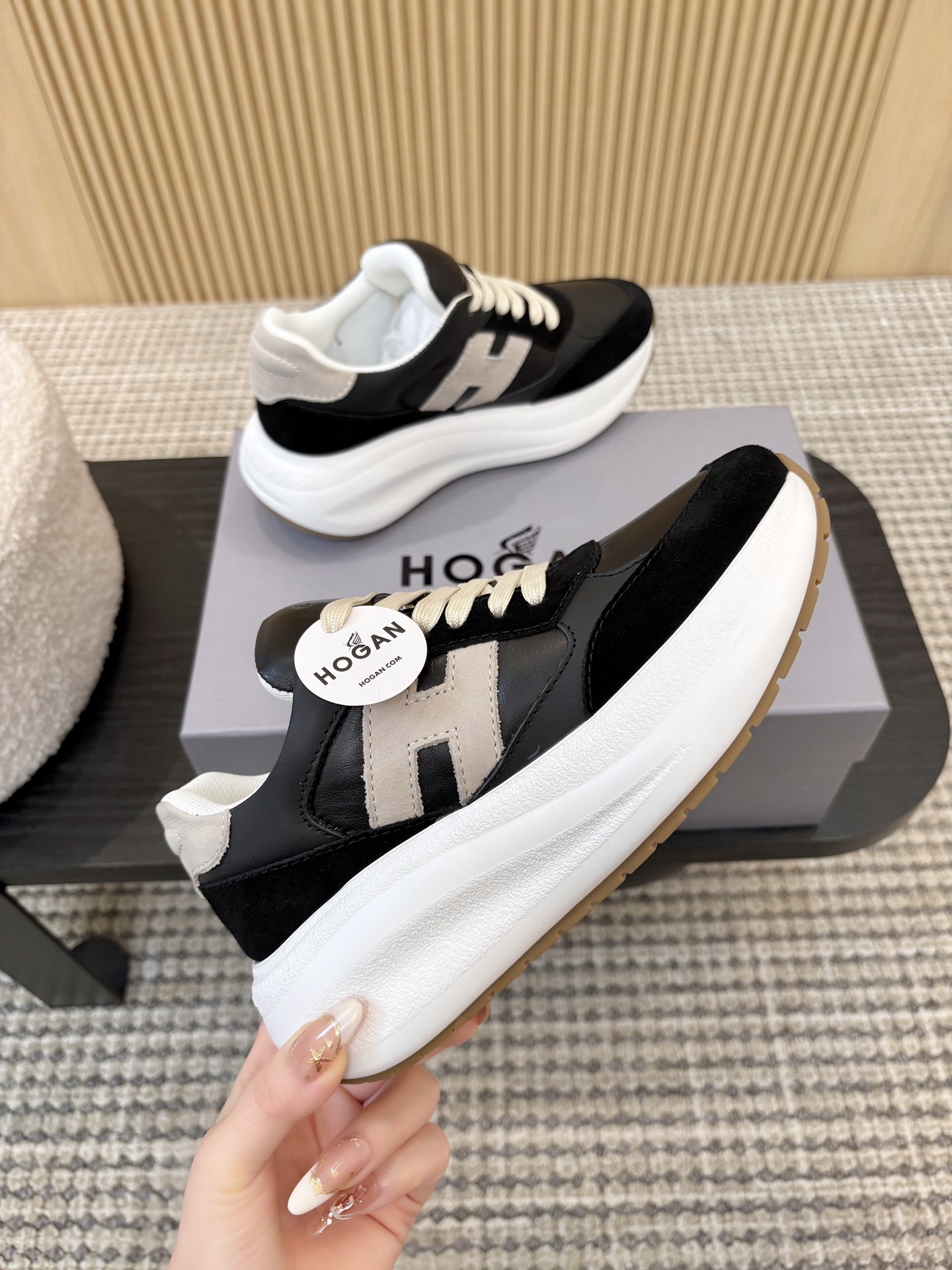 这款鞋子是AAAAA 1:1 质量 (非常棒). 使用了和原版一模一样的材料. 商标部分也保持了和Hogan一样. 图片拍摄是实物鞋子拍摄, 您所收到的实物保证和我们图片一模一样.