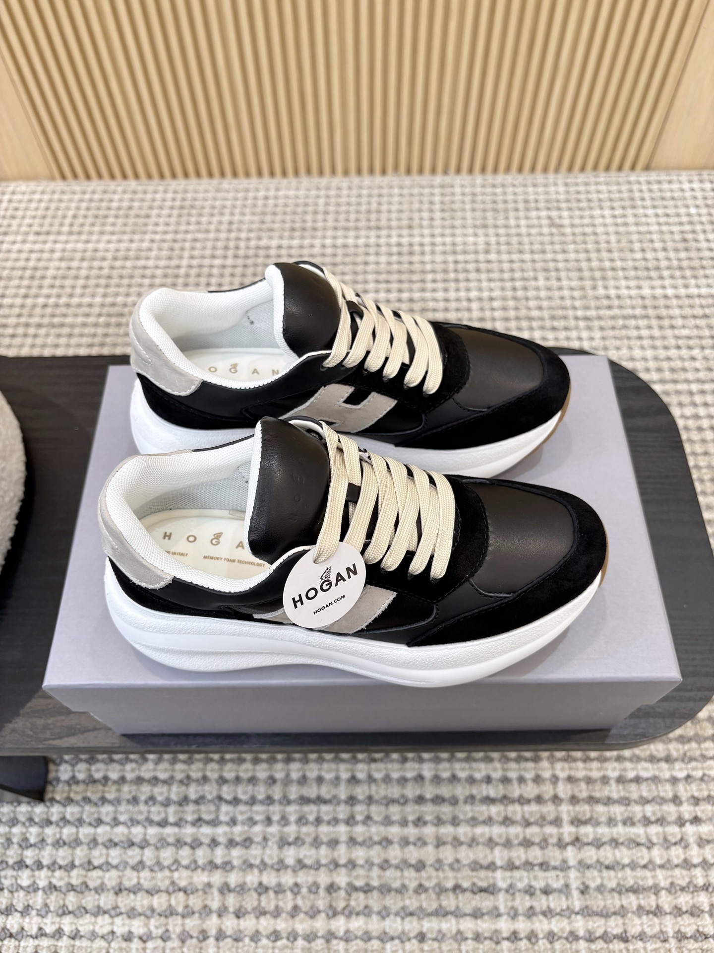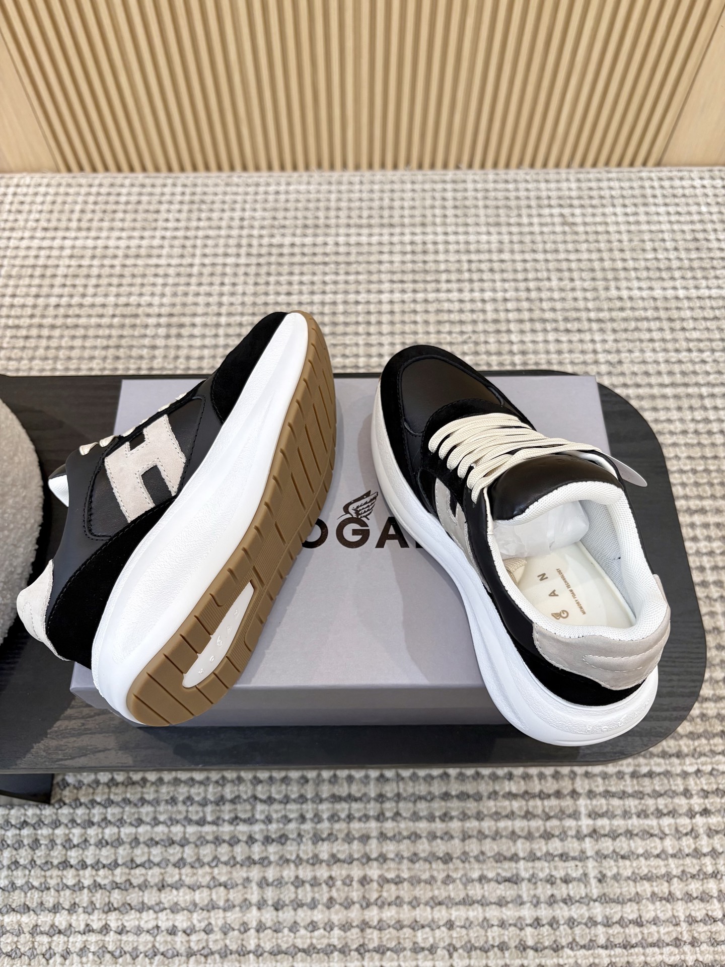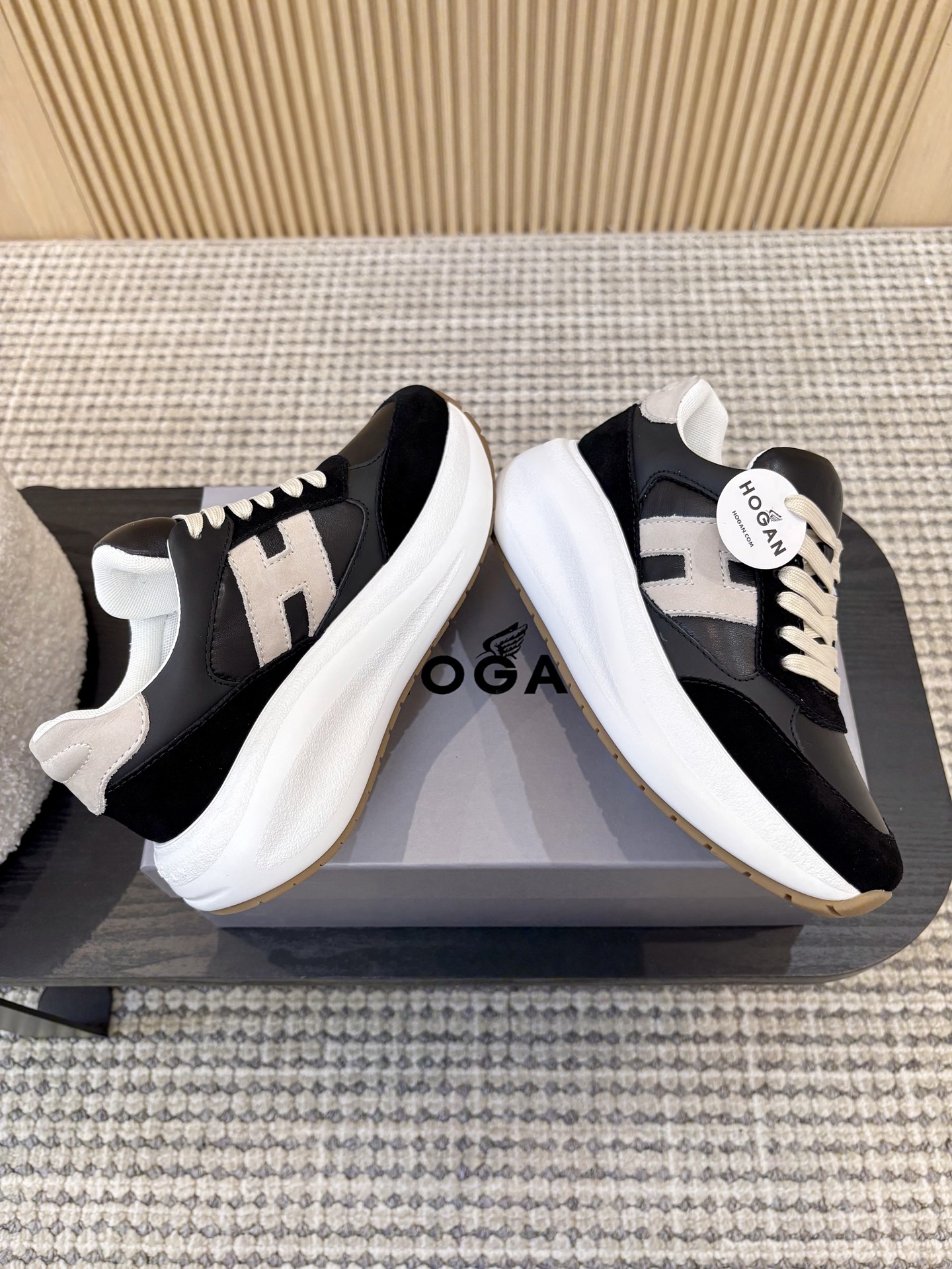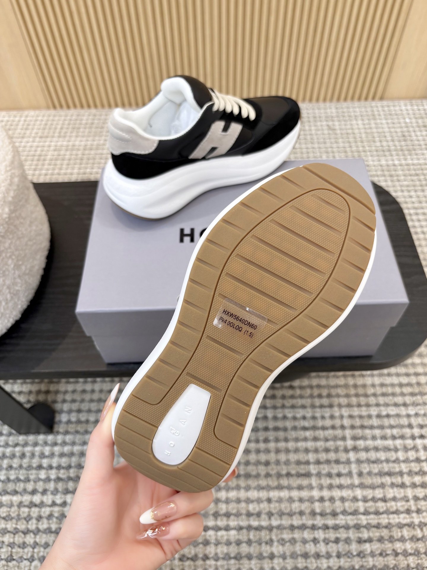 这款鞋子是AAAAA 1:1 质量 (非常棒). 使用了和原版一模一样的材料. 商标部分也保持了和Hogan一样. 图片拍摄是实物鞋子拍摄, 您所收到的实物保证和我们图片一模一样.