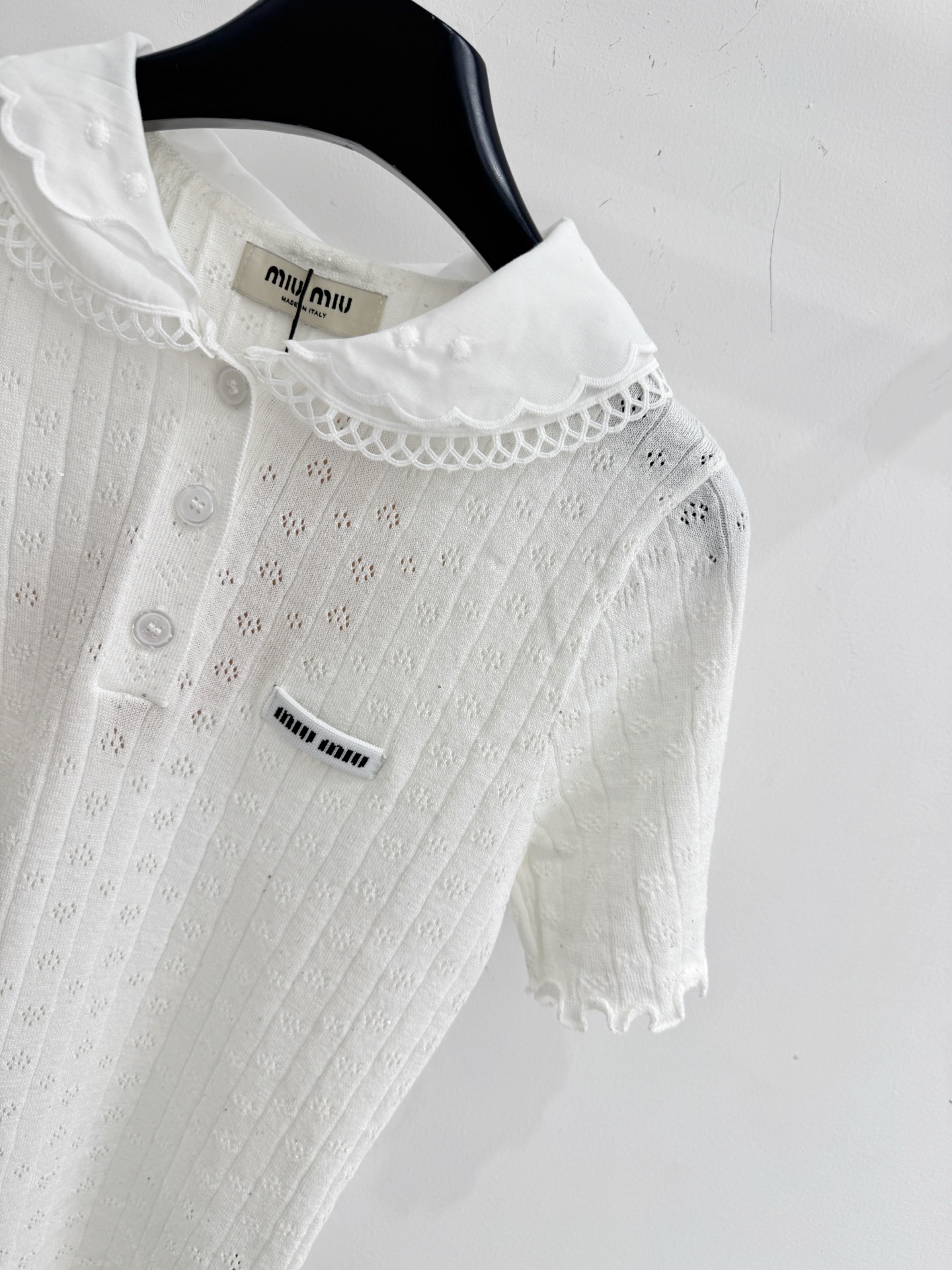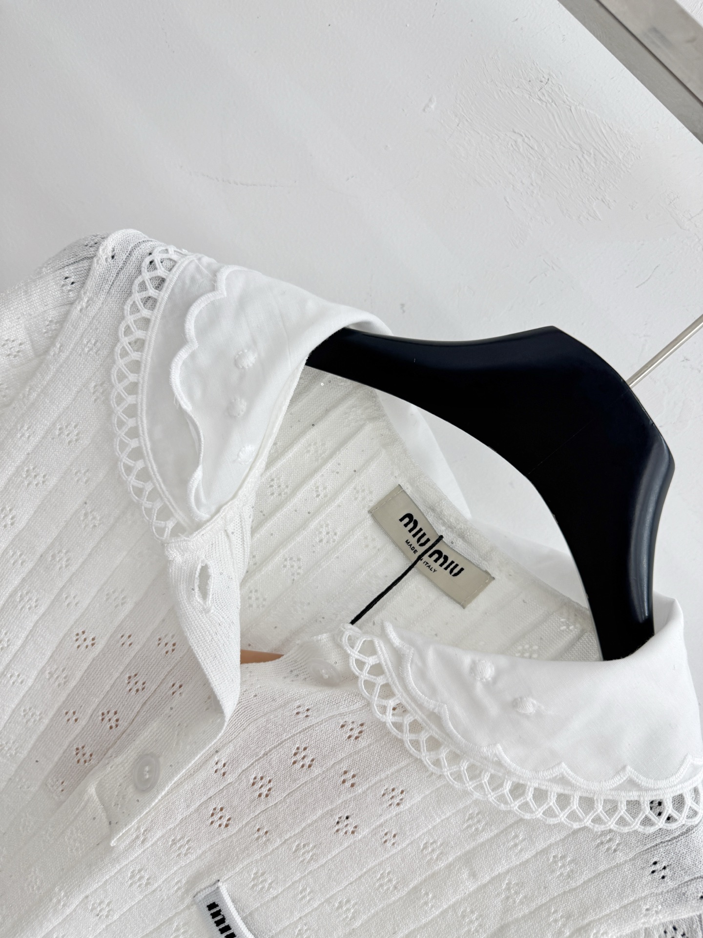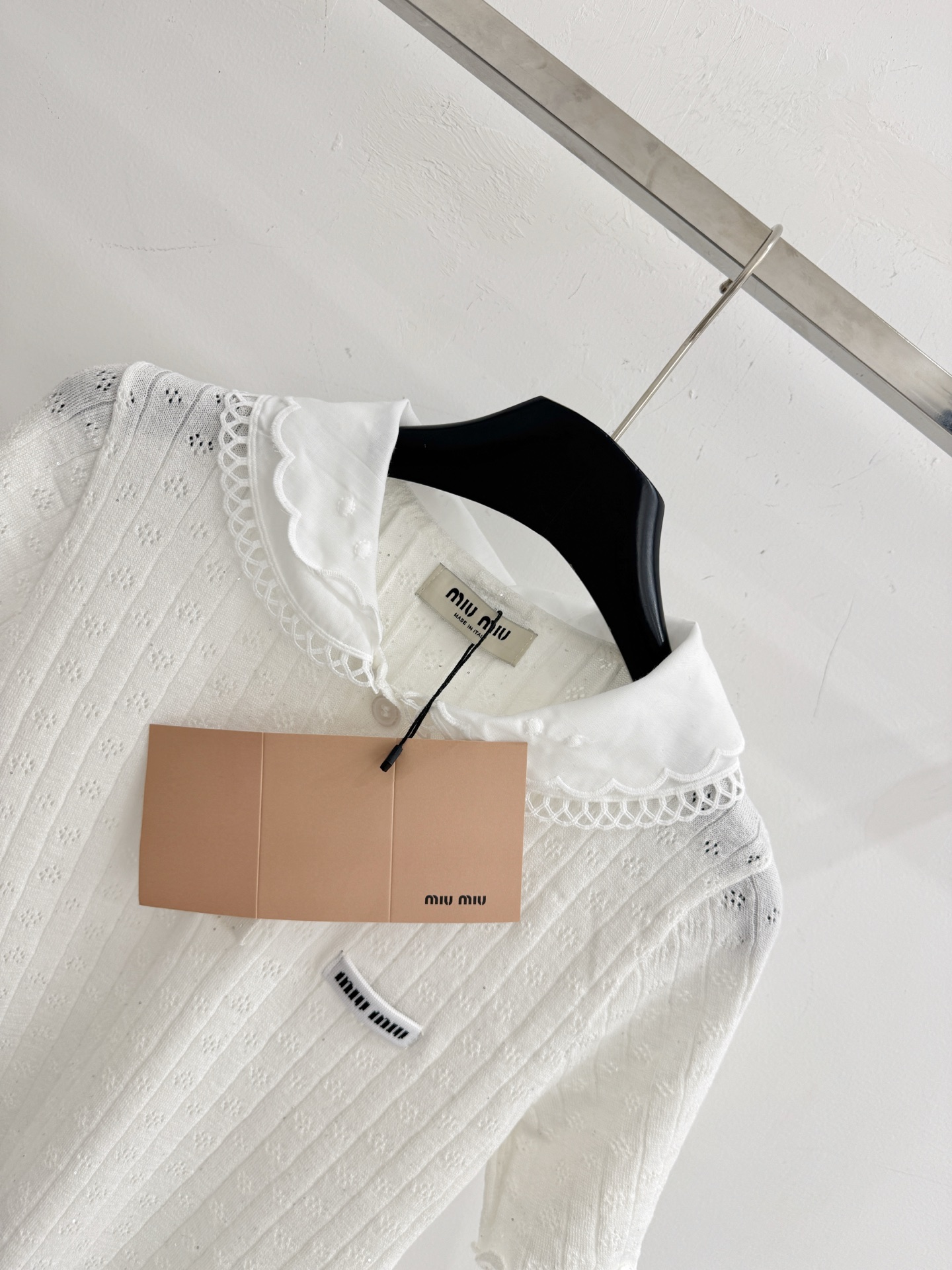 这款衣服是AAAAA 1:1 质量 (非常棒). 使用了和原版一模一样的材料. 商标部分也保持了和缪缪/Miu Miu一样. 图片拍摄是实物衣服拍摄, 您所收到的实物保证和我们图片一模一样.