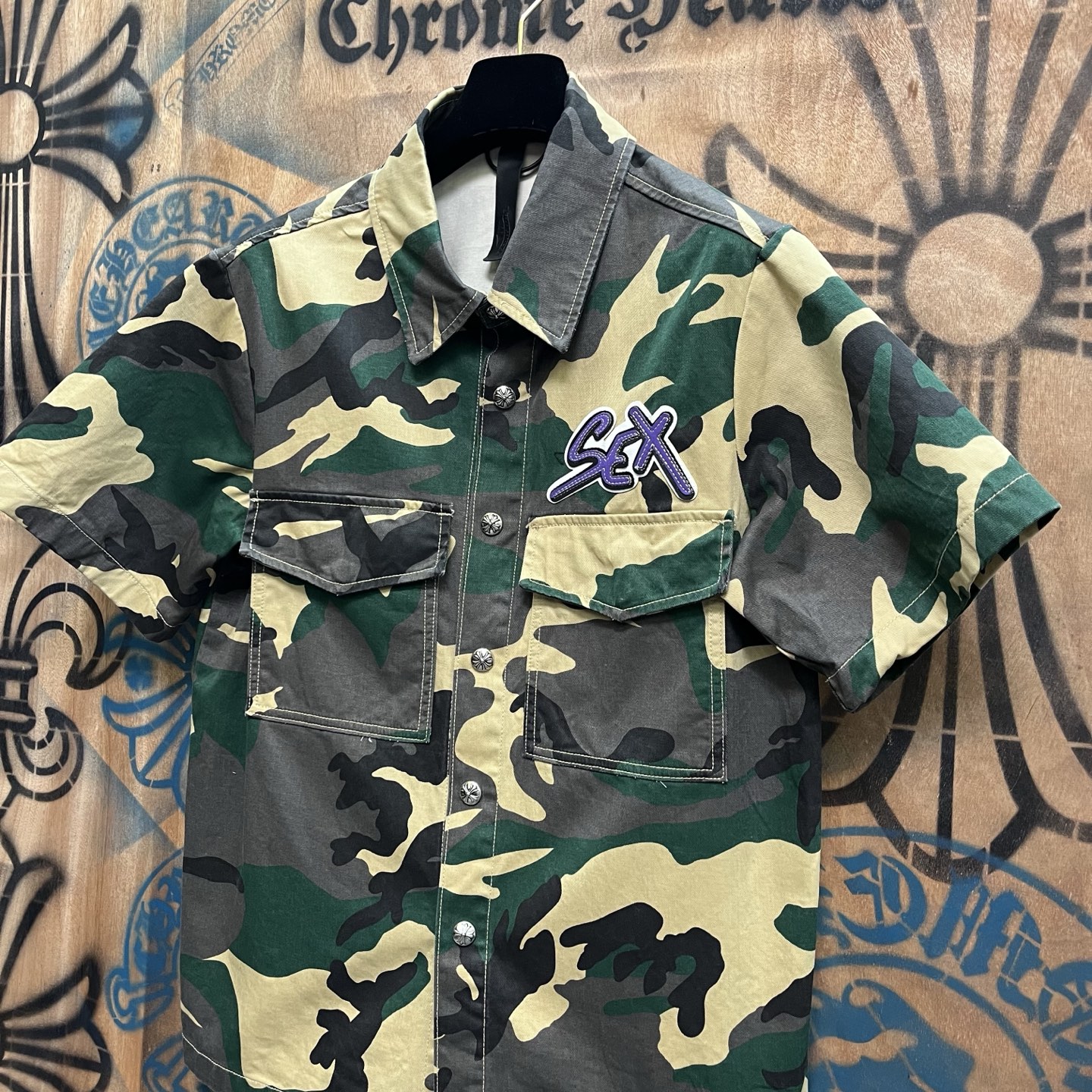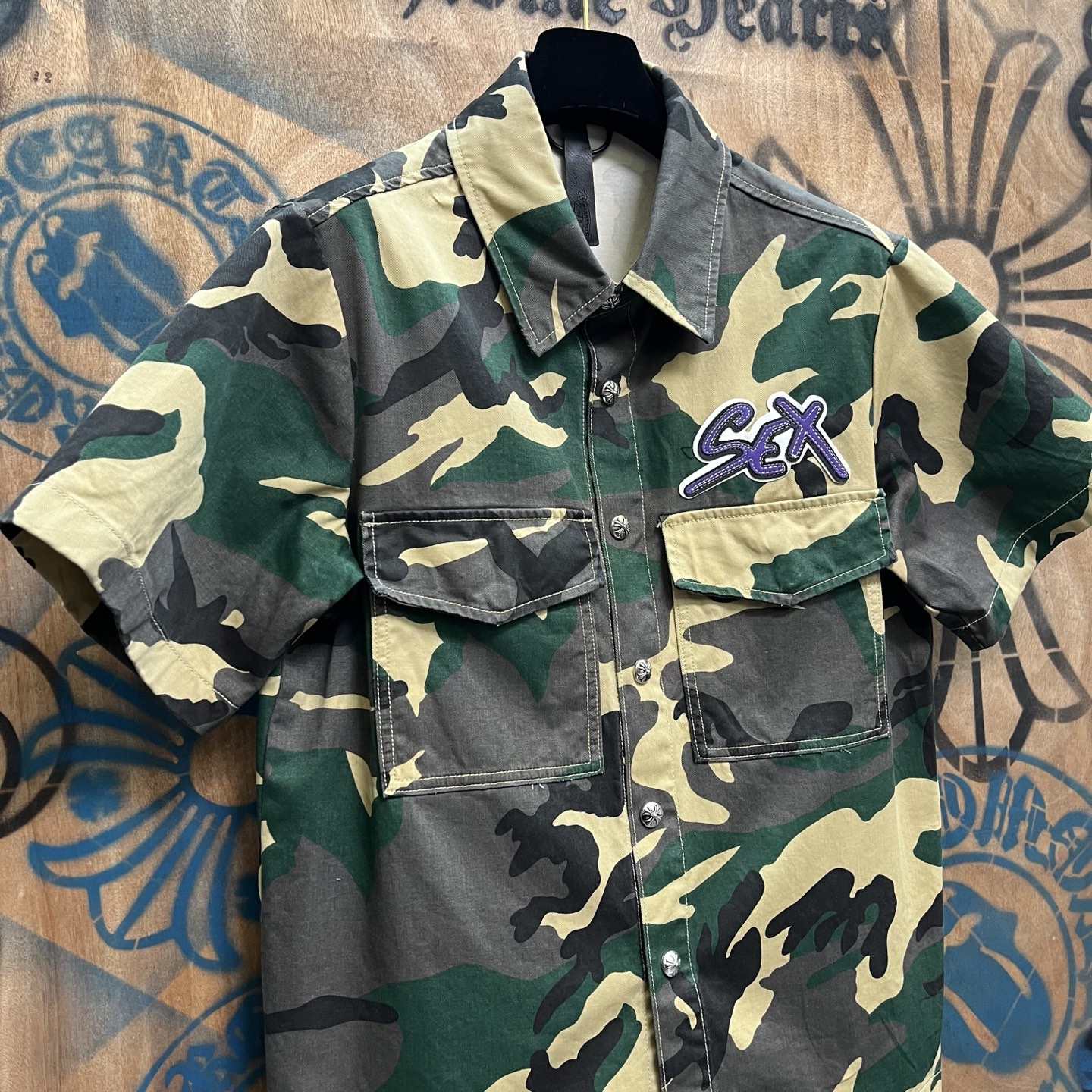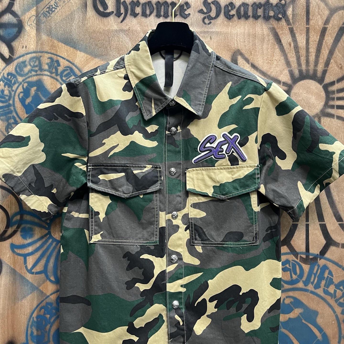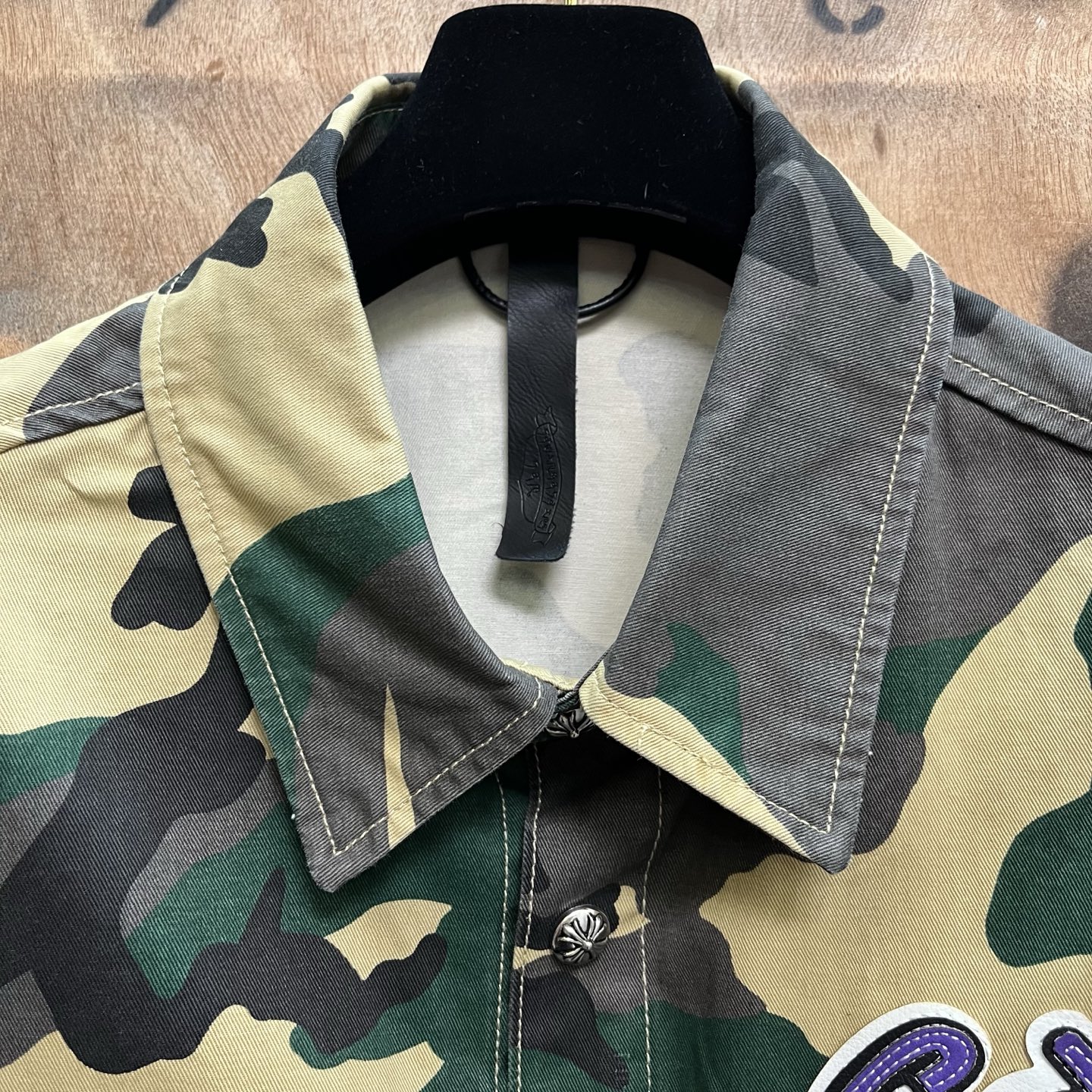 这款衣服是AAAAA 1:1 质量 (非常棒). 使用了和原版一模一样的材料. 商标部分也保持了和克罗心/Chrome Hearts一样. 图片拍摄是实物衣服拍摄, 您所收到的实物保证和我们图片一模一样.