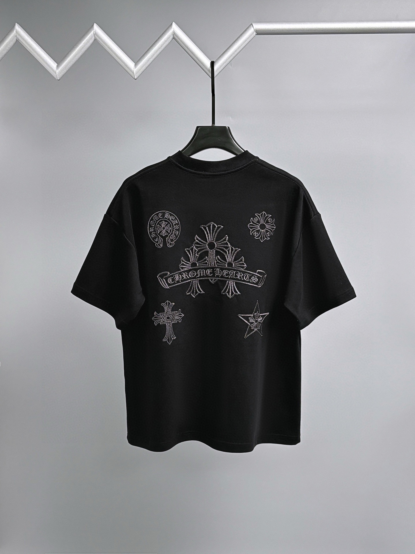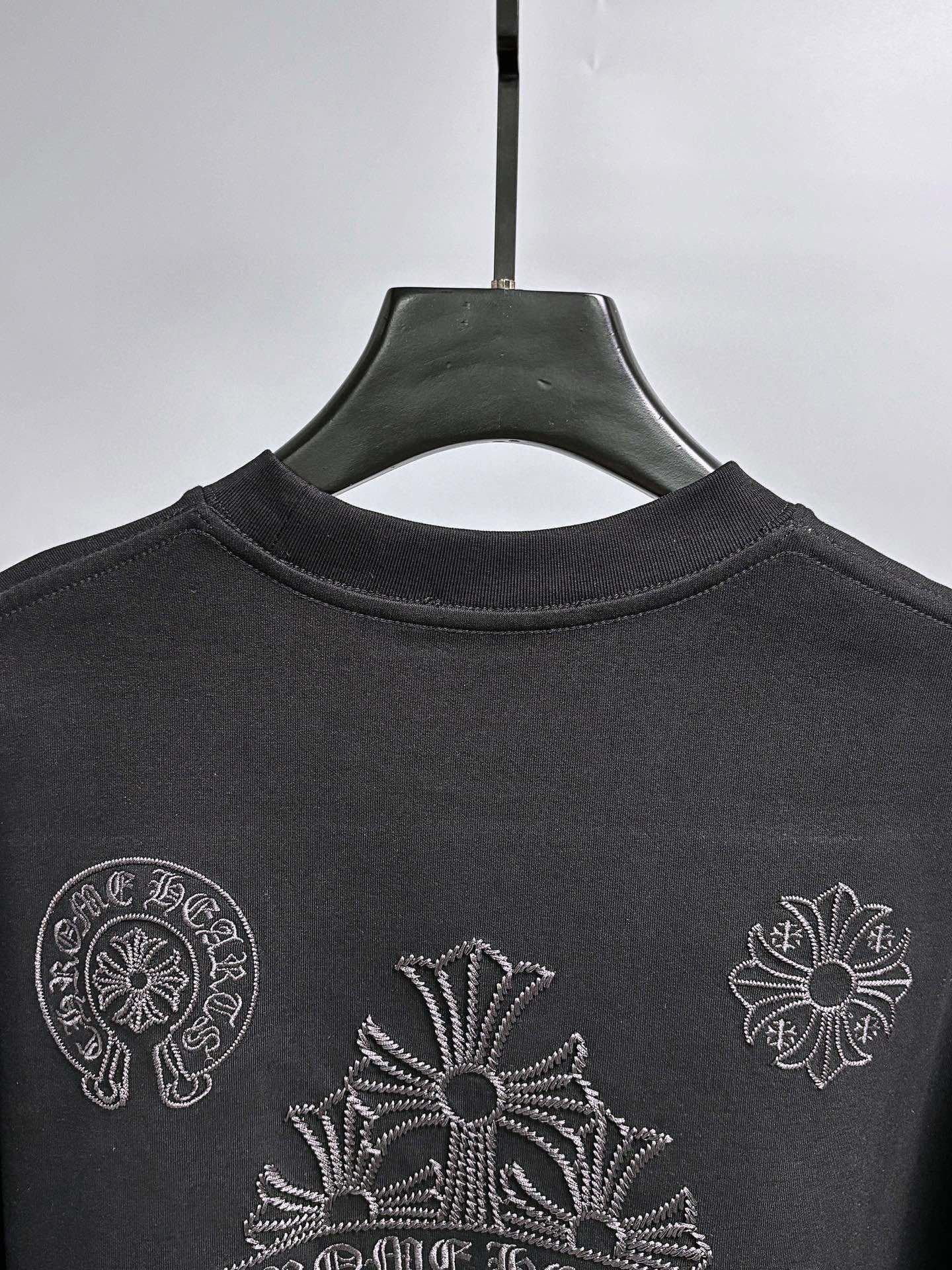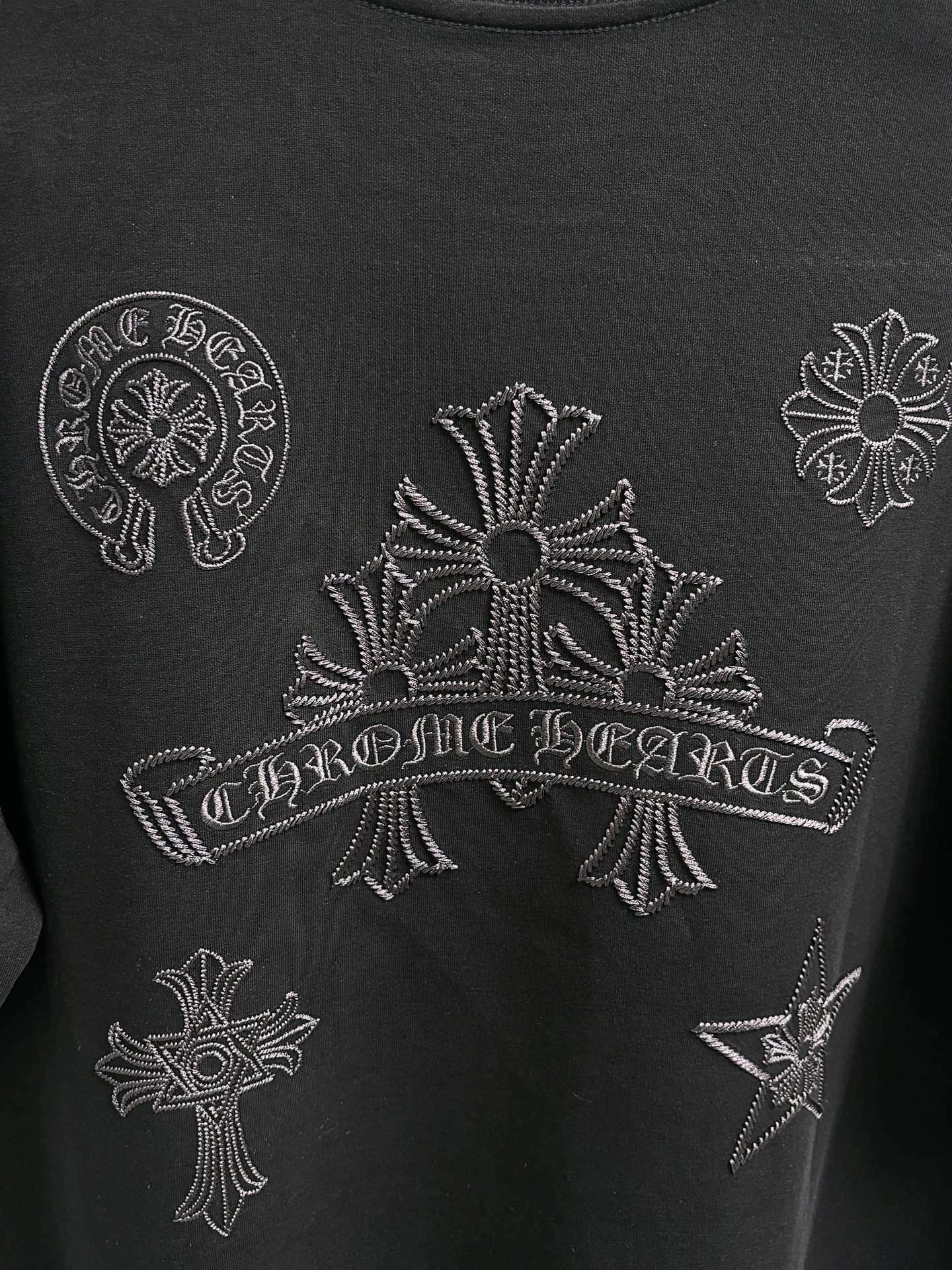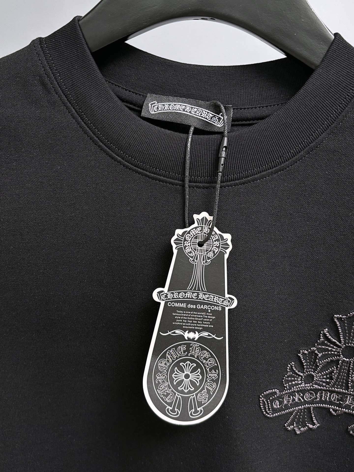 这款衣服是AAAAA 1:1 质量 (非常棒). 使用了和原版一模一样的材料. 商标部分也保持了和克罗心/Chrome Hearts一样. 图片拍摄是实物衣服拍摄, 您所收到的实物保证和我们图片一模一样.