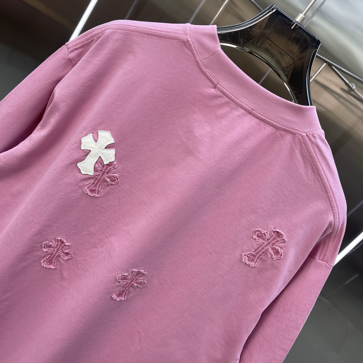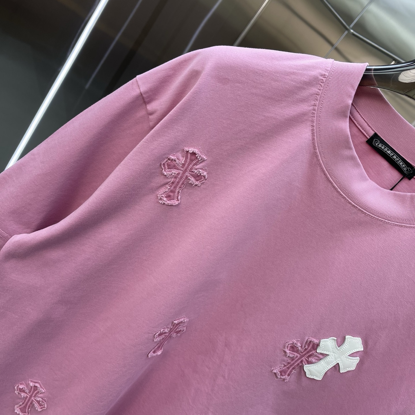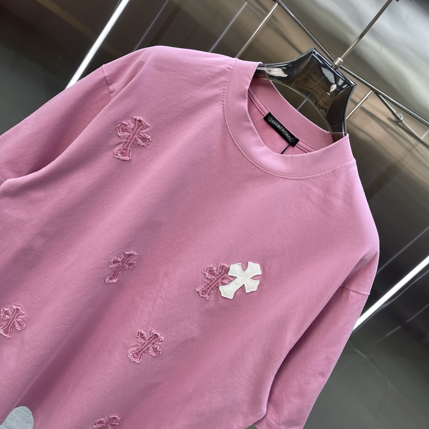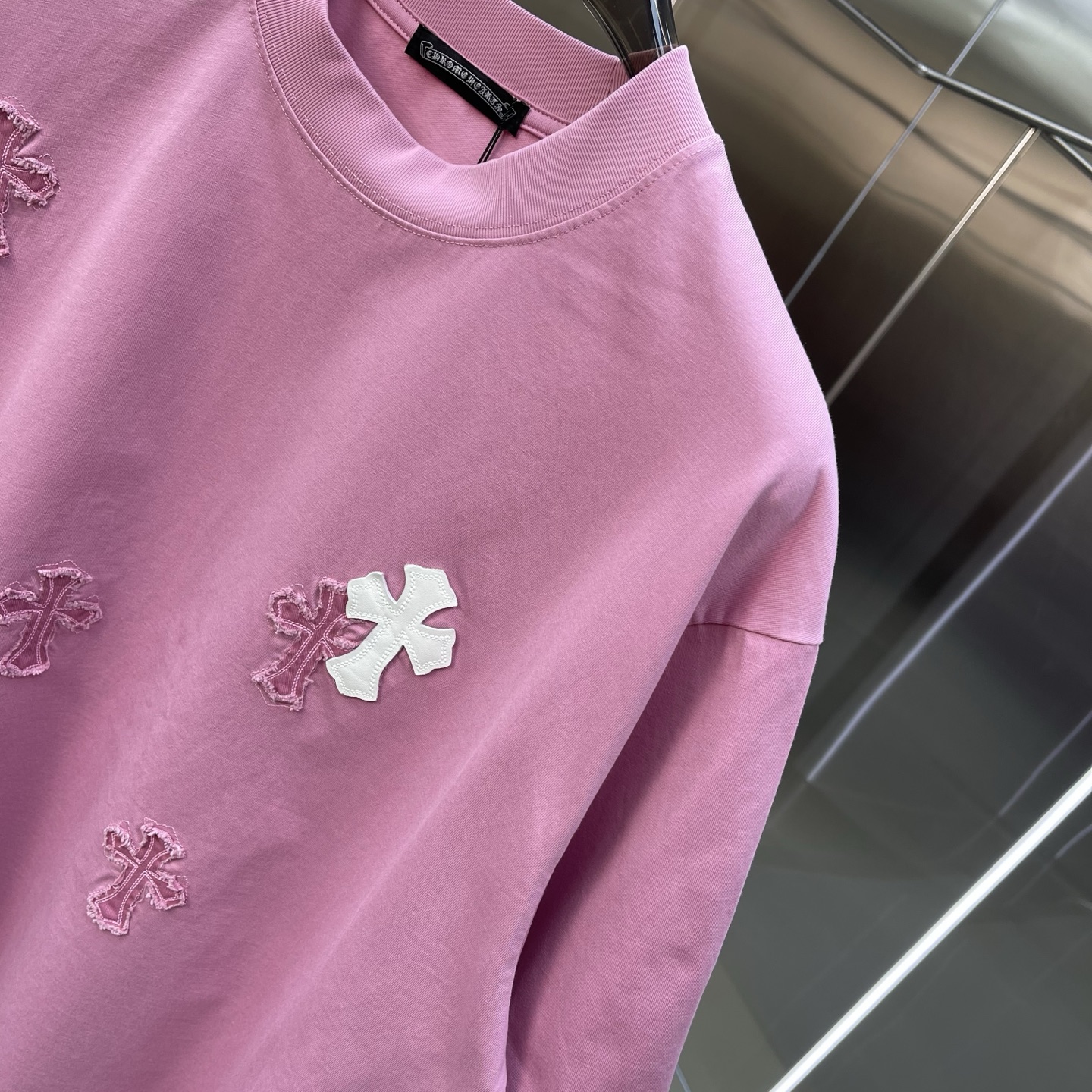 这款衣服是AAAAA 1:1 质量 (非常棒). 使用了和原版一模一样的材料. 商标部分也保持了和克罗心/Chrome Hearts一样. 图片拍摄是实物衣服拍摄, 您所收到的实物保证和我们图片一模一样.