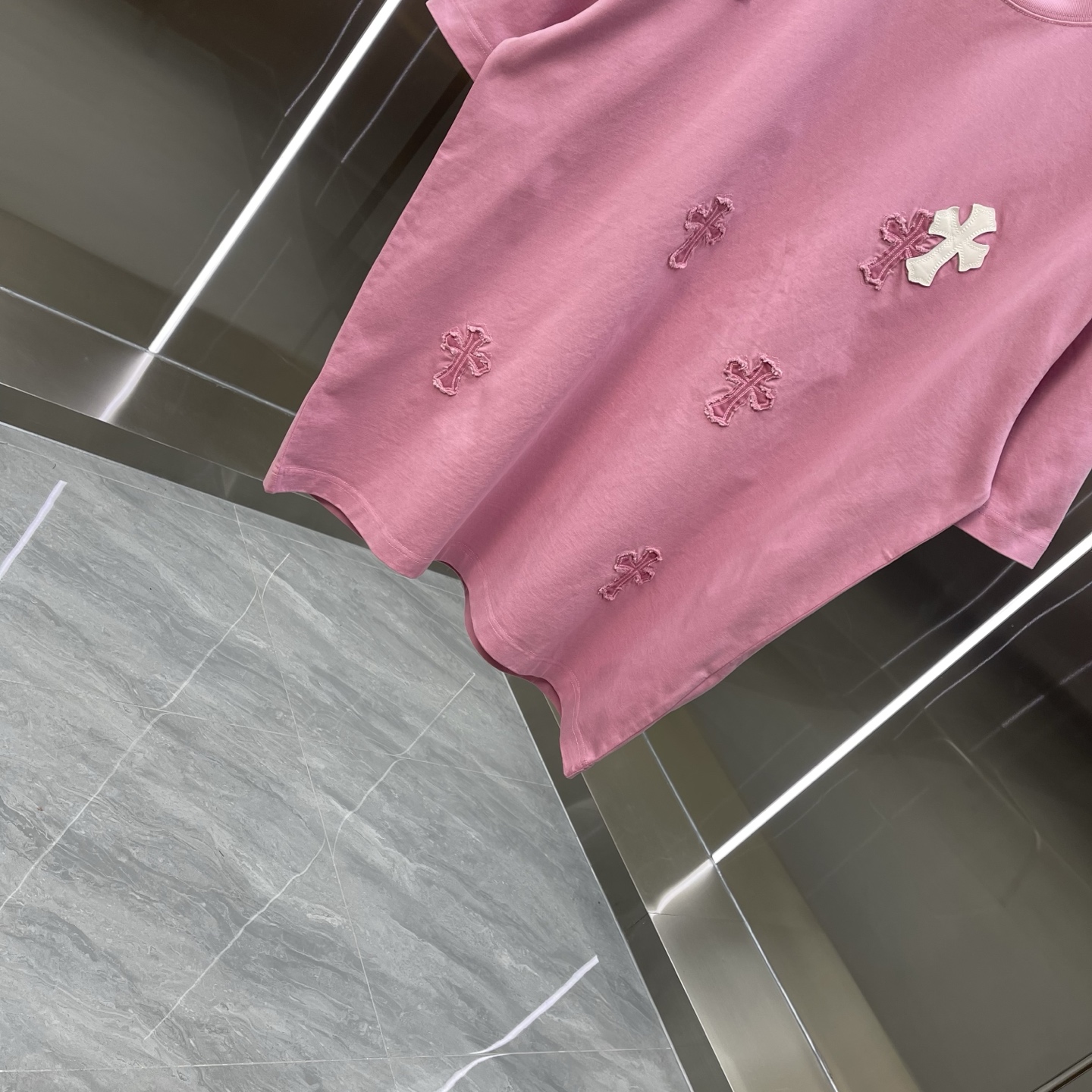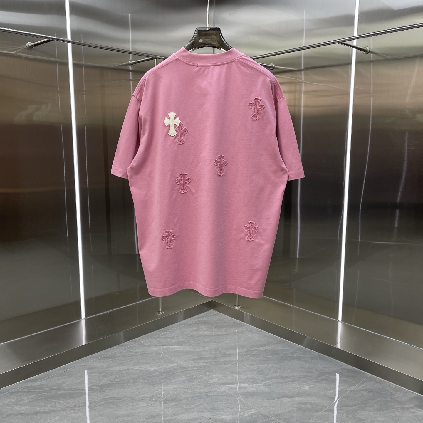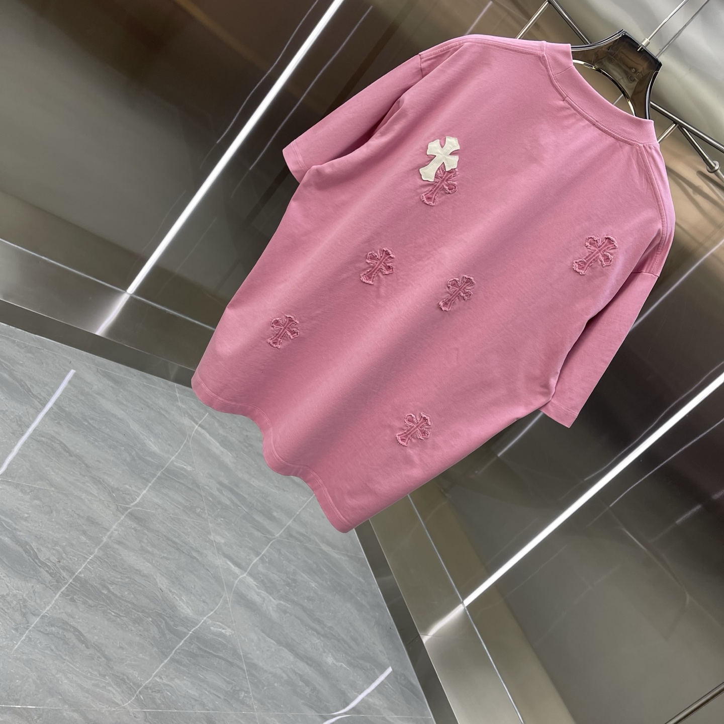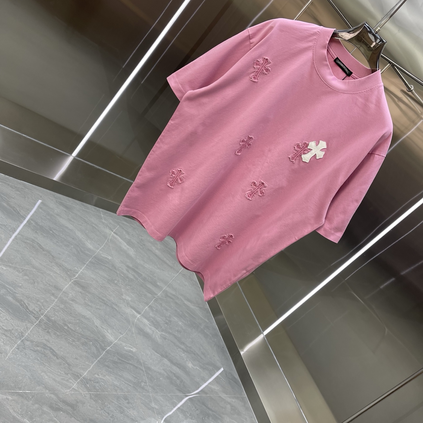 这款衣服是AAAAA 1:1 质量 (非常棒). 使用了和原版一模一样的材料. 商标部分也保持了和克罗心/Chrome Hearts一样. 图片拍摄是实物衣服拍摄, 您所收到的实物保证和我们图片一模一样.