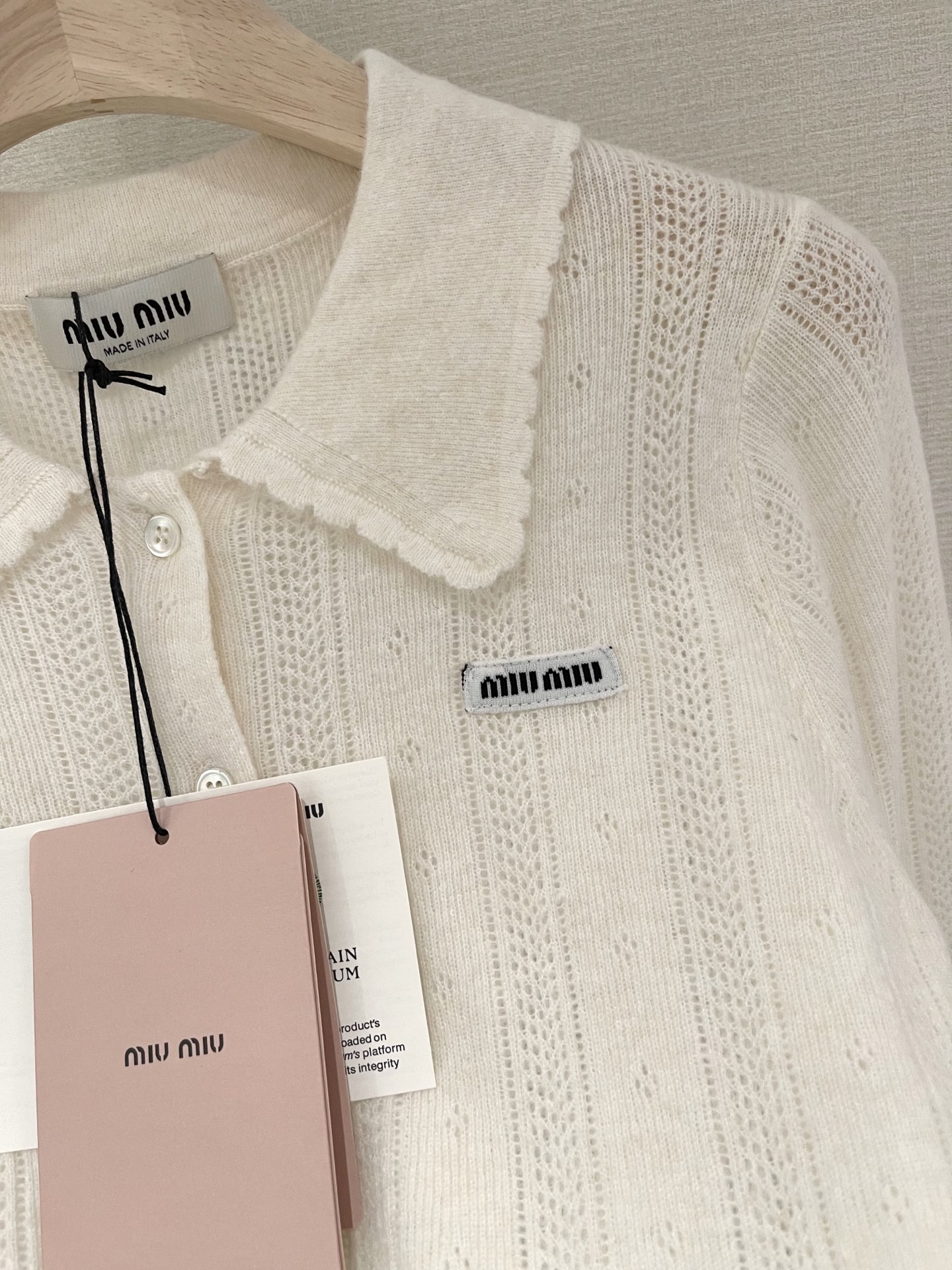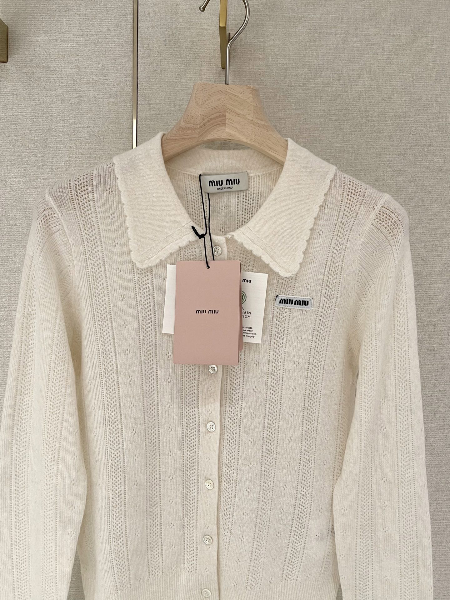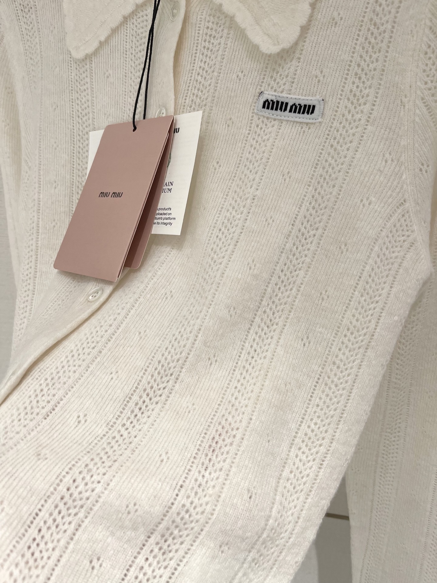 这款衣服是AAAAA 1:1 质量 (非常棒). 使用了和原版一模一样的材料. 商标部分也保持了和缪缪/Miu Miu一样. 图片拍摄是实物衣服拍摄, 您所收到的实物保证和我们图片一模一样.