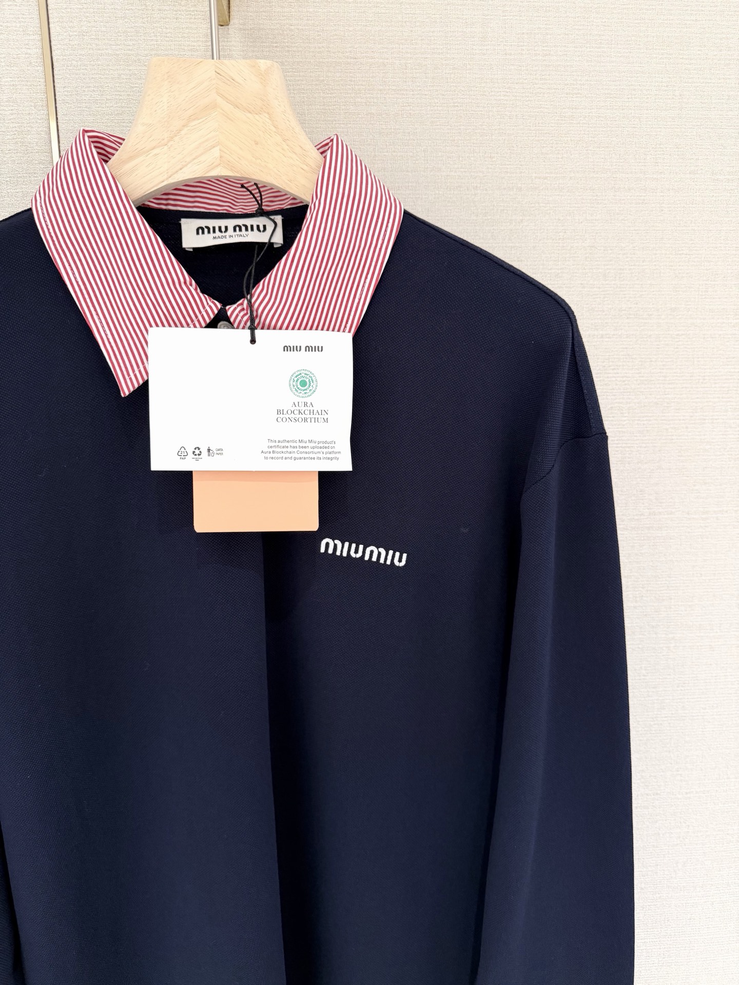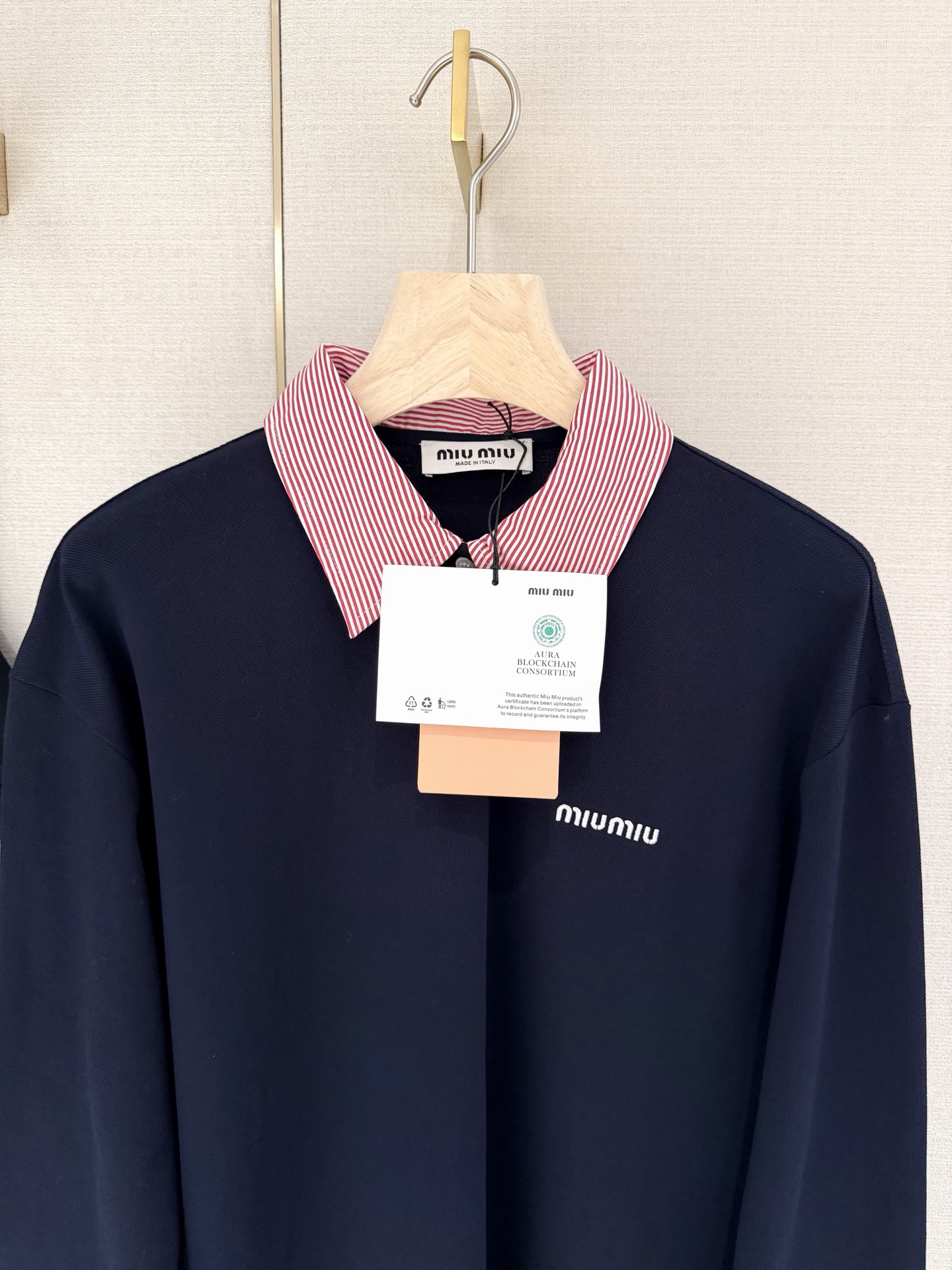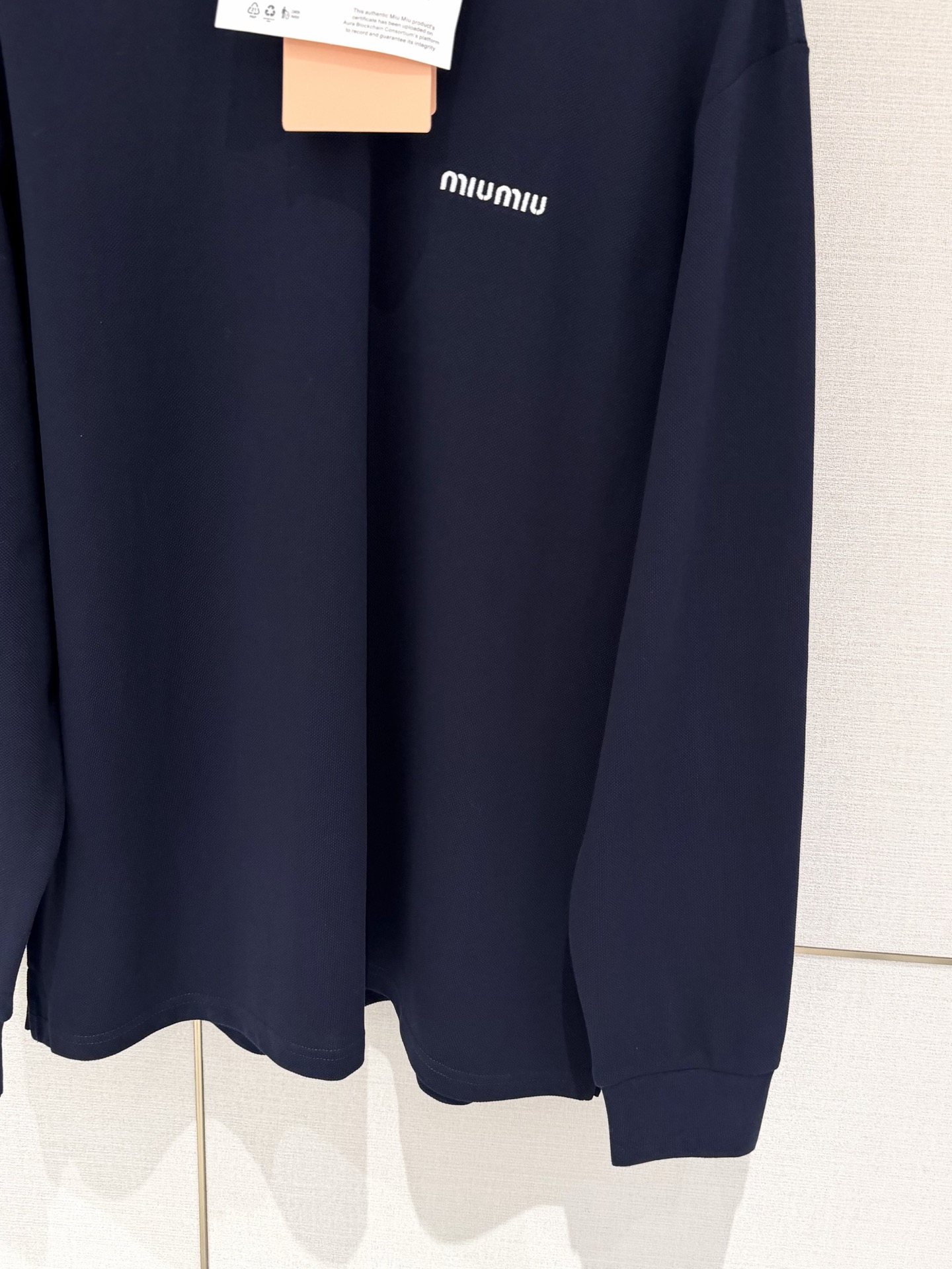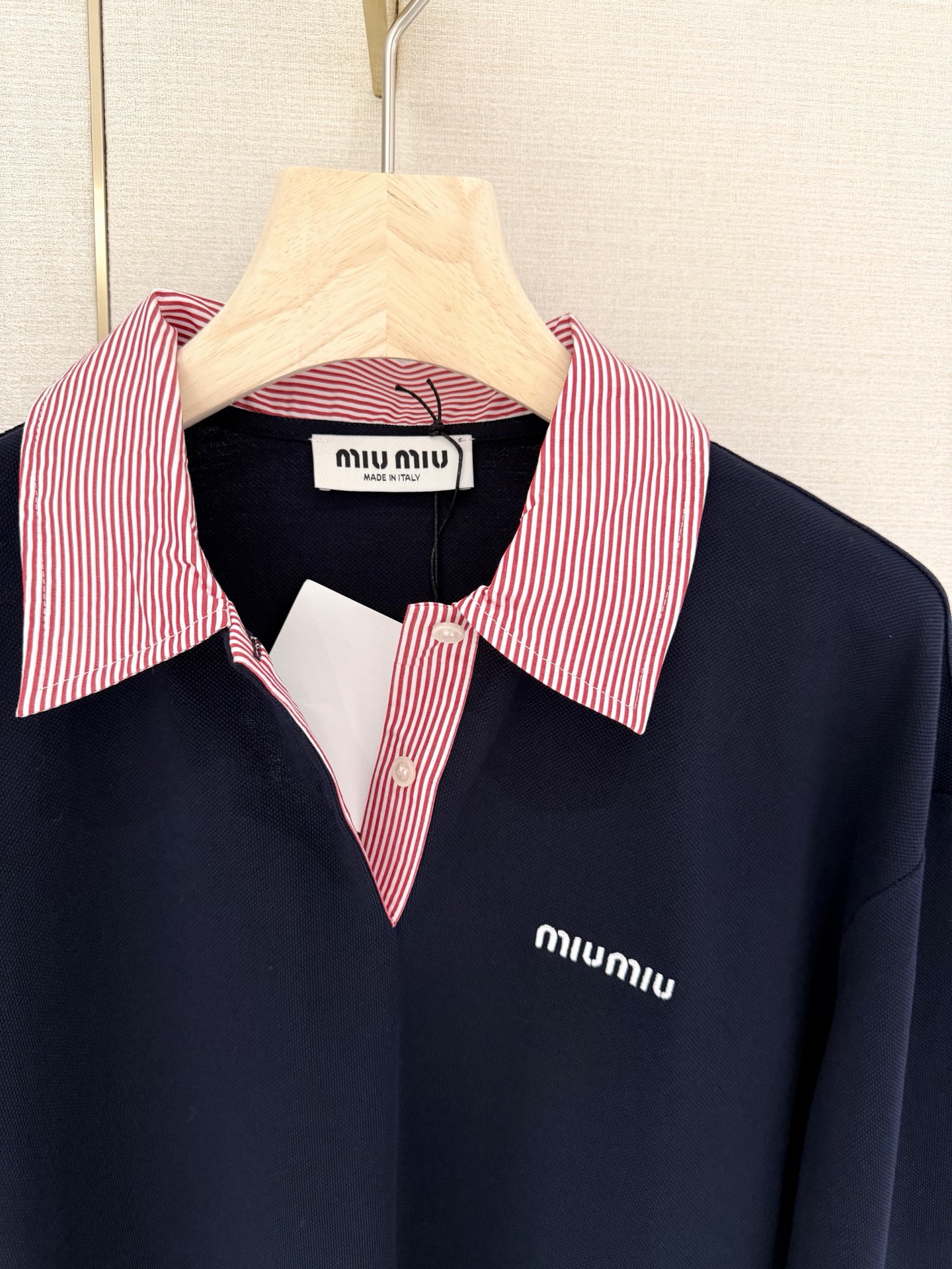 这款衣服是AAAAA 1:1 质量 (非常棒). 使用了和原版一模一样的材料. 商标部分也保持了和缪缪/Miu Miu一样. 图片拍摄是实物衣服拍摄, 您所收到的实物保证和我们图片一模一样.