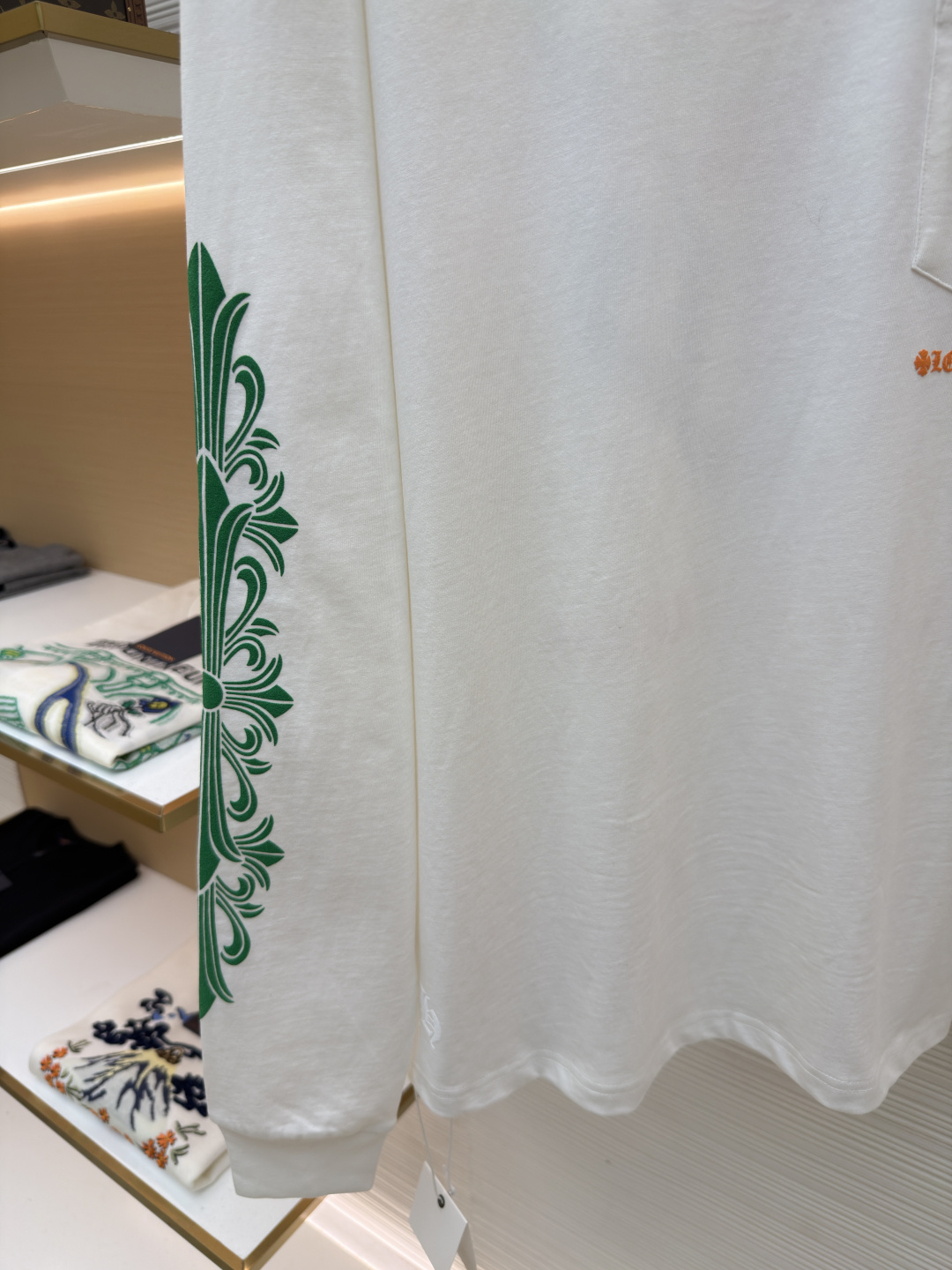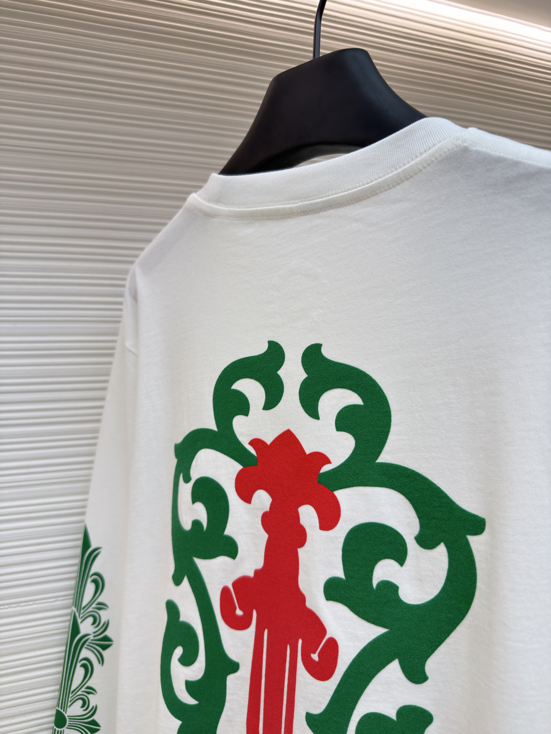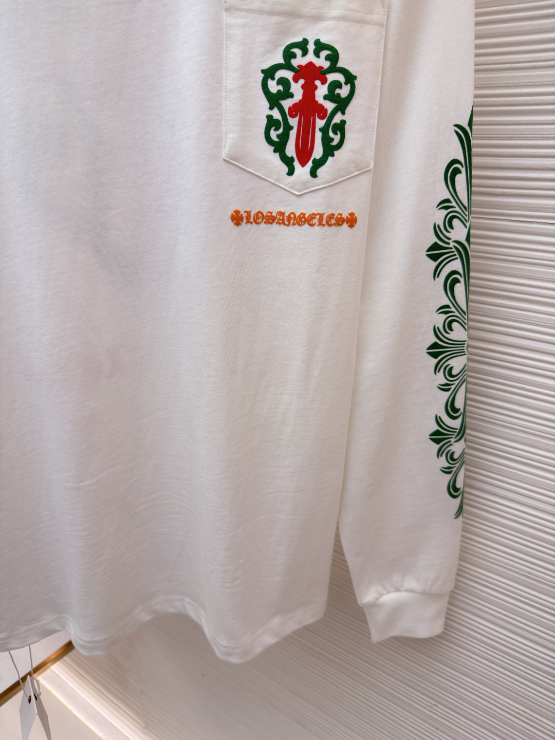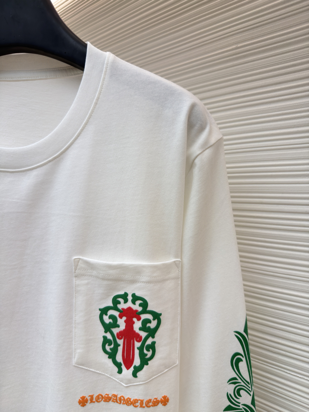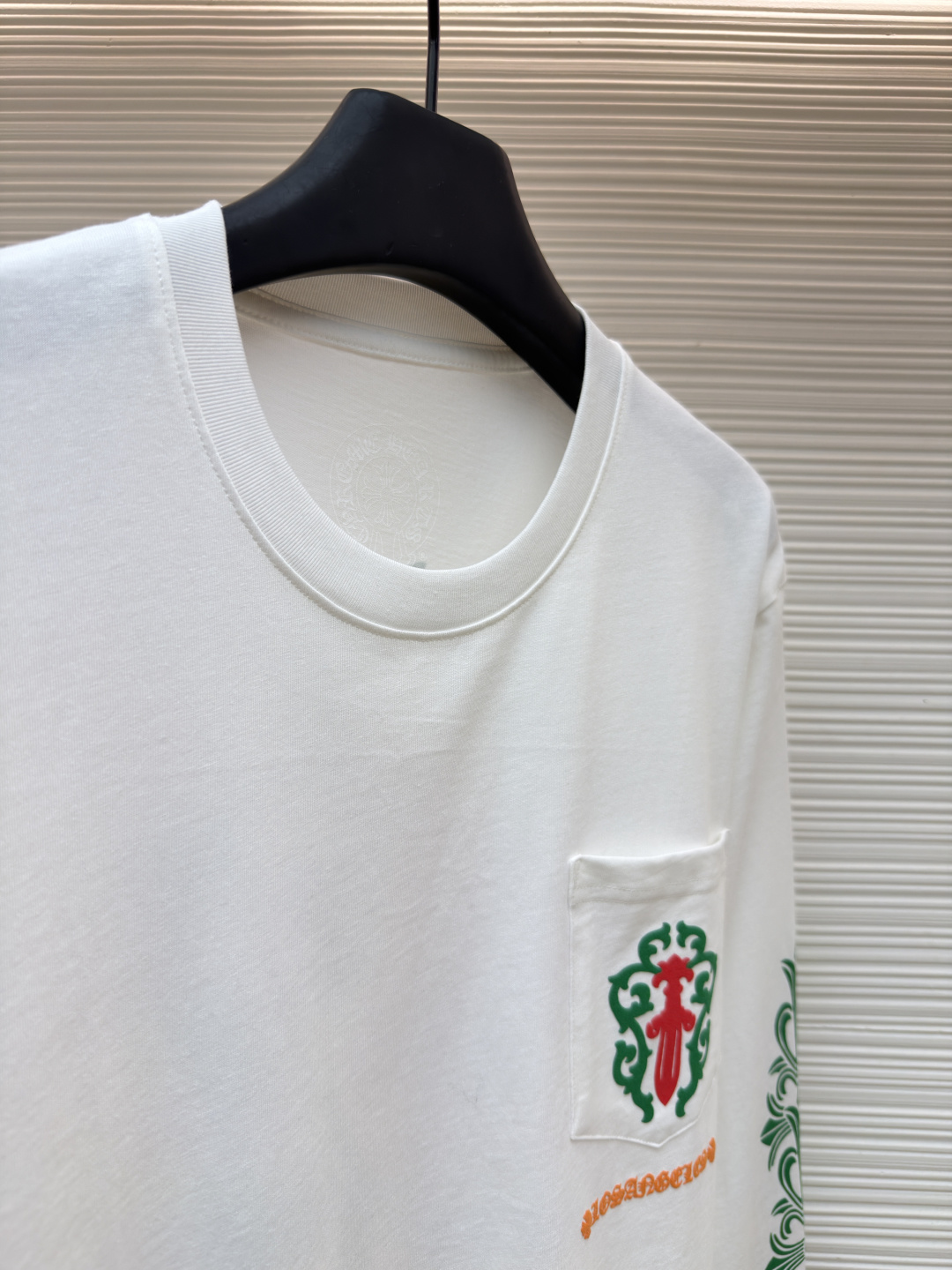 这款衣服是AAAAA 1:1 质量 (非常棒). 使用了和原版一模一样的材料. 商标部分也保持了和克罗心/Chrome Hearts一样. 图片拍摄是实物衣服拍摄, 您所收到的实物保证和我们图片一模一样.