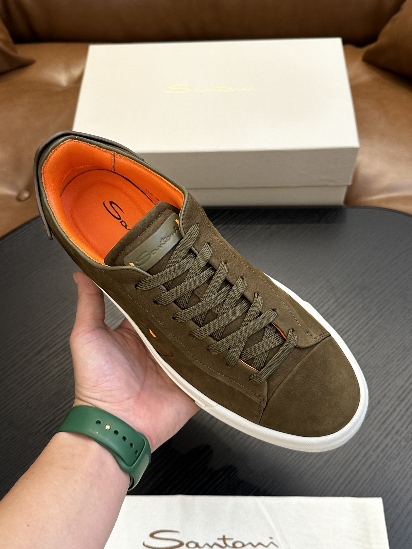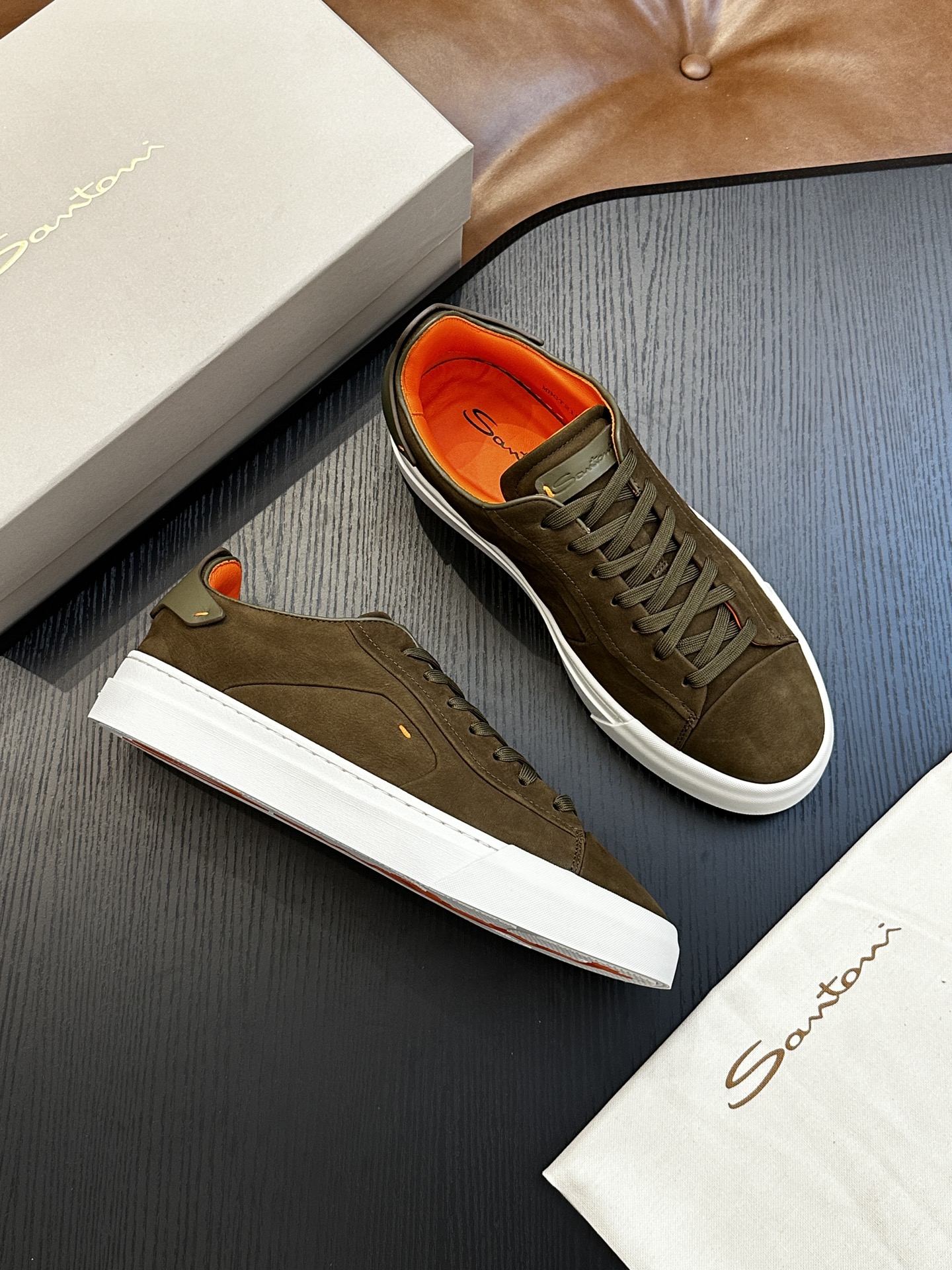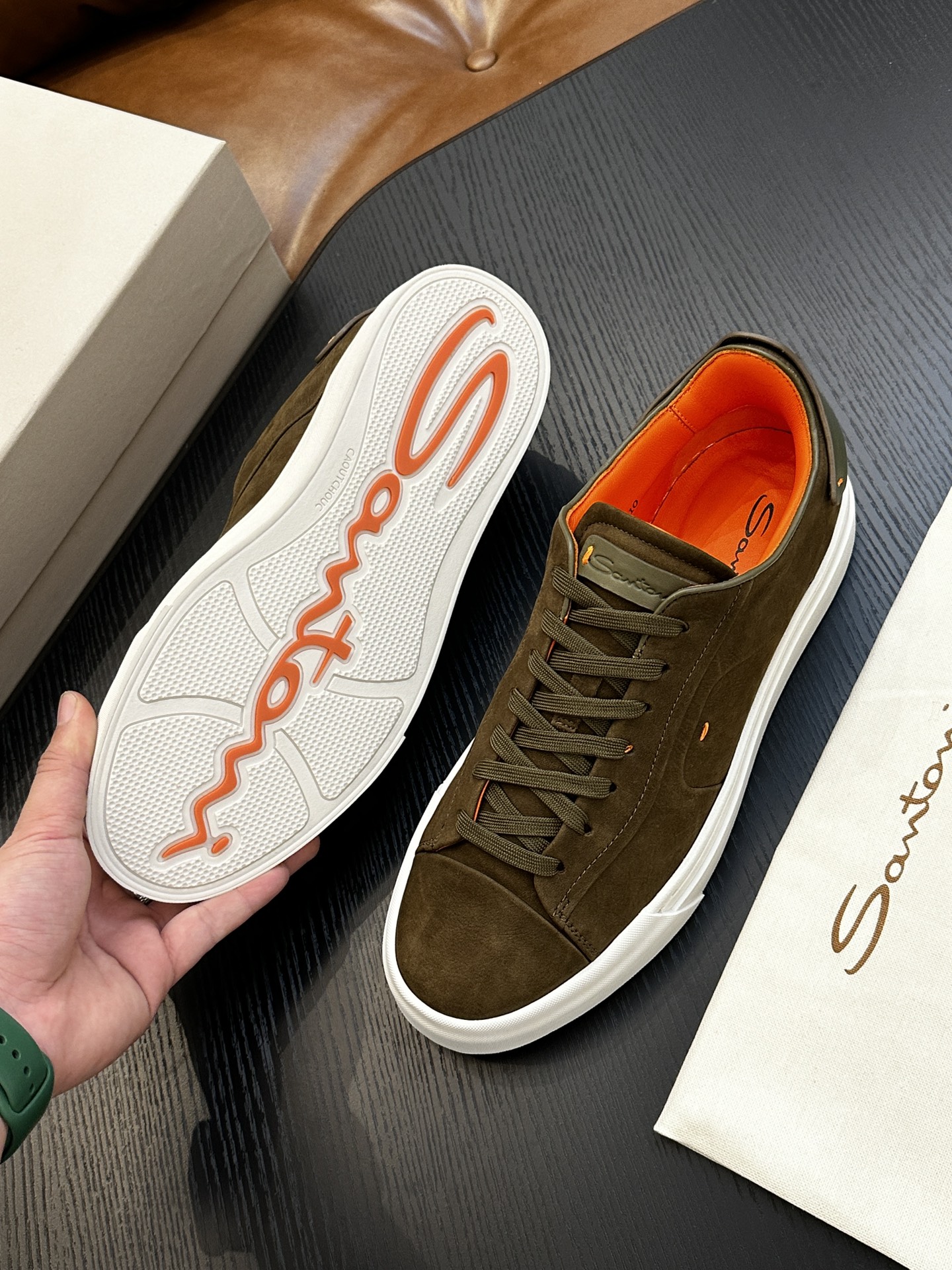 这款鞋子是AAAAA 1:1 质量 (非常棒). 使用了和原版一模一样的材料. 商标部分也保持了和Santoni一样. 图片拍摄是实物鞋子拍摄, 您所收到的实物保证和我们图片一模一样.
