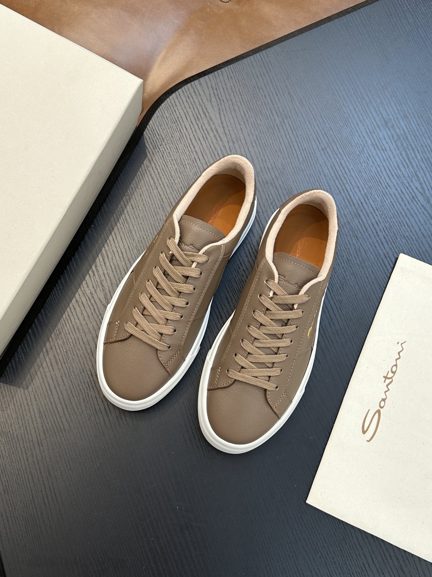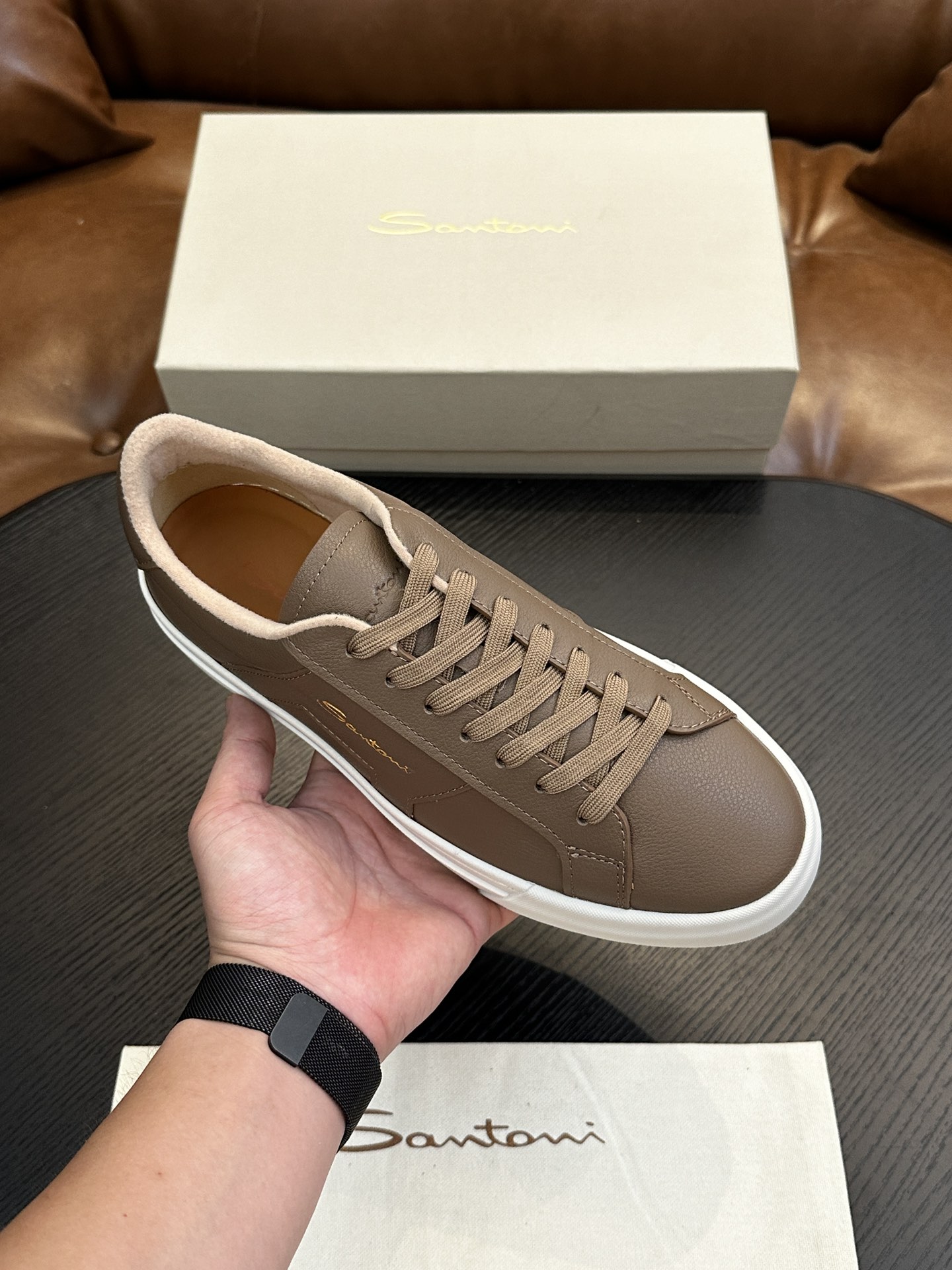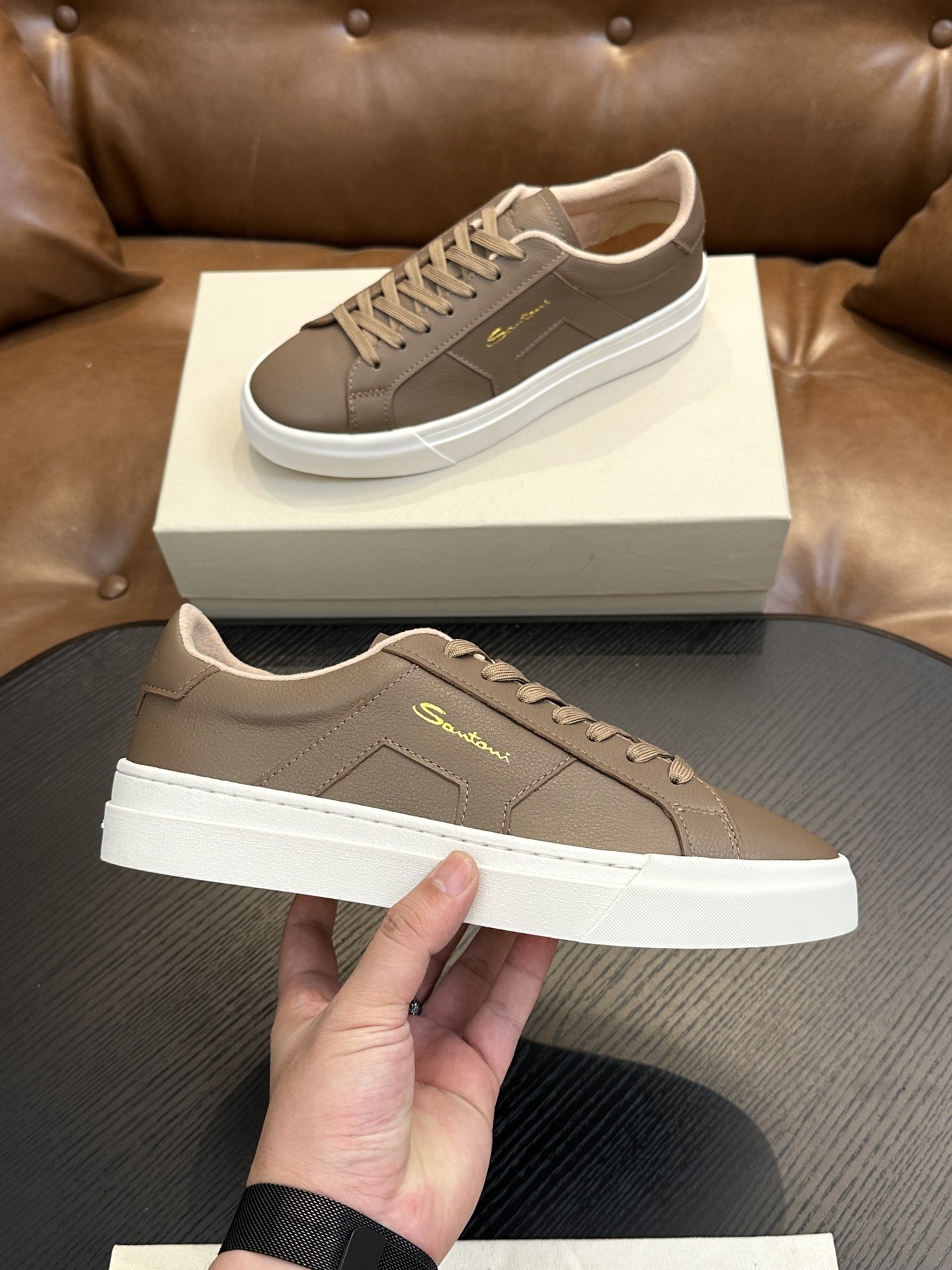 这款鞋子是AAAAA 1:1 质量 (非常棒). 使用了和原版一模一样的材料. 商标部分也保持了和Santoni一样. 图片拍摄是实物鞋子拍摄, 您所收到的实物保证和我们图片一模一样.
