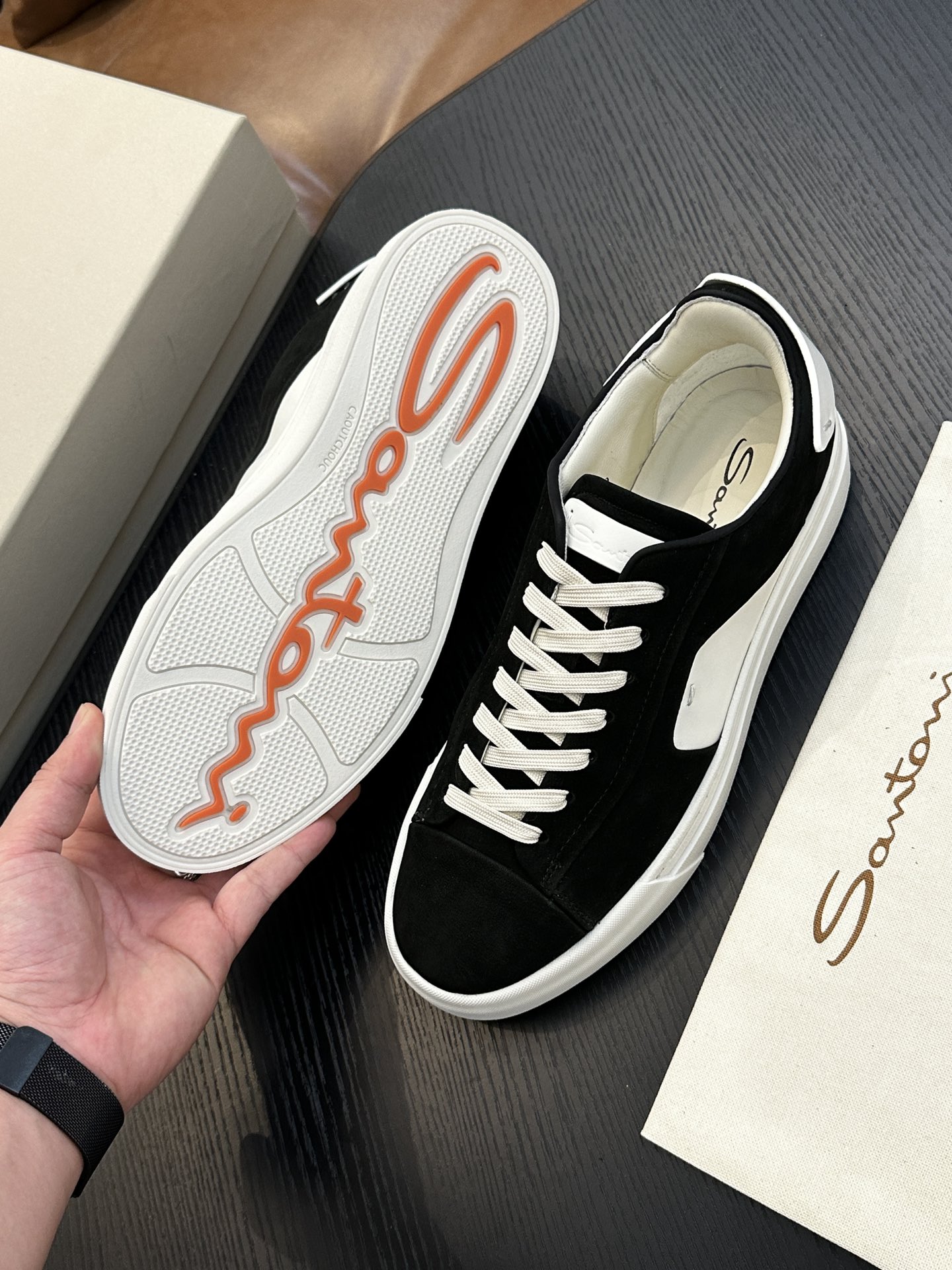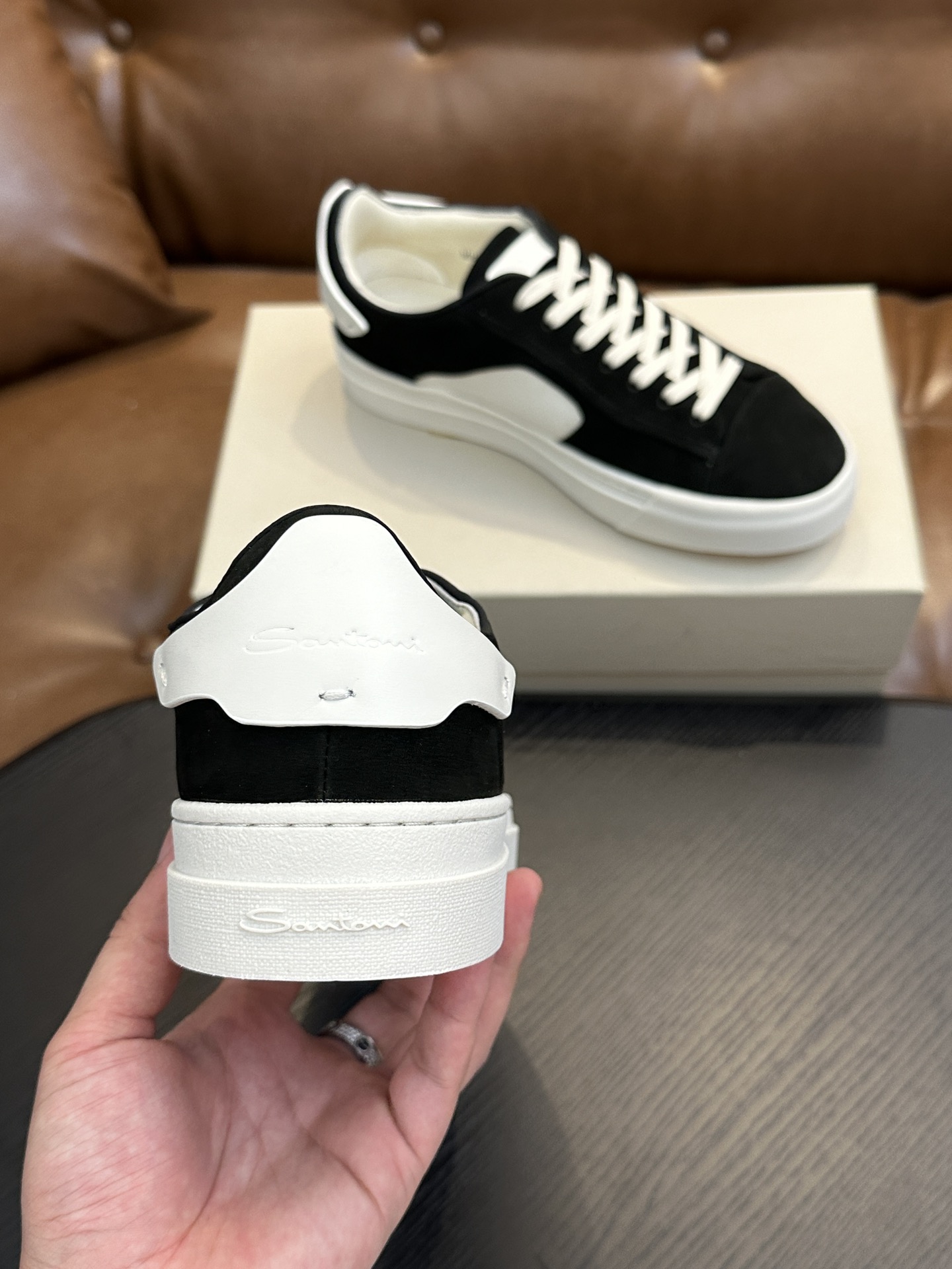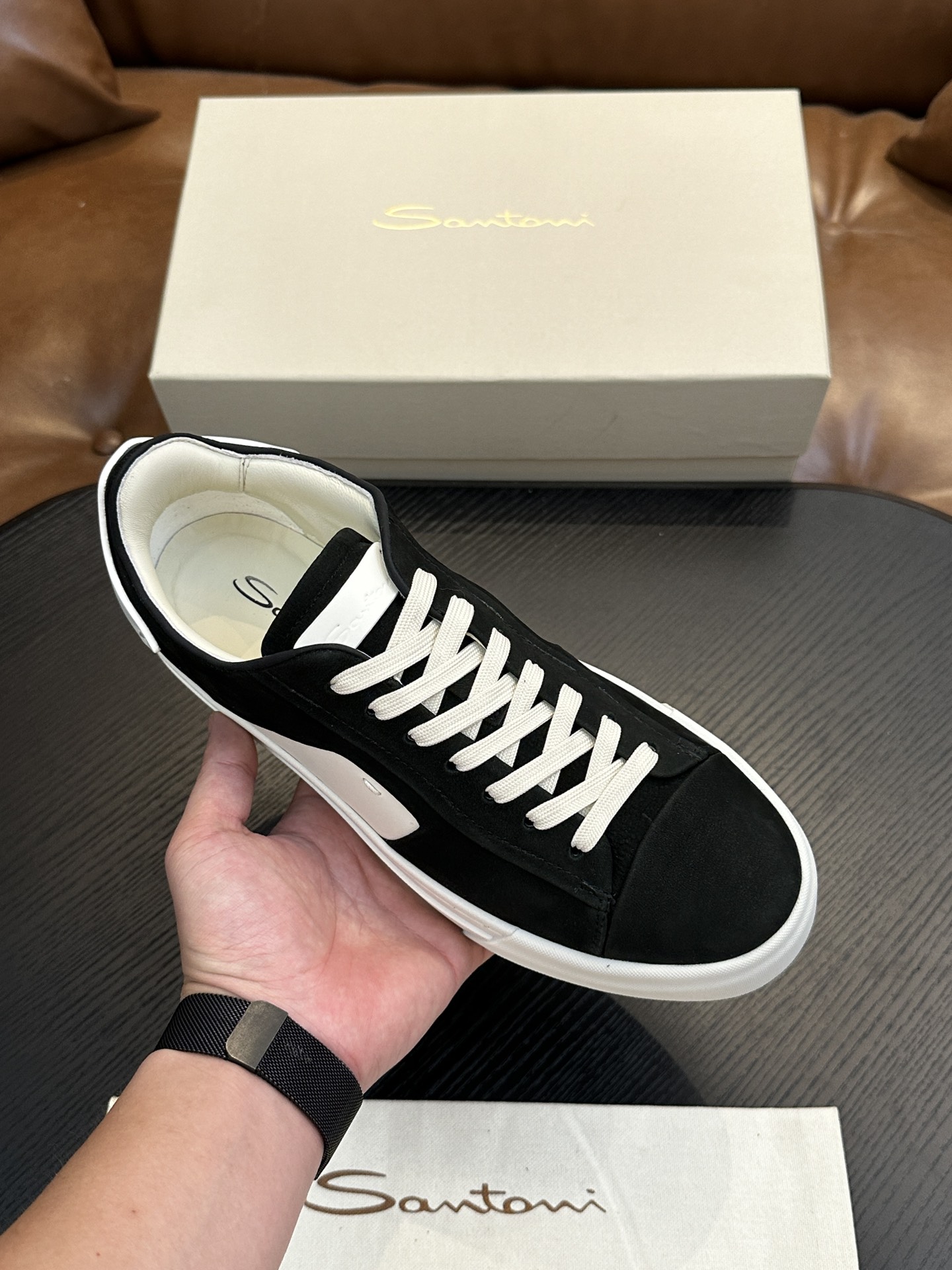 这款鞋子是AAAAA 1:1 质量 (非常棒). 使用了和原版一模一样的材料. 商标部分也保持了和Santoni一样. 图片拍摄是实物鞋子拍摄, 您所收到的实物保证和我们图片一模一样.