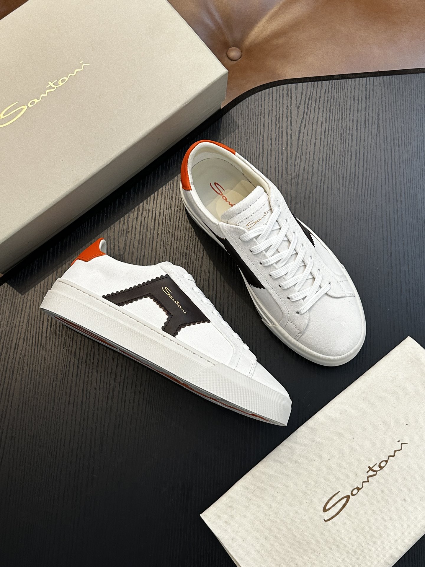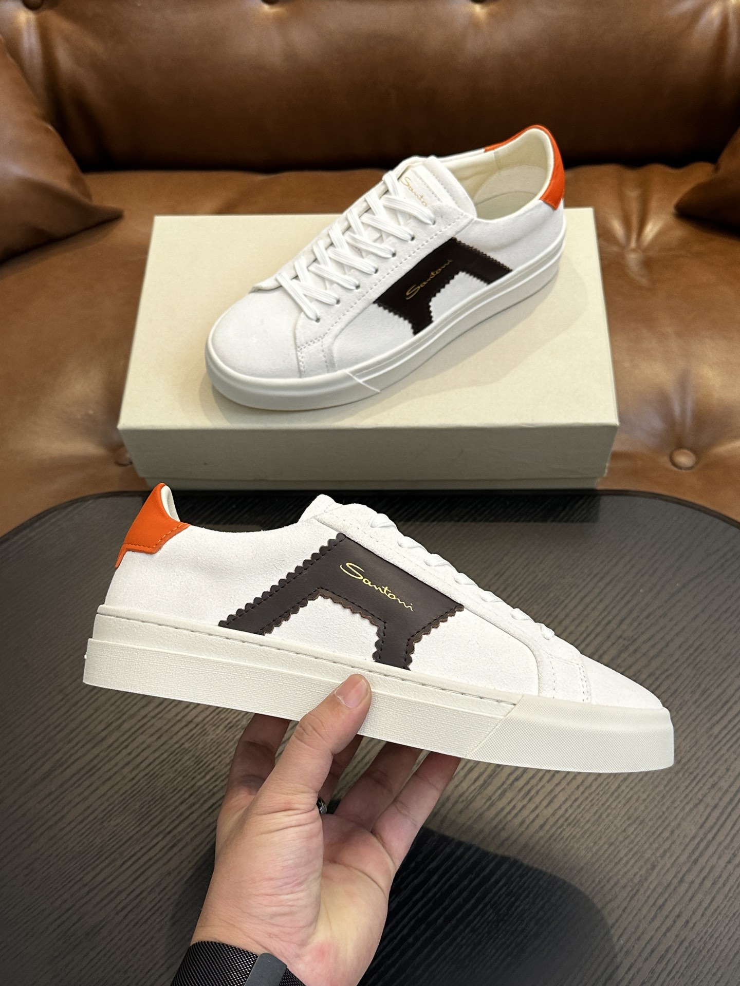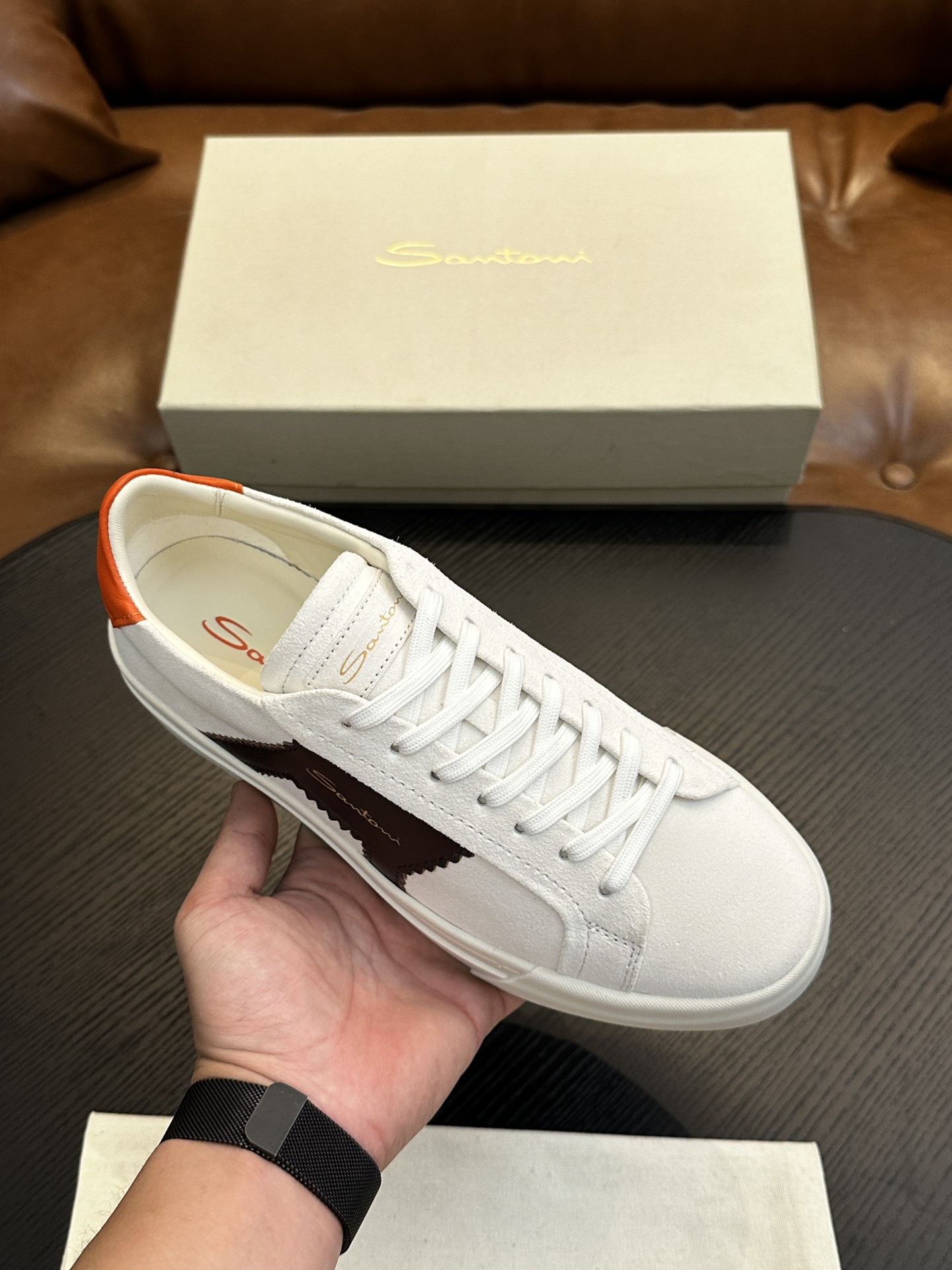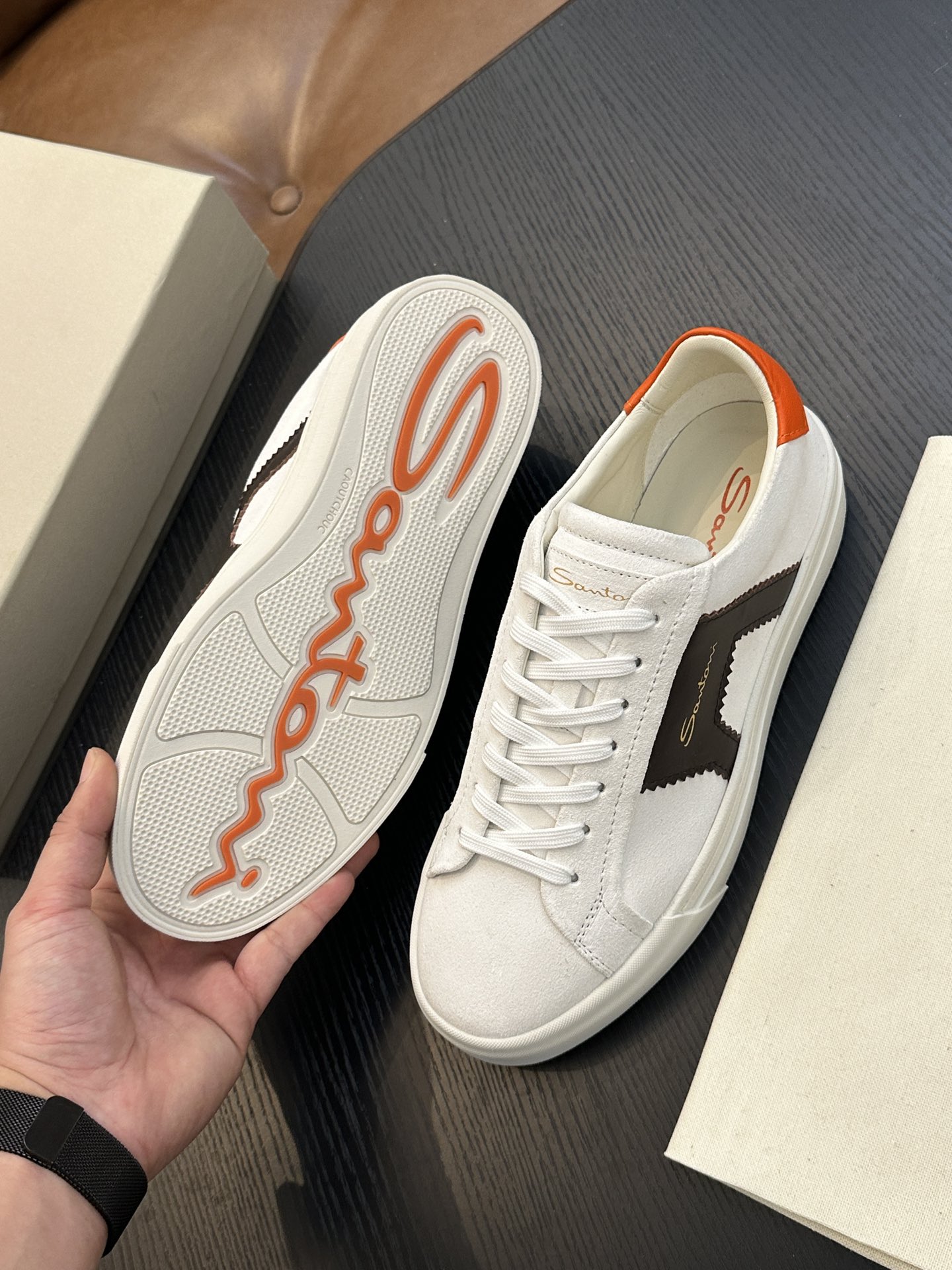 这款鞋子是AAAAA 1:1 质量 (非常棒). 使用了和原版一模一样的材料. 商标部分也保持了和Santoni一样. 图片拍摄是实物鞋子拍摄, 您所收到的实物保证和我们图片一模一样.