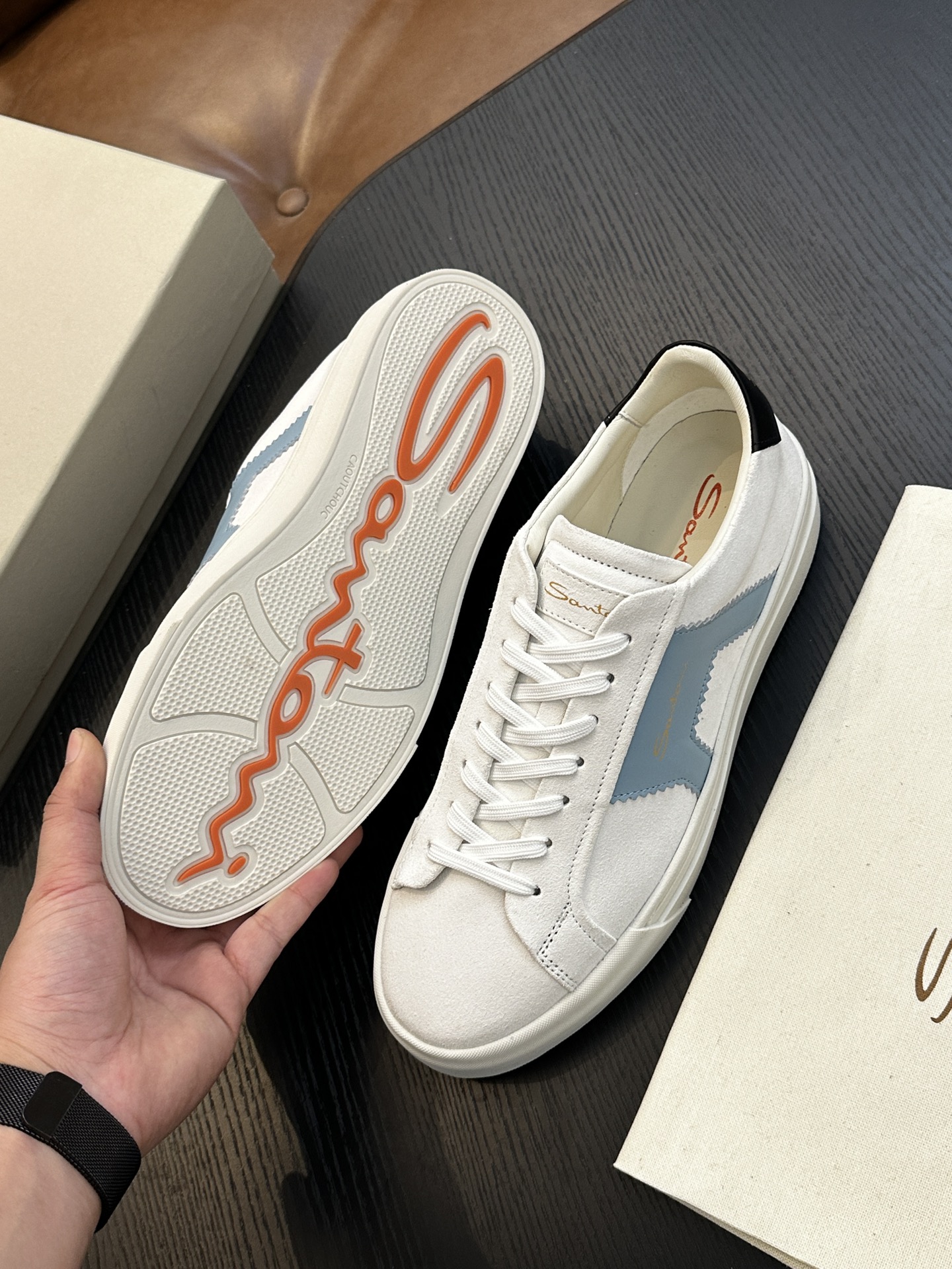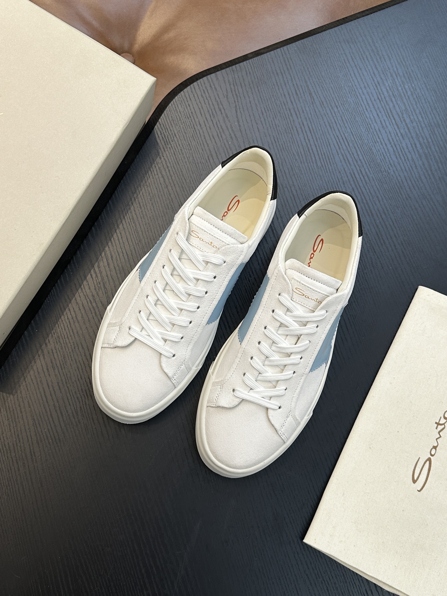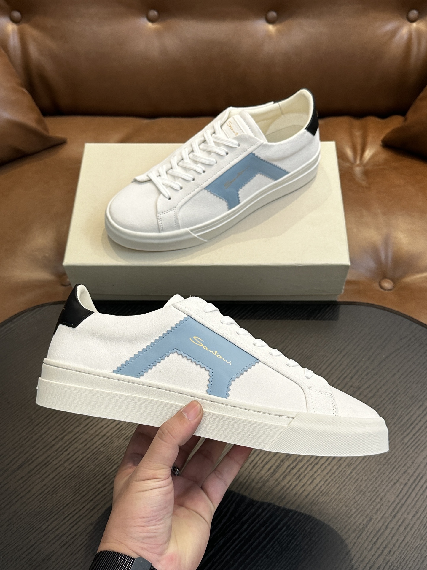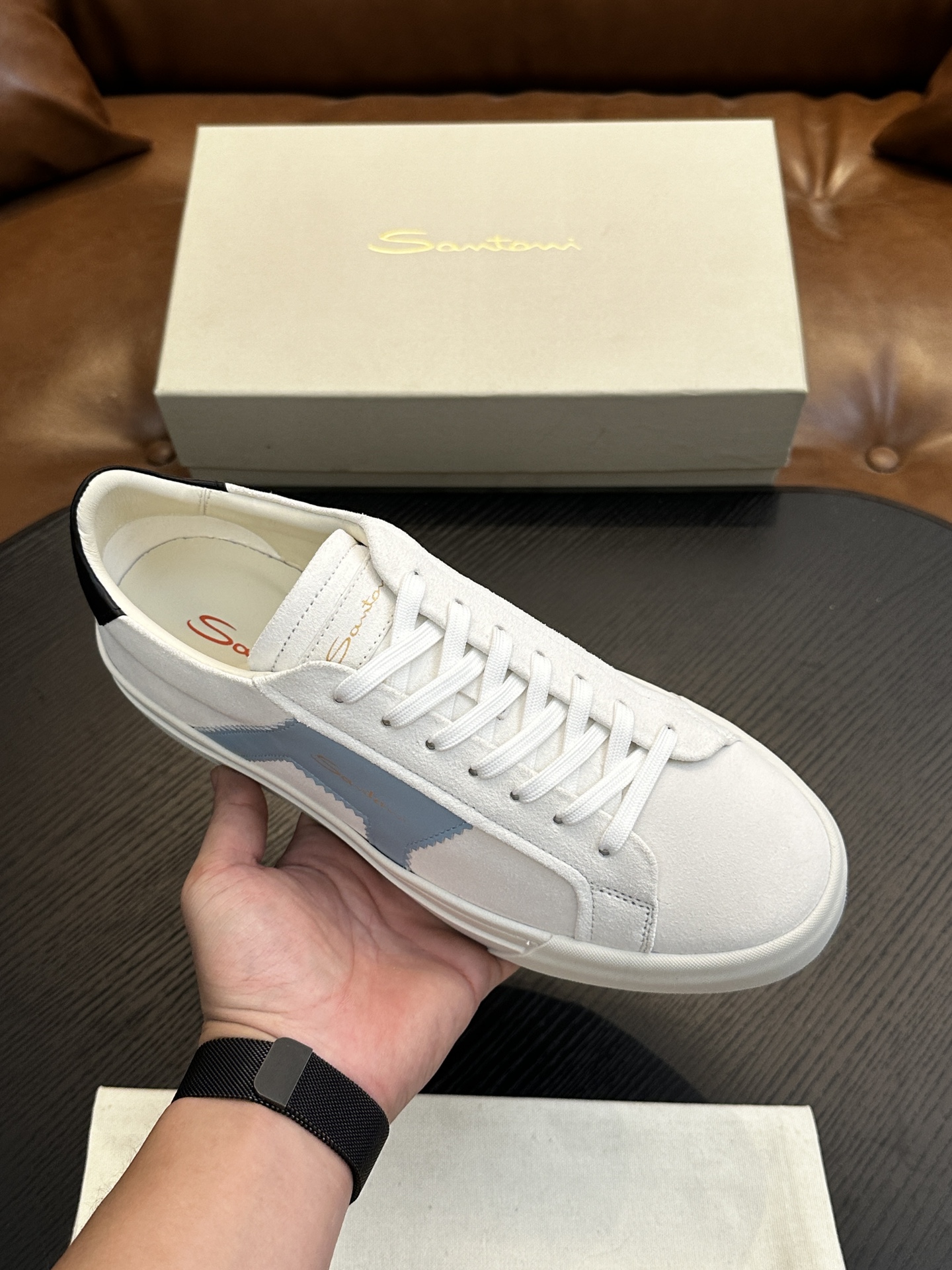 这款鞋子是AAAAA 1:1 质量 (非常棒). 使用了和原版一模一样的材料. 商标部分也保持了和Santoni一样. 图片拍摄是实物鞋子拍摄, 您所收到的实物保证和我们图片一模一样.