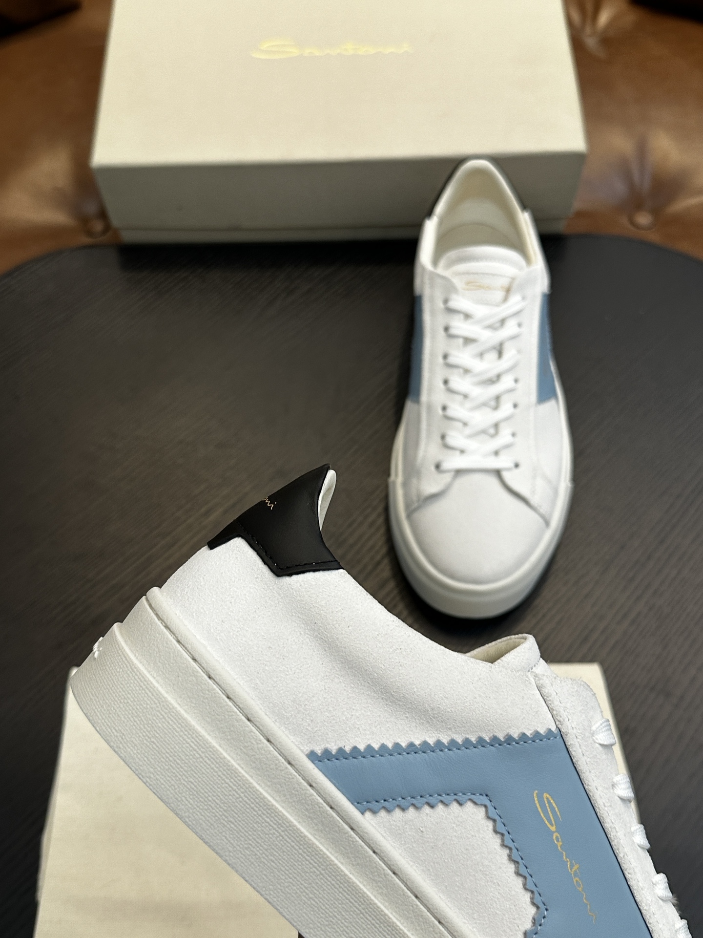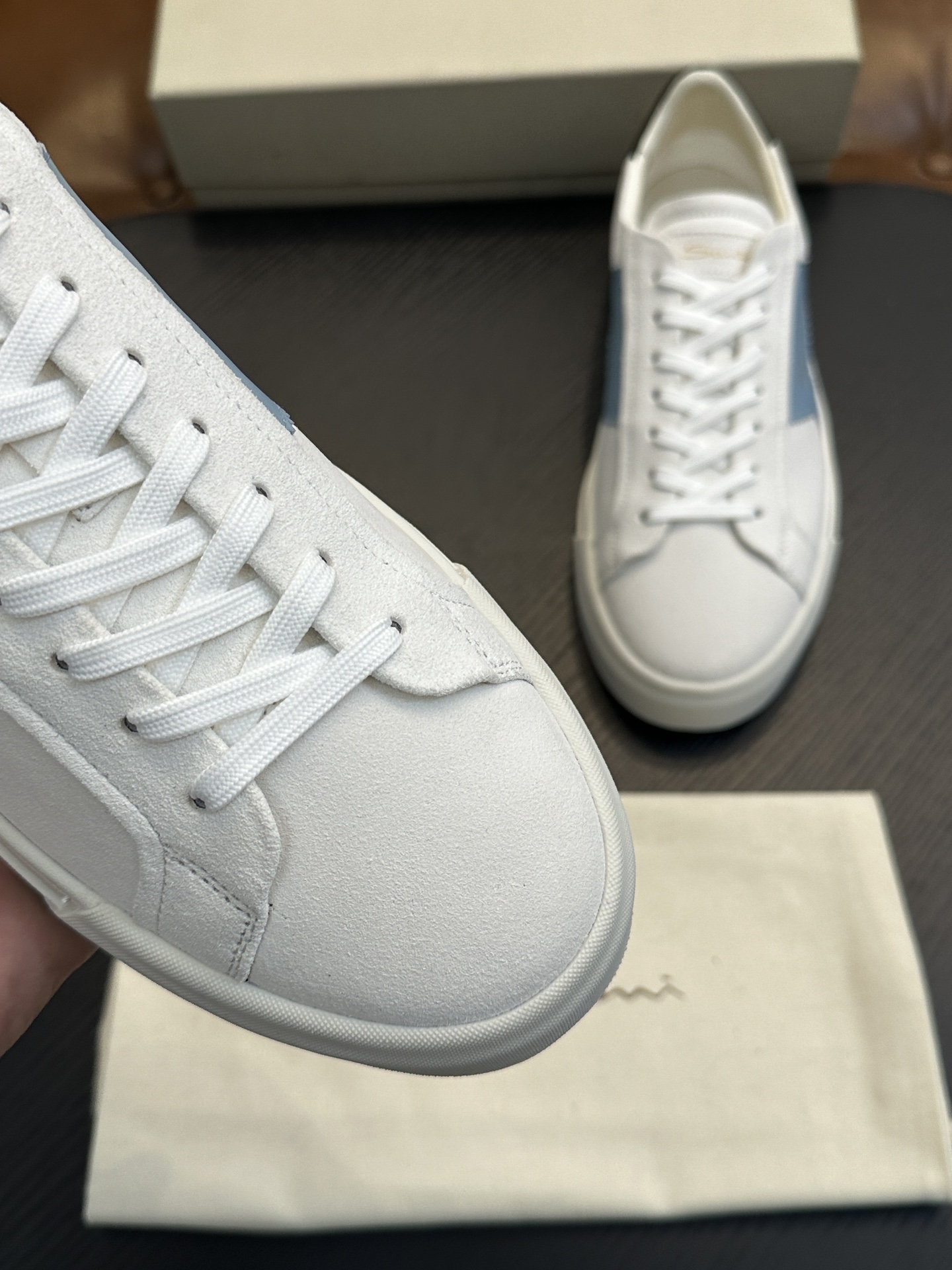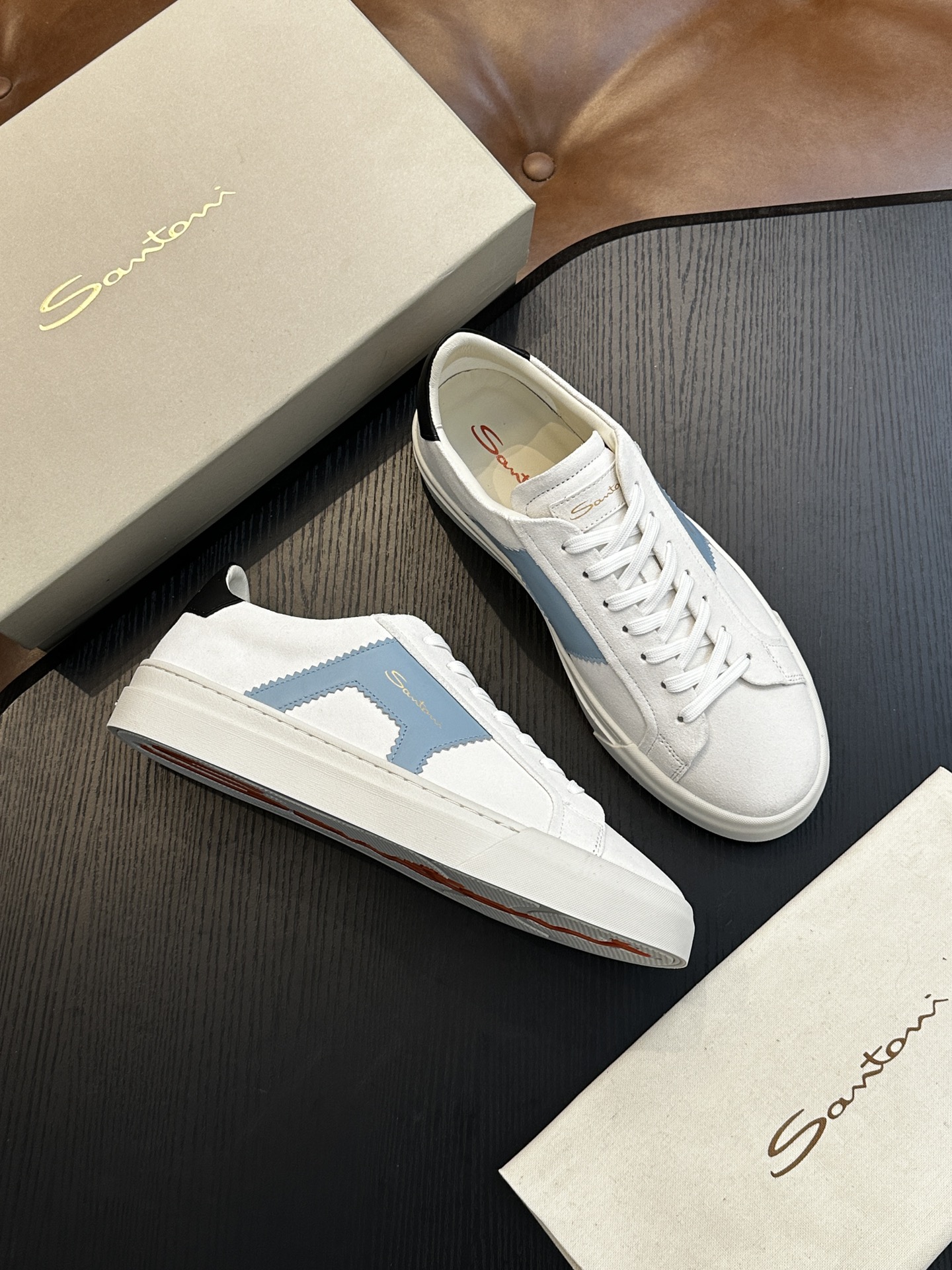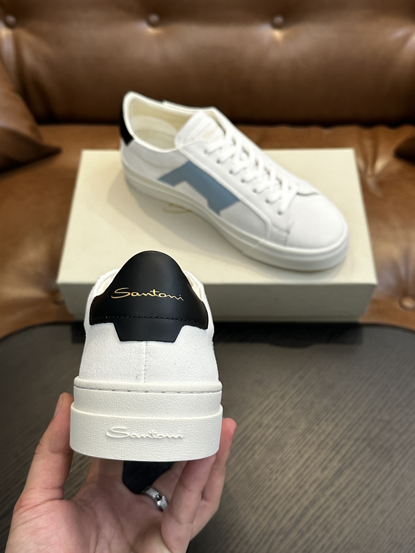 这款鞋子是AAAAA 1:1 质量 (非常棒). 使用了和原版一模一样的材料. 商标部分也保持了和Santoni一样. 图片拍摄是实物鞋子拍摄, 您所收到的实物保证和我们图片一模一样.