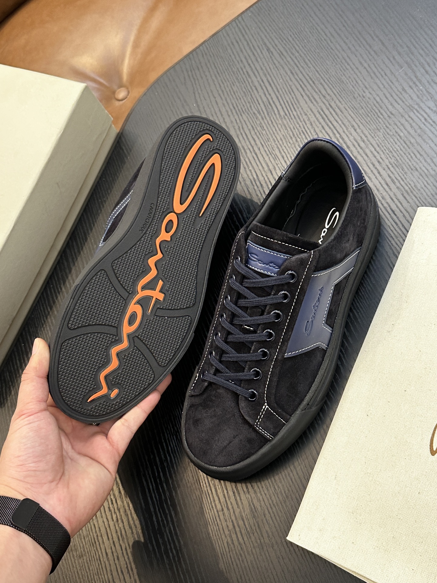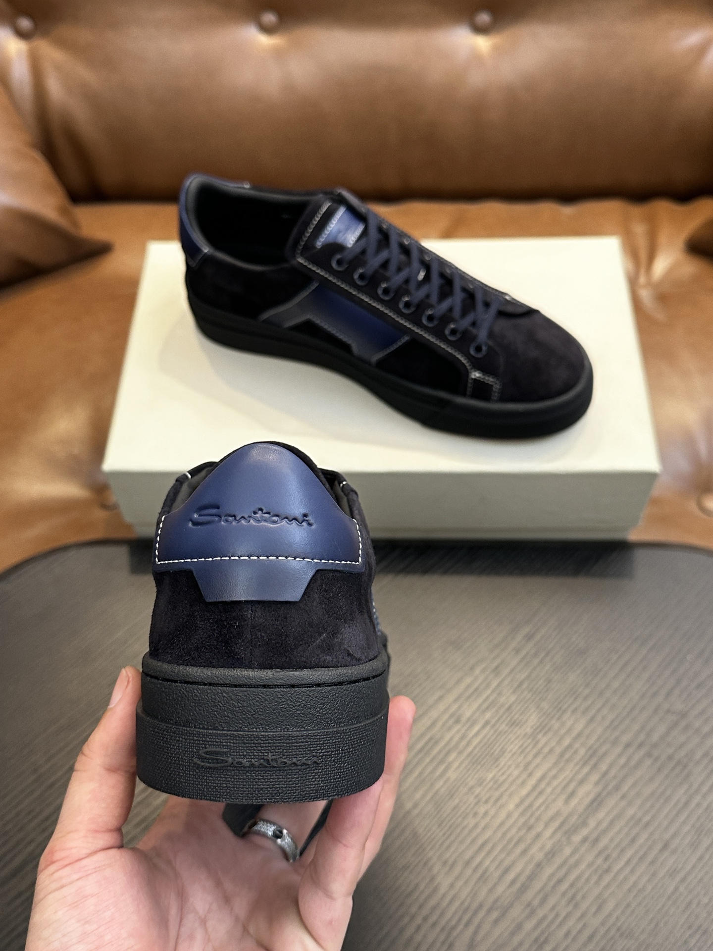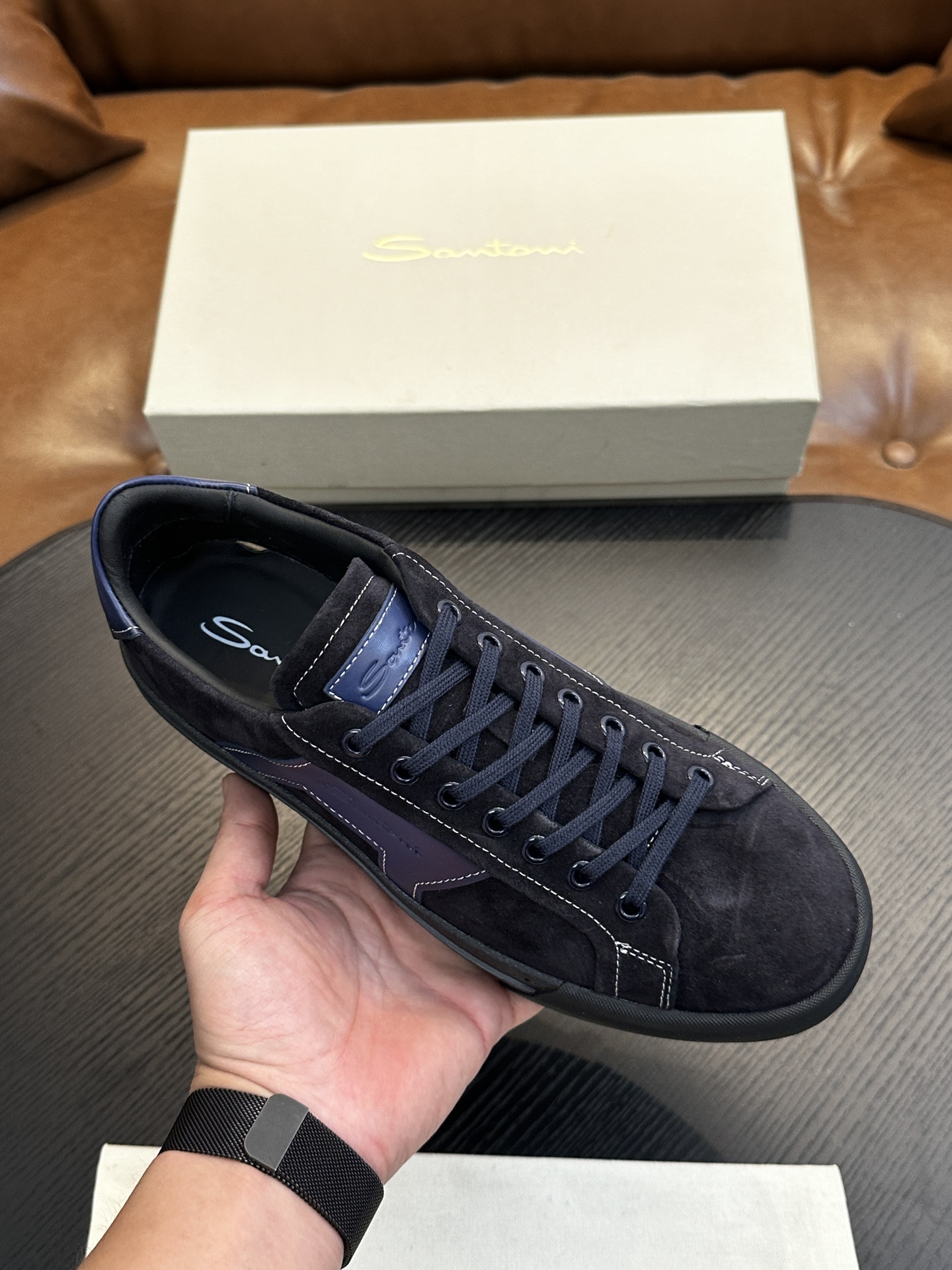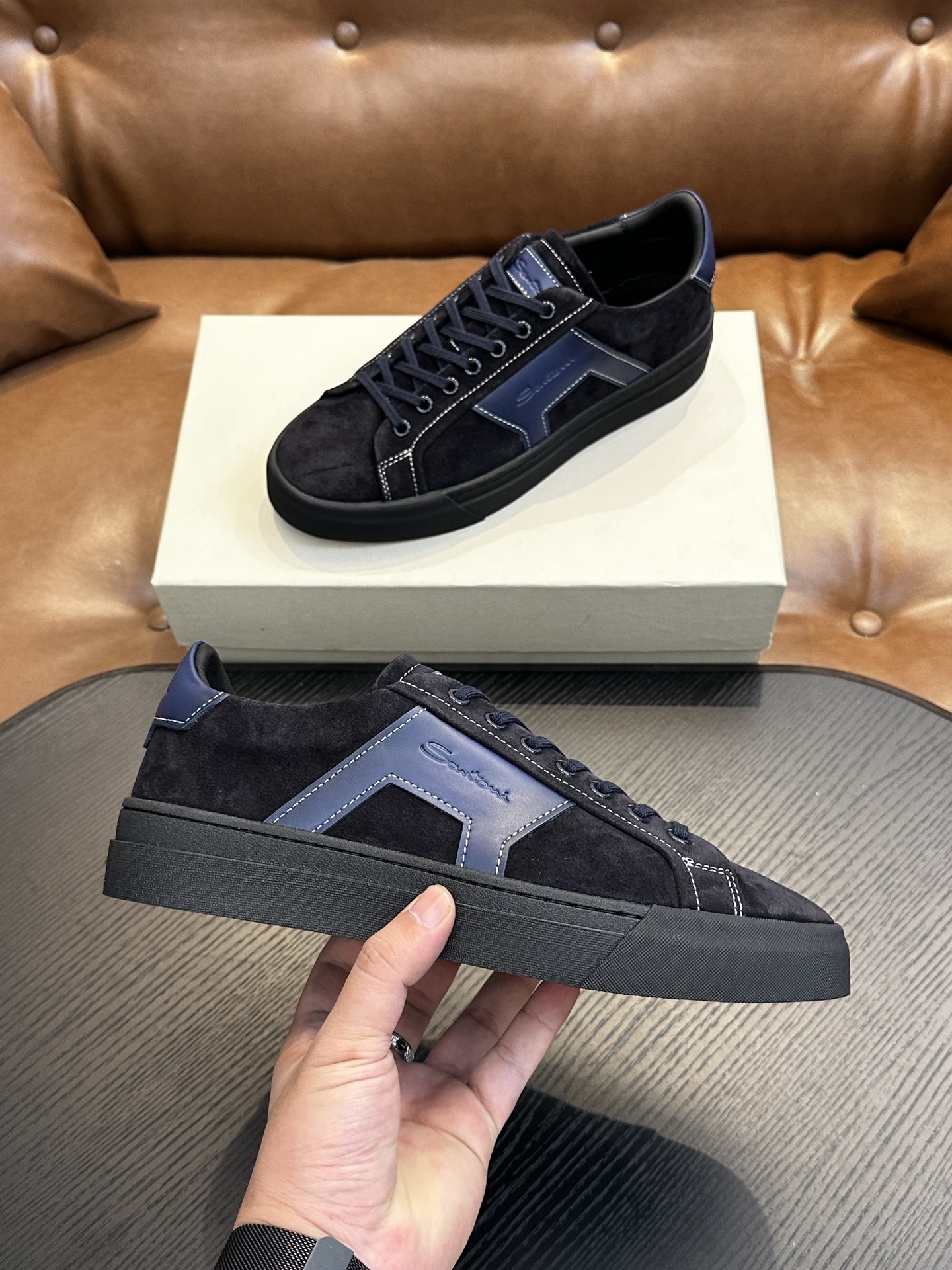 这款鞋子是AAAAA 1:1 质量 (非常棒). 使用了和原版一模一样的材料. 商标部分也保持了和Santoni一样. 图片拍摄是实物鞋子拍摄, 您所收到的实物保证和我们图片一模一样.