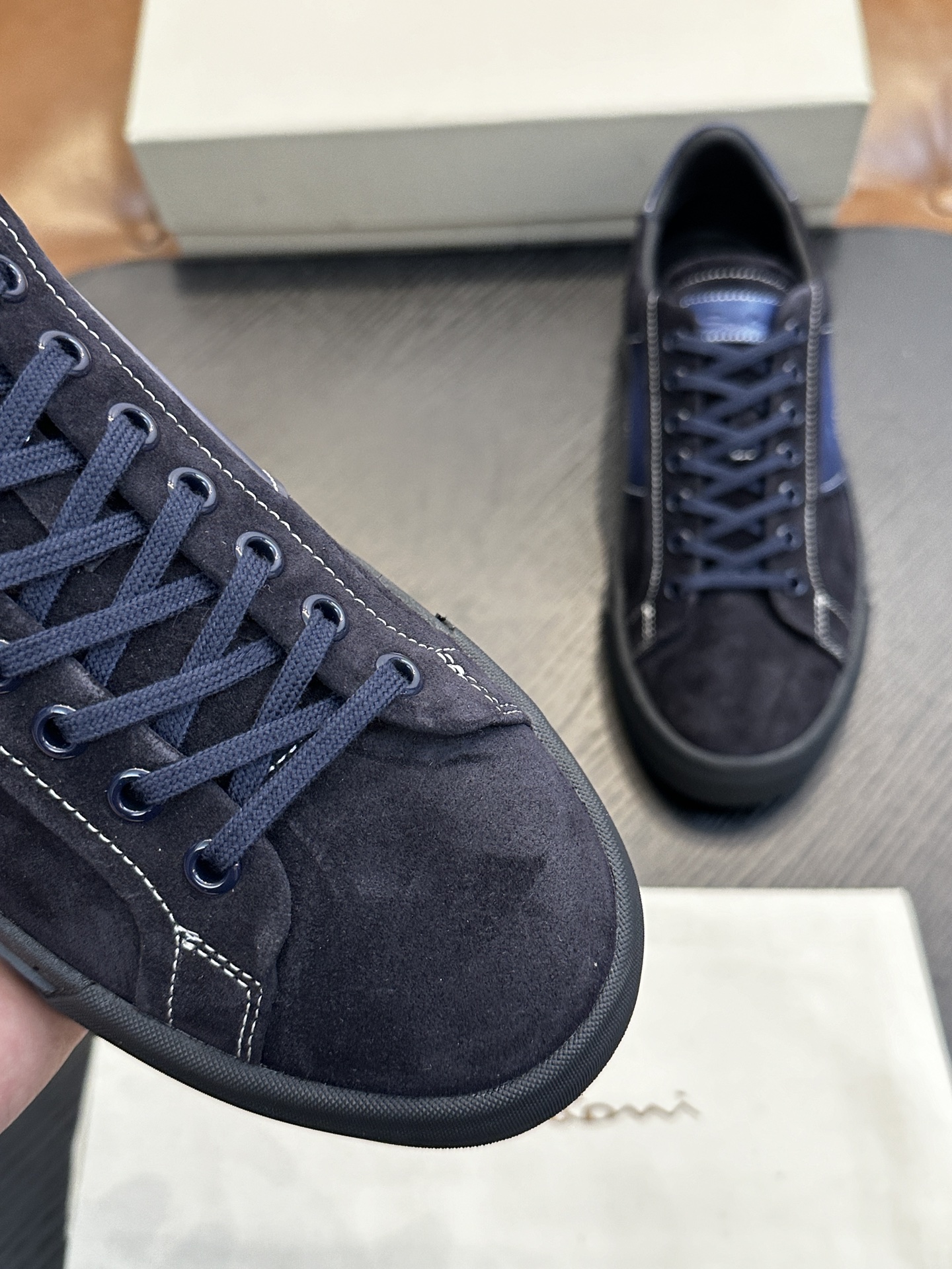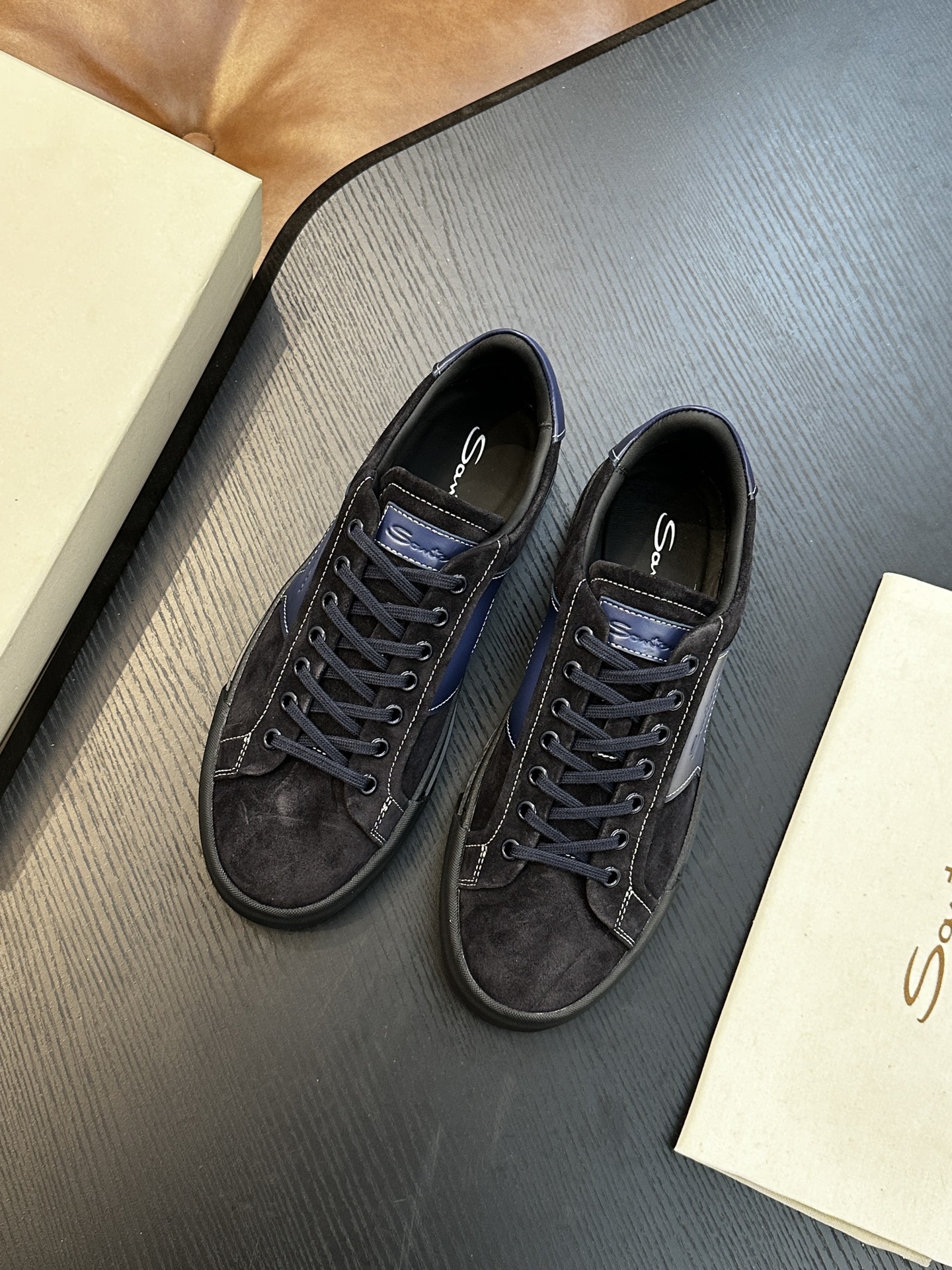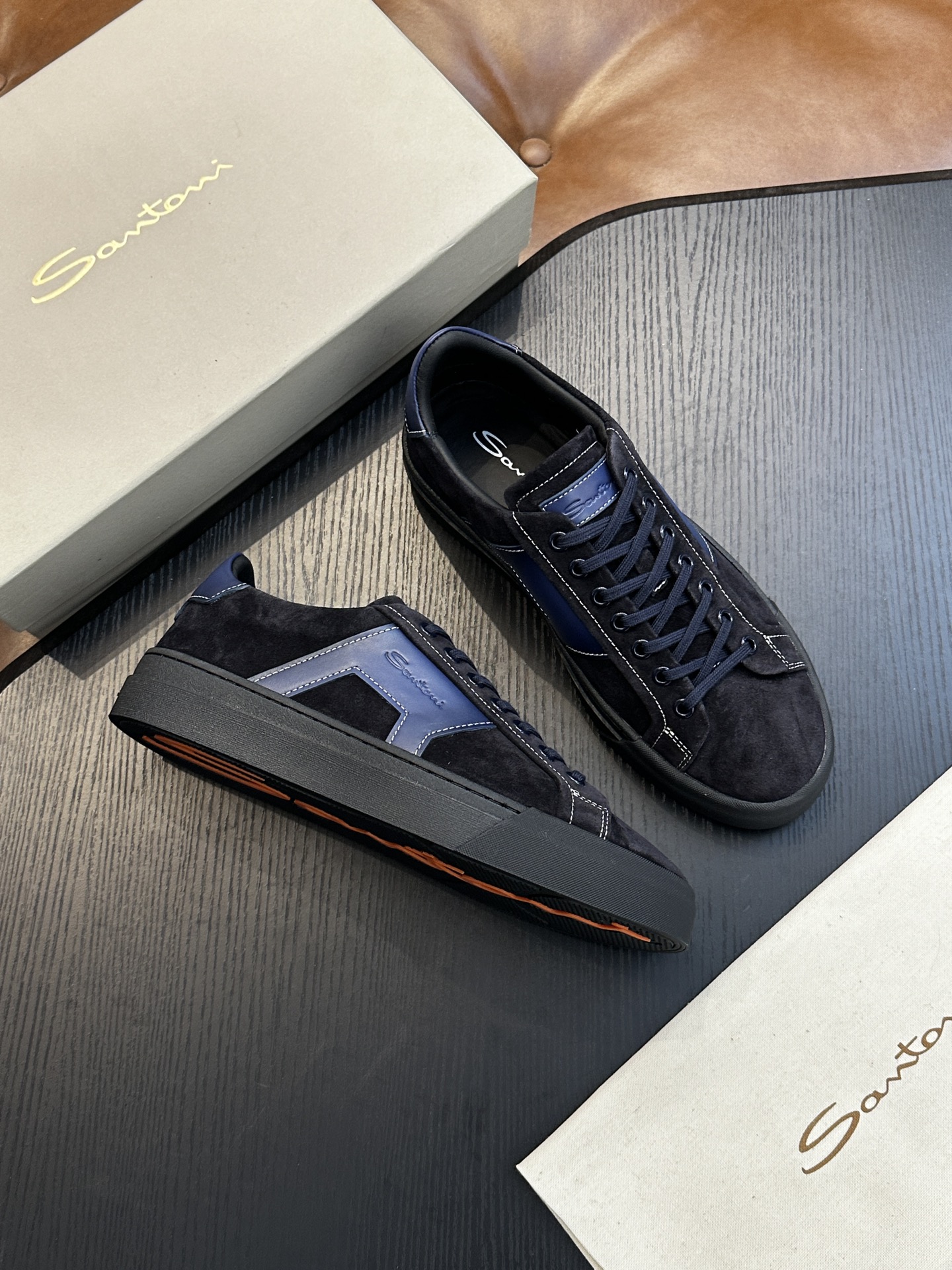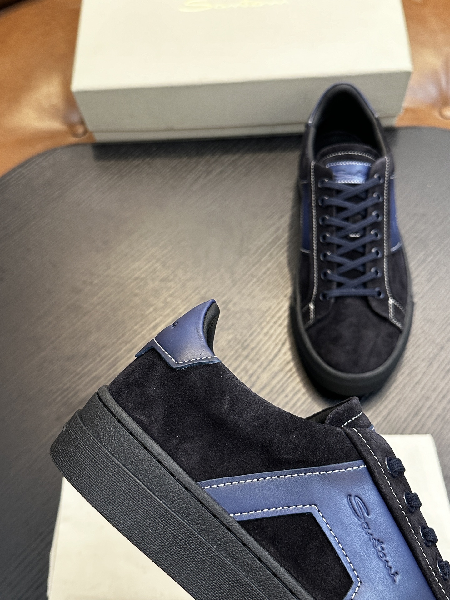 这款鞋子是AAAAA 1:1 质量 (非常棒). 使用了和原版一模一样的材料. 商标部分也保持了和Santoni一样. 图片拍摄是实物鞋子拍摄, 您所收到的实物保证和我们图片一模一样.