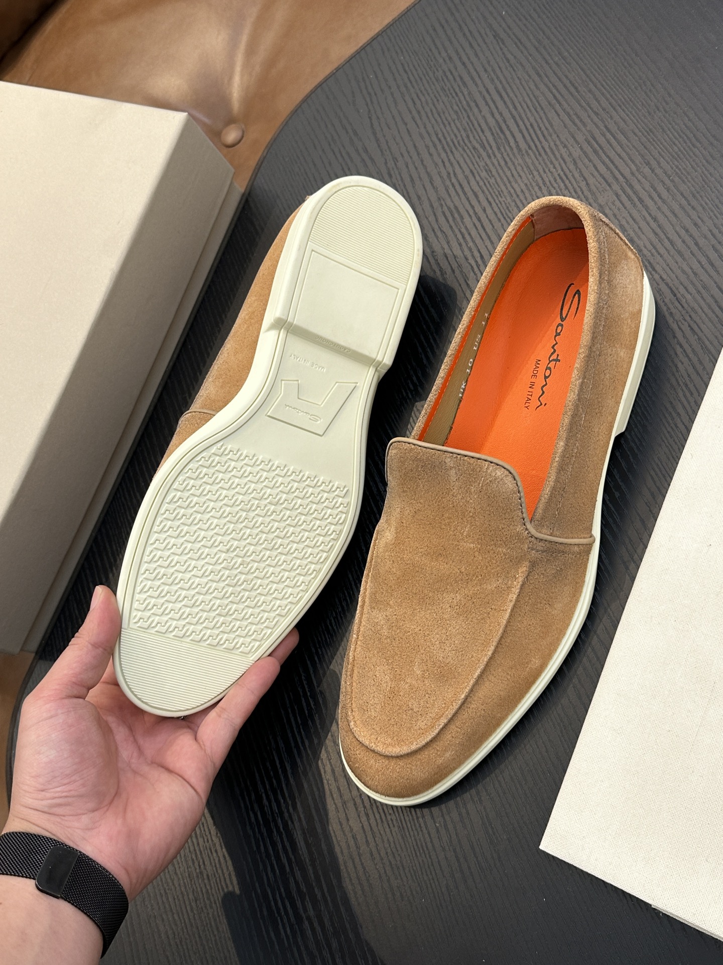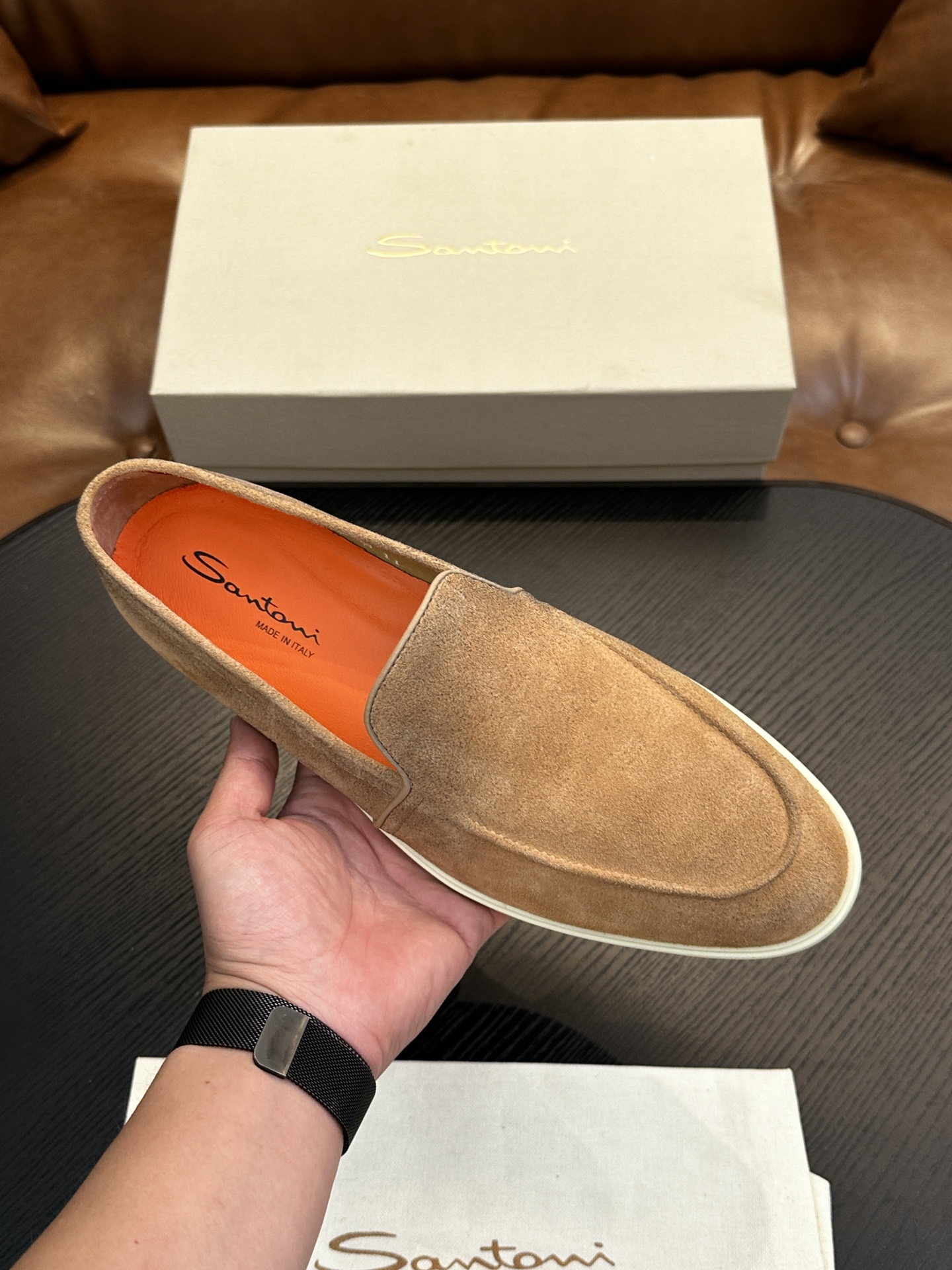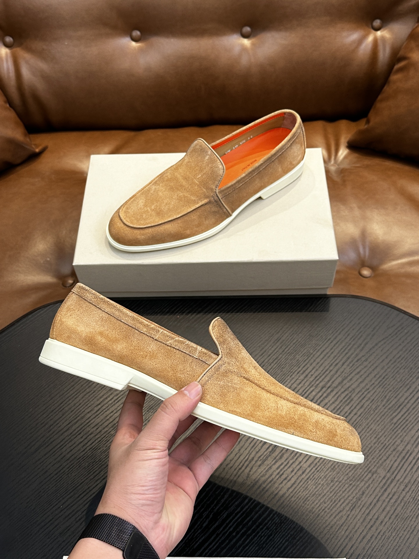 这款鞋子是AAAAA 1:1 质量 (非常棒). 使用了和原版一模一样的材料. 商标部分也保持了和Santoni一样. 图片拍摄是实物鞋子拍摄, 您所收到的实物保证和我们图片一模一样.