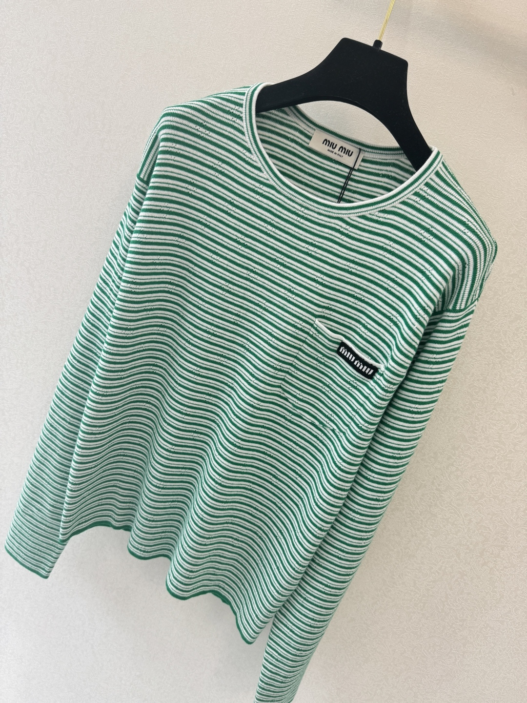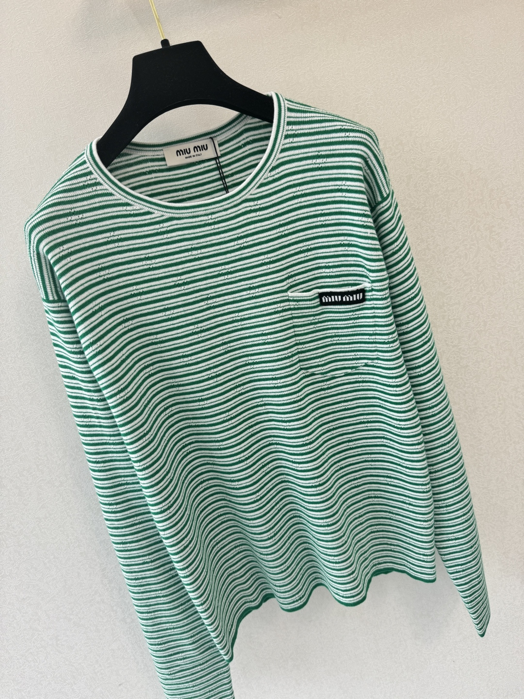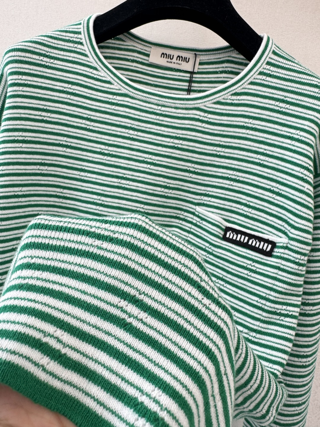这款衣服是AAAAA 1:1 质量 (非常棒). 使用了和原版一模一样的材料. 商标部分也保持了和缪缪/Miu Miu一样. 图片拍摄是实物衣服拍摄, 您所收到的实物保证和我们图片一模一样.