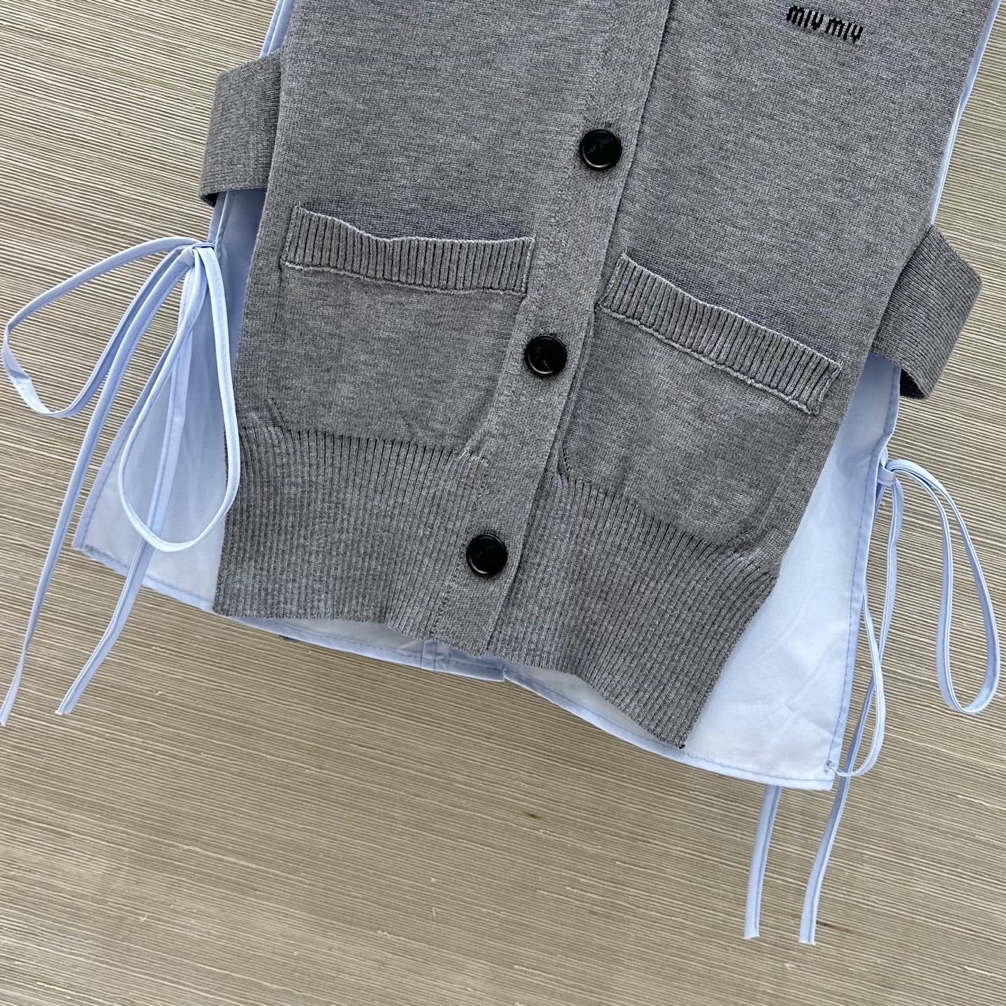 这款衣服是AAAAA 1:1 质量 (非常棒). 使用了和原版一模一样的材料. 商标部分也保持了和缪缪/Miu Miu一样. 图片拍摄是实物衣服拍摄, 您所收到的实物保证和我们图片一模一样.