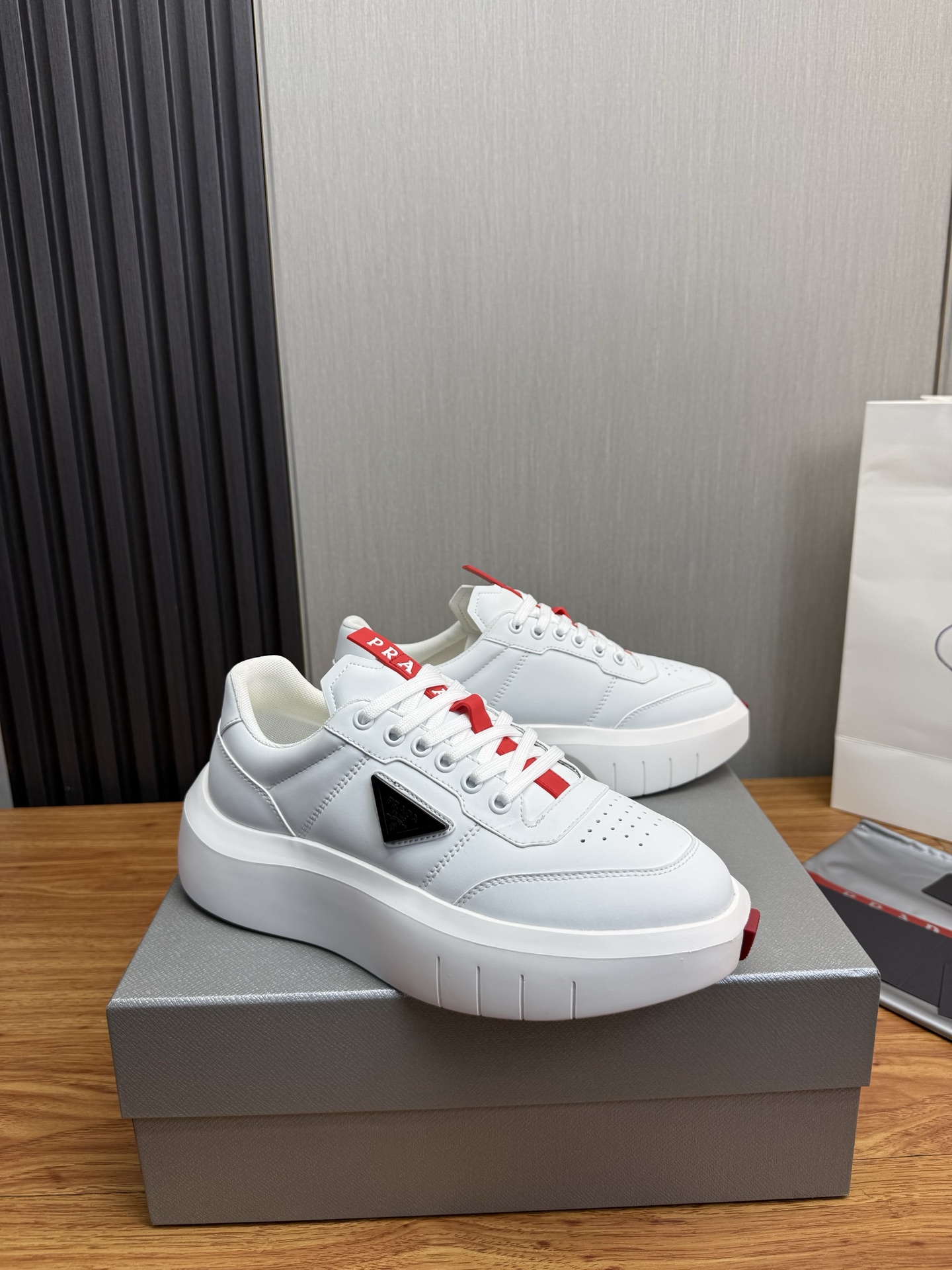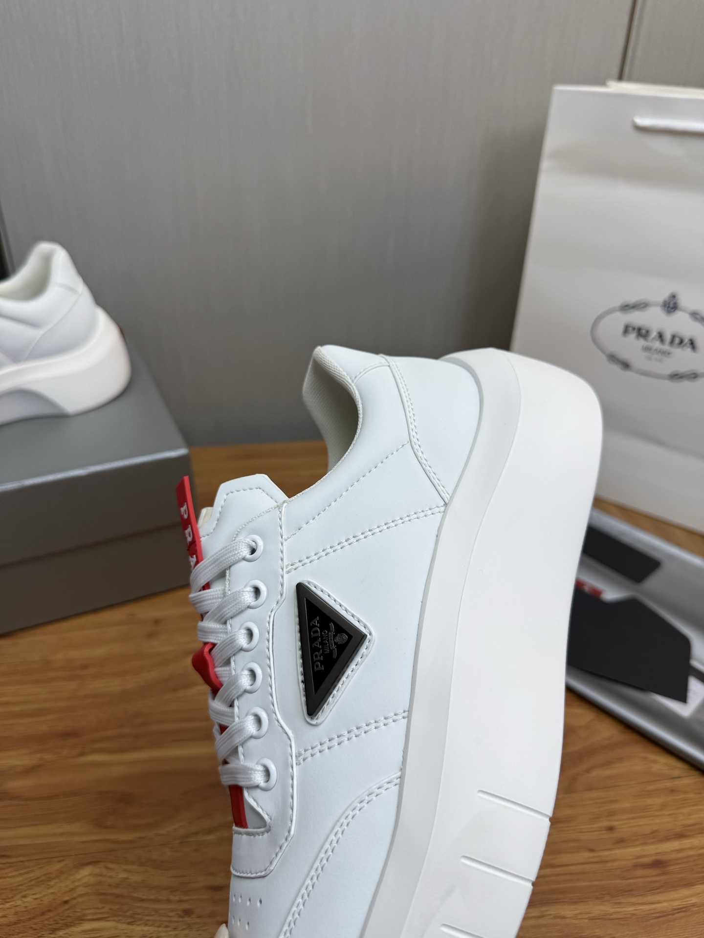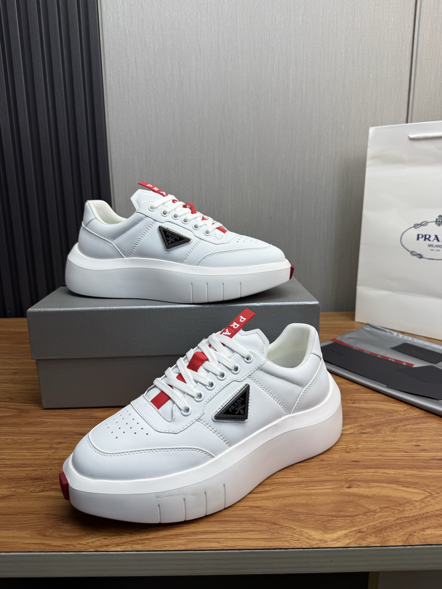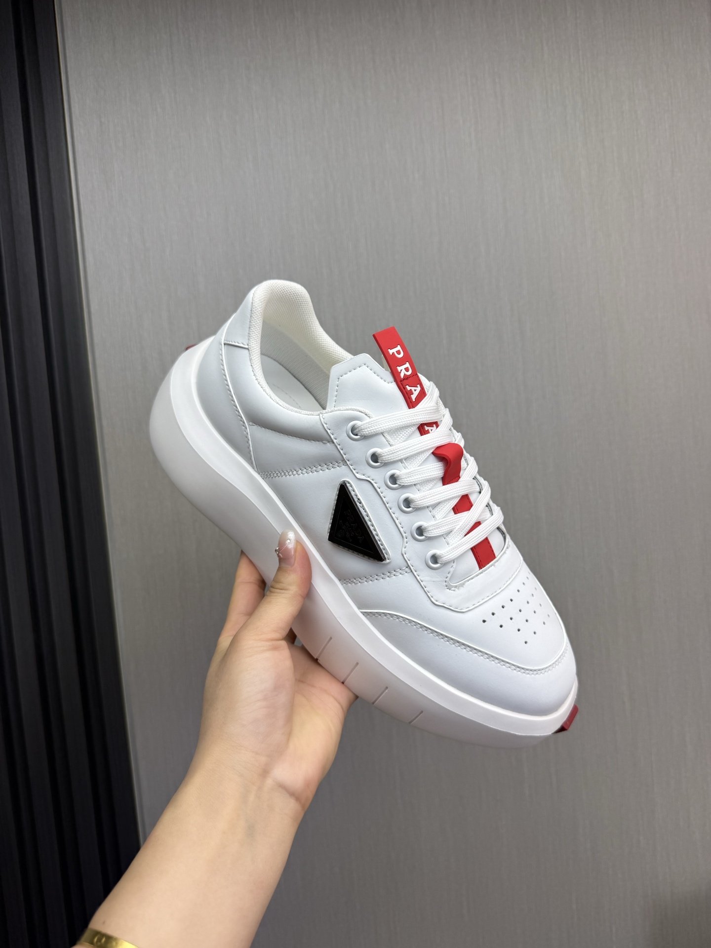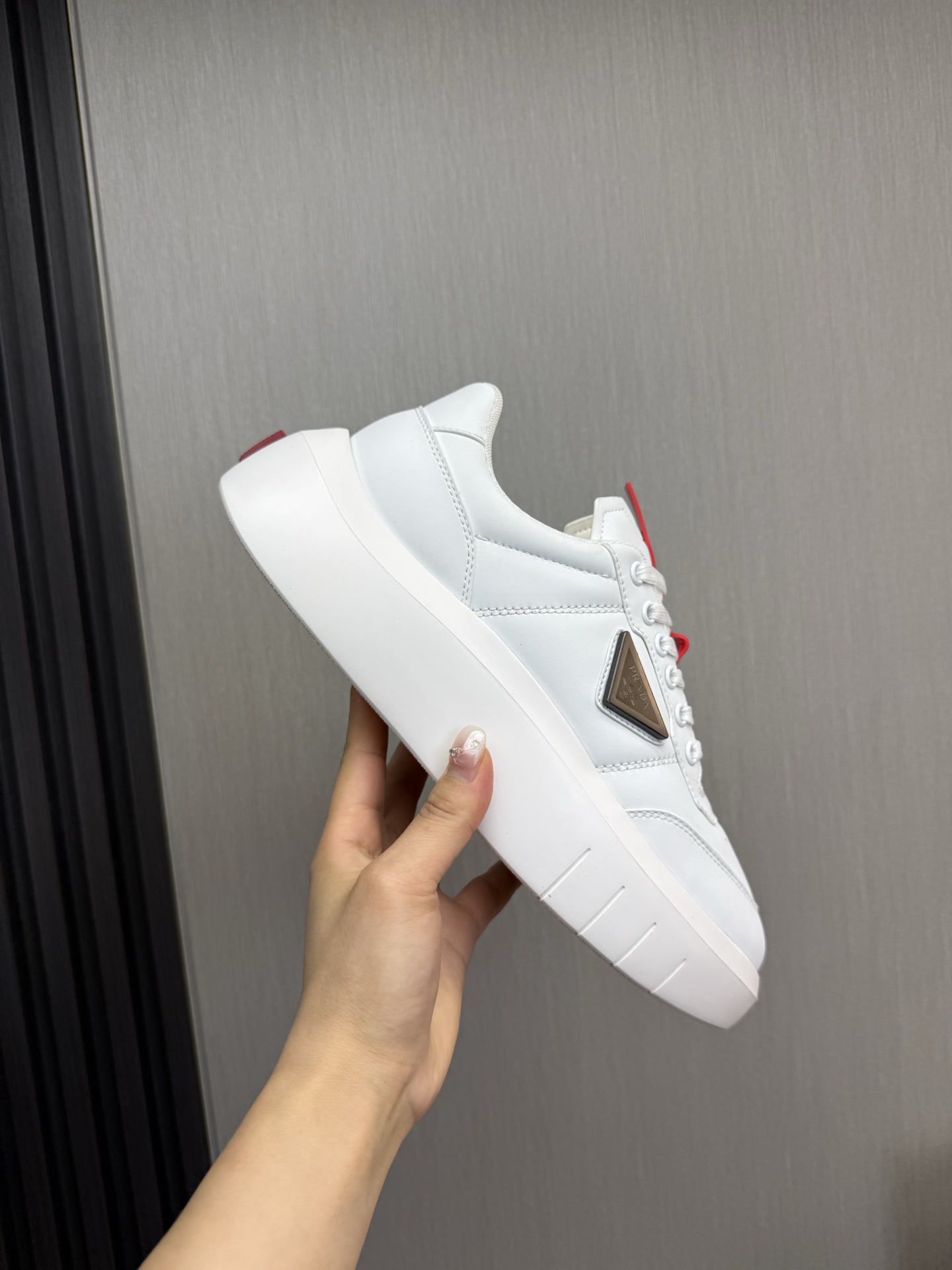 这款鞋子是AAAAA 1:1 质量 (非常棒). 使用了和原版一模一样的材料. 商标部分也保持了和普拉达/Prada一样. 图片拍摄是实物鞋子拍摄, 您所收到的实物保证和我们图片一模一样.