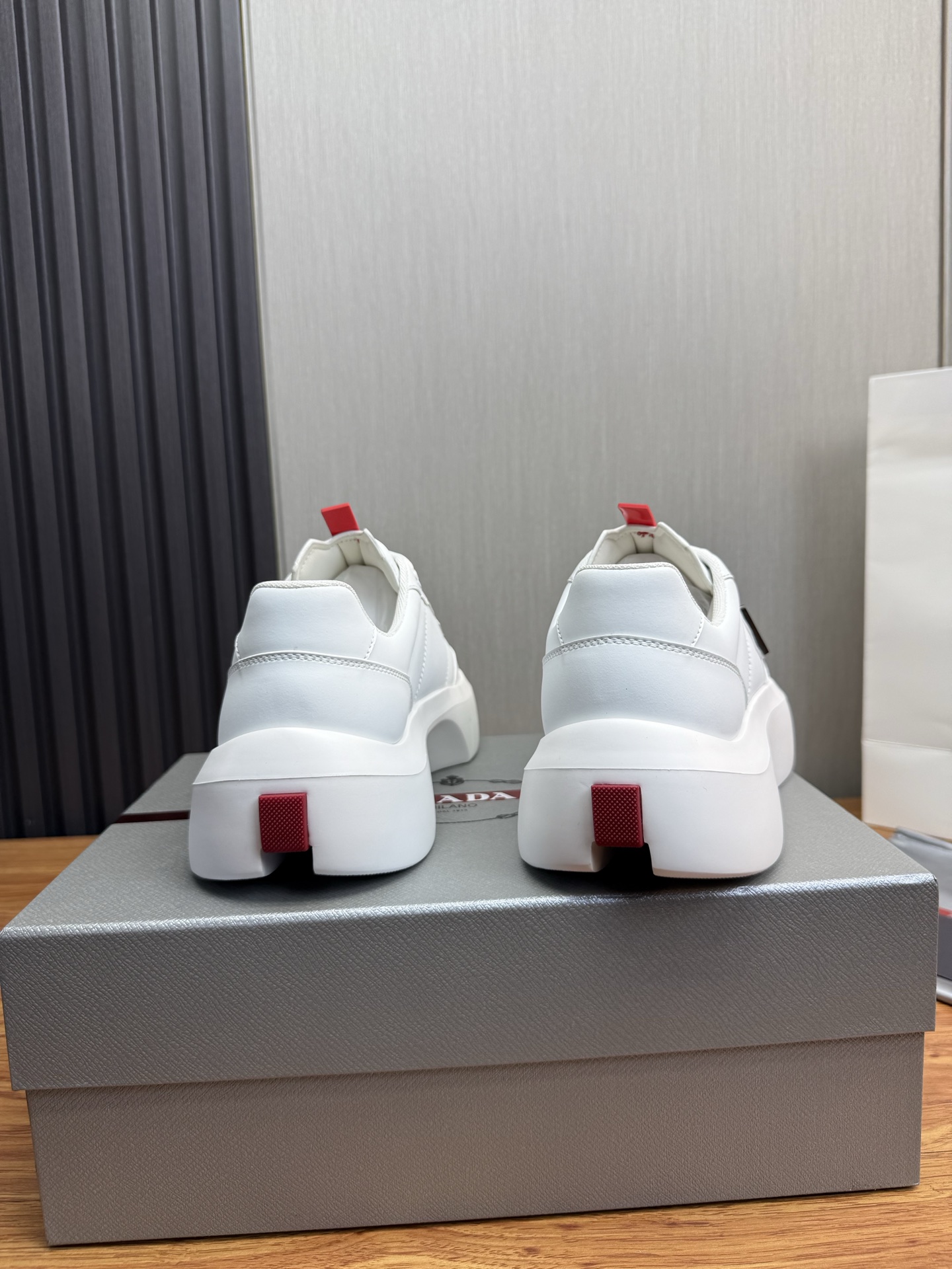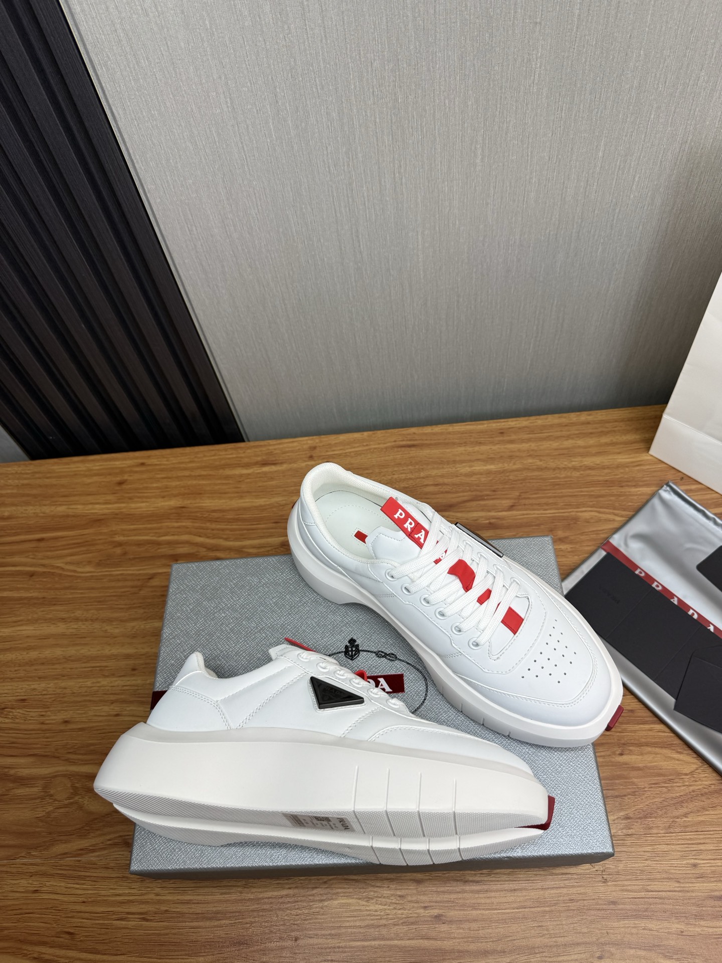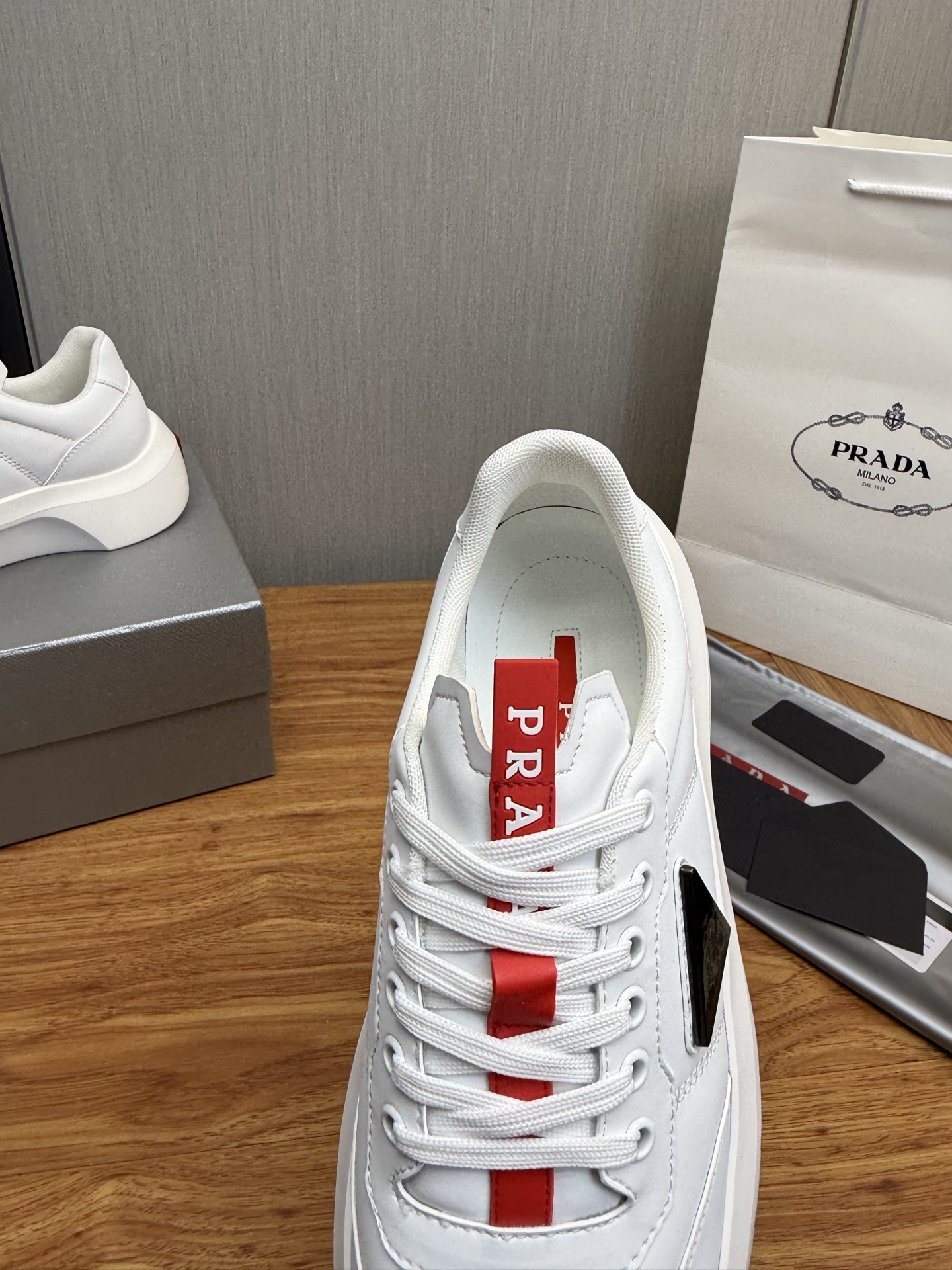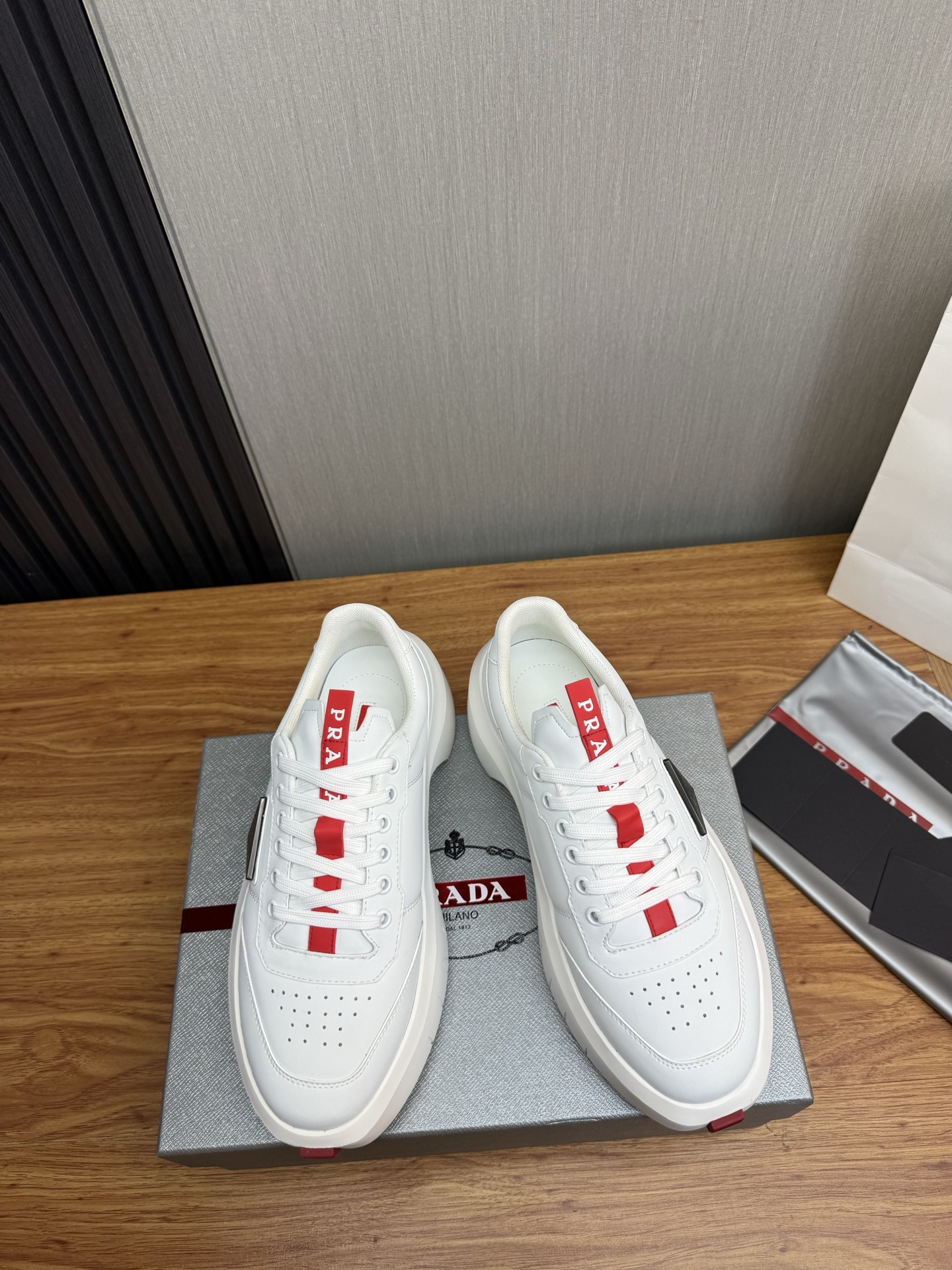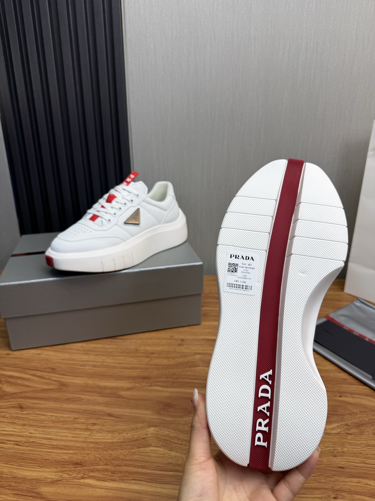 这款鞋子是AAAAA 1:1 质量 (非常棒). 使用了和原版一模一样的材料. 商标部分也保持了和普拉达/Prada一样. 图片拍摄是实物鞋子拍摄, 您所收到的实物保证和我们图片一模一样.