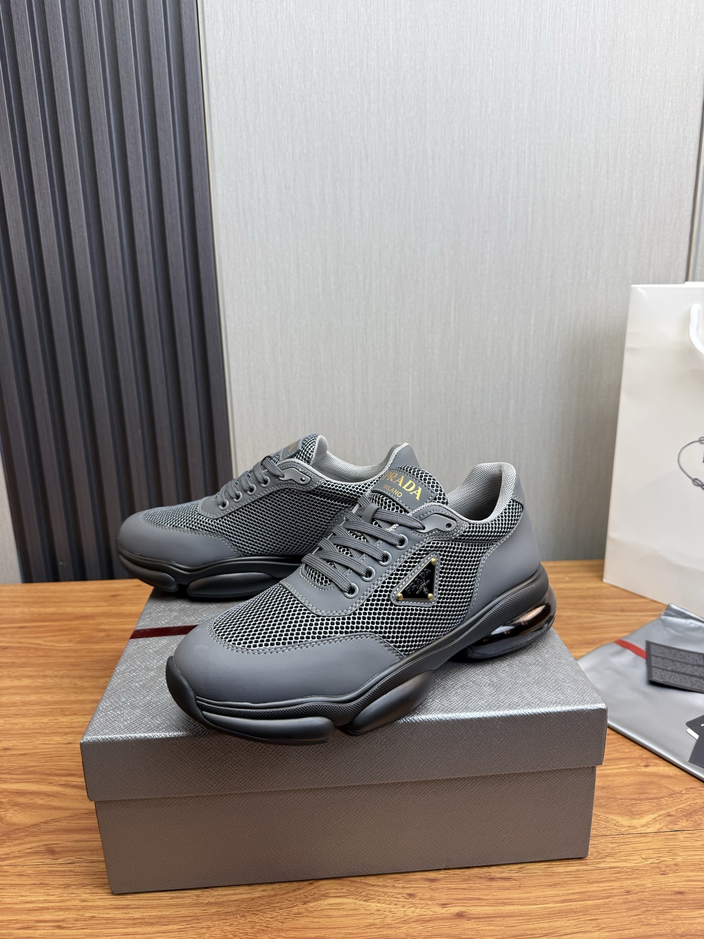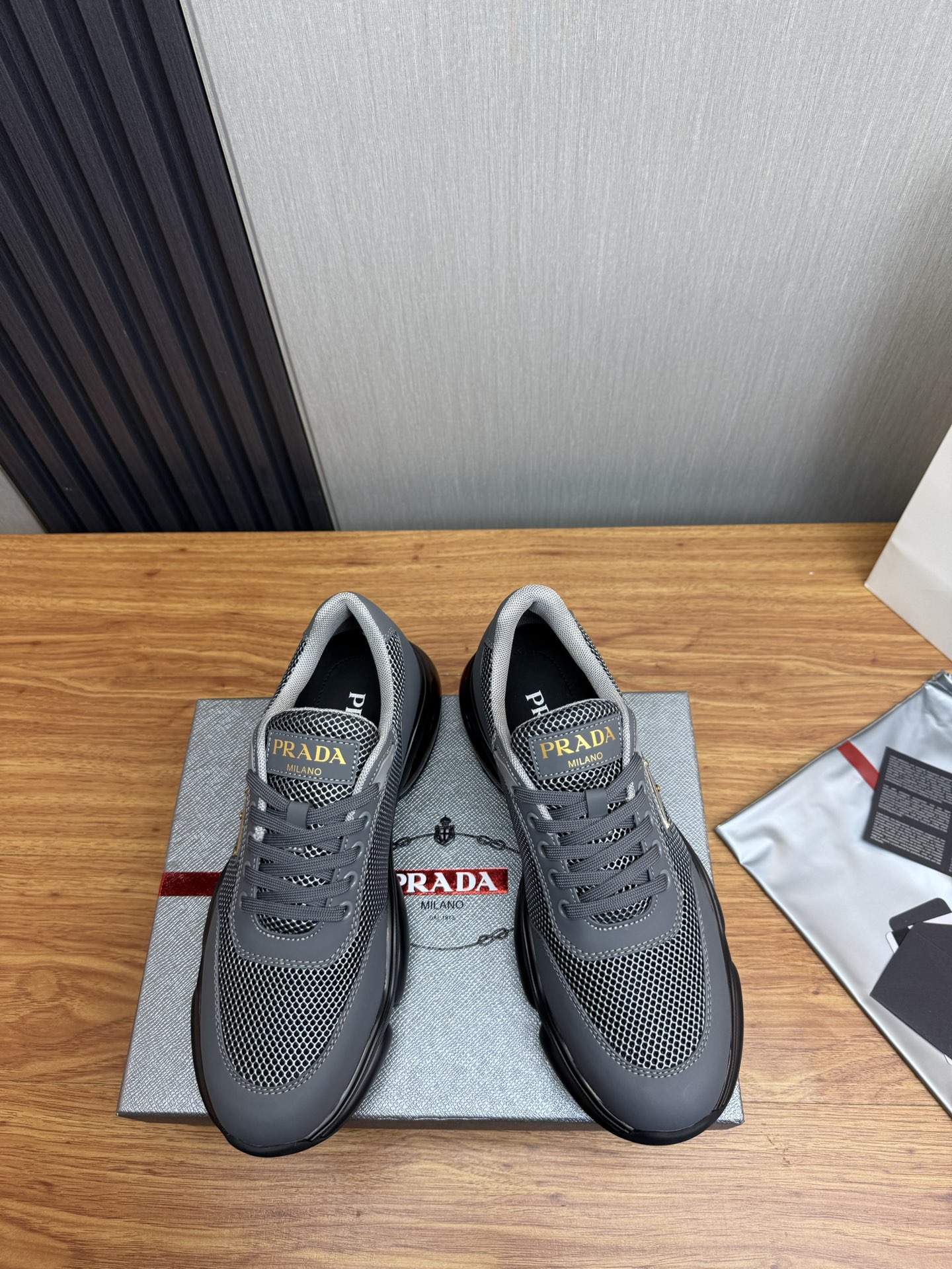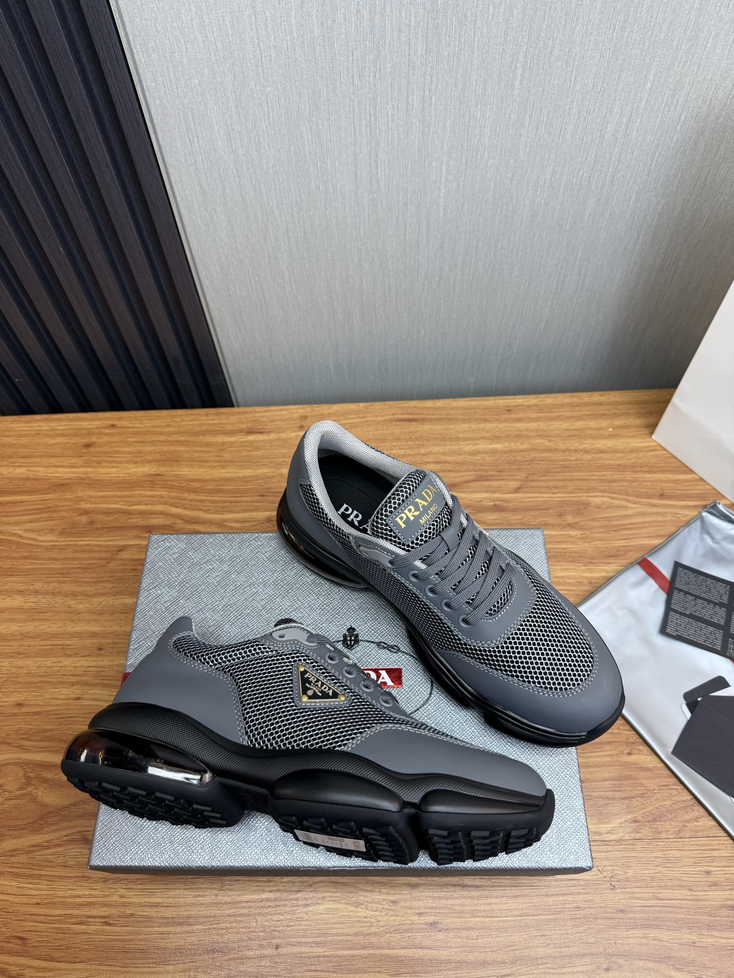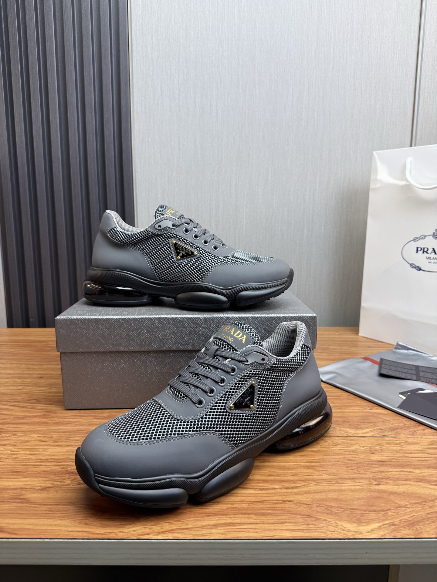 这款鞋子是AAAAA 1:1 质量 (非常棒). 使用了和原版一模一样的材料. 商标部分也保持了和普拉达/Prada一样. 图片拍摄是实物鞋子拍摄, 您所收到的实物保证和我们图片一模一样.